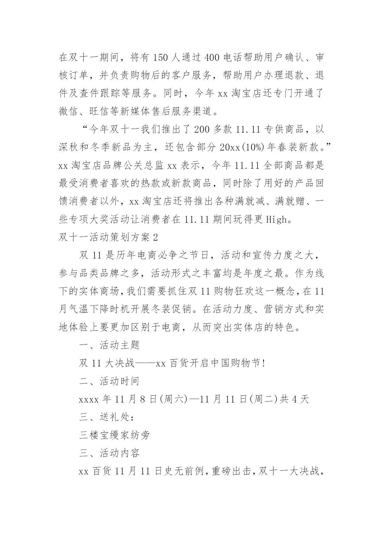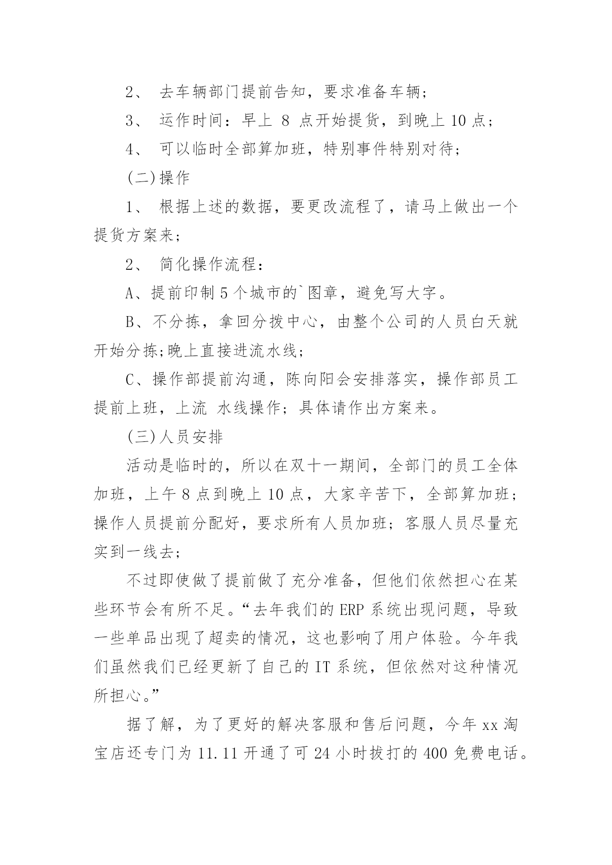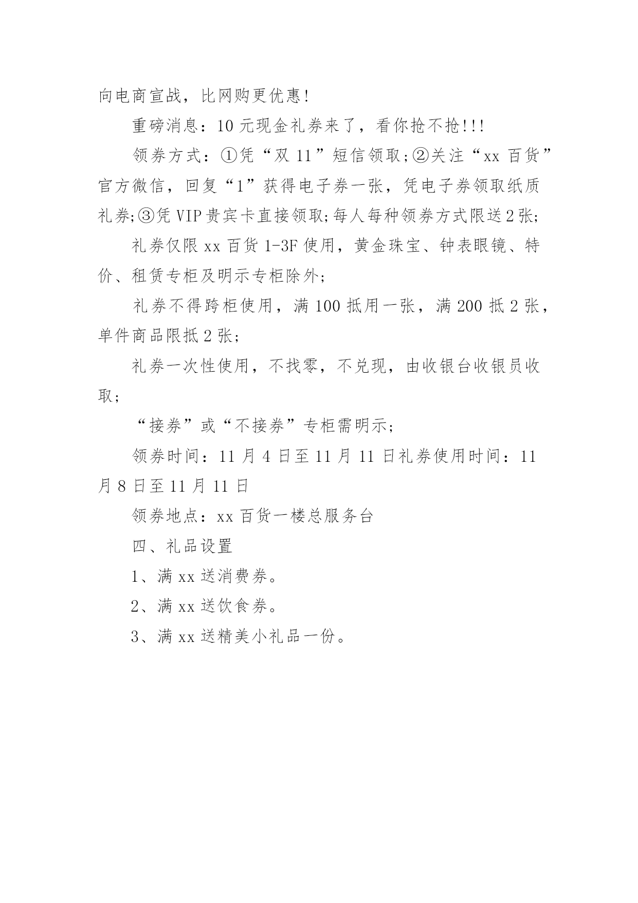 双十一活动策划方案双十一活动策划方案为了确保事情或工作扎实开展,时常需要预先制定一份周密的方案,方案的内容多是上级对下级或涉及面比较大的工作,一般都用带“文件头”形式下发。方案要怎么制定呢?以下是小编为大家整理的双十一活动策划方案,希望能够帮助到大家。双十一活动策划方案1一、活动目的此次活动目的在于促进大家购物,让更过多的人购物不光是在实体店,在虚拟的网络世界,通过电子平台进行消费可以很便宜,很便利。可以省去好多繁琐的事,比如去逛街比较劳累,逛街还得看天气呀。让更多的人了解电子商务,认识网购。二、活动时间和地址时间:20xx年11月11日00:00~~24:00地址:xx淘宝店所在的网上店铺。三、活动的准备(一)车辆:准备要求1、根据出货量来计算下不停的来回周转,需要多少车辆,多大的车?2、去车辆部门提前告知,要求准备车辆;3、运作时间:早上8点开始提货,到晚上10点;4、可以临时全部算加班,特别事件特别对待;(二)操作1、根据上述的数据,要更改流程了,请马上做出一个提货方案来;2、简化操作流程:A、提前印制5个城市的`图章,避免写大字。B、不分拣,拿回分拨中心,由整个公司的人员白天就开始分拣;晚上直接进流水线;C、操作部提前沟通,陈向阳会安排落实,操作部员工提前上班,上流水线操作;具体请作出方案来。(三)人员安排活动是临时的,所以在双十一期间,全部门的员工全体加班,上午8点到晚上10点,大家辛苦下,全部算加班;操作人员提前分配好,要求所有人员加班;客服人员尽量充实到一线去;不过即使做了提前做了充分准备,但他们依然担心在某些环节会有所不足。“去年我们的ERP系统出现问题,导致一些单品出现了超卖的情况,这也影响了用户体验。今年我们虽然我们已经更新了自己的IT系统,但依然对这种情况所担心。”据了解,为了更好的解决客服和售后问题,今年xx淘宝店还专门为11.11开通了可24小时拔打的400免费电话。在双十一期间,将有150人通过400电话帮助用户确认、审核订单,并负责购物后的客户服务,帮助用户办理退款、退件及查件跟踪等服务。同时,今年xx淘宝店还专门开通了微信、旺信等新媒体售后服务渠道。“今年双十一我们推出了200多款11.11专供商品,以深秋和冬季新品为主,还包含部分20xx(10%)年春装新款。”xx淘宝店品牌公关总监xx表示,今年11.11全部商品都是最受消费者喜欢的热款或新款商品,同时除了用好的产品回馈消费者以外,xx淘宝店还将推出各种满就减、满就赠、一些专项大奖活动让消费者在11.11期间玩得更High。双十一活动策划方案2双11是历年电商必争之节日,活动和宣传力度之大,参与品类品牌之多,活动形式之丰富均是年度之最。作为线下的实体商场,我们需要抓住双11购物狂欢这一概念,在11月气温下降时机开展冬装促销。在活动力度、营销方式和实地体验上要更加区别于电商,从而突出实体店的特色。一、活动主题双11大决战——xx百货开启中国购物节!二、活动时间xxxx年11月8日(周六)—11月11日(周二)共4天三、送礼处:三楼宝缦家纺旁三、活动内容xx百货11月11日史无前例,重磅出击,双十一大决战,向电商宣战,比网购更优惠!重磅消息:10元现金礼券来了,看你抢不抢!!!领券方式:①凭“双11”短信领取;②关注“xx百货”官方微信,回复“1”获得电子券一张,凭电子券领取纸质礼券;③凭VIP贵宾卡直接领取;每人每种领券方式限送2张;礼券仅限xx百货1-3F使用,黄金珠宝、钟表眼镜、特价、租赁专柜及明示专柜除外;礼券不得跨柜使用,满100抵用一张,满200抵2张,单件商品限抵2张;礼券一次性使用,不找零,不兑现,由收银台收银员收取;“接券”或“不接券”专柜需明示;领券时间:11月4日至11月11日礼券使用时间:11月8日至11月11日领券地点:xx百货一楼总服务台四、礼品设置1、满xx送消费券。2、满xx送饮食券。3、满xx送精美小礼品一份。