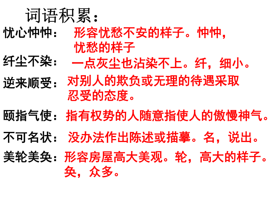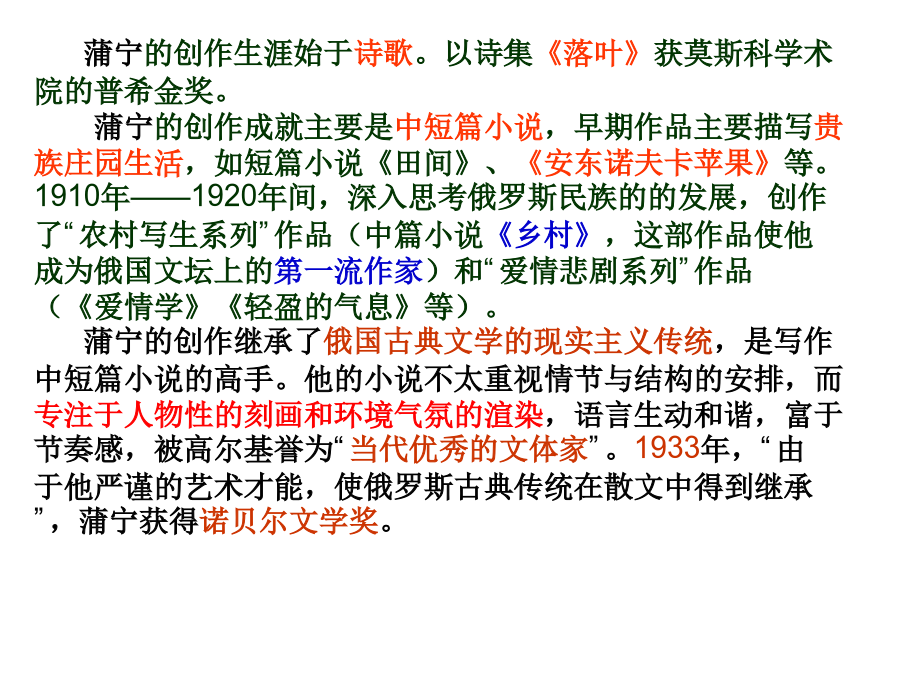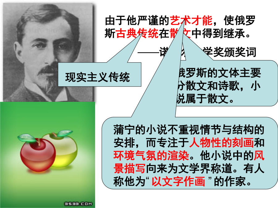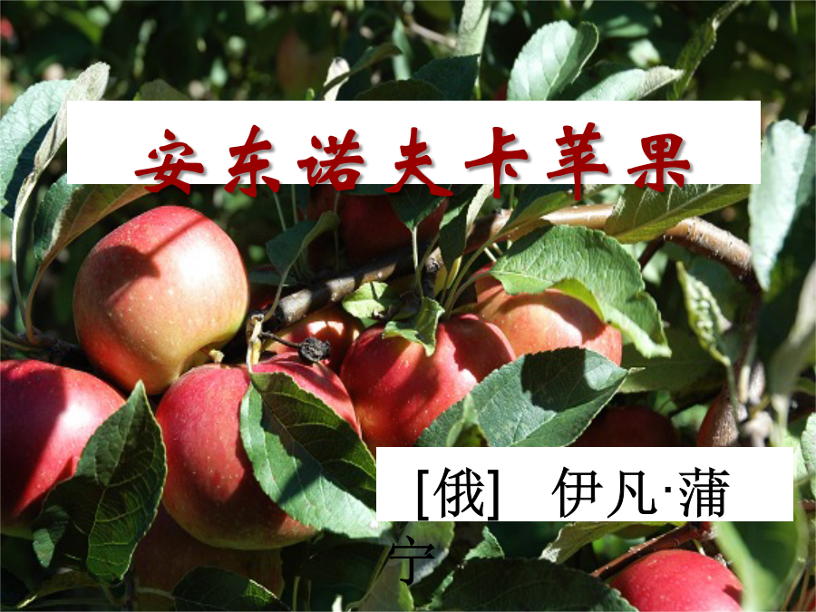 《安东诺夫卡苹果》优质课件字音积累:狺()褶()颐()指气使倏()嚣()壑()詈()膻()龇()阖()沁()人心脾()媲()隽()永荣膺()揄()扬卷帙()浩繁悒()妍()眸()纡()尊降贵阒()无一人词语积累:蹑手蹑脚:安东诺夫卡苹果伊凡·蒲宁(IvanBunin,1870-1953)俄罗斯作家。生于俄国中部波罗涅日市一破落贵族世家。由于家境贫困,中学未毕业就步入社会。做过校对员、图书馆员、助理编辑等。曾受教于托尔斯泰、契诃夫、高尔基等作家,并为高尔基主办的知识出版社撰过稿。1909年被选为科学院名誉院士。十月革命爆发后,他持敌对立场,于1920年流亡国外,侨居法国直到去世。蒲宁的创作生涯始于诗歌。以诗集《落叶》获莫斯科学术院的普希金奖。蒲宁的创作成就主要是中短篇小说,早期作品主要描写贵族庄园生活,如短篇小说《田间》、《安东诺夫卡苹果》等。1910年——1920年间,深入思考俄罗斯民族的的发展,创作了“农村写生系列”作品(中篇小说《乡村》,这部作品使他成为俄国文坛上的第一流作家)和“爱情悲剧系列”作品(《爱情学》《轻盈的气息》等)。蒲宁的创作继承了俄国古典文学的现实主义传统,是写作中短篇小说的高手。他的小说不太重视情节与结构的安排,而专注于人物性的刻画和环境气氛的渲染,语言生动和谐,富于节奏感,被高尔基誉为“当代优秀的文体家”。1933年,“由于他严谨的艺术才能,使俄罗斯古典传统在散文中得到继承”,蒲宁获得诺贝尔文学奖。由于他严谨的艺术才能,使俄罗斯古典传统在散文中得到继承。——诺贝尔文学奖颁奖词蒲宁是个对贵族生活颇为留恋和向往的人,在他的意识中,与世无争、相安无事的农庄生活,并无激烈的阶级矛盾和阶级斗争,他厌恶任何一种打破这种“理想化”社会平衡的革命。因而,在他的笔下,贵族农庄的生活是美好而惬意的。有了这层了解,我们就能理解为什么他在描写姑母的农庄时,会那样饱含深情。初读文本,回答下列问题线索分析:小说以时间为线索。从八月写到十一月,将“初秋”苹果成熟的季节、农田丰收的季节、“九月杪起”以及“深秋”初冬时狩猎的季节连缀成四幅如诗如画的图景,描绘出俄罗斯农村秋天的精美景致。1、苹果丰收图2、庄园生活图3、深秋狩猎图4、小地主生活图“安东诺夫卡苹果”仅仅是一种美味的水果吗?如果不是的话,那它象征着什么呢?3、第一部分中主要从哪两个侧面来写果园丰收图景的?(关注第一段与后面段落之间的关系)中俄合璧读说“苹果”——蒲宁的风景画果园清晨图(粗)果园日暮图(粗)下面的细节描写说明了什么?思考:1、如果说蒲宁为我们描绘的是一幅油画的话,这幅画的背景是什么?画中有哪些色彩?2、这幅苹果丰收图的背景是景物,那么它所要突出的前景就是人物。那么这幅图画中有哪些人物?3、在这么多的人物中,作者侧重描写的是哪一位?作者是按照怎样的顺序来写“村长年轻的妻子”的?4、看起来这些人物的行为似乎跟安东诺夫卡苹果都没有什么关系,在这幅画中,作者是怎样点出苹果丰收这个主题的?果园清晨图(细)人物性的刻画——村长年轻的妻子“村长年轻的妻子”是一个怎样的形象?作者是如何描写的?果园日暮图(细)小结小说的第一部分,选择了安东诺夫卡苹果成熟的季节来描写,注重细节描写和场面描写、景物描写,使平凡的生活场景渗透出层层深意。观赏着这一副苹果丰收的场景,“我”发出了感叹:“生活在世界上又是多么美好呀!”第二部分:庄园生活图5、主要描写了那些人的庄园生活?中俄合璧读说“苹果”——蒲宁的风景画第三部分:深秋狩猎图6、主要从哪几个方面来写?秋天来庄园看雨——雨神打盹了偶尔,傍晚之前,在西半天上,落日的颤抖不已的金光会穿破阴沉沉地压在地面上的乌云。这时空气就变得洁净、明朗,夕照令人目眩地辉耀于叶丛和枝桠之间,而叶丛和枝桠则由于风的吹拂犹如一张活动的网似的摇曳摆动。同时,在北半天,在沉甸甸的铅灰色的乌云上方,水汪汪的浅蓝色的天空冷冰冰地、明亮地闪着光,乌云则慢慢地凝聚成为连绵不绝的含雪的云峰。每逢这种时候,你站在窗口,就会想:“谢天谢地,说不定会放晴了。”雨季景象图:这里充分展现了作者高超的色彩运用:“在西半天上,落日的颤抖不已的金光会穿破阴沉沉地压在地面上的乌云……乌云则慢慢地凝聚成为连绵不绝的含雪的云峰。”短短几句,充满了明与暗、冷与热、轻与重、动与静的对比。本来是静态的景观被作者一写竟然充满了动感:“落日的颤抖不已的金光穿破阴沉沉地压在地面上的乌云”,这种效果正是“颤抖”“穿破”“压”等几个动词造成的。“金光”与“乌云”形成了强烈的对照和反差,给人非常明艳的印象。“沉甸甸的铅灰色的乌云”与“水汪汪的浅蓝色的天空”不仅在色彩上形成鲜明的对比,而且将沉重与轻盈的质感并列,给人炫目的感觉。冷色调与暖色调错杂在天空之上,绚丽