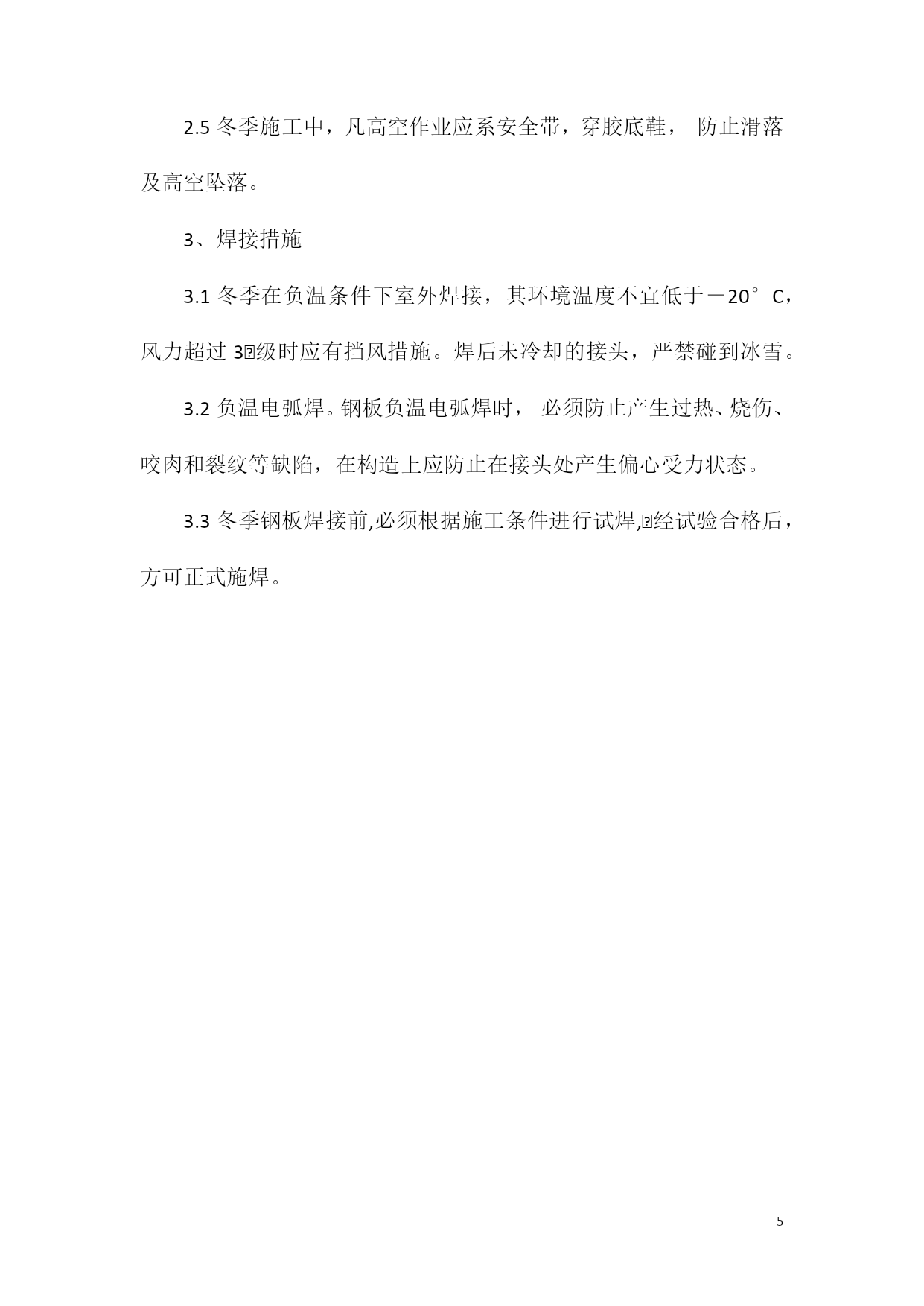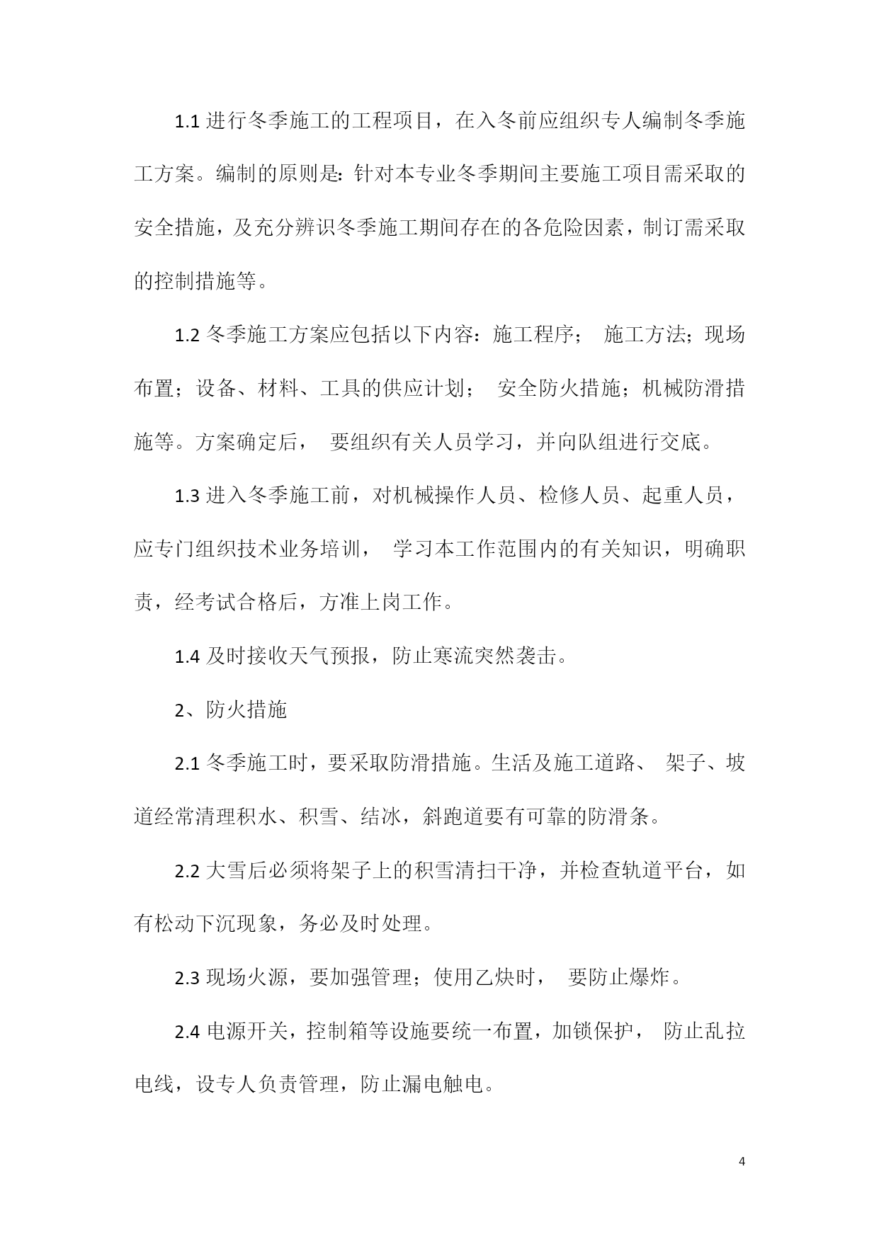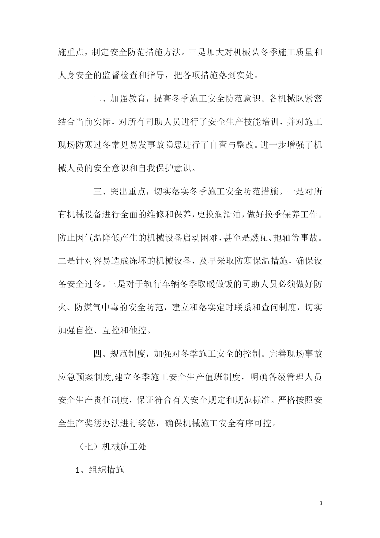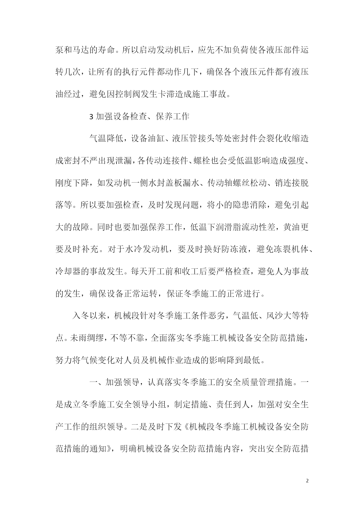 PAGEPAGE5机械冬季安全施工措施机械方面;1给机械设备选好用油冬季来临,要根据当地的最低气温选好燃油和润滑油。如最低气温在-10℃以上,可选负10号柴油,低于-10℃时应选更高标号的柴油,避免因低温造成发动机供油不良,使机械不能正常启动和运转。同时,机油也要按设备要求换冬季专用油,以减少启动阻力,保证润滑。因冬季气温低,液压油粘度加大,液压泵吸油负压增大,造成供油不足,影响执行元件的操作准确性和灵敏性,所以也要选用规定型号的液压油。2做好机械设备预热工作对发动机来说,低温下启动时因机油粘度大,会造成润滑油短时内不足、不能遍布各润滑点,这时若发动机高速运转,轻则造成曲轴、凸轮轴及摇臂轴等磨损加剧,重则会造成拉缸、烧瓦等严重事故。所以,发动机启动后要怠速运转一段时间,待水温上来后再加负荷。液压系统预热也是如此。温度过低,液压油粘度大,使吸油困难,泵油量不足,影响执行元件动作的力度和灵敏性。若这时加负荷,因负压太大,也可能会使柱塞泵柱塞铜铰拉坏,造成大的事故。同时因液压件润滑也是依靠液压油,因泵油量不足,润滑不良,会大大影响泵和马达的寿命。所以启动发动机后,应先不加负荷使各液压部件运转几次,让所有的执行元件都动作几下,确保各个液压元件都有液压油经过,避免因控制阀发生卡滞造成施工事故。3加强设备检查、保养工作气温降低,设备油缸、液压管接头等处密封件会裂化收缩造成密封不严出现泄漏,各传动连接件、螺栓也会受低温影响造成强度、刚度下降,如发动机一侧水封盖板漏水、传动轴螺丝松动、销连接脱落等。所以要加强检查,及时发现问题,将小的隐患消除,避免引起大的故障。同时也要加强保养工作,低温下润滑脂流动性差,黄油更要及时补充。对于水冷发动机,要及时换好防冻液,避免冻裂机体、冷却器的事故发生。每天开工前和收工后要严格检查,避免人为事故的发生,确保设备正常运转,保证冬季施工的正常进行。入冬以来,机械段针对冬季施工条件恶劣,气温低、风沙大等特点。未雨绸缪,不等不靠,全面落实冬季施工机械设备安全防范措施,努力将气候变化对人员及机械作业造成的影响降到最低。一、加强领导,认真落实冬季施工的安全质量管理措施。一是成立冬季施工安全领导小组,制定措施、责任到人,加强对安全生产工作的组织领导。二是及时下发《机械段冬季施工机械设备安全防范措施的通知》,明确机械设备安全防范措施内容,突出安全防范措施重点,制定安全防范措施方法。三是加大对机械队冬季施工质量和人身安全的监督检查和指导,把各项措施落到实处。二、加强教育,提高冬季施工安全防范意识。各机械队紧密结合当前实际,对所有司助人员进行了安全生产技能培训,并对施工现场防寒过冬常见易发事故隐患进行了自查与整改。进一步增强了机械人员的安全意识和自我保护意识。三、突出重点,切实落实冬季施工安全防范措施。一是对所有机械设备进行全面的维修和保养,更换润滑油,做好换季保养工作。防止因气温降低产生的机械设备启动困难,甚至是燃瓦、抱轴等事故。二是针对容易造成冻坏的机械设备,及早采取防寒保温措施,确保设备安全过冬。三是对于轨行车辆冬季取暖做饭的司助人员必须做好防火、防煤气中毒的安全防范,建立和落实定时联系和查问制度,切实加强自控、互控和他控。四、规范制度,加强对冬季施工安全的控制。完善现场事故应急预案制度,建立冬季施工安全生产值班制度,明确各级管理人员安全生产责任制度,保证符合有关安全规定和规范标准。严格按照安全生产奖惩办法进行奖惩,确保机械施工安全有序可控。(七)机械施工处1、组织措施1.1进行冬季施工的工程项目,在入冬前应组织专人编制冬季施工方案。编制的原则是:针对本专业冬季期间主要施工项目需采取的安全措施,及充分辨识冬季施工期间存在的各危险因素,制订需采取的控制措施等。1.2冬季施工方案应包括以下内容:施工程序;施工方法;现场布置;设备、材料、工具的供应计划;安全防火措施;机械防滑措施等。方案确定后,要组织有关人员学习,并向队组进行交底。1.3进入冬季施工前,对机械操作人员、检修人员、起重人员,应专门组织技术业务培训,学习本工作范围内的有关知识,明确职责,经考试合格后,方准上岗工作。1.4及时接收天气预报,防止寒流突然袭击。2、防火措施2.1冬季施工时,要采取防滑措施。生活及施工道路、架子、坡道经常清理积水、积雪、结冰,斜跑道要有可靠的防滑条。2.2大雪后必须将架子上的积雪清扫干净,并检查轨道平台,如有松动下沉现象,务必及时处理。2.3现场火源,要加强管理;使用乙炔时,要防止爆炸。2.4电源开关,控制箱等设施要统一布置,加锁保护,防止乱拉电线,设专人负责管理,防止漏电触电。2.5冬季施工中,凡高空作业应系安全带,穿胶底鞋,防止滑落及高空坠落。