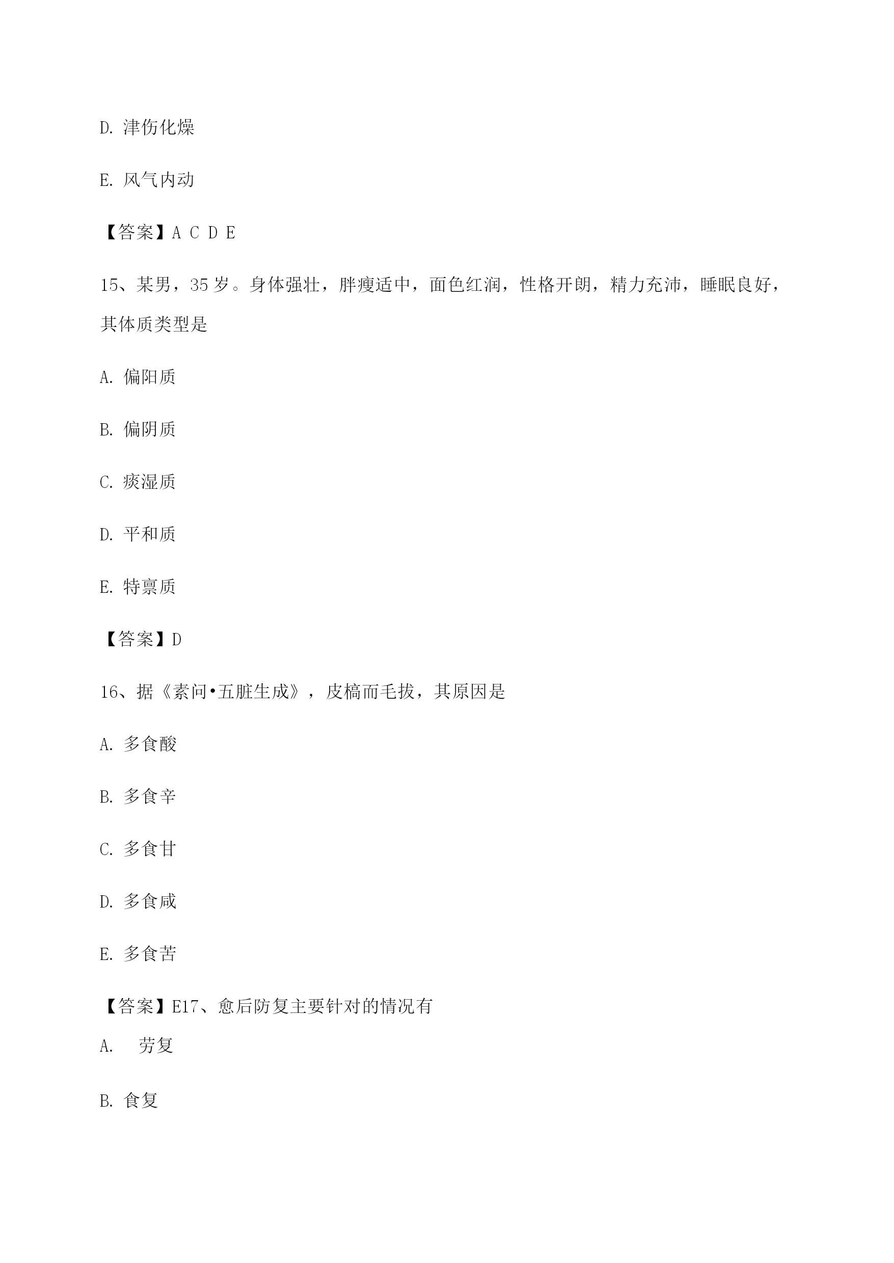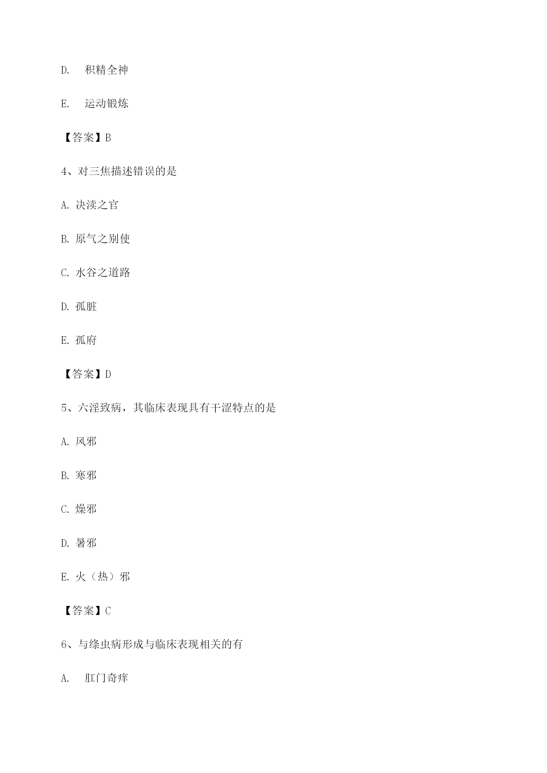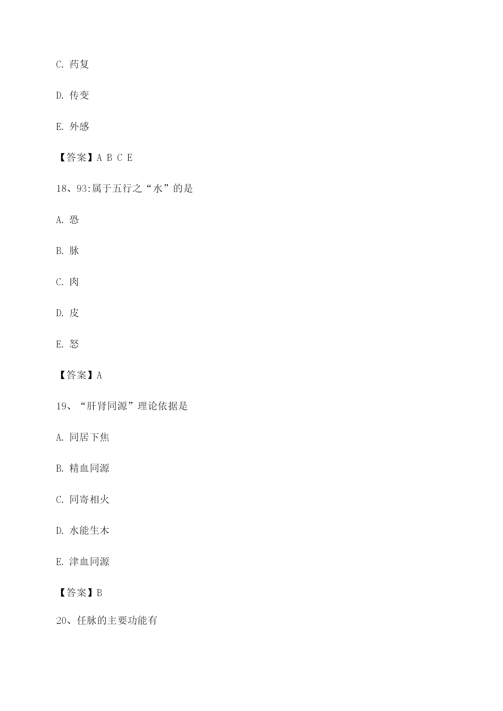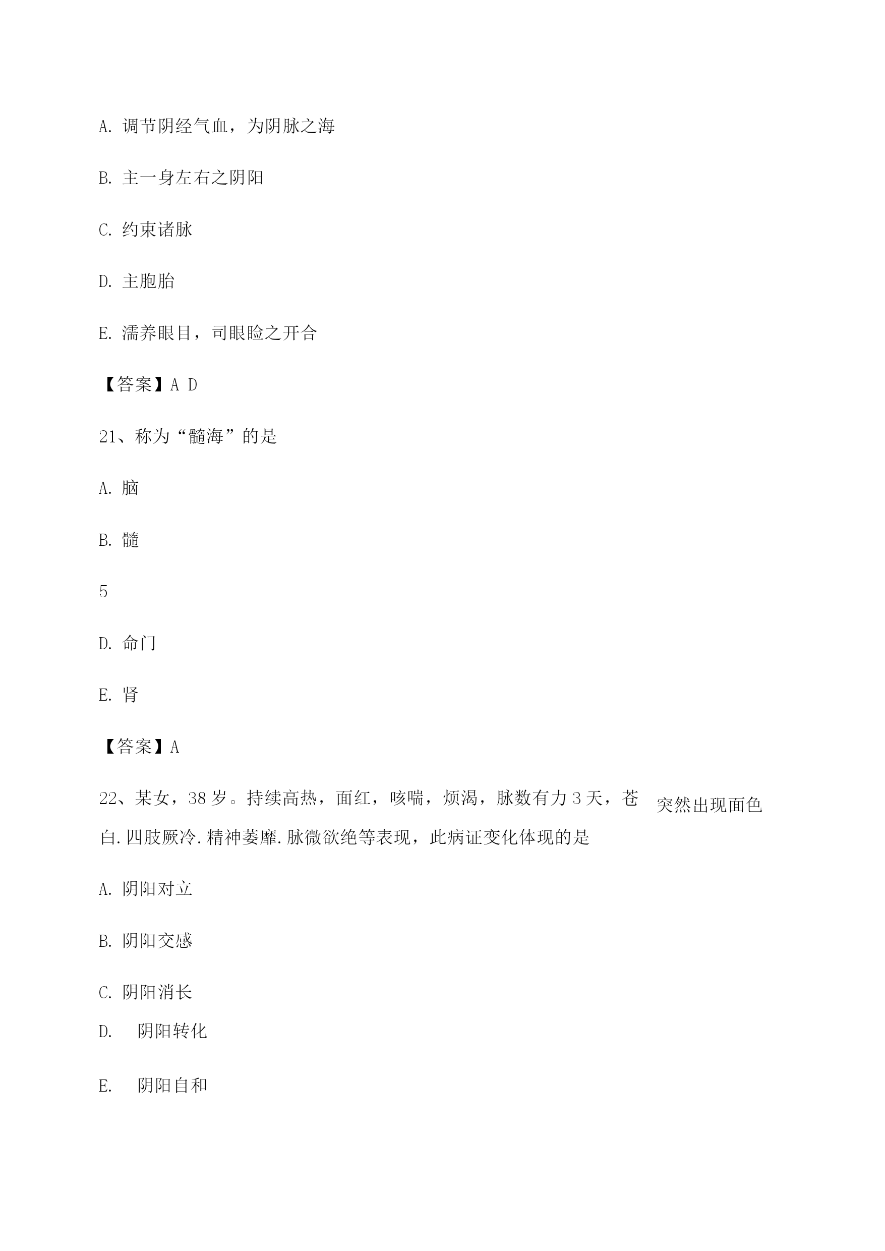 中医基础理论考试模拟题库1、中医学对发病原理的认识主要是正邪相搏阴阳失调饮食失调气血失常脏腑失调【答案】A2、被后人称为“补土派”的医家代表是李中梓李东垣陈无择叶天士刘完素【答案】B3、护肾养生的主要方法是饮食有节节欲保精劳逸有度积精全神运动锻炼【答案】B4、对三焦描述错误的是决渎之官原气之别使水谷之道路孤脏孤府【答案】D5、六淫致病,其临床表现具有干涩特点的是风邪寒邪燥邪暑邪火(热)邪【答案】C6、与绦虫病形成与临床表现相关的有肛门奇痒食欲亢进形体消瘦大便中有白色虫体节片食生的或未经煮熟的猪.牛肉【答案】BCDE7、阳虚患者常见的症状是腹痛拒按畏寒肢冷盗汗脉数脉细数【答案】B8、液分布部位表述错误的血脉骨节脏腑脑髓【答案】A9、燥邪最易伤脏的是TOC\o"1-5"\h\z心肝5肺肾【答案】D10、津分布部位表述错误的是肌肉皮肤脑髓血脉孔窍【答案】C11、人的生命活动的基本形式,即是气化变化转化形化运化【答案】A12、容易出现各种秽浊症状的邪气是风邪火(热)邪湿邪寒邪暑邪【答案】C13、《周易》分别用符号“--”“一”来表示的是寒热日月阴阳天地南北【答案】C14、内生五邪包括寒从中生暑从中生湿从中生津伤化燥风气内动【答案】ACDE15、某男,35岁。身体强壮,胖瘦适中,面色红润,性格开朗,精力充沛,睡眠良好,其体质类型是偏阳质偏阴质痰湿质平和质特禀质【答案】D16、据《素问•五脏生成》,皮槁而毛拔,其原因是多食酸多食辛多食甘多食咸多食苦【答案】E17、愈后防复主要针对的情况有劳复食复药复传变外感【答案】ABCE18、93:属于五行之“水”的是TOC\o"1-5"\h\z恐脉肉皮怒【答案】A19、“肝肾同源”理论依据是同居下焦精血同源同寄相火水能生木津血同源【答案】B20、任脉的主要功能有调节阴经气血,为阴脉之海主一身左右之阴阳约束诸脉主胞胎濡养眼目,司眼睑之开合【答案】AD21、称为“髓海”的是TOC\o"1-5"\h\z脑髓5命门肾【答案】A突然出现面色22、某女,38岁。持续高热,面红,咳喘,烦渴,脉数有力3天,苍白.四肢厥冷.精神萎靡.脉微欲绝等表现,此病证变化体现的是阴阳对立阴阳交感阴阳消长阴阳转化阴阳自和【答案】D23、生殖之精施泄主要依赖的是天癸作用肾阳推动。.脾胃纳运肝血充盈肺气宣肃【答案】A24、不属于“七冲门”的是吸门飞门户门气门阑门【答案】D25、与女子胞的生理功能关系密切的脏腑有/心肝5TOC\o"1-5"\h\z肺肾【答案】ABCE26、内燥多见的脏腑包括脾肺大肠5E.胃【答案】BCE27、到达舌的经脉有/心经肝经脾经胃经肾经【答案】CE28、某女,36岁。昨日与邻居吵架后出现急躁易怒.面红目赤.咳逆上气.咯血等症状,此病证变化属于木旺乘土土虚木乘木火刑金水不涵木水火不济【答案】C29、“益气升提”治法的适应证是气陷气郁气脱气闭气虚【答案】A30、反映人体生长发育程度.营养状况和锻炼程度的状态的是体型体重体格体态体能【答案】C31、幽门指大肠小肠会胃太仓下太仓上太仓【答案】C32、寒性收引是指寒邪阻滞气机寒邪耗气伤津寒邪使气机收敛寒邪损伤阳气寒邪重浊黏滞【答案】C33、在五神脏中,肺所藏的神是神魂魄意志【答案】C34、六淫中,属于阴邪的是寒邪暑邪火邪热邪风邪【答案】A35、创立“卫气营血辨证”理论的医家是吴又可王孟英薛生白吴鞠通叶天士【答案】E36、与足太阴相表里的经脉是足厥阴足少阳足阳明手太阳手少阳【答案】C37、根据五行相克规律确立的治法是培土生金法培土制水法滋水涵木法益火补土法益木生火法【答案】B38、肝与胆的生理关系包括同司疏泄共主勇怯气的生成血液贮藏纳运协调【答案】AB39、“精汁”藏于TOC\o"1-5"\h\z肾肝。.心精室胆【答案】E40、属于外感病因的有外风内风痰饮暑邪疠气【答案】ADE41、属于从治的是寒者热之以寒治寒用寒远寒阳病治阴阳中求阴【答案】B42、事物并无关联,不能用阴阳概括的是水与火天与地男与女夏与冬寒与上【答案】E43、由肾所藏先天之精化生的是营气元气宗气中气