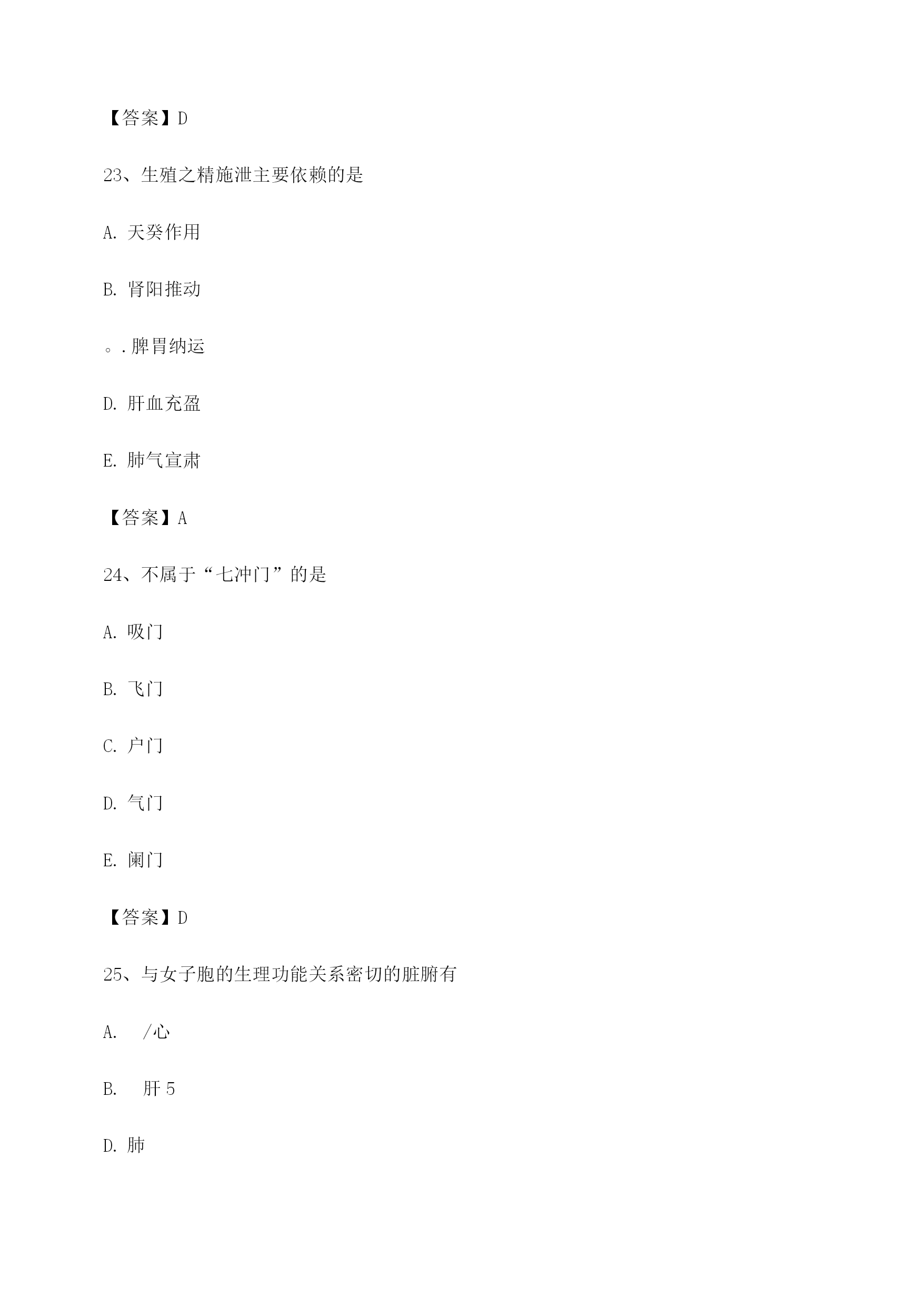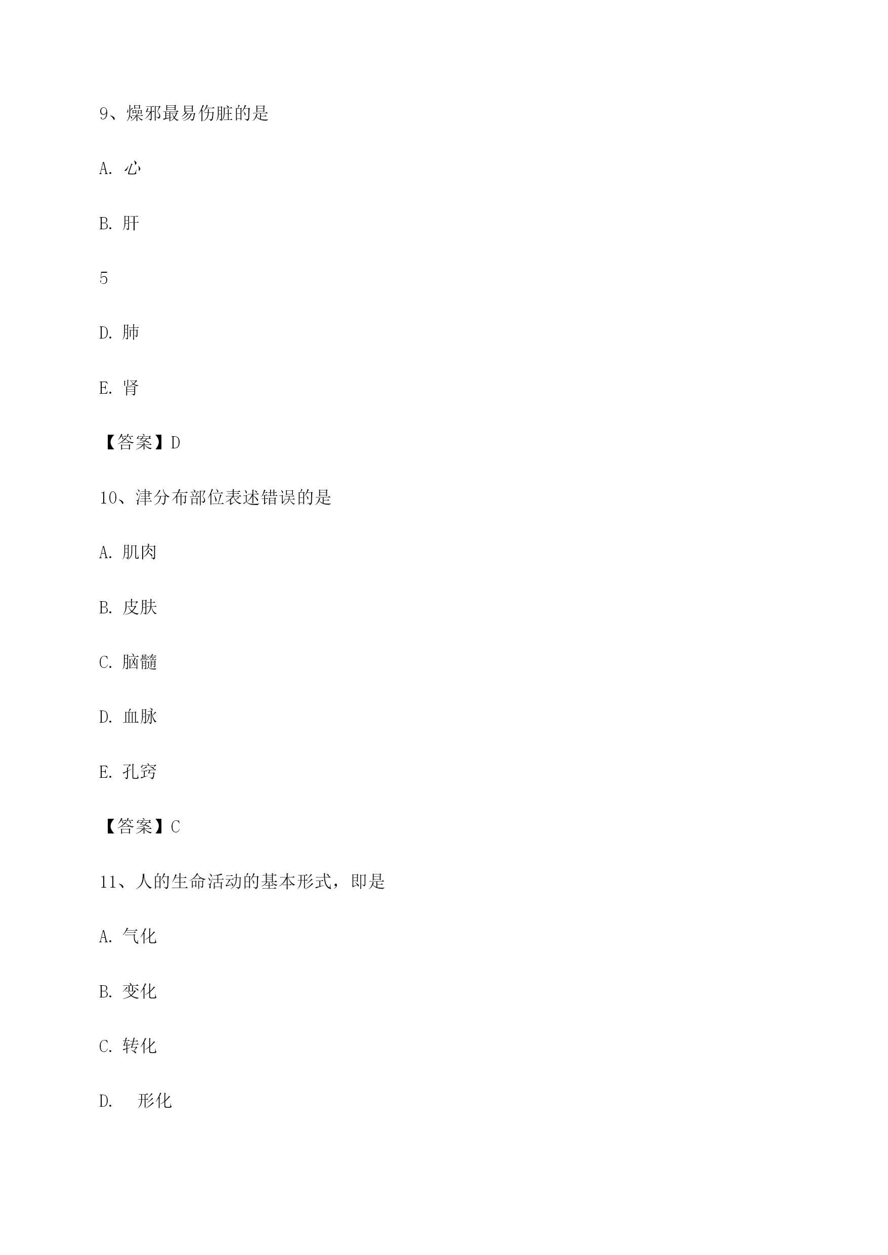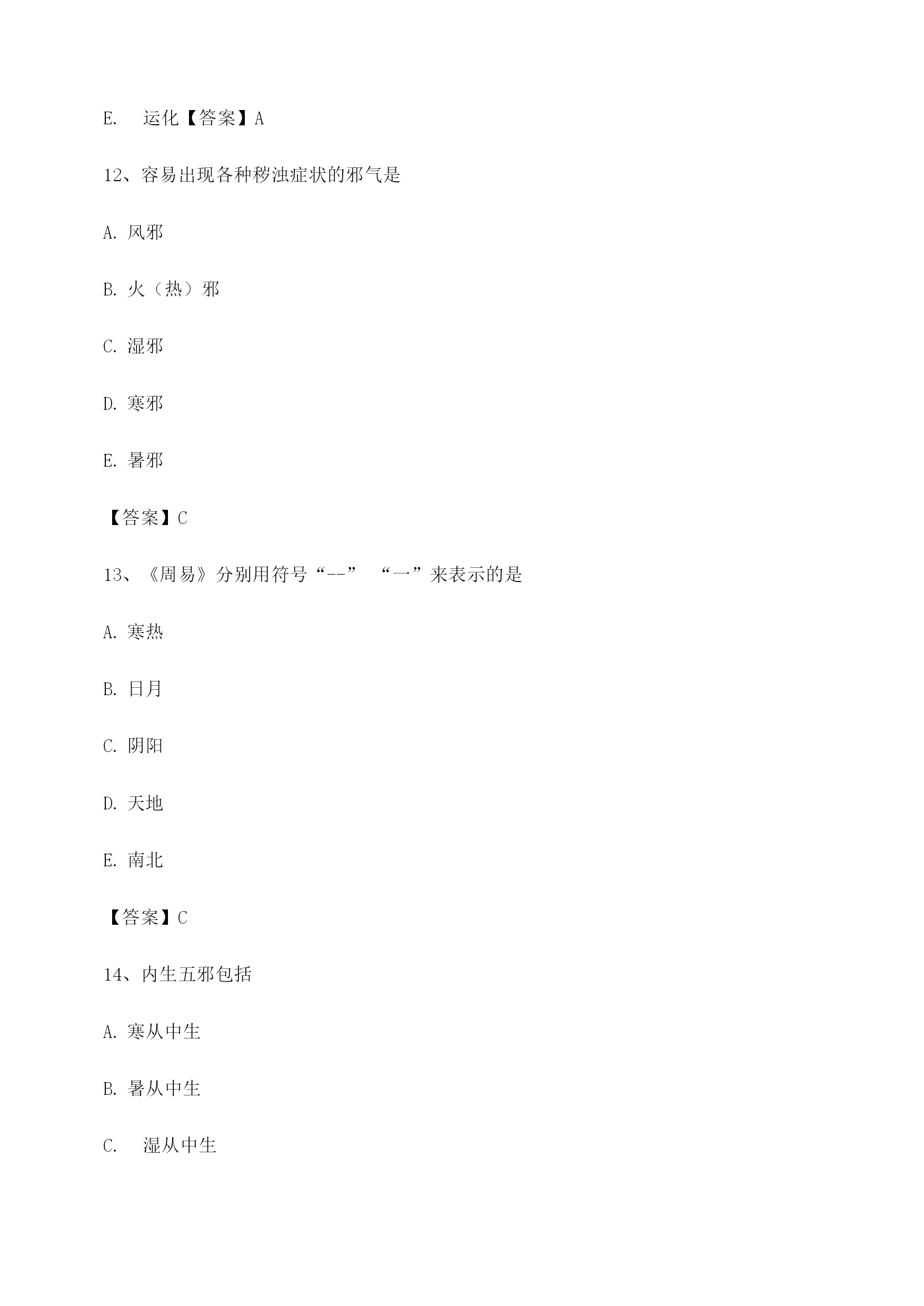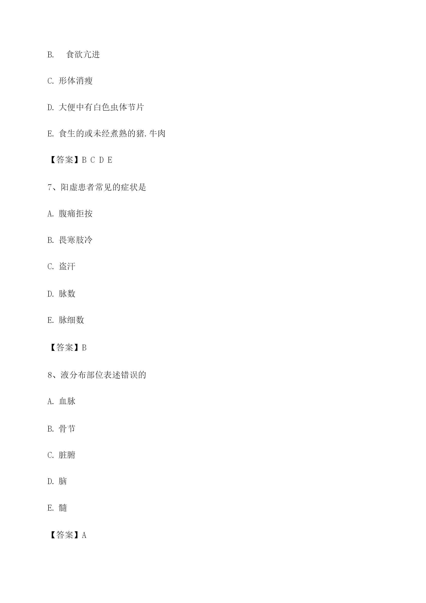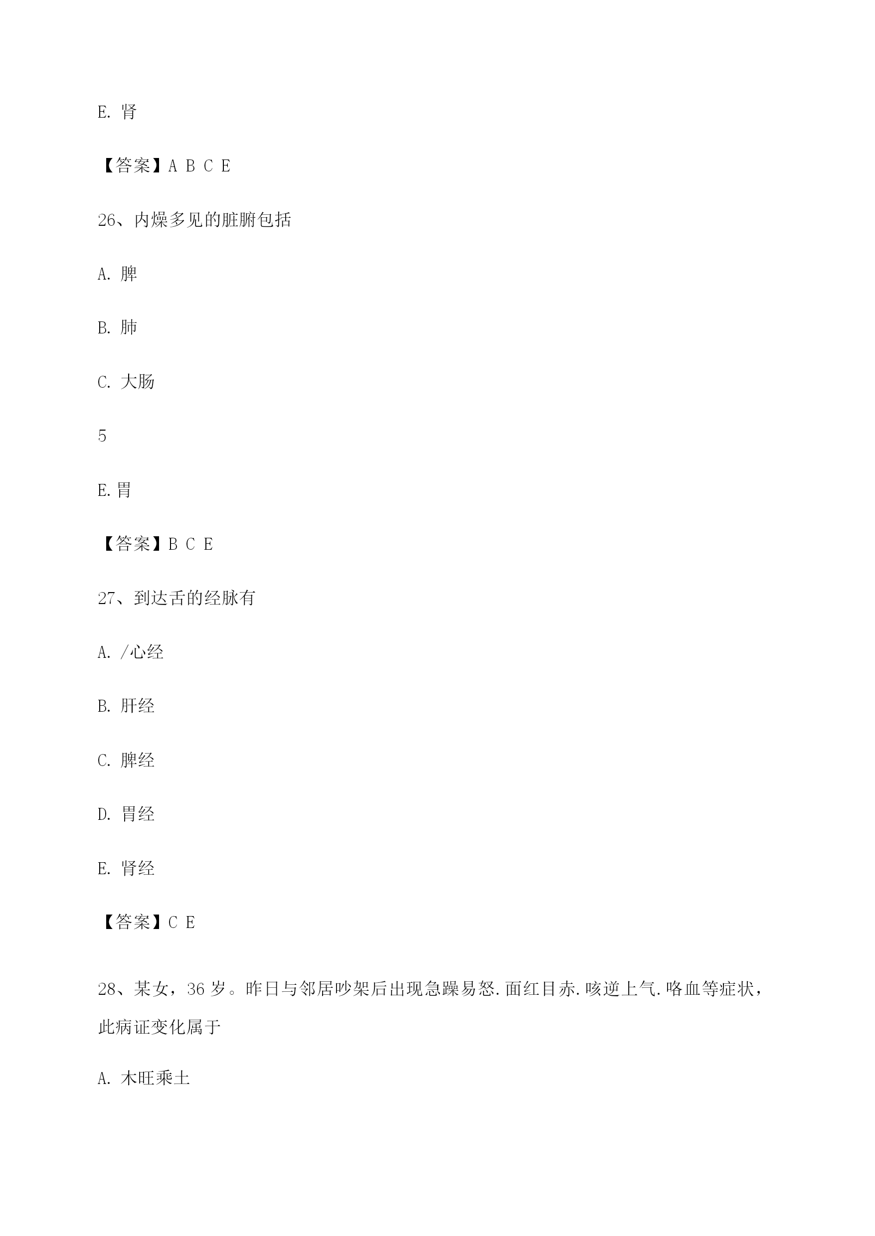 中医基础理论考试模拟题库1、中医学对发病原理的认识主要是正邪相搏阴阳失调饮食失调气血失常脏腑失调【答案】A2、被后人称为“补土派”的医家代表是李中梓李东垣陈无择叶天士刘完素【答案】B3、护肾养生的主要方法是饮食有节节欲保精劳逸有度积精全神运动锻炼【答案】B4、对三焦描述错误的是决渎之官原气之别使水谷之道路孤脏孤府【答案】D5、六淫致病,其临床表现具有干涩特点的是风邪寒邪燥邪暑邪火(热)邪【答案】C6、与绦虫病形成与临床表现相关的有肛门奇痒食欲亢进形体消瘦大便中有白色虫体节片食生的或未经煮熟的猪.牛肉【答案】BCDE7、阳虚患者常见的症状是腹痛拒按畏寒肢冷盗汗脉数脉细数【答案】B8、液分布部位表述错误的血脉骨节脏腑脑髓【答案】A9、燥邪最易伤脏的是TOC\o"1-5"\h\z心肝5肺肾【答案】D10、津分布部位表述错误的是肌肉皮肤脑髓血脉孔窍【答案】C11、人的生命活动的基本形式,即是气化变化转化形化运化【答案】A12、容易出现各种秽浊症状的邪气是风邪火(热)邪湿邪寒邪暑邪【答案】C13、《周易》分别用符号“--”“一”来表示的是寒热日月阴阳天地南北【答案】C14、内生五邪包括寒从中生暑从中生湿从中生津伤化燥风气内动【答案】ACDE15、某男,35岁。身体强壮,胖瘦适中,面色红润,性格开朗,精力充沛,睡眠良好,其体质类型是偏阳质偏阴质痰湿质平和质特禀质【答案】D16、据《素问•五脏生成》,皮槁而毛拔,其原因是多食酸多食辛多食甘多食咸多食苦【答案】E17、愈后防复主要针对的情况有劳复食复药复传变外感【答案】ABCE18、93:属于五行之“水”的是TOC\o"1-5"\h\z恐脉肉皮怒【答案】A19、“肝肾同源”理论依据是同居下焦精血同源同寄相火水能生木津血同源【答案】B20、任脉的主要功能有调节阴经气血,为阴脉之海主一身左右之阴阳约束诸脉主胞胎濡养眼目,司眼睑之开合【答案】AD21、称为“髓海”的是TOC\o"1-5"\h\z脑髓5命门肾【答案】A突然出现面色22、某女,38岁。持续高热,面红,咳喘,烦渴,脉数有力3天,苍白.四肢厥冷.精神萎靡.脉微欲绝等表现,此病证变化体现的是阴阳对立阴阳交感阴阳消长阴阳转化阴阳自和【答案】D23、生殖之精施泄主要依赖的是天癸作用肾阳推动。.脾胃纳运肝血充盈肺气宣肃【答案】A24、不属于“七冲门”的是吸门飞门户门气门阑门【答案】D25、与女子胞的生理功能关系密切的脏腑有/心肝5TOC\o"1-5"\h\z肺肾【答案】ABCE26、内燥多见的脏腑包括脾肺大肠5E.胃【答案】BCE27、到达舌的经脉有/心经肝经脾经胃经肾经【答案】CE28、某女,36岁。昨日与邻居吵架后出现急躁易怒.面红目赤.咳逆上气.咯血等症状,此病证变化属于木旺乘土土虚木乘木火刑金水不涵木水火不济【答案】C29、“益气升提”治法的适应证是气陷气郁气脱气闭气虚【答案】A30、反映人体生长发育程度.营养状况和锻炼程度的状态的是体型体重体格体态体能【答案】C31、幽门指大肠小肠会胃太仓下太仓上太仓【答案】C32、寒性收引是指寒邪阻滞气机寒邪耗气伤津寒邪使气机收敛寒邪损伤阳气寒邪重浊黏滞【答案】C33、在五神脏中,肺所藏的神是神魂魄意志【答案】C34、六淫中,属于阴邪的是寒邪暑邪火邪热邪风邪【答案】A35、创立“卫气营血辨证”理论的医家是吴又可王孟英薛生白吴鞠通叶天士【答案】E36、与足太阴相表里的经脉是足厥阴足少阳足阳明手太阳手少阳【答案】C37、根据五行相克规律确立的治法是培土生金法培土制水法滋水涵木法益火补土法益木生火法【答案】B38、肝与胆的生理关系包括同司疏泄共主勇怯气的生成血液贮藏纳运协调【答案】AB39、“精汁”藏于TOC\o"1-5"\h\z肾肝。.心精室胆【答案】E40、属于外感病因的有外风内风痰饮暑邪疠气【答案】ADE41、属于从治的是寒者热之以寒治寒用寒远寒阳病治阴阳中求阴【答案】B42、事物并无关联,不能用阴阳概括的是水与火天与地男与女夏与冬寒与上【答案】E43、由肾所藏先天之精化生的是营气元气宗气中气
