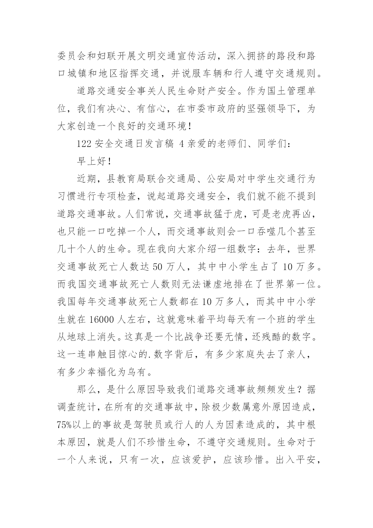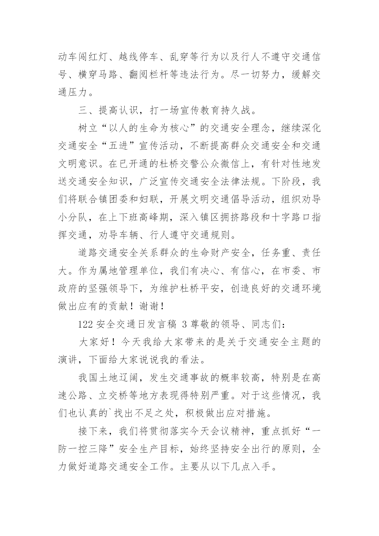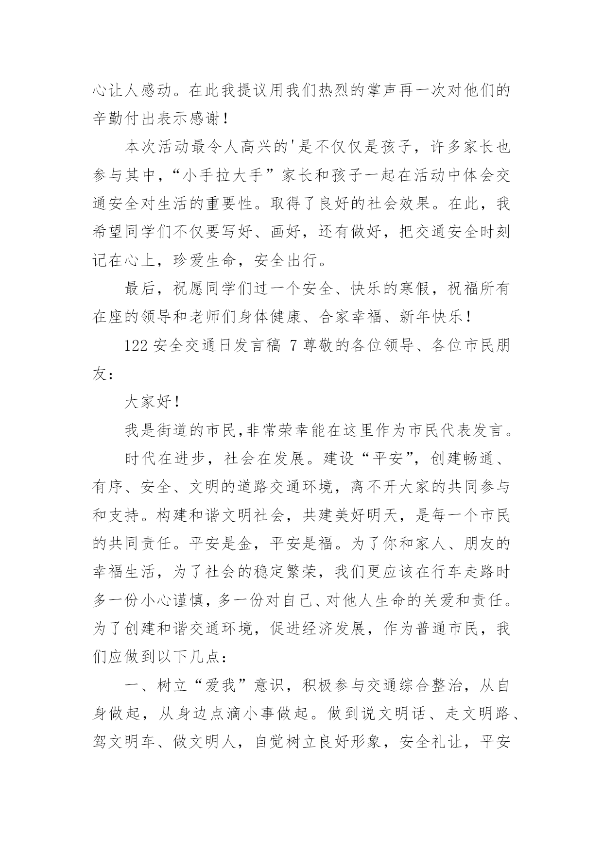 122安全交通日发言稿122安全交通日发言稿(通用14篇)在不断进步的时代,发言稿在我们的视野里出现的频率越来越高,发言稿是参加会议者为了在会议或重要活动上表达自己意见、看法或汇报思想工作情况而事先准备好的文稿。怎么写发言稿才能避免踩雷呢?以下是小编帮大家整理的122安全交通日发言稿,欢迎阅读与收藏。122安全交通日发言稿1尊敬的老师,亲爱的同学们:大家好!我们应该时刻牢记交通规则,不论做什么都应该把安全放在第一位。比如,在繁忙的十字路口,四面都悬挂着红黄绿三种信号灯,这时候我们就应该做到红灯停,黄灯等,绿灯行,过马路才会安全。当我们随爸爸妈妈一起出行时,我们要提醒爸爸妈妈要做到各行其道,靠右行驶,看清警示牌,我们才能做到安全出行、平安归家。不能逞一时之快,将自己的生命当儿戏。同学们,人的生命只有一次,不可能重来,生命是宝贵的`,重视交通安全是我们每个公民的义务,更是我们每个公民的责任,让我们携起手来,共同呵护这朵生命之花,愿我们都能远离交通事故,远离伤痛,珍爱生命吧!我的演讲完毕,谢谢大家!122安全交通日发言稿2各位领导、同志们:我们杜桥地域广,发生交通事故概率高,特别是随着83省道、椒江二桥开通后,杜桥的道路交通安全将面临着更严峻的形势。对此,我们认真查找不足、积极应对形势发展的要求。接下来,我们将贯彻落实今天的会议精神,围绕政府提出的“一防一制三下降”的安全生产工作目标,始终坚持“源头管理,系统治理”的原则,全力以赴做好道路交通安全工作。我代表杜桥镇政府表态如下:一、认真整改,打一场隐患歼灭战。我们将积极协调交警、公管等部门,分时段、分重点,有针对性地开展道路交通安全隐患排查整治行动。检查道路交通信号灯、标志标线、防撞、隔离设施、技术监控设备等设置及维护情况,特别是重点路段的设置情况,落实专人维护保养,确保交通安全设施正常使用。全面排查辖区内事故多发点段、危险路段等道路隐患路段,逐一梳理,建立工作台账并落实整改,在整改到位前我们将加强巡逻监管和执勤警力。加强重点车辆管理,对辖区内工程车、客运车、校车等进行登记备案,定期检查车辆状况,减少车辆上路的`安全隐患。二、狠抓执法,打一场违法行为攻坚战。积极调配警力,加强重点路面巡查力度,组织公安部门和交警部门联合开展专项整治行动。针对机动车超速行驶、疲劳驾驶、客车超员、货车超载、拖拉机、货运车辆违法载人等易造成群死群伤道路交通事故的严重交通违法行为,坚决予以查处,做到处罚一起,警示一片。每周开展禁酒驾集中整治行动,常态化查处酒后驾驶和醉酒驾驶。严查对非机动车闯红灯、越线停车、乱穿等行为以及行人不遵守交通信号、横穿马路、翻阅栏杆等违法行为。尽一切努力,缓解交通压力。三、提高认识,打一场宣传教育持久战。树立“以人的生命为核心”的交通安全理念,继续深化交通安全“五进”宣传活动,不断提高群众交通安全和交通文明意识。在已开通的杜桥交警公众微信上,有针对性地发送交通安全知识,广泛宣传交通安全法律法规。下阶段,我们将联合镇团委和妇联,开展文明交通倡导活动,组织劝导小分队,在上下班高峰期,深入镇区拥挤路段和十字路口指挥交通,劝导车辆、行人遵守交通规则。道路交通安全关系群众的生命财产安全,任务重、责任大。作为属地管理单位,我们有决心、有信心,在市委、市政府的坚强领导下,为维护杜桥平安,创造良好的交通环境做出应有的贡献!谢谢!122安全交通日发言稿3尊敬的领导、同志们:大家好!今天我给大家带来的是关于交通安全主题的演讲,下面给大家说说我的看法。我国土地辽阔,发生交通事故的概率较高,特别是在高速公路、立交桥等地方表现得特别严重。对于这些情况,我们也认真的`找出不足之处,积极做出应对措施。接下来,我们将贯彻落实今天会议精神,重点抓好“一防一控三降”安全生产目标,始终坚持安全出行的原则,全力做好道路交通安全工作。主要从以下几点入手。一、认真整顿积极配合交警、公共管理部门,分阶段、重点开展有针对性的道路交通安全隐患整治行动。检查道路交通灯、标志物、隔离设施、技术监控设备等,特别是重点路段的检查,指派专项维修人员,确保交通安全设施的正常使用。全面清理交通事故多发路段和危险路段。整顿前加强巡逻、监督和执勤警力建设,加强重点车辆管理,对辖区内工程车辆、客车、校车进行登记备案,定期检查状况,减少道路安全隐患。二、加强执法积极部署警力,加强重点路段巡查,组织公安、交警等部门联合开展专项整治行动。坚决查处机动车超速行驶、疲劳驾驶、客车超载、货车超载等可能造成重大伤亡的交通违法行为。每周开展集中整治醉驾行为,定期查处醉驾行为。严格查处闯红灯、越线、乱穿马路等非机动车违法行为,以及行人不遵守交通信号、过马路、翻越栏杆等违法行为。尽一切努力缓解交通压力。三、提高教育意识树立“以人为本”的交通安全理念,继续深化交通安全“