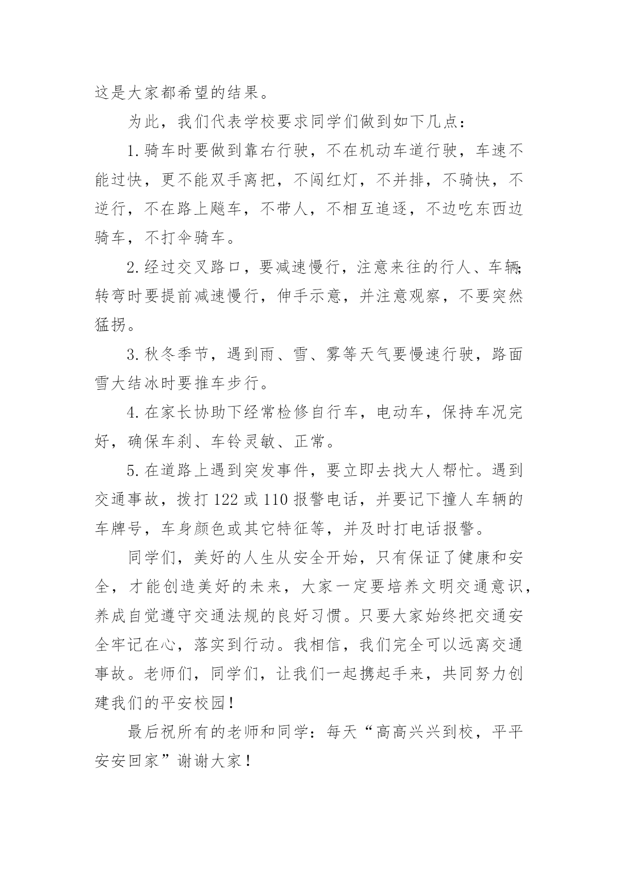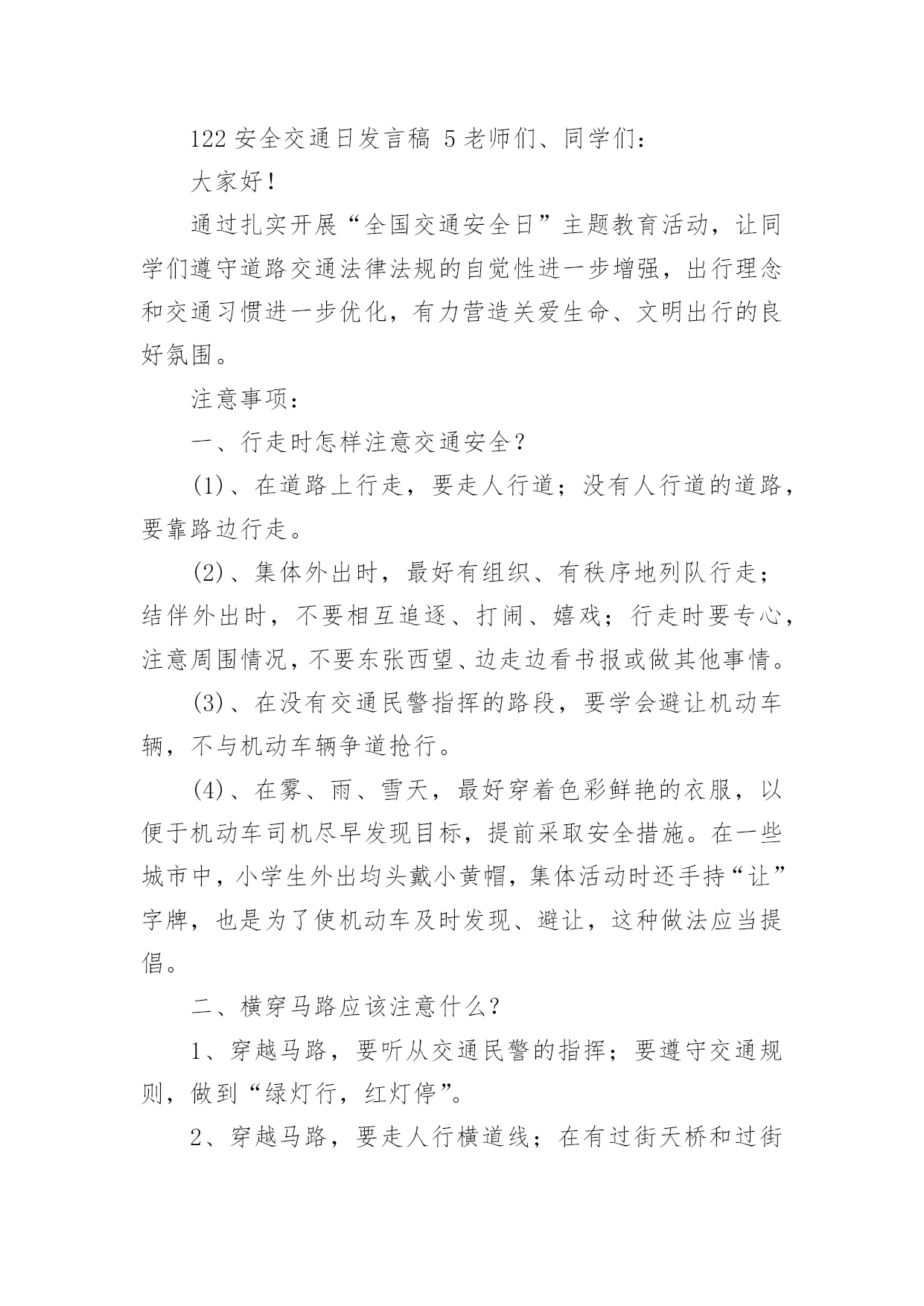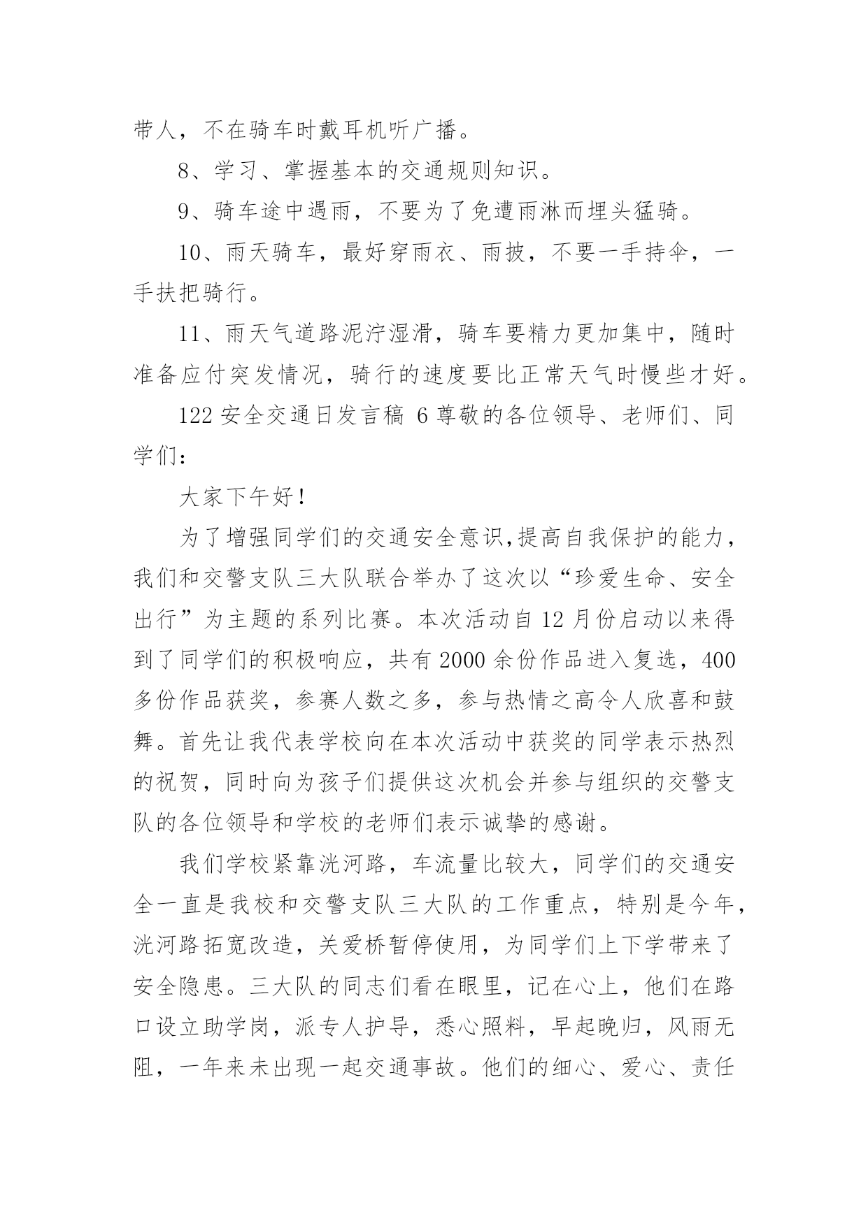 122安全交通日发言稿122安全交通日发言稿(通用14篇)在不断进步的时代,发言稿在我们的视野里出现的频率越来越高,发言稿是参加会议者为了在会议或重要活动上表达自己意见、看法或汇报思想工作情况而事先准备好的文稿。怎么写发言稿才能避免踩雷呢?以下是小编帮大家整理的122安全交通日发言稿,欢迎阅读与收藏。122安全交通日发言稿1尊敬的老师,亲爱的同学们:大家好!我们应该时刻牢记交通规则,不论做什么都应该把安全放在第一位。比如,在繁忙的十字路口,四面都悬挂着红黄绿三种信号灯,这时候我们就应该做到红灯停,黄灯等,绿灯行,过马路才会安全。当我们随爸爸妈妈一起出行时,我们要提醒爸爸妈妈要做到各行其道,靠右行驶,看清警示牌,我们才能做到安全出行、平安归家。不能逞一时之快,将自己的生命当儿戏。同学们,人的生命只有一次,不可能重来,生命是宝贵的`,重视交通安全是我们每个公民的义务,更是我们每个公民的责任,让我们携起手来,共同呵护这朵生命之花,愿我们都能远离交通事故,远离伤痛,珍爱生命吧!我的演讲完毕,谢谢大家!122安全交通日发言稿2各位领导、同志们:我们杜桥地域广,发生交通事故概率高,特别是随着83省道、椒江二桥开通后,杜桥的道路交通安全将面临着更严峻的形势。对此,我们认真查找不足、积极应对形势发展的要求。接下来,我们将贯彻落实今天的会议精神,围绕政府提出的“一防一制三下降”的安全生产工作目标,始终坚持“源头管理,系统治理”的原则,全力以赴做好道路交通安全工作。我代表杜桥镇政府表态如下:一、认真整改,打一场隐患歼灭战。我们将积极协调交警、公管等部门,分时段、分重点,有针对性地开展道路交通安全隐患排查整治行动。检查道路交通信号灯、标志标线、防撞、隔离设施、技术监控设备等设置及维护情况,特别是重点路段的设置情况,落实专人维护保养,确保交通安全设施正常使用。全面排查辖区内事故多发点段、危险路段等道路隐患路段,逐一梳理,建立工作台账并落实整改,在整改到位前我们将加强巡逻监管和执勤警力。加强重点车辆管理,对辖区内工程车、客运车、校车等进行登记备案,定期检查车辆状况,减少车辆上路的`安全隐患。二、狠抓执法,打一场违法行为攻坚战。积极调配警力,加强重点路面巡查力度,组织公安部门和交警部门联合开展专项整治行动。针对机动车超速行驶、疲劳驾驶、客车超员、货车超载、拖拉机、货运车辆违法载人等易造成群死群伤道路交通事故的严重交通违法行为,坚决予以查处,做到处罚一起,警示一片。每周开展禁酒驾集中整治行动,常态化查处酒后驾驶和醉酒驾驶。严查对非机动车闯红灯、越线停车、乱穿等行为以及行人不遵守交通信号、横穿马路、翻阅栏杆等违法行为。尽一切努力,缓解交通压力。三、提高认识,打一场宣传教育持久战。树立“以人的生命为核心”的交通安全理念,继续深化交通安全“五进”宣传活动,不断提高群众交通安全和交通文明意识。在已开通的杜桥交警公众微信上,有针对性地发送交通安全知识,广泛宣传交通安全法律法规。下阶段,我们将联合镇团委和妇联,开展文明交通倡导活动,组织劝导小分队,在上下班高峰期,深入镇区拥挤路段和十字路口指挥交通,劝导车辆、行人遵守交通规则。道路交通安全关系群众的生命财产安全,任务重、责任大。作为属地管理单位,我们有决心、有信心,在市委、市政府的坚强领导下,为维护杜桥平安,创造良好的交通环境做出应有的贡献!谢谢!122安全交通日发言稿3尊敬的领导、同志们:大家好!今天我给大家带来的是关于交通安全主题的演讲,下面给大家说说我的看法。我国土地辽阔,发生交通事故的概率较高,特别是在高速公路、立交桥等地方表现得特别严重。对于这些情况,我们也认真的`找出不足之处,积极做出应对措施。接下来,我们将贯彻落实今天会议精神,重点抓好“一防一控三降”安全生产目标,始终坚持安全出行的原则,全力做好道路交通安全工作。主要从以下几点入手。一、认真整顿积极配合交警、公共管理部门,分阶段、重点开展有针对性的道路交通安全隐患整治行动。检查道路交通灯、标志物、隔离设施、技术监控设备等,特别是重点路段的检查,指派专项维修人员,确保交通安全设施的正常使用。全面清理交通事故多发路段和危险路段。整顿前加强巡逻、监督和执勤警力建设,加强重点车辆管理,对辖区内工程车辆、客车、校车进行登记备案,定期检查状况,减少道路安全隐患。二、加强执法积极部署警力,加强重点路段巡查,组织公安、交警等部门联合开展专项整治行动。坚决查处机动车超速行驶、疲劳驾驶、客车超载、货车超载等可能造成重大伤亡的交通违法行为。每周开展集中整治醉驾行为,定期查处醉驾行为。严格查处闯红灯、越线、乱穿马路等非机动车违法行为,以及行人不遵守交通信号、过马路、翻越栏杆等违法行为。尽一切努力缓解交通压力。三、提高教育意识树立“以人为本”的交通安全理念,继续深化交通安全“