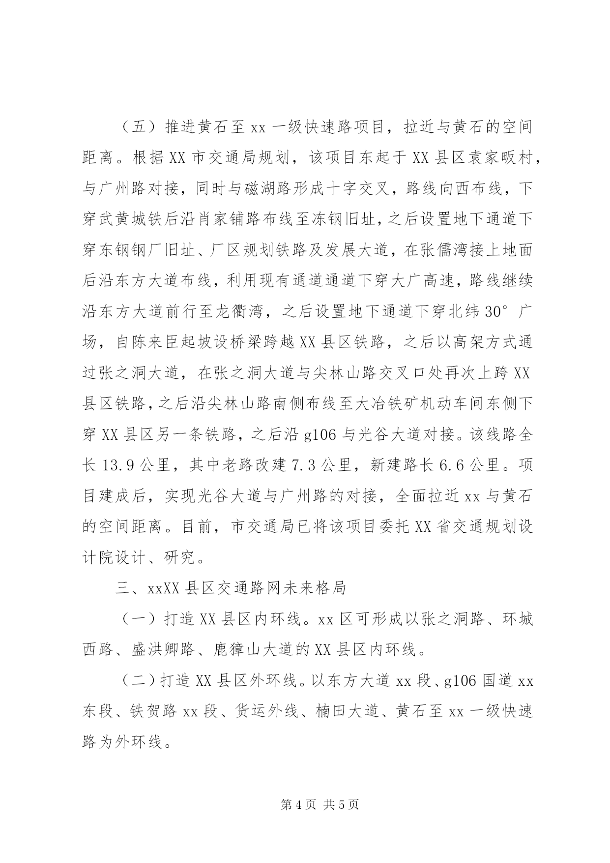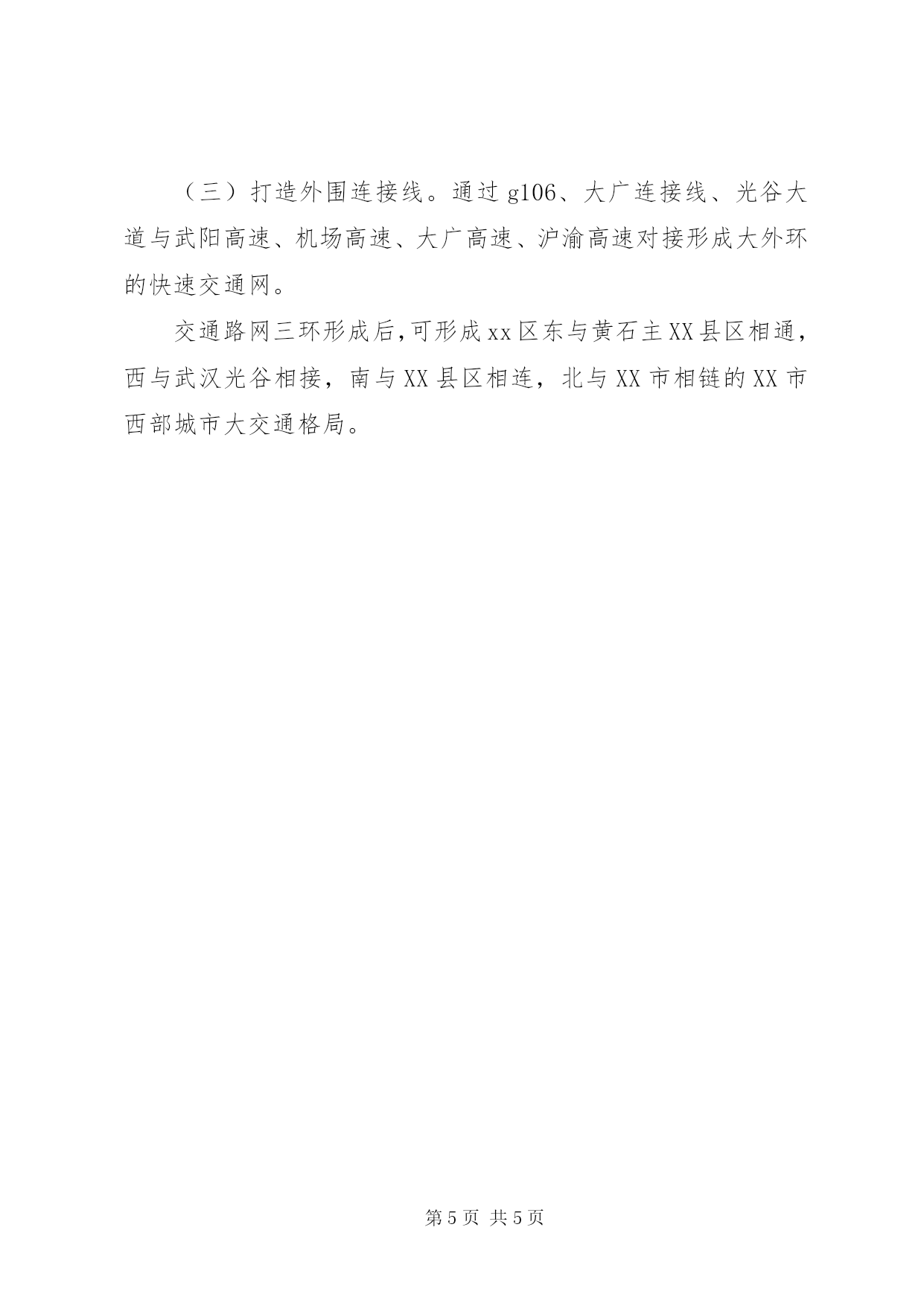 第PAGE\*Arabic\*MERGEFORMAT5页共NUMPAGES\*MERGEFORMAT5页打造山区特色交通工作设想随着xx区城市的迅速发展,交通路网和设施不敷应用,交通堵塞等问题也日益突出。因此,“打造xx城市特色交通”成为未来3年区政府的一项重点工作。一、目前xxXX县区交通道路基本情况xx目前主要交通路网由一条国道(g106)、一条省道(s314)、一条高速连接线(大广南高速连接线)及XX县区内14条主次干道(xx大道、鹿獐山大道、建设路、胜利路、广友路、向阳路、建安路、友爱路、盛洪卿路、兴冶路、张之洞路、东方大道、光谷大道)组成。XX县区道路基本都存在建设年限久、建造等级低、配套设施差等问题。g106作为主要货运运输通道,重载货车过境造成XX县区沿线路面破损严重,抛洒、扬尘、噪音等污染问题,严重影响xx对外形象及居民生活环境。二、下一步XX县区交通建设发展方向今年以来,我局为彻底解决XX县区道路基础设施落后,道路拥堵、污染严重的问题,积极谋划,主动作为,大力推进交通建设,计划在“十三五”期间构建xx大交通格局,逐步完善XX县区交通基础设施建设:(一)推进老桥洞改扩建工程,改善交通拥堵问题。根据计划,老桥洞改扩宽工程在现有9米宽双向2车道、人车混流的基础上,扩宽为双向4车道23.5米宽桥洞,洞内采取人车分流的建设方案,项目建成后将与大广连接线正面对接,将有效改善桥洞狭窄车辆拥堵问题,行人、行车交通安全得到保障,与此同时我们秉承建一物添一景的传统,将该桥洞建为通行、景观二合一工程,将xx南大门建设为xx特色地标。目前,我局正在与武汉铁路局及相关部门进行积极谈判、对上积极争取资金,力争在3年内启动。(二)推进环城路建设工程,实现XX县区内循环。环城西路工程已开工建设,该工程长约1公里、宽15米,预计于元旦前可完工。该道路主要是将张之洞大道与盛洪卿路进行连接,建成后与鹿獐山大道、张之洞大道、环城西路、盛洪卿路形成XX县区内环线。届时,该道路将有效分担XX县区内车辆压力,有效的缓解XX县区交通拥堵问题。目前,该路段建设已完成95%的拆迁总量,排水管网已下埋、土方换填已完成,计划本月底完成水稳层铺设工作,元旦前刷黑,与之配套的陈来臣至盛洪卿十字路口段扩宽刷黑也已纳入计划,力争春节前完成。(三)推进货运外环线工程,实现货运外循环。以g106改线为契机,我区拟建木栏至三岔路连接线,延伸至还地桥,形成货运外环线,起点为xxXX县区工业园楠田大道(远期为迎宾们106国道相接),终点为还地桥镇屏山村铁贺路,该线路全长约2.4公里。该线路建成后,将景冶大道与光谷大道进行连接,替代g106国道xx段的货运作用,实现客货分流,将g106贯穿xxXX县区的尴尬局面化解,彻底解决XX县区内重载货车过境的污染问题。目前,该工程可持续研究已由省交通设计院完成,道路线性设计也同步进行并完成,一标段已纳入工矿地地块治理范围,二标段正在进行施工设计,计划元旦前完成招投标、征地等相关工作,春节前启动施工,三标段的下穿武九铁路23.5米宽桥洞工程采取epc工程总承包模式,正在与中铁十一局进行积极谈判,已基本完成,计划2018年5月份开工建设,10月1日前完工。整个工程的决定时间节点为工矿地治理工程,该工程完工后即具备初步通车条件,后期规划降坡、拓宽、延伸,计划2019年底全线完工。(四)推进楠田大道建设工程,开通工业运输走廊。为服务促进XX县区工业园的发展,我区拟建一条贯穿园区的工业运输线,该项目位于xx区木栏片区,东起老土桥106国道,西至大冶还地桥曙光,全长2500米,路幅为17米,其中车行道为12米(采用沥青砼路面结构),两侧各2.5米的人行道,建设内容包括车行道、人行道、绿化带、路灯照明、排水管网、供水管道等。楠田大道一期800米工程已全部完工,二期已完成招投标工程,施工队伍即刻进场施工。项目建成后将与光谷大道xx段一并形成xx区城市由东至西的主路网,对促进XX县区工业园发展创造有利的交通环境。(五)推进黄石至xx一级快速路项目,拉近与黄石的空间距离。根据XX市交通局规划,该项目东起于XX县区袁家畈村,与广州路对接,同时与磁湖路形成十字交叉,路线向西布线,下穿武黄城铁后沿肖家铺路布线至冻钢旧址,之后设置地下通道下穿东钢钢厂旧址、厂区规划铁路及发展大道,在张儒湾接上地面后沿东方大道布线,利用现有通道通道下穿大广高速,路线继续沿东方大道前行至龙衢湾,之后设置地下通道下穿北纬30°广场,自陈来臣起坡设桥梁跨越XX县区铁路,之后以高架方式通过张之洞大道,在张之洞大道与尖林山路交叉口处再次上跨XX县区铁路,之后沿尖林山路南侧布线至大冶铁矿机动车间东侧下穿XX县区另一条铁路,之后沿g106与光谷大道对接。该线路全长13.9公里,其