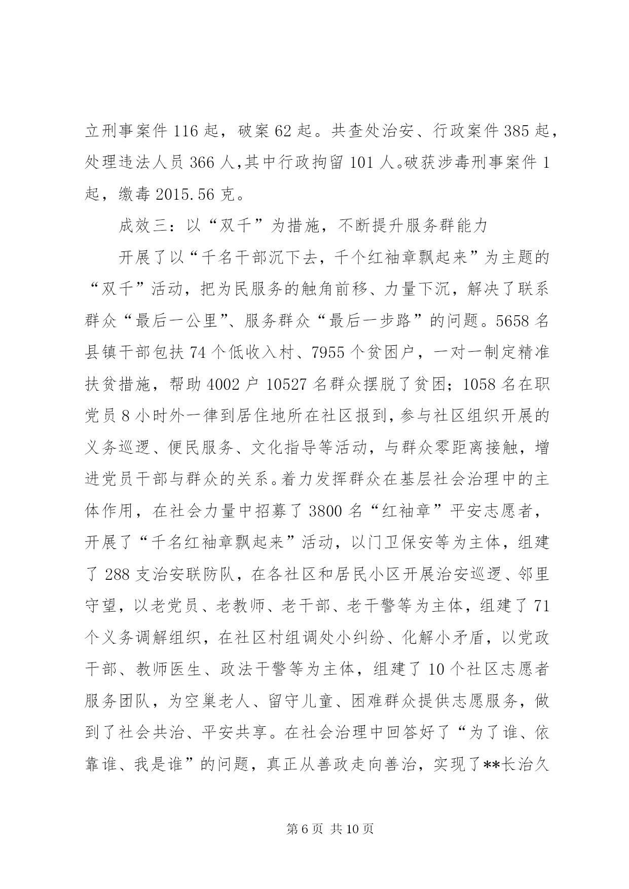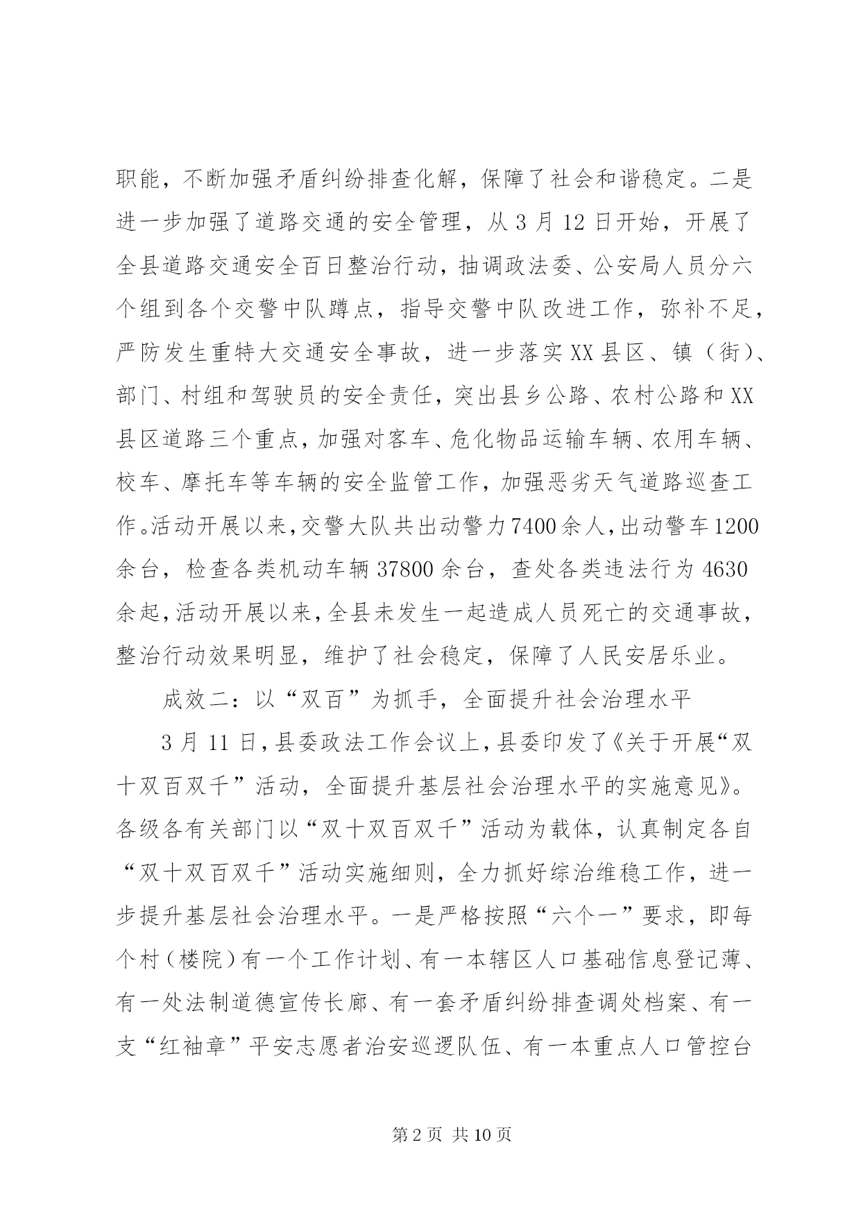 第PAGE\*Arabic\*MERGEFORMAT10页共NUMPAGES\*MERGEFORMAT10页县XX年上半年政法工作总结今年上半年,**县认真贯彻十八届三中、四中、五中全会和习近平总书记系列讲话精神,全面落实中省市委政法工作会议要求,以“双十双百双千”活动为抓手,不断开拓创新,多措并举,全县政法、综治、维稳各项工作推进有序,成效显著。成效一:以“双十”为契机,全力维护社会和谐稳定一是进一步夯实了维稳第一责任人责任和部门主体责任,不断提高维护稳定的能力和水平。开展了由全体县委常委包联10个镇(街),10个政法部门包抓10个镇(街)的“双十”活动,形成了上下联动、齐抓共管的工作格局。各镇(街)以“双十”为契机,夯实了“一把手”责任,不断创新工作方式方法,畅通服务群众的渠道,组织和协调各方面力量,化解主要矛盾,解决突出问题,破解发展难题,维护了社会和谐稳定。各镇(街)均建成了“社会资源整合、工作力量聚合、服务集成融合”的“440”便民服务中心和“8+x”综治维稳中心,为群众提供“一厅式办公、一站式服务”,收到了方便群众办事、提高办事效率的实效,得到群众的广泛好评。建华镇将综治维稳、信访调解、民政事务、公安警务、司法调解资源有机整合,组建“五位一体”的“模拟法庭”,发挥了化解矛盾纠纷的聚集效应,成了解决群众问题的“便民超市”。政法各单位围绕文明执法、公正司法、廉洁高效、群众满意的工作目标,充分发挥“三官一律”工作室职能,不断加强矛盾纠纷排查化解,保障了社会和谐稳定。二是进一步加强了道路交通的安全管理,从3月12日开始,开展了全县道路交通安全百日整治行动,抽调政法委、公安局人员分六个组到各个交警中队蹲点,指导交警中队改进工作,弥补不足,严防发生重特大交通安全事故,进一步落实XX县区、镇(街)、部门、村组和驾驶员的安全责任,突出县乡公路、农村公路和XX县区道路三个重点,加强对客车、危化物品运输车辆、农用车辆、校车、摩托车等车辆的安全监管工作,加强恶劣天气道路巡查工作。活动开展以来,交警大队共出动警力7400余人,出动警车1200余台,检查各类机动车辆37800余台,查处各类违法行为4630余起,活动开展以来,全县未发生一起造成人员死亡的交通事故,整治行动效果明显,维护了社会稳定,保障了人民安居乐业。成效二:以“双百”为抓手,全面提升社会治理水平3月11日,县委政法工作会议上,县委印发了《关于开展“双十双百双千”活动,全面提升基层社会治理水平的实施意见》。各级各有关部门以“双十双百双千”活动为载体,认真制定各自“双十双百双千”活动实施细则,全力抓好综治维稳工作,进一步提升基层社会治理水平。一是严格按照“六个一”要求,即每个村(楼院)有一个工作计划、有一本辖区人口基础信息登记薄、有一处法制道德宣传长廊、有一套矛盾纠纷排查调处档案、有一支“红袖章”平安志愿者治安巡逻队伍、有一本重点人口管控台账,扎实开展了“平安法治村”和“平安楼院”创建工作。在每个创建村和楼院选派1名政法干警担任法律顾问或“平安大使”,重点开展百名干警包抓百个平安法治村和平安楼院创建活动。挑选素质过硬、业务精通的政法干警驻村蹲点,开展法律宣传、指导治安防范、化解矛盾纠纷,引导完善村务公开、民主评议等制度,切实做到一旦遇上涉法问题和难题,包抓干警主动介入,解释法律规定、提供法律咨询、现场组织说法,合情、合理、合法地解决矛盾纠纷,提高村民依法自治水平。截止目前,全县共完成创建平安法治村82个,平安楼院67个。二是以县级社会服务治理信息指挥中心和10个镇(街)、12个部门的社会服务治理二级平台为依托,将全县划分为个274个网格,由网格员负责做好社情民意收集、社会治安协管、城市管理监督、政策法规宣传等工作,对网格内的社会管理事务统包通管,重点指导楼院建立群防群治组织,完善技防设施,服务管理重点人群和流动人口。网格员成了辖区“活地图”、民情“活档案”、便民“活指南”,社区居民亲切地称网格员为我们的“格格”。在加强网格化社会服务管理日常工作的基础上,我县创新的将社管服务中心与110指挥中心(219个视频监控)、数字城管(45个视频监控)“三个平台”进行资源整合,成立了“2+1”三城联创信息指挥中心,实现了“三台合一”信息资源共享,填补了三城联创工作信息化建设的空白,有效解决了监管不力,环节繁杂,效率低下的问题,实现监控抓拍功能,利用配备的对讲机下达指令、现场处置,确保了治安、交通、环境整治工作无缝对接,不留死角。今年截止目前,全县共上报各类事件15869件,处置15005件,处置率为94.5%。三是以“双百”为载体,全力化解各类矛盾纠纷。3月份组织开展了为期1个月的矛盾纠纷大排查大化解活动,组织发动全县1050名政法综治干部、3800余名“红袖章”平