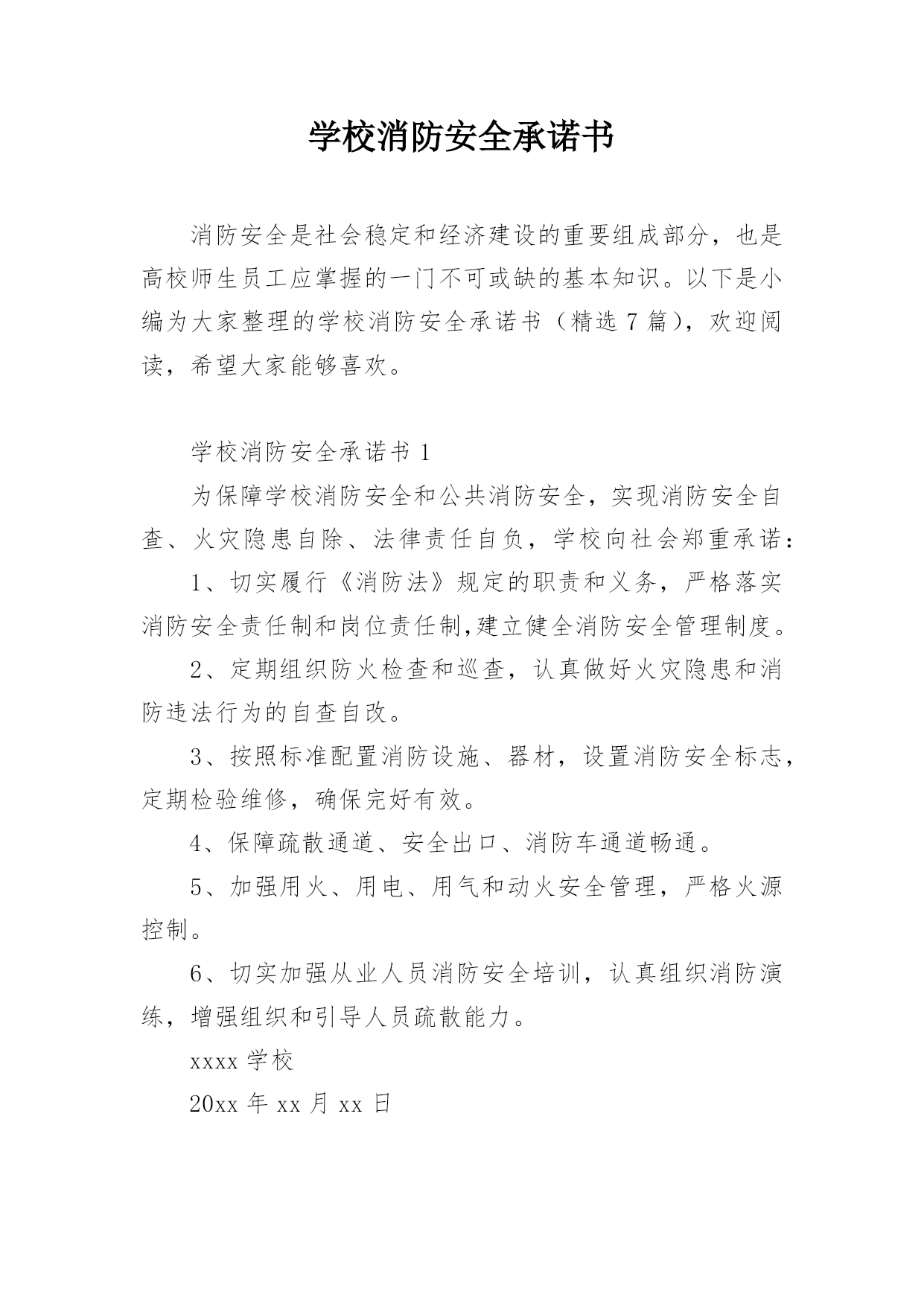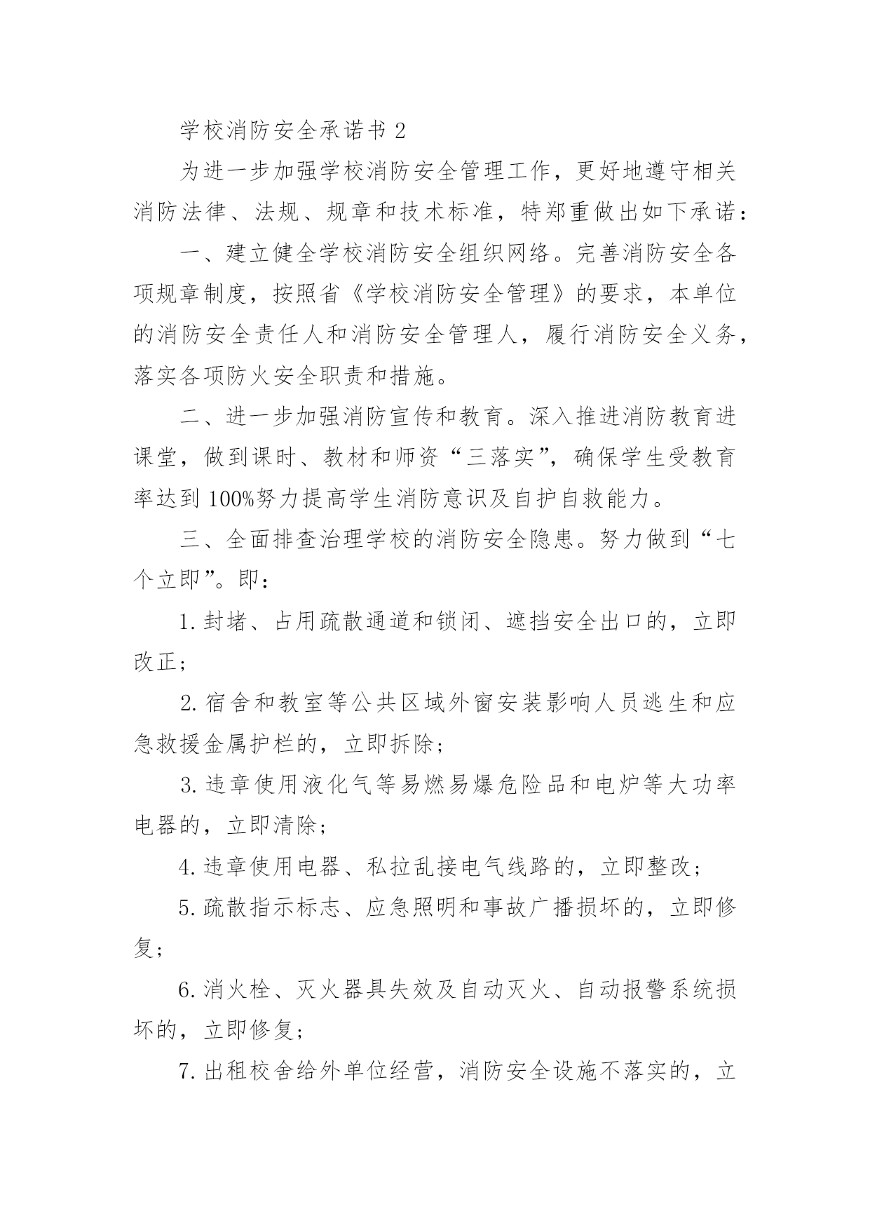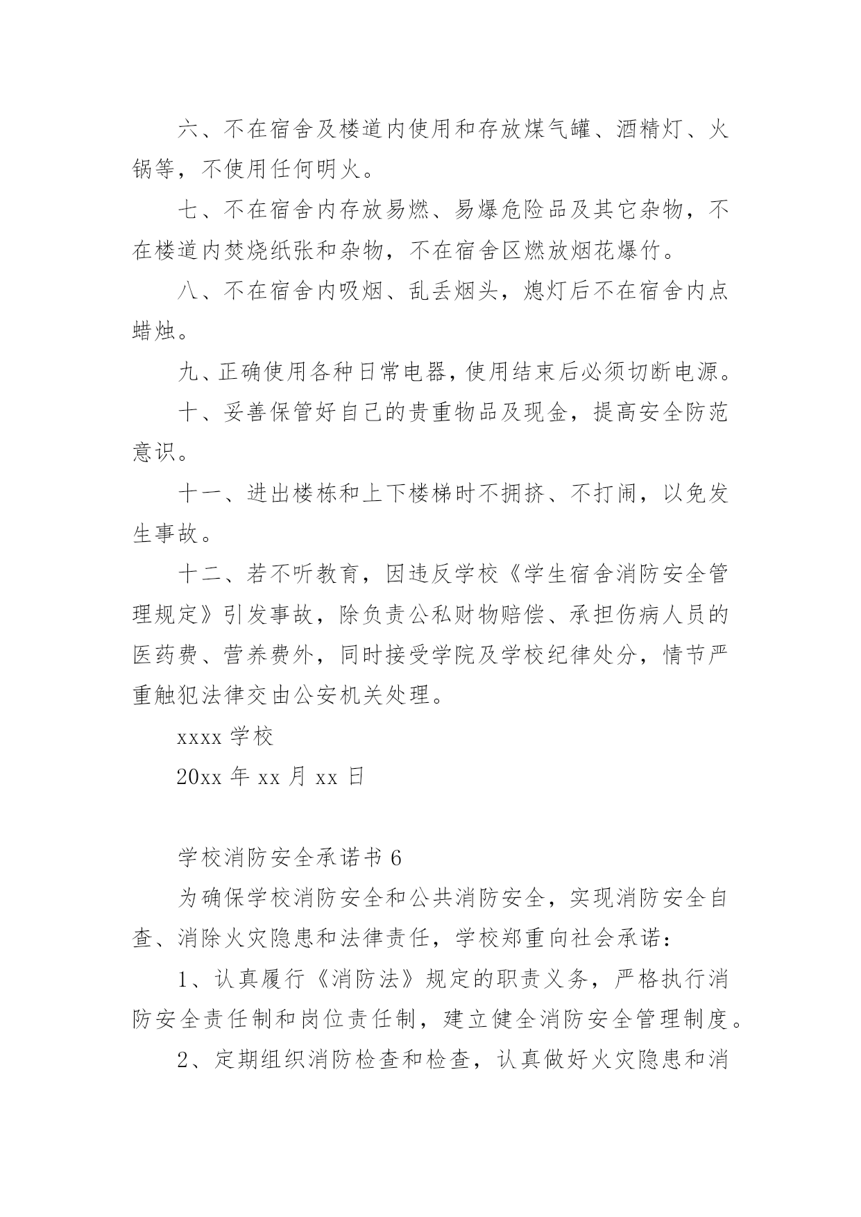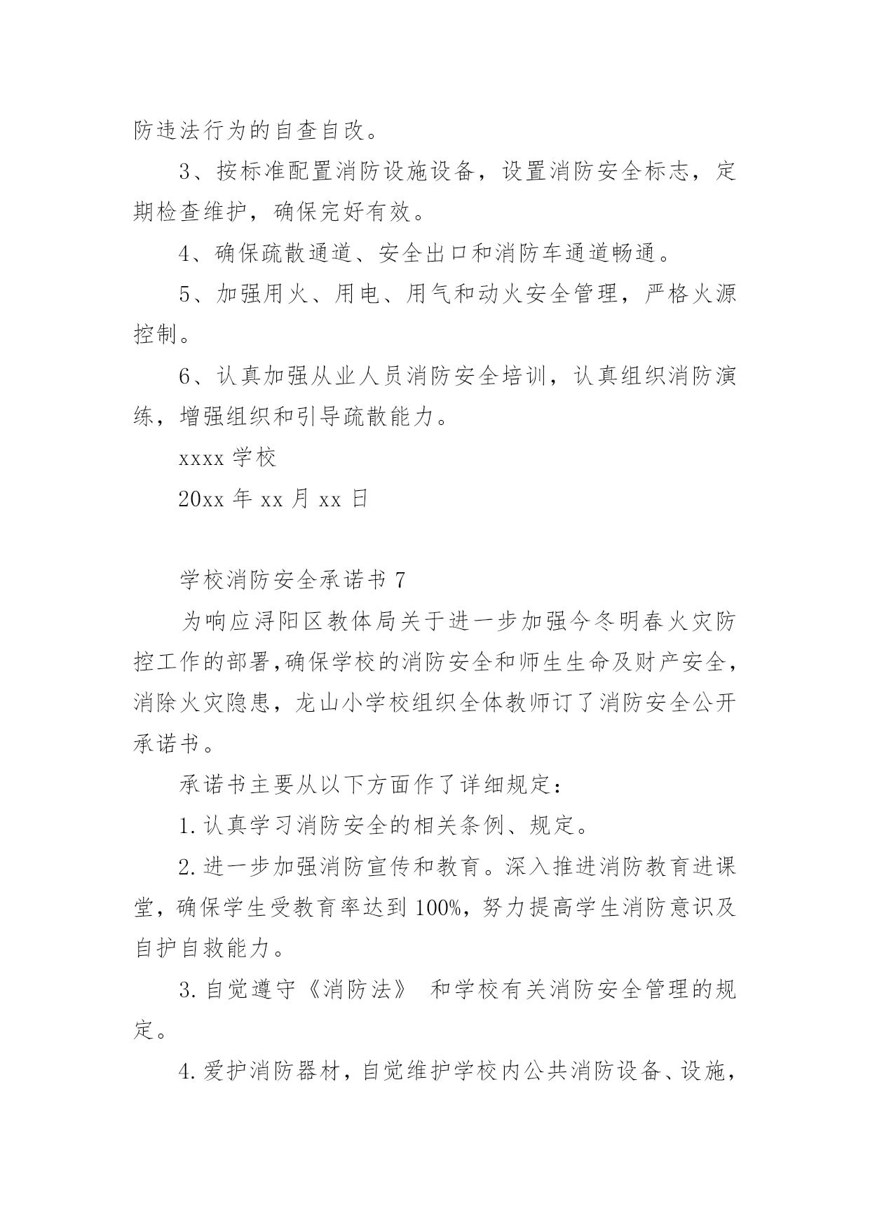 学校消防安全承诺书消防安全是社会稳定和经济建设的重要组成部分,也是高校师生员工应掌握的一门不可或缺的基本知识。以下是小编为大家整理的学校消防安全承诺书(精选7篇),欢迎阅读,希望大家能够喜欢。学校消防安全承诺书1为保障学校消防安全和公共消防安全,实现消防安全自查、火灾隐患自除、法律责任自负,学校向社会郑重承诺:1、切实履行《消防法》规定的职责和义务,严格落实消防安全责任制和岗位责任制,建立健全消防安全管理制度。2、定期组织防火检查和巡查,认真做好火灾隐患和消防违法行为的自查自改。3、按照标准配置消防设施、器材,设置消防安全标志,定期检验维修,确保完好有效。4、保障疏散通道、安全出口、消防车通道畅通。5、加强用火、用电、用气和动火安全管理,严格火源控制。6、切实加强从业人员消防安全培训,认真组织消防演练,增强组织和引导人员疏散能力。xxxx学校20xx年xx月xx日学校消防安全承诺书2为进一步加强学校消防安全管理工作,更好地遵守相关消防法律、法规、规章和技术标准,特郑重做出如下承诺:一、建立健全学校消防安全组织网络。完善消防安全各项规章制度,按照省《学校消防安全管理》的要求,本单位的消防安全责任人和消防安全管理人,履行消防安全义务,落实各项防火安全职责和措施。二、进一步加强消防宣传和教育。深入推进消防教育进课堂,做到课时、教材和师资“三落实”,确保学生受教育率达到100%努力提高学生消防意识及自护自救能力。三、全面排查治理学校的消防安全隐患。努力做到“七个立即”。即:1.封堵、占用疏散通道和锁闭、遮挡安全出口的,立即改正;2.宿舍和教室等公共区域外窗安装影响人员逃生和应急救援金属护栏的,立即拆除;3.违章使用液化气等易燃易爆危险品和电炉等大功率电器的,立即清除;4.违章使用电器、私拉乱接电气线路的,立即整改;5.疏散指示标志、应急照明和事故广播损坏的,立即修复;6.消火栓、灭火器具失效及自动灭火、自动报警系统损坏的,立即修复;7.出租校舍给外单位经营,消防安全设施不落实的,立即停止出租。以上系我校做出的保证,我校将信守承诺,若有违反上述保证内容,我校将承担《中华人民共和国消防法》等消防法规规定的相关法律责任。xxxx学校20xx年xx月xx日学校消防安全承诺书3为了进一步做好学校消防安全工作,确保公共财产以及师生生命、财产的安全,依据教育局和总校文件有关精神,现与我校各位教职员工签订以下消防安全责任。一、遵守消防法律、法规、规章,贯彻“预防为主,防消结合”的消防工作方针,履行消防安全责任,保障消防安全。二、各位教职工均为为消防安全责任人。特别是班主任应积极配合学校做好学生消防安全知识教育工作,让学生都能掌握消防安全知识。三、各位教职工都应遵守学校制定的火灾处理和救援预案,执行消防安全工作制度,提高防火灾的警惕性和在发生火灾是的逃生自救和救护学生的能力。四、各位教职工要认真落实消防安全岗位责任制,对自己职责范围内存在的消防隐患及时予以排查、解决。五、每日巡查教师要对重点消防部门(如锅炉房、远程教室、微机室、多媒体教室、光盘播放室、档案室、图书室、阅览室、库房等),要做到每日防火巡查,做好记录。六、各位教职工要协助学校保证消防疏散通道畅通,要对消防设施要勤于检查,齐备、完好、有效的设备要保管好,发现安全隐患,及时上报妥善解决。八、各教职工必须掌握使用要领,操作规程确保发生火灾时人人都能参与消防安全救援工作真正做到召之即来,战之能胜。九、此责任状自签订之日起生效,消防安全直接责任人要认真抓好各项安全工作的落实,确保不发生火灾事故。十、本责任书一式两份,签字后学校留存一份,教师留存一份。xxxx学校20xx年xx月xx日学校消防安全承诺书4为了确保我校的.消防安全工作顺利进行,打造和谐稳定的平安校园,落实我校各年级、各班“谁主管谁负责”的原则,进一步深化教育改革,保障人身安全、财产安全,特签订安全责任书。1、加强学习《消防法》,提高消防意识。2、时时处处对学生进行消防安全知识教育,保证学生不玩火,不动电,不到危险的地方、随手关闭用电设备。3、各部门、各办公室及各班级负责人每周对所管辖范围进行一次安全消防检查,发现线路、电器有漏电等消防安全隐患,要及时汇报学校领导,力求及时处理。4、严禁随便使用配电箱送电接电。5、严禁在办公室、教室乱拉电线,不用电炉和热水器。6、严禁在电脑室、图书室等危险地方抽烟、用明火。7、严禁用电设备周围堆放易燃易爆物品。8、严禁学生自行开关电脑。xxxx学校20xx年xx月xx日学校消防安全承诺书5学生宿舍是学生日常生活、学习的重要场所,也是学校的重点防火部位,为防止火灾事故的发生,切实保护同学们的生命和财产安全,我们要以高度负责的态度对待宿舍安全问题,为此,我郑重承诺:一、自觉遵守学生宿舍的各项管理规定,服从