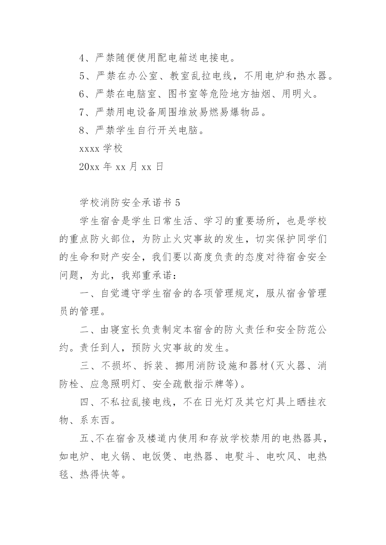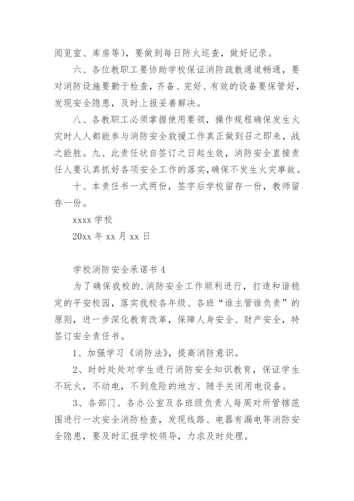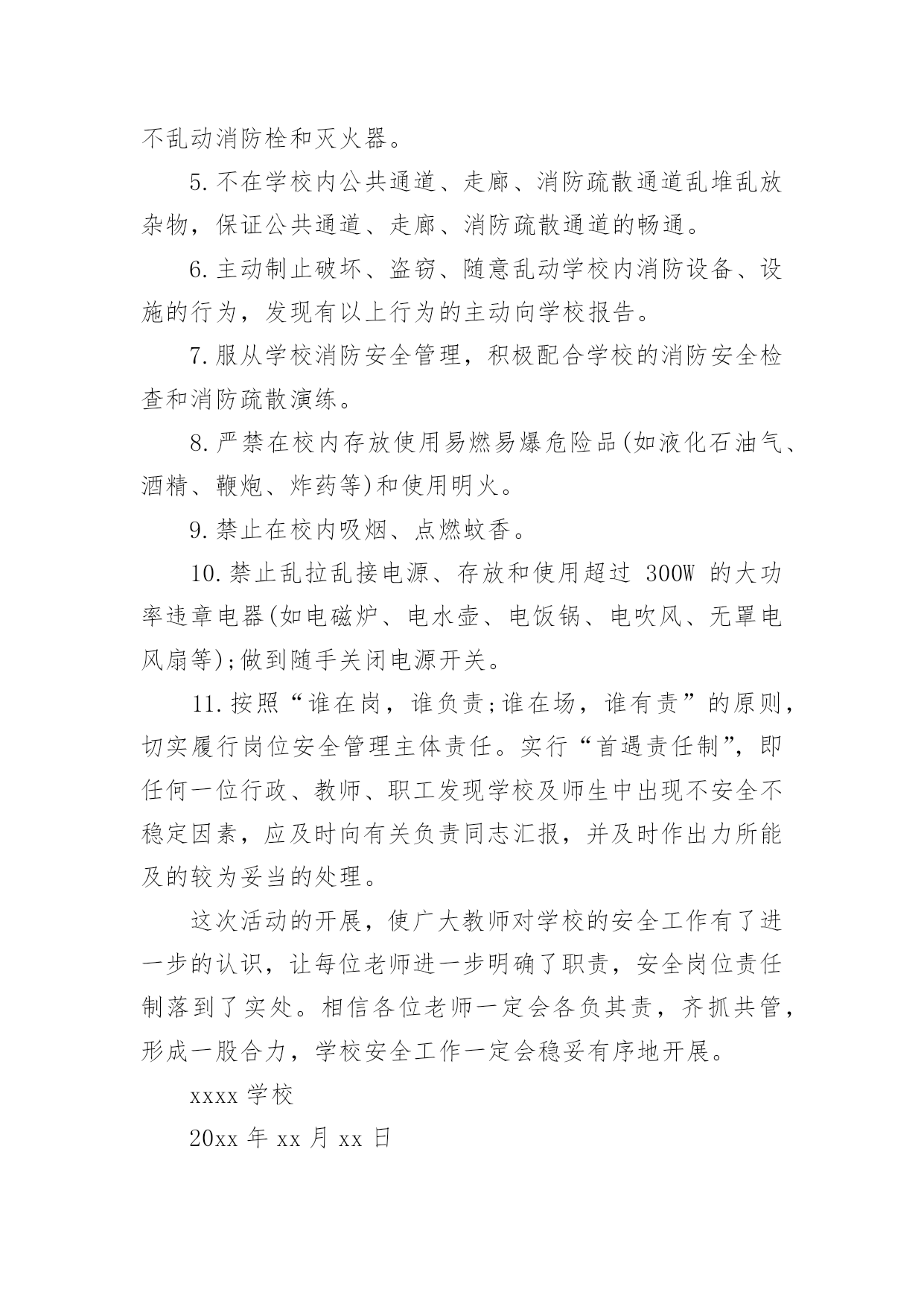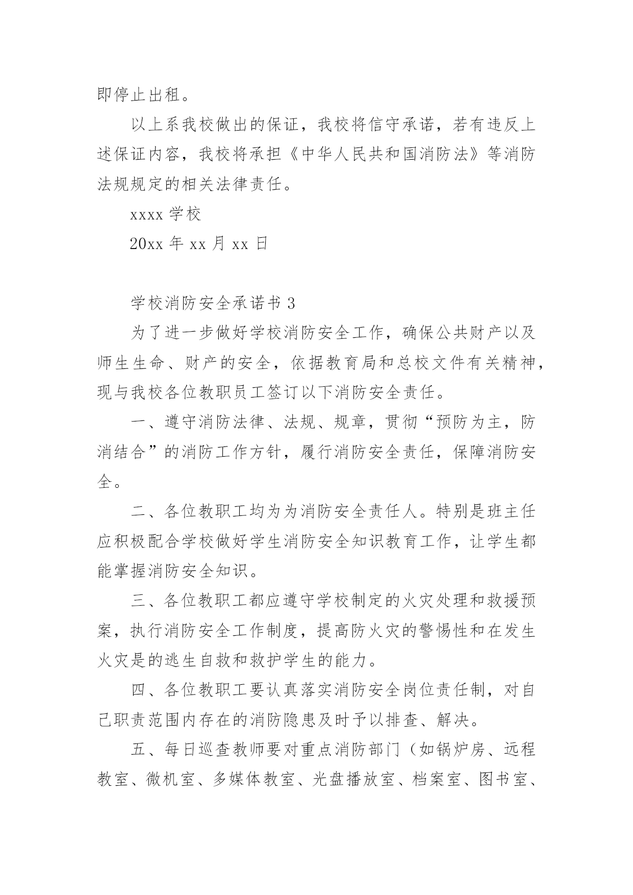 学校消防安全承诺书消防安全是社会稳定和经济建设的重要组成部分,也是高校师生员工应掌握的一门不可或缺的基本知识。以下是小编为大家整理的学校消防安全承诺书(精选7篇),欢迎阅读,希望大家能够喜欢。学校消防安全承诺书1为保障学校消防安全和公共消防安全,实现消防安全自查、火灾隐患自除、法律责任自负,学校向社会郑重承诺:1、切实履行《消防法》规定的职责和义务,严格落实消防安全责任制和岗位责任制,建立健全消防安全管理制度。2、定期组织防火检查和巡查,认真做好火灾隐患和消防违法行为的自查自改。3、按照标准配置消防设施、器材,设置消防安全标志,定期检验维修,确保完好有效。4、保障疏散通道、安全出口、消防车通道畅通。5、加强用火、用电、用气和动火安全管理,严格火源控制。6、切实加强从业人员消防安全培训,认真组织消防演练,增强组织和引导人员疏散能力。xxxx学校20xx年xx月xx日学校消防安全承诺书2为进一步加强学校消防安全管理工作,更好地遵守相关消防法律、法规、规章和技术标准,特郑重做出如下承诺:一、建立健全学校消防安全组织网络。完善消防安全各项规章制度,按照省《学校消防安全管理》的要求,本单位的消防安全责任人和消防安全管理人,履行消防安全义务,落实各项防火安全职责和措施。二、进一步加强消防宣传和教育。深入推进消防教育进课堂,做到课时、教材和师资“三落实”,确保学生受教育率达到100%努力提高学生消防意识及自护自救能力。三、全面排查治理学校的消防安全隐患。努力做到“七个立即”。即:1.封堵、占用疏散通道和锁闭、遮挡安全出口的,立即改正;2.宿舍和教室等公共区域外窗安装影响人员逃生和应急救援金属护栏的,立即拆除;3.违章使用液化气等易燃易爆危险品和电炉等大功率电器的,立即清除;4.违章使用电器、私拉乱接电气线路的,立即整改;5.疏散指示标志、应急照明和事故广播损坏的,立即修复;6.消火栓、灭火器具失效及自动灭火、自动报警系统损坏的,立即修复;7.出租校舍给外单位经营,消防安全设施不落实的,立即停止出租。以上系我校做出的保证,我校将信守承诺,若有违反上述保证内容,我校将承担《中华人民共和国消防法》等消防法规规定的相关法律责任。xxxx学校20xx年xx月xx日学校消防安全承诺书3为了进一步做好学校消防安全工作,确保公共财产以及师生生命、财产的安全,依据教育局和总校文件有关精神,现与我校各位教职员工签订以下消防安全责任。一、遵守消防法律、法规、规章,贯彻“预防为主,防消结合”的消防工作方针,履行消防安全责任,保障消防安全。二、各位教职工均为为消防安全责任人。特别是班主任应积极配合学校做好学生消防安全知识教育工作,让学生都能掌握消防安全知识。三、各位教职工都应遵守学校制定的火灾处理和救援预案,执行消防安全工作制度,提高防火灾的警惕性和在发生火灾是的逃生自救和救护学生的能力。四、各位教职工要认真落实消防安全岗位责任制,对自己职责范围内存在的消防隐患及时予以排查、解决。五、每日巡查教师要对重点消防部门(如锅炉房、远程教室、微机室、多媒体教室、光盘播放室、档案室、图书室、阅览室、库房等),要做到每日防火巡查,做好记录。六、各位教职工要协助学校保证消防疏散通道畅通,要对消防设施要勤于检查,齐备、完好、有效的设备要保管好,发现安全隐患,及时上报妥善解决。八、各教职工必须掌握使用要领,操作规程确保发生火灾时人人都能参与消防安全救援工作真正做到召之即来,战之能胜。九、此责任状自签订之日起生效,消防安全直接责任人要认真抓好各项安全工作的落实,确保不发生火灾事故。十、本责任书一式两份,签字后学校留存一份,教师留存一份。xxxx学校20xx年xx月xx日学校消防安全承诺书4为了确保我校的.消防安全工作顺利进行,打造和谐稳定的平安校园,落实我校各年级、各班“谁主管谁负责”的原则,进一步深化教育改革,保障人身安全、财产安全,特签订安全责任书。1、加强学习《消防法》,提高消防意识。2、时时处处对学生进行消防安全知识教育,保证学生不玩火,不动电,不到危险的地方、随手关闭用电设备。3、各部门、各办公室及各班级负责人每周对所管辖范围进行一次安全消防检查,发现线路、电器有漏电等消防安全隐患,要及时汇报学校领导,力求及时处理。4、严禁随便使用配电箱送电接电。5、严禁在办公室、教室乱拉电线,不用电炉和热水器。6、严禁在电脑室、图书室等危险地方抽烟、用明火。7、严禁用电设备周围堆放易燃易爆物品。8、严禁学生自行开关电脑。xxxx学校20xx年xx月xx日学校消防安全承诺书5学生宿舍是学生日常生活、学习的重要场所,也是学校的重点防火部位,为防止火灾事故的发生,切实保护同学们的生命和财产安全,我们要以高度负责的态度对待宿舍安全问题,为此,我郑重承诺:一、自觉遵守学生宿舍的各项管理规定,服从