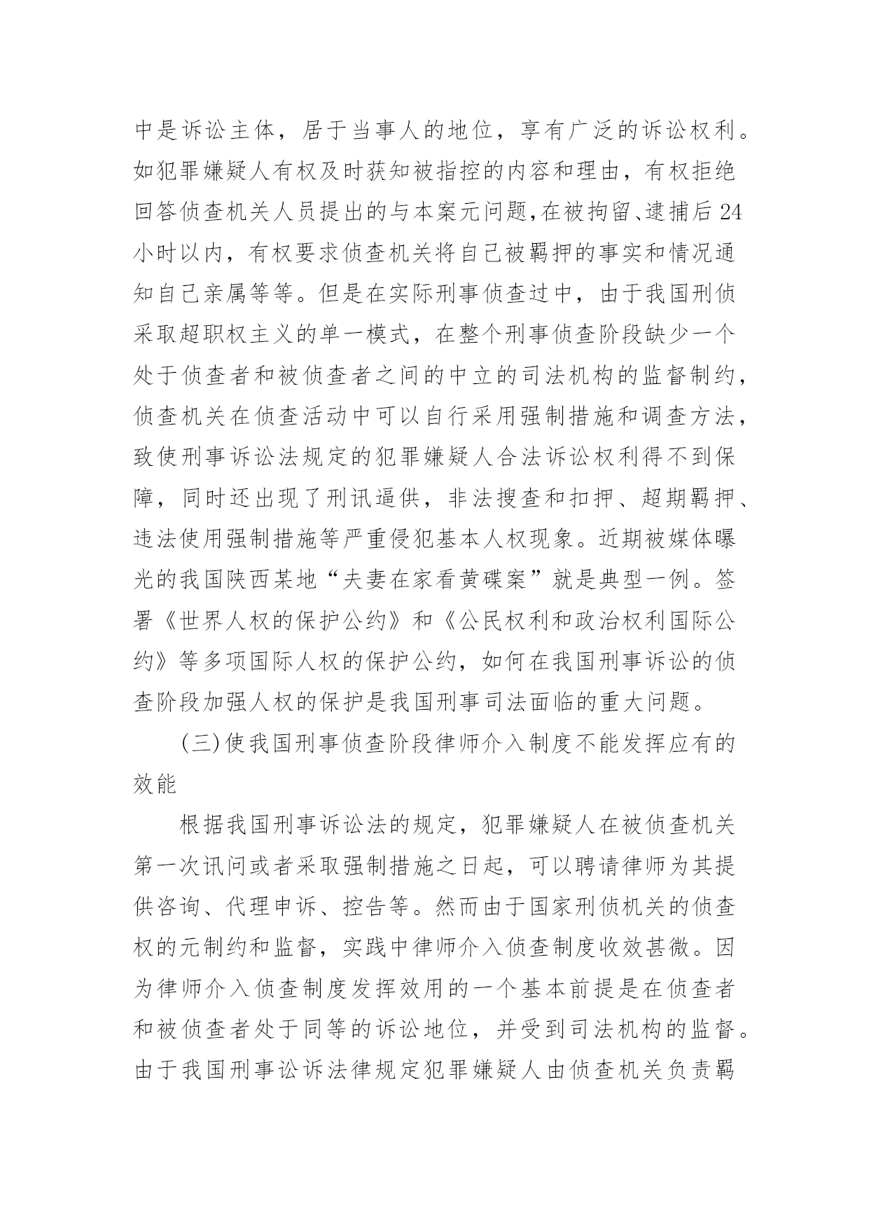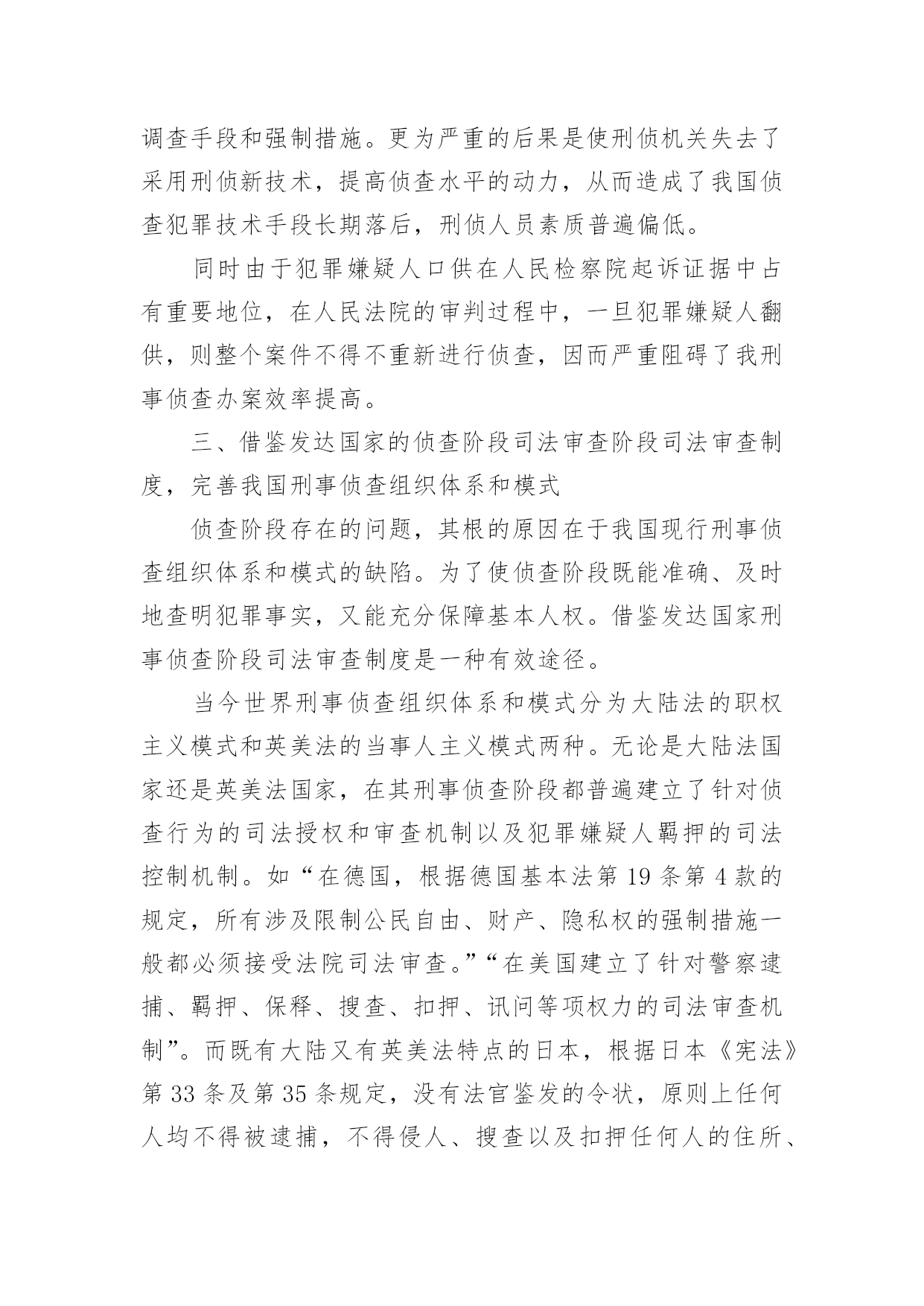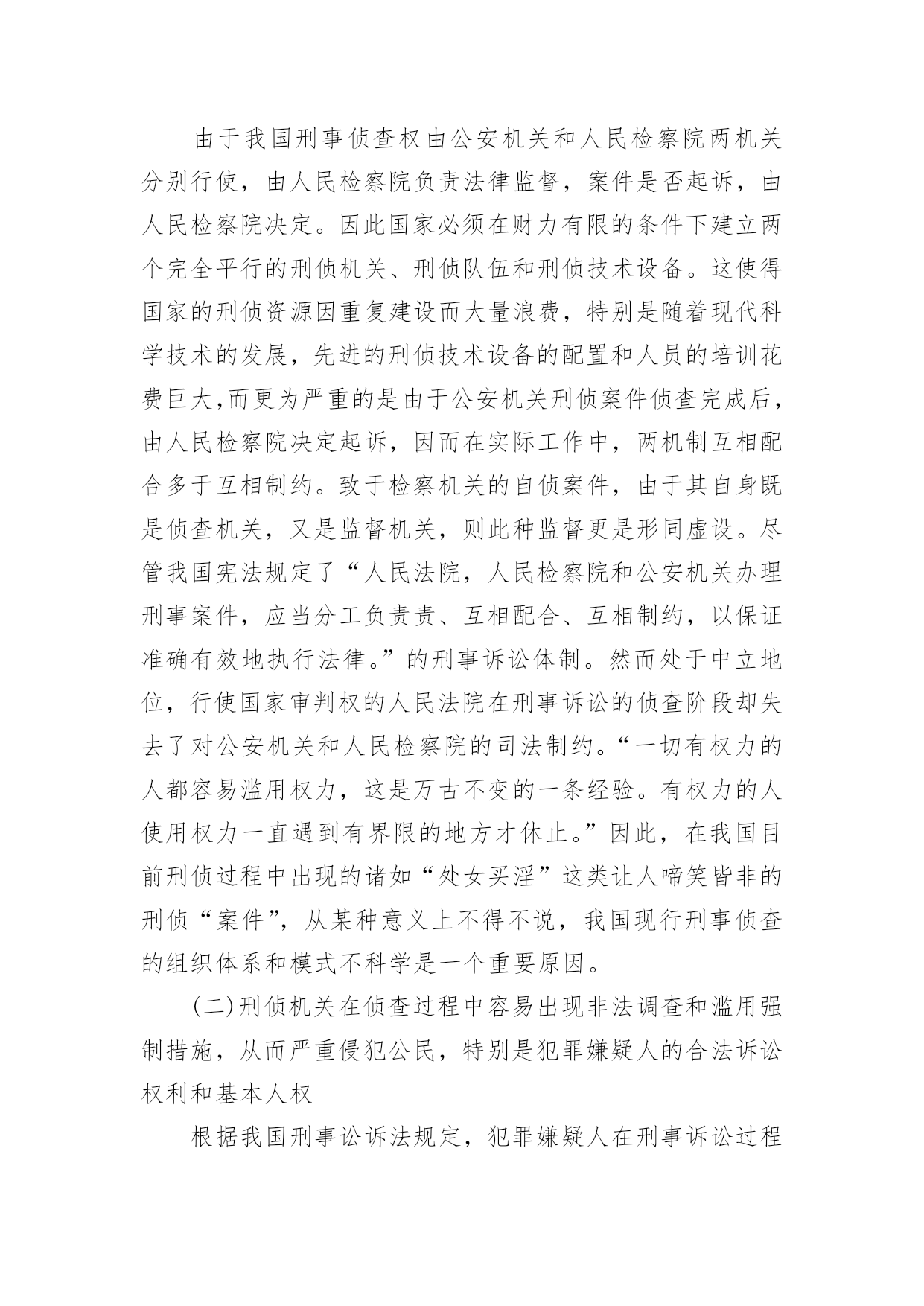 论析建立我国刑侦阶段司法审查制度【论文关键词】侦查模式侦查权刑事司法审查【论文摘要】在我国,由于刑事侦查组织体系和模式的缺陷,使刑事侦查阶段面临着侦查机关及其工作人员滥用权力,侵犯人权的危险。建立我国刑侦阶段司法审查制度是解决这一问题的有效途径之一。在我国,刑事诉讼的直接目的是公正实施刑事实体法与充分保障公民人权的有机统一。在刑事诉讼程序中,刑事侦查阶段既是侦查机关收集犯罪证据、查明犯罪事实、查获犯罪嫌疑人的重要阶段,同时也是侦查机关及其工作人员最容易滥用权力侵犯犯罪嫌疑人及其他诉讼参与人的合法权利阶段。因此,在立法中建立科学的刑事侦查制度就成为各国刑事诉讼理论和实践的重要课题。“因为侦查与国民的人权有密切关系,必须注意侦查时不得侵犯人权。因此,要研究的课题是采取怎样的侦查体制才能既能保护人权又能查明犯罪事实。”由于我国长期的封建思想影响和对刑事诉讼的目的、价值上的一些不科学的认识,在刑事侦查制度设计上存在着较多的缺陷。犯罪嫌疑人的合法诉讼权利及其它基本权常常受到侦查机关的不法侵害。一、我国现行的刑事侦查组织体系及其模式根据我国刑事诉讼法规定,刑事案件的侦查由公安机关进行,按时贿赂犯罪,国家工作人员的渎职犯罪,国家工作人员利用职权实施的非法拘禁、刑讯通供、报复陷害、非法搜查公民人身权利的犯罪以及侵犯公民民主权利的犯罪,由人民检察院立察察院审查决定。人民检察院对公安机关侦查活动实行法律监督。分析以上法律规定可以看出,在侦查组织体系上,我国的刑侦组织体系具有侦诉分离、侦诉一体的双重属性。一方面,实行侦诉分离,即负责任侦查的公安机关和负责起诉的人民检察院分别设立,另一方面有侦诉一体的特征,对国家工作人员按时贿赂罪和国家机关工作人员的渎职等犯罪,由人民检察院负责侦查并决定是否起诉。在刑事侦查模式上,我国则采取超职权主义的单一模式。公安机关在侦查过程中除采用逮捕这一剥夺公民人身自由的严厉措施需要提请人民检察院批准外,其他所有的侦查措施和手段的采用,均由侦查机关自行决定。尽管法律规定公安机关的侦查活动是否合法,由人民检察院监督。但由于检察机关不参加具体案件侦破工作,这种法律监督很难发挥应有的作用。而人民检察院的自侦案件所采用的所有侦查措施和手段都自行决定,并对自身的侦查活动进行法律监督。正是这种双重性的组织体系和缺乏监督和制约的超职权主义刑侦模式,使我国刑侦机关在行使侦查权的过程中存在诸多问题。二、我国刑事侦查组织体系和模式存在的问题(一)刑事侦查权的不科学划分不仅浪费有限的刑侦资源,而且使侦查权因缺乏必要监督制约机制而被滥用由于我国刑事侦查权由公安机关和人民检察院两机关分别行使,由人民检察院负责法律监督,案件是否起诉,由人民检察院决定。因此国家必须在财力有限的条件下建立两个完全平行的刑侦机关、刑侦队伍和刑侦技术设备。这使得国家的刑侦资源因重复建设而大量浪费,特别是随着现代科学技术的发展,先进的刑侦技术设备的配置和人员的培训花费巨大,而更为严重的是由于公安机关刑侦案件侦查完成后,由人民检察院决定起诉,因而在实际工作中,两机制互相配合多于互相制约。致于检察机关的自侦案件,由于其自身既是侦查机关,又是监督机关,则此种监督更是形同虚设。尽管我国宪法规定了“人民法院,人民检察院和公安机关办理刑事案件,应当分工负责责、互相配合、互相制约,以保证准确有效地执行法律。”的刑事诉讼体制。然而处于中立地位,行使国家审判权的人民法院在刑事诉讼的侦查阶段却失去了对公安机关和人民检察院的司法制约。“一切有权力的人都容易滥用权力,这是万古不变的一条经验。有权力的人使用权力一直遇到有界限的地方才休止。”因此,在我国目前刑侦过程中出现的诸如“处女买淫”这类让人啼笑皆非的刑侦“案件”,从某种意义上不得不说,我国现行刑事侦查的组织体系和模式不科学是一个重要原因。(二)刑侦机关在侦查过程中容易出现非法调查和滥用强制措施,从而严重侵犯公民,特别是犯罪嫌疑人的合法诉讼权利和基本人权根据我国刑事讼诉法规定,犯罪嫌疑人在刑事诉讼过程中是诉讼主体,居于当事人的地位,享有广泛的诉讼权利。如犯罪嫌疑人有权及时获知被指控的内容和理由,有权拒绝回答侦查机关人员提出的与本案元问题,在被拘留、逮捕后24小时以内,有权要求侦查机关将自己被羁押的事实和情况通知自己亲属等等。但是在实际刑事侦查过中,由于我国刑侦采取超职权主义的单一模式,在整个刑事侦查阶段缺少一个处于侦查者和被侦查者之间的中立的司法机构的监督制约,侦查机关在侦查活动中可以自行采用强制措施和调查方法,致使刑事诉讼法规定的犯罪嫌疑人合法诉讼权利得不到保障,同时还出现了刑讯逼供,非法搜查和扣押、超期羁押、违法使用强制措施等严重侵犯基本人权现象。近期被媒体曝光的我国陕西某地“夫妻在家看黄碟案”就是典型一例。签署《世界人权的保护公约》和《公民
