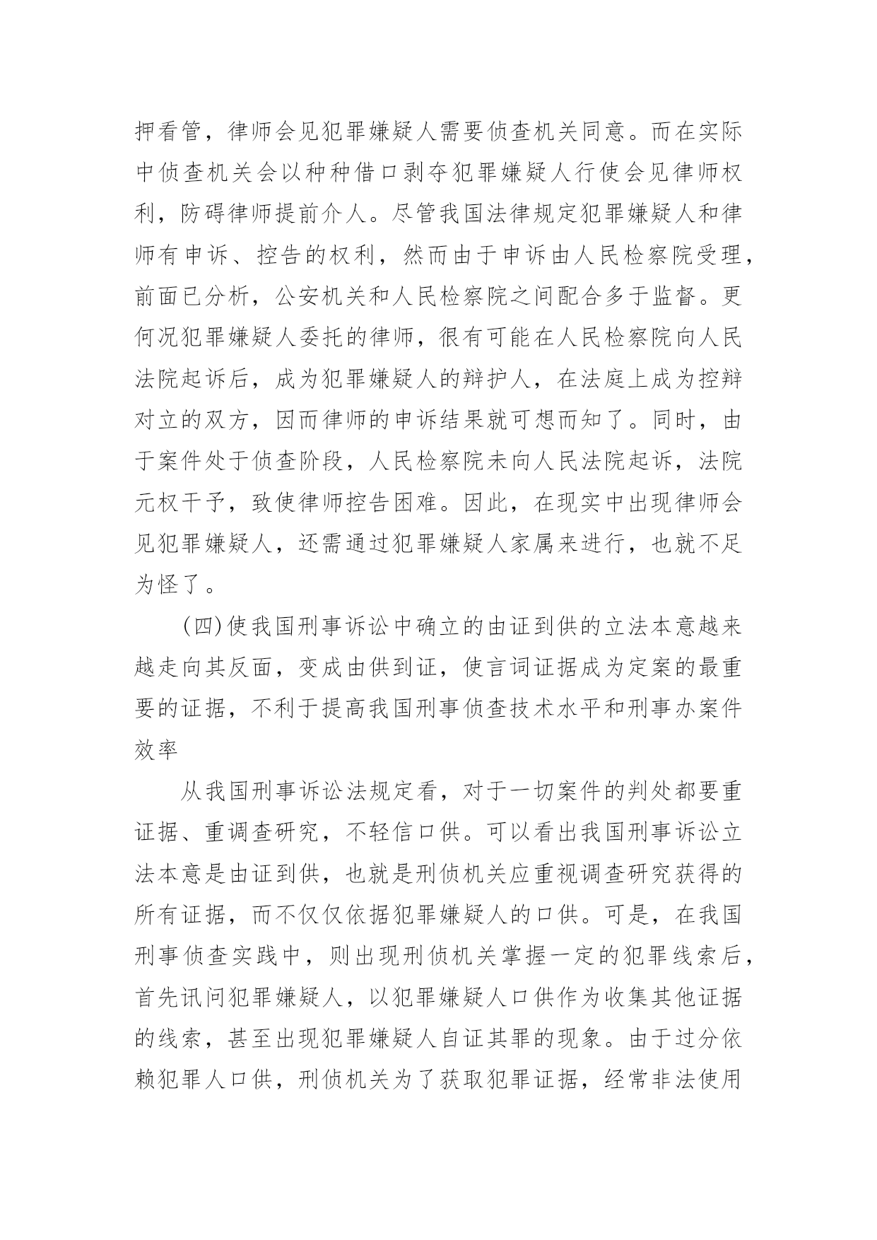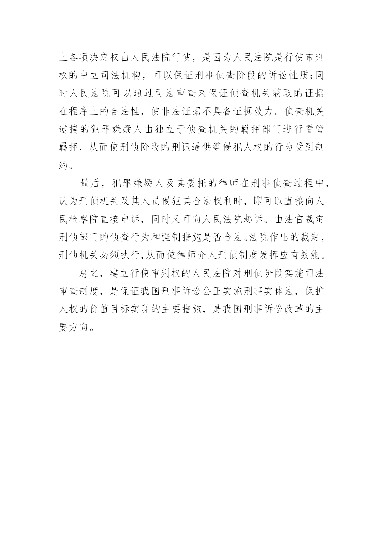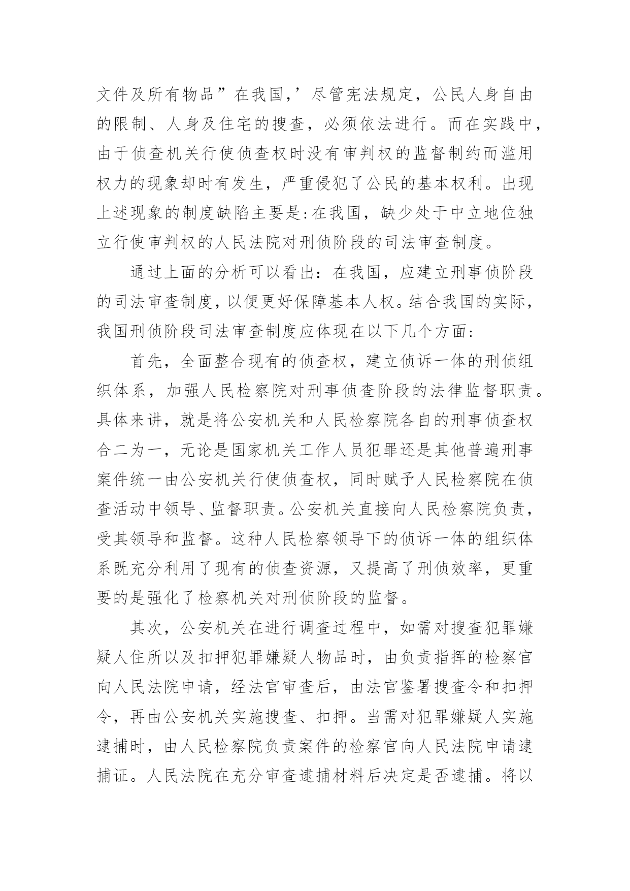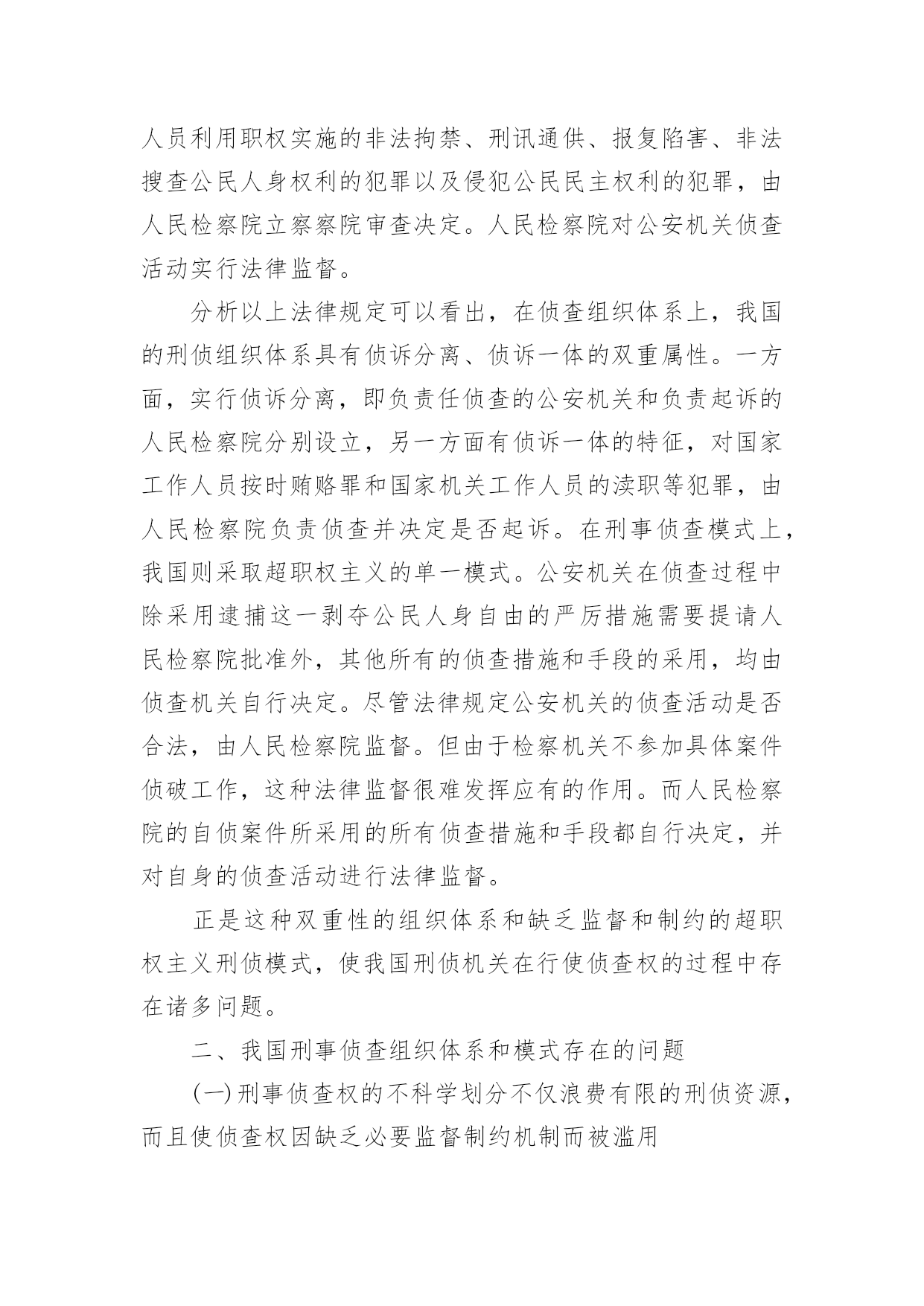 论析建立我国刑侦阶段司法审查制度【论文关键词】侦查模式侦查权刑事司法审查【论文摘要】在我国,由于刑事侦查组织体系和模式的缺陷,使刑事侦查阶段面临着侦查机关及其工作人员滥用权力,侵犯人权的危险。建立我国刑侦阶段司法审查制度是解决这一问题的有效途径之一。在我国,刑事诉讼的直接目的是公正实施刑事实体法与充分保障公民人权的有机统一。在刑事诉讼程序中,刑事侦查阶段既是侦查机关收集犯罪证据、查明犯罪事实、查获犯罪嫌疑人的重要阶段,同时也是侦查机关及其工作人员最容易滥用权力侵犯犯罪嫌疑人及其他诉讼参与人的合法权利阶段。因此,在立法中建立科学的刑事侦查制度就成为各国刑事诉讼理论和实践的重要课题。“因为侦查与国民的人权有密切关系,必须注意侦查时不得侵犯人权。因此,要研究的课题是采取怎样的侦查体制才能既能保护人权又能查明犯罪事实。”由于我国长期的封建思想影响和对刑事诉讼的目的、价值上的一些不科学的认识,在刑事侦查制度设计上存在着较多的缺陷。犯罪嫌疑人的合法诉讼权利及其它基本权常常受到侦查机关的不法侵害。一、我国现行的刑事侦查组织体系及其模式根据我国刑事诉讼法规定,刑事案件的侦查由公安机关进行,按时贿赂犯罪,国家工作人员的渎职犯罪,国家工作人员利用职权实施的非法拘禁、刑讯通供、报复陷害、非法搜查公民人身权利的犯罪以及侵犯公民民主权利的犯罪,由人民检察院立察察院审查决定。人民检察院对公安机关侦查活动实行法律监督。分析以上法律规定可以看出,在侦查组织体系上,我国的刑侦组织体系具有侦诉分离、侦诉一体的双重属性。一方面,实行侦诉分离,即负责任侦查的公安机关和负责起诉的人民检察院分别设立,另一方面有侦诉一体的特征,对国家工作人员按时贿赂罪和国家机关工作人员的渎职等犯罪,由人民检察院负责侦查并决定是否起诉。在刑事侦查模式上,我国则采取超职权主义的单一模式。公安机关在侦查过程中除采用逮捕这一剥夺公民人身自由的严厉措施需要提请人民检察院批准外,其他所有的侦查措施和手段的采用,均由侦查机关自行决定。尽管法律规定公安机关的侦查活动是否合法,由人民检察院监督。但由于检察机关不参加具体案件侦破工作,这种法律监督很难发挥应有的作用。而人民检察院的自侦案件所采用的所有侦查措施和手段都自行决定,并对自身的侦查活动进行法律监督。正是这种双重性的组织体系和缺乏监督和制约的超职权主义刑侦模式,使我国刑侦机关在行使侦查权的过程中存在诸多问题。二、我国刑事侦查组织体系和模式存在的问题(一)刑事侦查权的不科学划分不仅浪费有限的刑侦资源,而且使侦查权因缺乏必要监督制约机制而被滥用由于我国刑事侦查权由公安机关和人民检察院两机关分别行使,由人民检察院负责法律监督,案件是否起诉,由人民检察院决定。因此国家必须在财力有限的条件下建立两个完全平行的刑侦机关、刑侦队伍和刑侦技术设备。这使得国家的刑侦资源因重复建设而大量浪费,特别是随着现代科学技术的发展,先进的刑侦技术设备的配置和人员的培训花费巨大,而更为严重的是由于公安机关刑侦案件侦查完成后,由人民检察院决定起诉,因而在实际工作中,两机制互相配合多于互相制约。致于检察机关的自侦案件,由于其自身既是侦查机关,又是监督机关,则此种监督更是形同虚设。尽管我国宪法规定了“人民法院,人民检察院和公安机关办理刑事案件,应当分工负责责、互相配合、互相制约,以保证准确有效地执行法律。”的刑事诉讼体制。然而处于中立地位,行使国家审判权的人民法院在刑事诉讼的侦查阶段却失去了对公安机关和人民检察院的司法制约。“一切有权力的人都容易滥用权力,这是万古不变的一条经验。有权力的人使用权力一直遇到有界限的地方才休止。”因此,在我国目前刑侦过程中出现的诸如“处女买淫”这类让人啼笑皆非的刑侦“案件”,从某种意义上不得不说,我国现行刑事侦查的组织体系和模式不科学是一个重要原因。(二)刑侦机关在侦查过程中容易出现非法调查和滥用强制措施,从而严重侵犯公民,特别是犯罪嫌疑人的合法诉讼权利和基本人权根据我国刑事讼诉法规定,犯罪嫌疑人在刑事诉讼过程中是诉讼主体,居于当事人的地位,享有广泛的诉讼权利。如犯罪嫌疑人有权及时获知被指控的内容和理由,有权拒绝回答侦查机关人员提出的与本案元问题,在被拘留、逮捕后24小时以内,有权要求侦查机关将自己被羁押的事实和情况通知自己亲属等等。但是在实际刑事侦查过中,由于我国刑侦采取超职权主义的单一模式,在整个刑事侦查阶段缺少一个处于侦查者和被侦查者之间的中立的司法机构的监督制约,侦查机关在侦查活动中可以自行采用强制措施和调查方法,致使刑事诉讼法规定的犯罪嫌疑人合法诉讼权利得不到保障,同时还出现了刑讯逼供,非法搜查和扣押、超期羁押、违法使用强制措施等严重侵犯基本人权现象。近期被媒体曝光的我国陕西某地“夫妻在家看黄碟案”就是典型一例。签署《世界人权的保护公约》和《公民