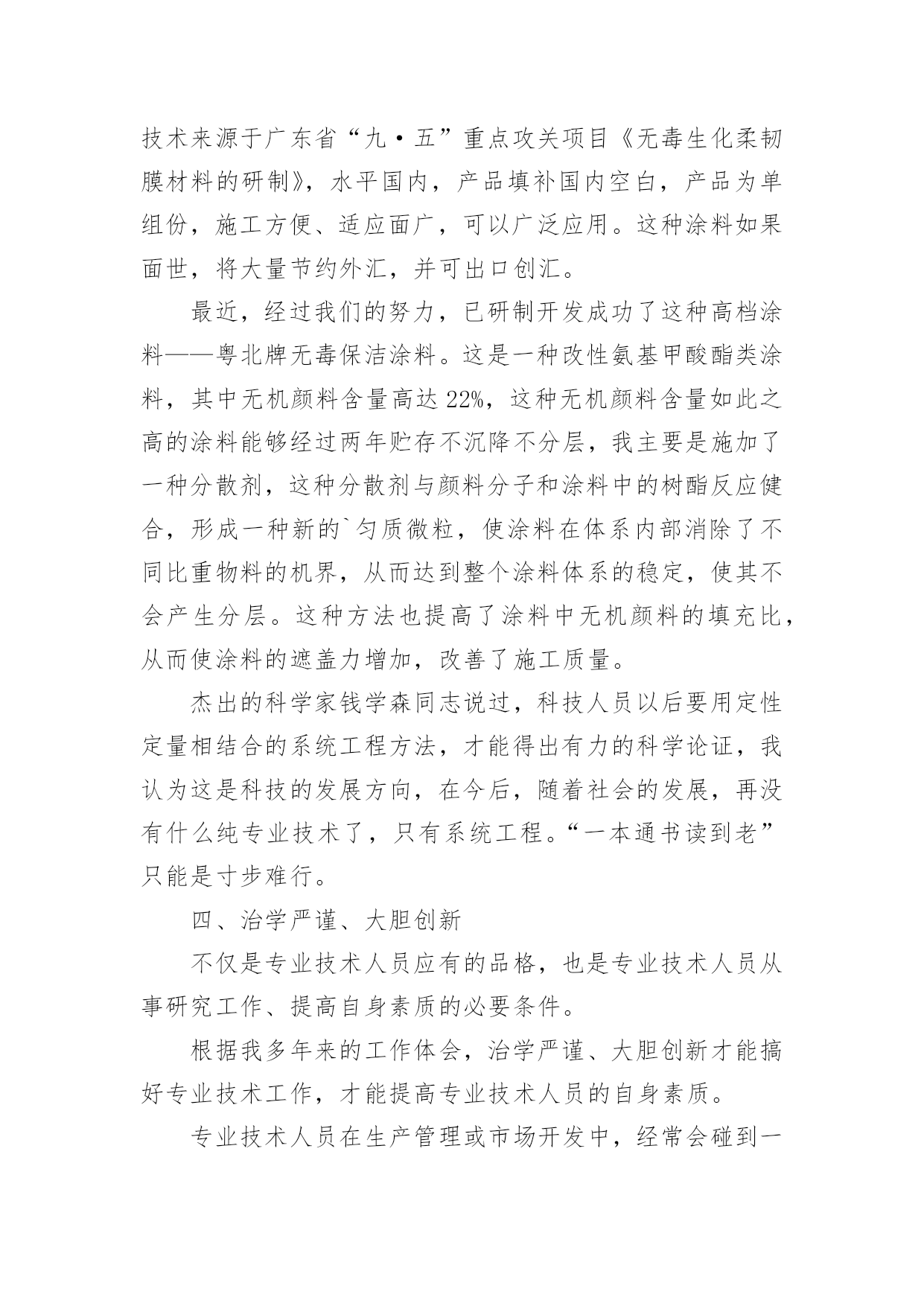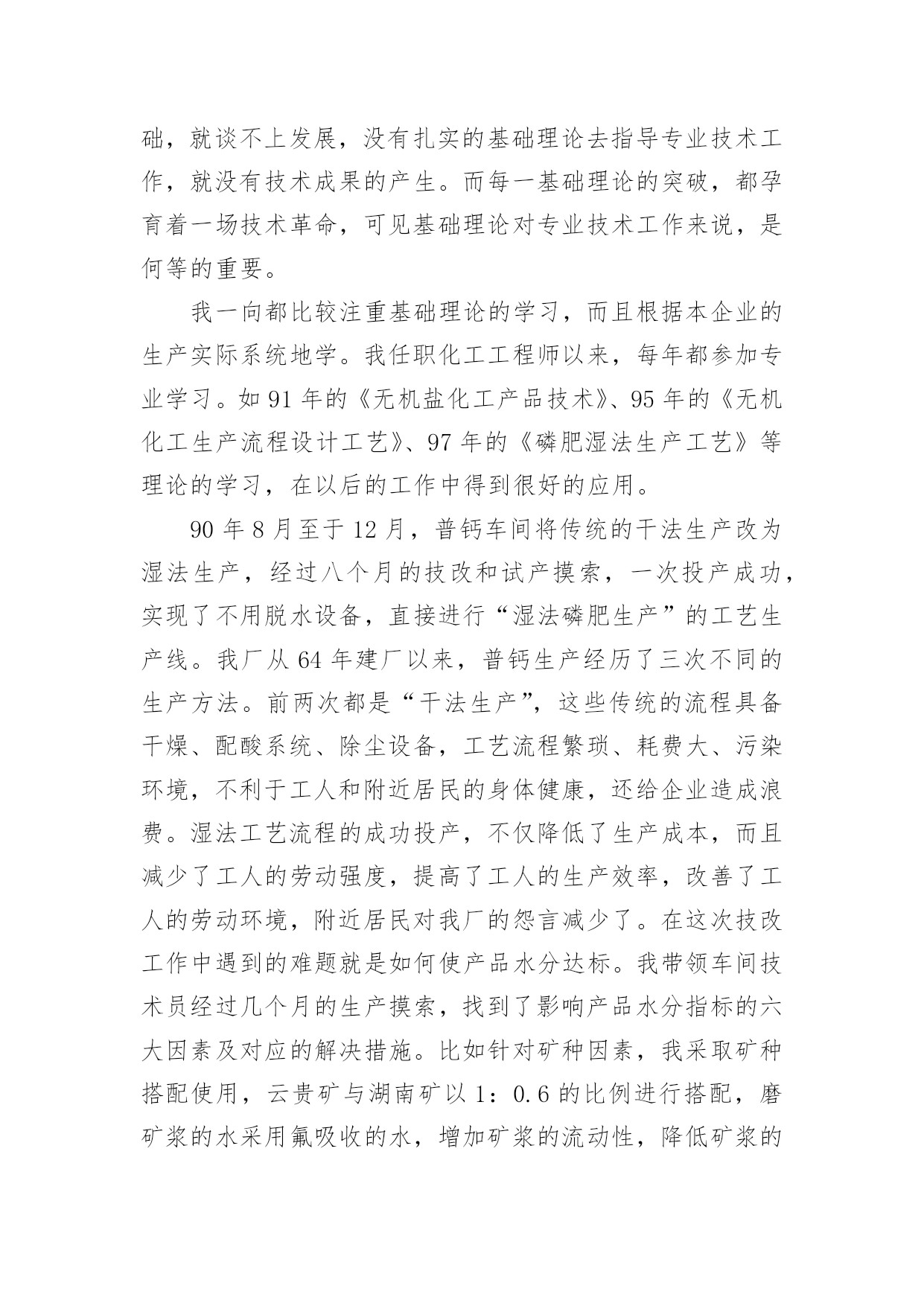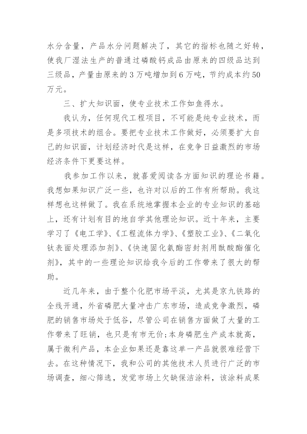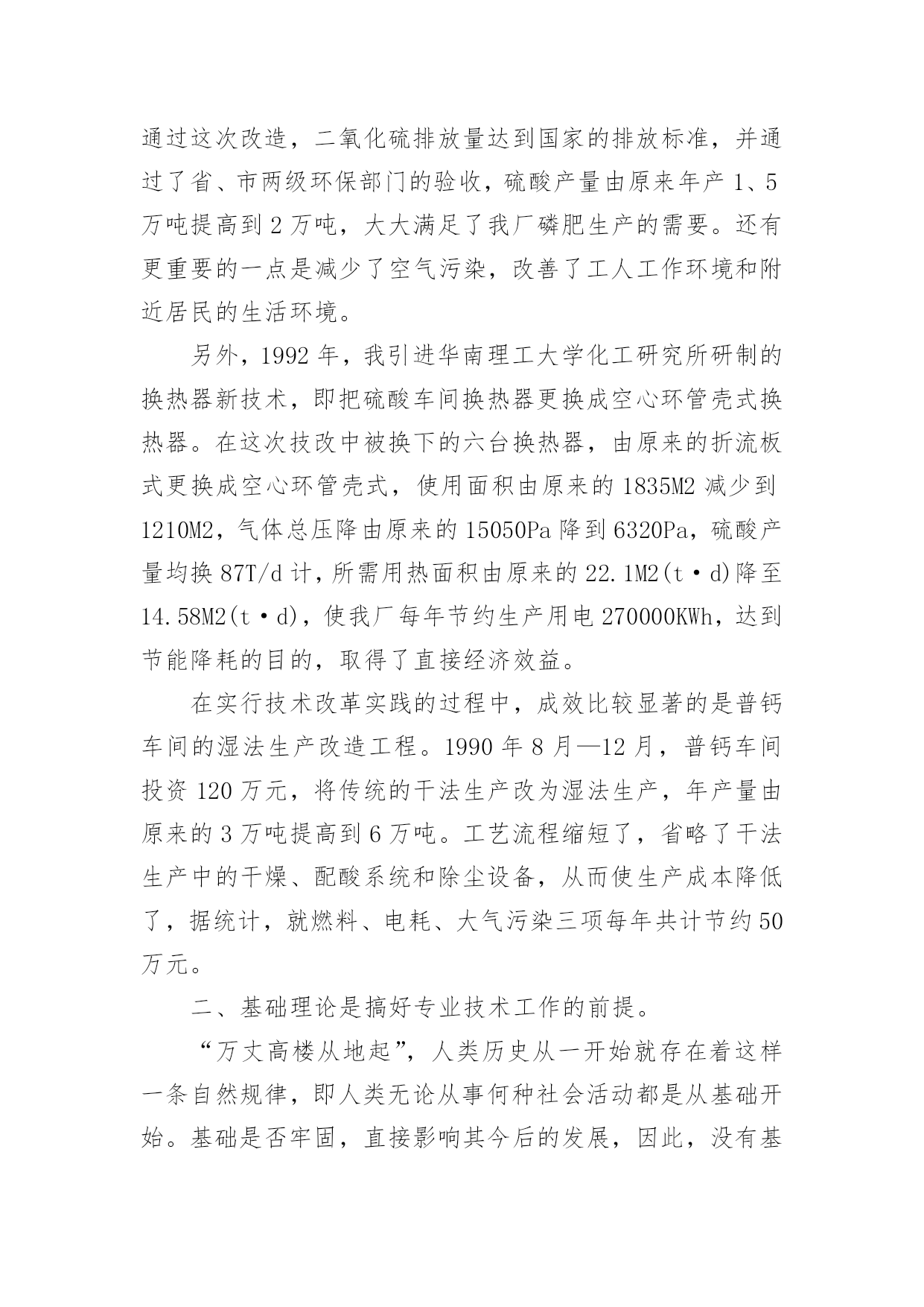 中级职称专业技术工作总结中级职称专业技术工作总结(实用)总结就是对一个时期的学习、工作或其完成情况进行一次全面系统的回顾和分析的书面材料,它能够使头脑更加清醒,目标更加明确,让我们好好写一份总结吧。但是总结有什么要求呢?下面是小编为大家整理的中级职称专业技术工作总结,希望对大家有所帮助。中级职称专业技术工作总结1本人自xxxx年任化工工程师以来,在各专业技术人员的支持下,在本人的勤奋努力下,工作取得了一些成绩,以下谈谈我的几点工作体会。如有不够,敬请原谅。一、专业技术人员应充分理解科技是第一生产力的意义应将专业技术和市场经济紧密结合起来。我认为,倡导的“科技是第一生产力”的深远意义,在于将专业技术转化为生产力,并应用到实践工作中,在转化过程中实现专业技术的升华,造就自己,体现个人对社会的价值。将专业技术转化为生产力,我做了一定的工作,也取得了一定的成绩。比如91年,将我厂硫酸车间“一转一吸”生产工艺改为“二转二吸”生产工艺,原“一转一吸”生产流程所产生的二氧化硫转化率低,造成排放于空气的二氧化硫超标,产量低,影响了本公司的经济效益又污染了环境。通过这次改造,二氧化硫排放量达到国家的排放标准,并通过了省、市两级环保部门的验收,硫酸产量由原来年产1、5万吨提高到2万吨,大大满足了我厂磷肥生产的需要。还有更重要的一点是减少了空气污染,改善了工人工作环境和附近居民的生活环境。另外,1992年,我引进华南理工大学化工研究所研制的换热器新技术,即把硫酸车间换热器更换成空心环管壳式换热器。在这次技改中被换下的六台换热器,由原来的折流板式更换成空心环管壳式,使用面积由原来的1835M2减少到1210M2,气体总压降由原来的15050Pa降到6320Pa,硫酸产量均换87T/d计,所需用热面积由原来的22.1M2(t·d)降至14.58M2(t·d),使我厂每年节约生产用电270000KWh,达到节能降耗的目的,取得了直接经济效益。在实行技术改革实践的过程中,成效比较显著的是普钙车间的湿法生产改造工程。1990年8月—12月,普钙车间投资120万元,将传统的干法生产改为湿法生产,年产量由原来的3万吨提高到6万吨。工艺流程缩短了,省略了干法生产中的干燥、配酸系统和除尘设备,从而使生产成本降低了,据统计,就燃料、电耗、大气污染三项每年共计节约50万元。二、基础理论是搞好专业技术工作的前提。“万丈高楼从地起”,人类历史从一开始就存在着这样一条自然规律,即人类无论从事何种社会活动都是从基础开始。基础是否牢固,直接影响其今后的发展,因此,没有基础,就谈不上发展,没有扎实的基础理论去指导专业技术工作,就没有技术成果的产生。而每一基础理论的突破,都孕育着一场技术革命,可见基础理论对专业技术工作来说,是何等的重要。我一向都比较注重基础理论的学习,而且根据本企业的生产实际系统地学。我任职化工工程师以来,每年都参加专业学习。如91年的《无机盐化工产品技术》、95年的《无机化工生产流程设计工艺》、97年的《磷肥湿法生产工艺》等理论的学习,在以后的工作中得到很好的应用。90年8月至于12月,普钙车间将传统的干法生产改为湿法生产,经过八个月的技改和试产摸索,一次投产成功,实现了不用脱水设备,直接进行“湿法磷肥生产”的工艺生产线。我厂从64年建厂以来,普钙生产经历了三次不同的生产方法。前两次都是“干法生产”,这些传统的流程具备干燥、配酸系统、除尘设备,工艺流程繁琐、耗费大、污染环境,不利于工人和附近居民的身体健康,还给企业造成浪费。湿法工艺流程的成功投产,不仅降低了生产成本,而且减少了工人的劳动强度,提高了工人的生产效率,改善了工人的劳动环境,附近居民对我厂的怨言减少了。在这次技改工作中遇到的难题就是如何使产品水分达标。我带领车间技术员经过几个月的生产摸索,找到了影响产品水分指标的六大因素及对应的解决措施。比如针对矿种因素,我采取矿种搭配使用,云贵矿与湖南矿以1:0.6的比例进行搭配,磨矿浆的水采用氟吸收的水,增加矿浆的流动性,降低矿浆的水分含量,产品水分问题解决了,其它的指标也随之好转,使我厂湿法生产的普通过磷酸钙成品由原来的四级品达到三级品,产量由原来的3万吨增加到6万吨,节约成本约50万元。三、扩大知识面,使专业技术工作如鱼得水。我认为,任何现代工程项目,不可能是纯专业技术,而是多项技术的组合。要把专业技术工作做好,必须要扩大自己的知识面,计划经济时代是这样,在竞争日益激烈的市场经济条件下更要这样。我参加工作以来,就喜爱阅读各方面知识的理论书籍。我想如果知识广泛一些,也许对以后的工作有所帮助。我这样想也这样做了。我在系统地掌握本企业的专业知识的基础上,还有计划有目的地自学其他理论知识。近十年来,主要学习了《电工学》、《工程流体力学》、《塑胶工业》、《二氧化钛表面