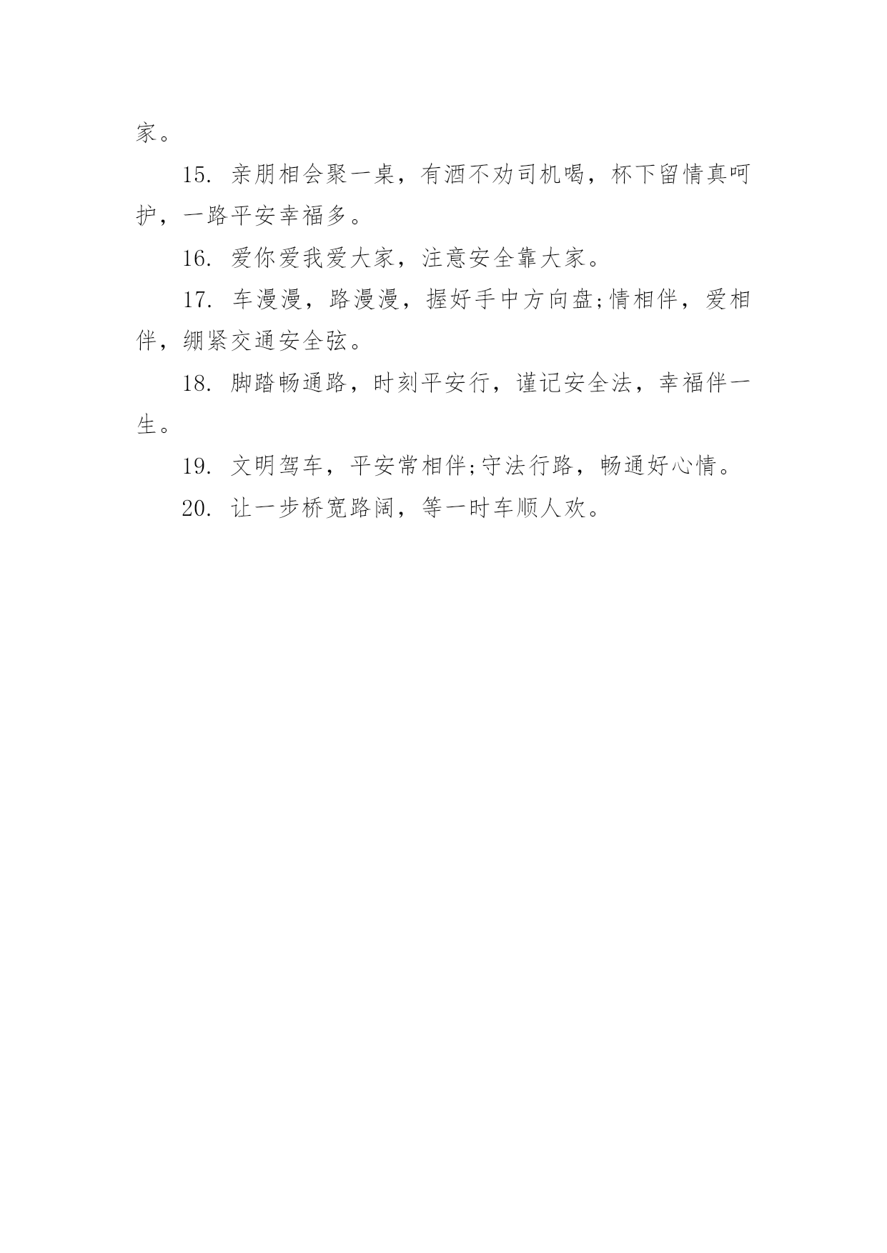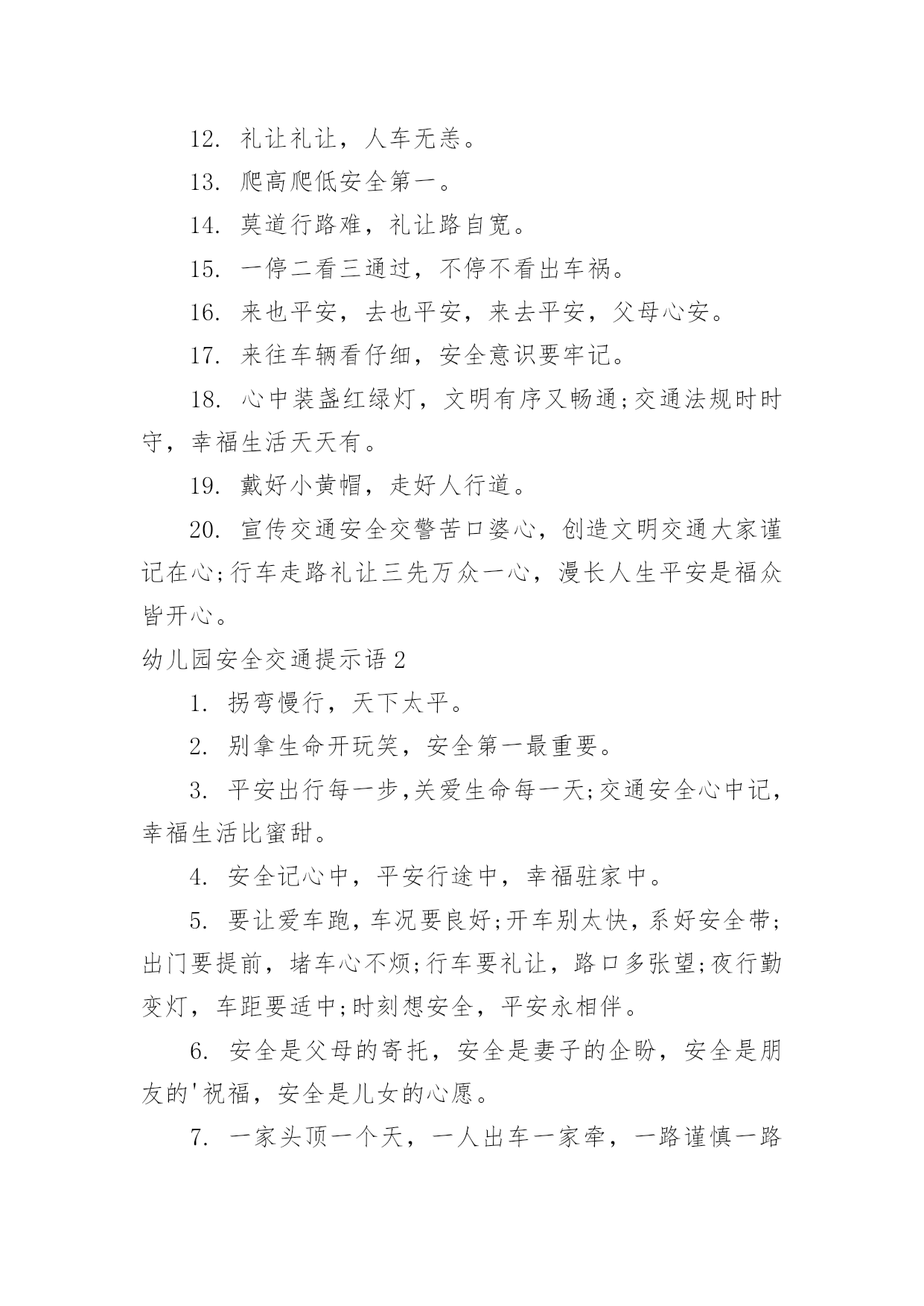 幼儿园安全交通提示语幼儿园安全交通提示语幼儿园安全交通提示语11.让我们忠诚地守卫交通安全,一天又一天;让我们执著地追逐幸福,一年又一年;温馨是永远的'伴侣,平安是共同的心愿。2.你慢一点我慢一点,文明的步伐快一点;你让一点我让一点,舒心的笑容多一点;你讲安全我讲安全,美好生活到永远。3.千言万语平安是福,千山万水遵规为路,千锤百炼自信有度,千方百计谨慎起步。4.点点滴滴,安全第一。5.方向盘重又圆,安全法记心间,酒色气全不沾,疲劳车更不玩,保安全重如山,日月年幸福连。6.车铃开口叫,请你让开道。7.刹车不灵不得外行。8.马路不是运动场,追逐玩耍要上当。9.图一时痛快,将换来一生遗憾。10.有一种叮咛叫滴酒莫沾,有一种感觉叫望眼欲穿,有一种期盼叫一路平安,有一种温馨叫合家团圆。11.家有老小责任担双肩,路有风雨安全记心间。12.礼让礼让,人车无恙。13.爬高爬低安全第一。14.莫道行路难,礼让路自宽。15.一停二看三通过,不停不看出车祸。16.来也平安,去也平安,来去平安,父母心安。17.来往车辆看仔细,安全意识要牢记。18.心中装盏红绿灯,文明有序又畅通;交通法规时时守,幸福生活天天有。19.戴好小黄帽,走好人行道。20.宣传交通安全交警苦口婆心,创造文明交通大家谨记在心;行车走路礼让三先万众一心,漫长人生平安是福众皆开心。幼儿园安全交通提示语21.拐弯慢行,天下太平。2.别拿生命开玩笑,安全第一最重要。3.平安出行每一步,关爱生命每一天;交通安全心中记,幸福生活比蜜甜。4.安全记心中,平安行途中,幸福驻家中。5.要让爱车跑,车况要良好;开车别太快,系好安全带;出门要提前,堵车心不烦;行车要礼让,路口多张望;夜行勤变灯,车距要适中;时刻想安全,平安永相伴。6.安全是父母的寄托,安全是妻子的企盼,安全是朋友的'祝福,安全是儿女的心愿。7.一家头顶一个天,一人出车一家牵,一路谨慎一路安,一人安全一家欢。8.红绿灯下车如潮,安全行驶最重要,彼此礼让守秩序,归途平安阖家笑。9.安全来自警惕,你我必须牢记。10.人过马路口,斑马线内走。幼儿园安全交通提示语31.红灯停绿灯行,交通安全我能行。2.手中方向盘,生命支配点;握好方向盘,幸福在眼前。3.世上的路千千万,安全行驶一线牵;生活的情万万千,关爱生命才久远。4.遵规驾驶有速度,珍惜生命是成熟,出入平安是祝福,合家团圆享富足。5.让安全牢记心上,让生活洒满阳光。6.上学安全,放学团圆。7.你走,我走,大家走,安全意识心中有;你让,我让,大家让,安全行路有保障。8.天天讲交通安全不是玩笑。9.上车队伍齐,下车不拥挤。10.安全在心中,一切好轻松。11.平安为无价宝,当心为护身术。12.旅途可以寂寞,人生不可孤单。行车关爱自己,走路礼让他人。13.心系安全,平安一生。14.交通是棵树,畅通才能绿;文明是朵花,安全香万家。15.亲朋相会聚一桌,有酒不劝司机喝,杯下留情真呵护,一路平安幸福多。16.爱你爱我爱大家,注意安全靠大家。17.车漫漫,路漫漫,握好手中方向盘;情相伴,爱相伴,绷紧交通安全弦。18.脚踏畅通路,时刻平安行,谨记安全法,幸福伴一生。19.文明驾车,平安常相伴;守法行路,畅通好心情。20.让一步桥宽路阔,等一时车顺人欢。