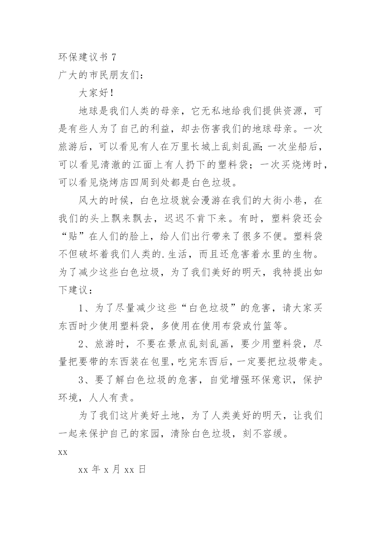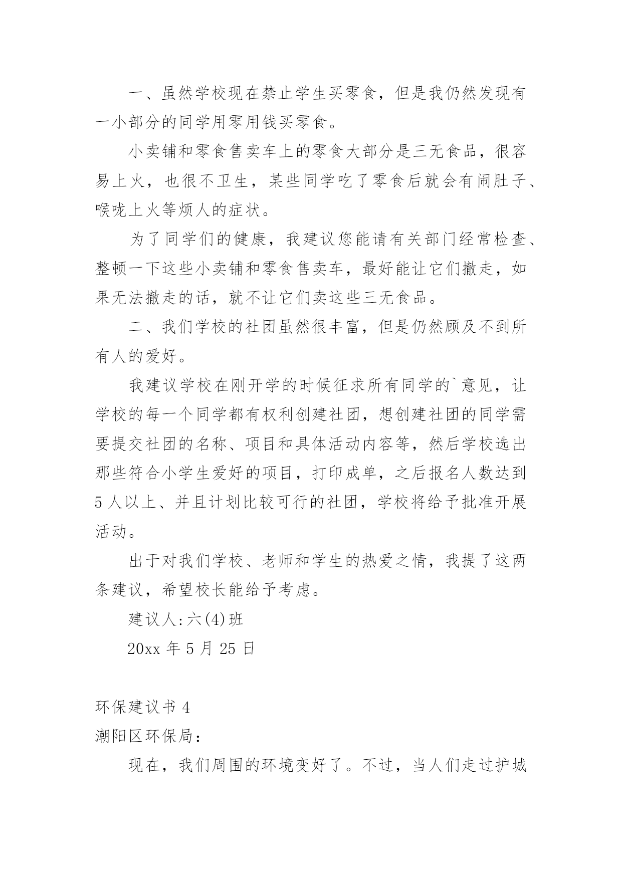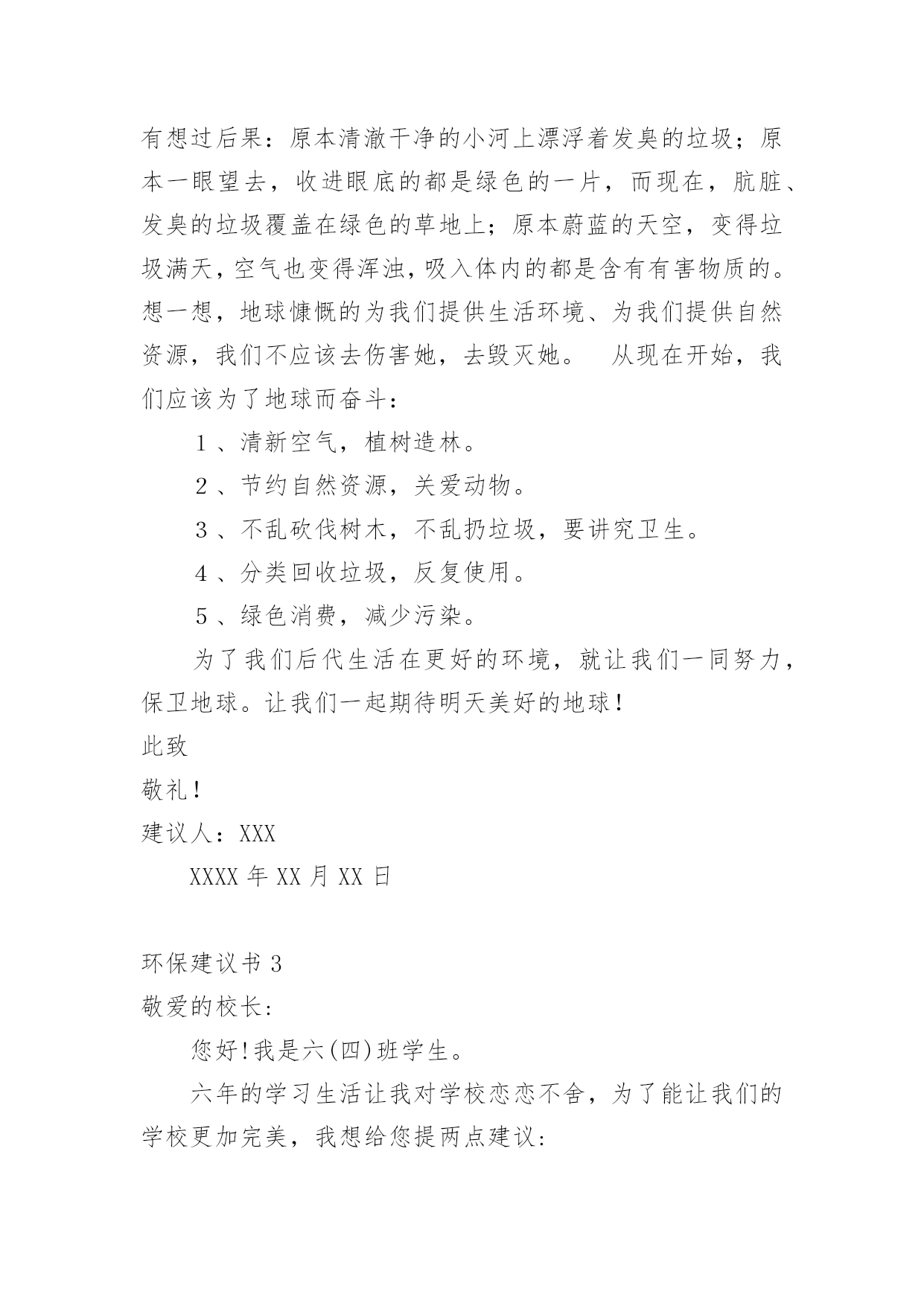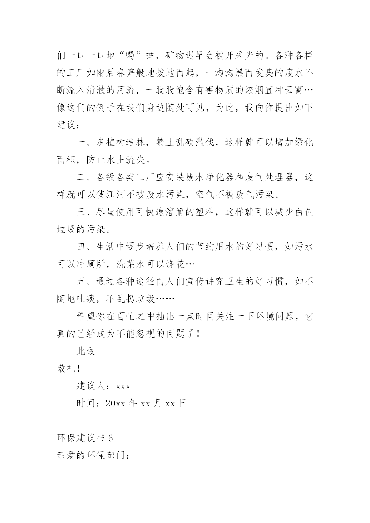 环保建议书[热]环保建议书在现在社会,用到建议书的地方越来越多,我们在写建议书时要分条列出建议的具体内容。大家知道建议书的格式吗?下面是小编收集整理的环保建议书,欢迎阅读,希望大家能够喜欢。环保建议书1亲爱的老师、同学:你们好?我是XX班XX,你们应该都知道青蛙是益虫,但是现在人类大量的'不杀它们,已经很少看到它们了,所以我建议:我们手拉手,一起保护这些可怜的小动物!xxx20xx年xx月xx日环保建议书2xx市环保局:地球是我们人类的母亲,也是生命的摇篮。没有了她,我们无法生存,我们应该保护地球。可是,据我所知全世界平均一年需要砍掉1100万公顷,许多地区的人都渴死了。大家在随手扔垃圾的.时候,有没有想过后果:原本清澈干净的小河上漂浮着发臭的垃圾;原本一眼望去,收进眼底的都是绿色的一片,而现在,肮脏、发臭的垃圾覆盖在绿色的草地上;原本蔚蓝的天空,变得垃圾满天,空气也变得浑浊,吸入体内的都是含有有害物质的。想一想,地球慷慨的为我们提供生活环境、为我们提供自然资源,我们不应该去伤害她,去毁灭她。从现在开始,我们应该为了地球而奋斗:1、清新空气,植树造林。2、节约自然资源,关爱动物。3、不乱砍伐树木,不乱扔垃圾,要讲究卫生。4、分类回收垃圾,反复使用。5、绿色消费,减少污染。为了我们后代生活在更好的环境,就让我们一同努力,保卫地球。让我们一起期待明天美好的地球!此致敬礼!建议人:XXXXXXX年XX月XX日环保建议书3敬爱的校长:您好!我是六(四)班学生。六年的学习生活让我对学校恋恋不舍,为了能让我们的学校更加完美,我想给您提两点建议:一、虽然学校现在禁止学生买零食,但是我仍然发现有一小部分的同学用零用钱买零食。小卖铺和零食售卖车上的零食大部分是三无食品,很容易上火,也很不卫生,某些同学吃了零食后就会有闹肚子、喉咙上火等烦人的症状。为了同学们的健康,我建议您能请有关部门经常检查、整顿一下这些小卖铺和零食售卖车,最好能让它们撤走,如果无法撤走的话,就不让它们卖这些三无食品。二、我们学校的社团虽然很丰富,但是仍然顾及不到所有人的爱好。我建议学校在刚开学的时候征求所有同学的`意见,让学校的每一个同学都有权利创建社团,想创建社团的同学需要提交社团的名称、项目和具体活动内容等,然后学校选出那些符合小学生爱好的项目,打印成单,之后报名人数达到5人以上、并且计划比较可行的社团,学校将给予批准开展活动。出于对我们学校、老师和学生的热爱之情,我提了这两条建议,希望校长能给予考虑。建议人:六(4)班20xx年5月25日环保建议书4潮阳区环保局:现在,我们周围的环境变好了。不过,当人们走过护城河时,一看护城河就觉得恶心,因此,我向你们提几条建议:一、通过宣传或广告的形式来增强人们的`环境保护意识。二、让各个厂家处理好“三废”问题,一定要加强管理“三废”问题。三、在护城河旁立个警示牌,不让人们向护城河扔垃圾。四、落实护城河清理工作。环保局的叔叔阿姨们,大家们,让我们一起让护城河变回往日的清澈吧!xxxxx年xx月xx日环保建议书5尊敬的环卫局局长:你好!我是一名六年级的小学生,关于环境保护的问题,我今天想跟你提点建议。地球是我们的家,也是我们的母亲。地球无私地供给我们各种资源,让我们有吃的,穿的,用的……我们本应该竭尽全力去保护她。但是,我看到的并不是这样的,伐木工人砍倒一棵又一棵的参天大树,却不懂得砍一棵种一棵树的道理,导致森林面积大幅度地减少,大量水土流失。人们没有节制地用水,喝一杯水倒一杯水,洒一盆水的现象在我们身边大量出现,我们地球上的淡水正在走向枯竭。煤矿的.开采力度日渐加大,地下的矿物就像杯子里的果汁一样,被人们一口一口地“喝”掉,矿物迟早会被开采光的。各种各样的工厂如雨后春笋般地拔地而起,一沟沟黑而发臭的废水不断流入清澈的河流,一股股饱含有害物质的浓烟直冲云霄…像这们的例子在我们身边随处可见,为此,我向你提出如下建议:一、多植树造林,禁止乱砍滥伐,这样就可以增加绿化面积,防止水土流失。二、各级各类工厂应安装废水净化器和废气处理器,这样就可以使江河不被废水污染,空气不被废气污染。三、尽量使用可快速溶解的塑料,这样就可以减少白色垃圾的污染。四、生活中逐步培养人们的节约用水的好习惯,如污水可以冲厕所,洗菜水可以浇花…五、通过各种途径向人们宣传讲究卫生的好习惯,如不随地吐痰,不乱扔垃圾……希望你在百忙之中抽出一点时间关注一下环境问题,它真的已经成为不能忽视的问题了!此致敬礼!建议人:xxx时间:20xx年xx月xx日环保建议书6亲爱的环保部门:你们好!大自然给予了我们美好的生活环境,我们也在大自然母亲的怀抱中自由自在的生活,如果没大自然母亲给予我们空气;如果没大自然母亲给予我们土地;如果没大自然母亲给予我们自然水,我们将无法生存。下面我给你们提