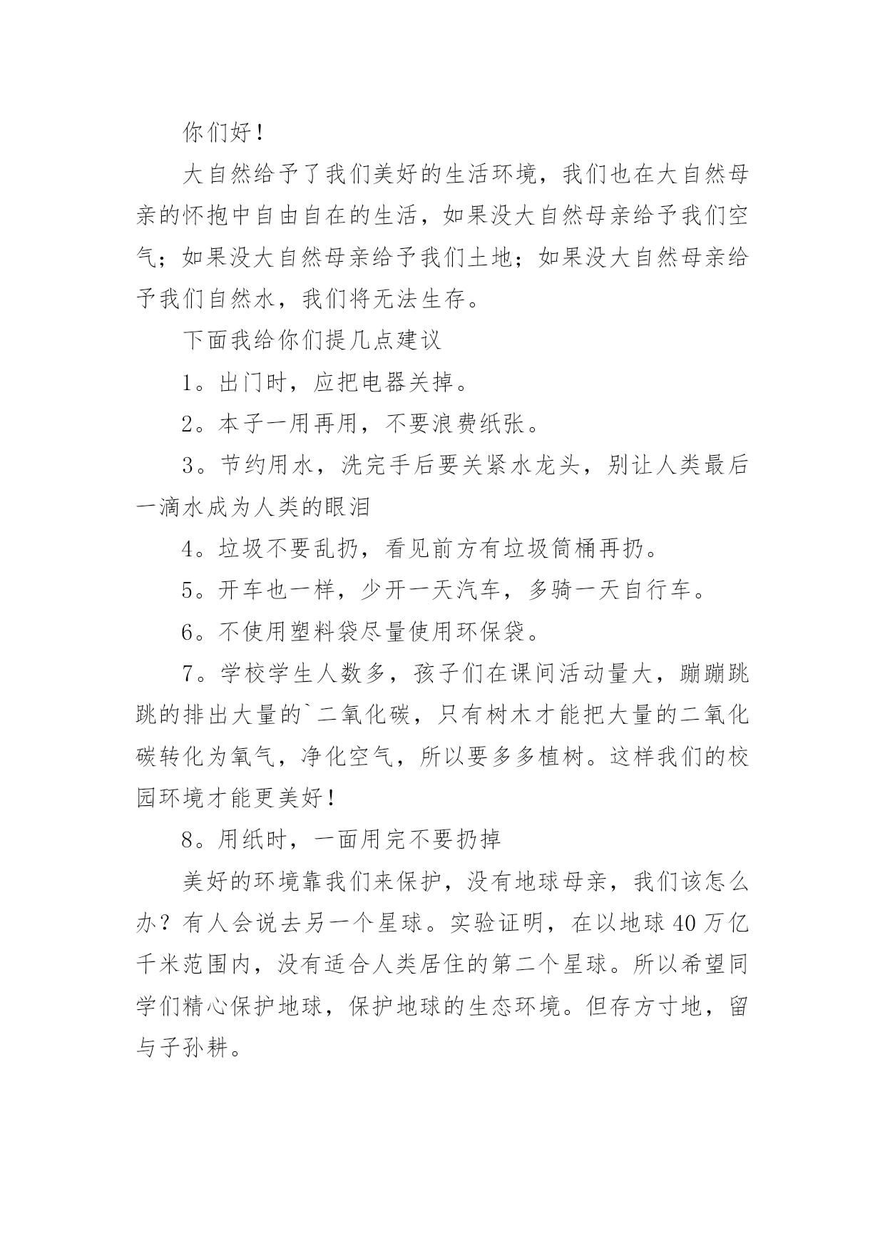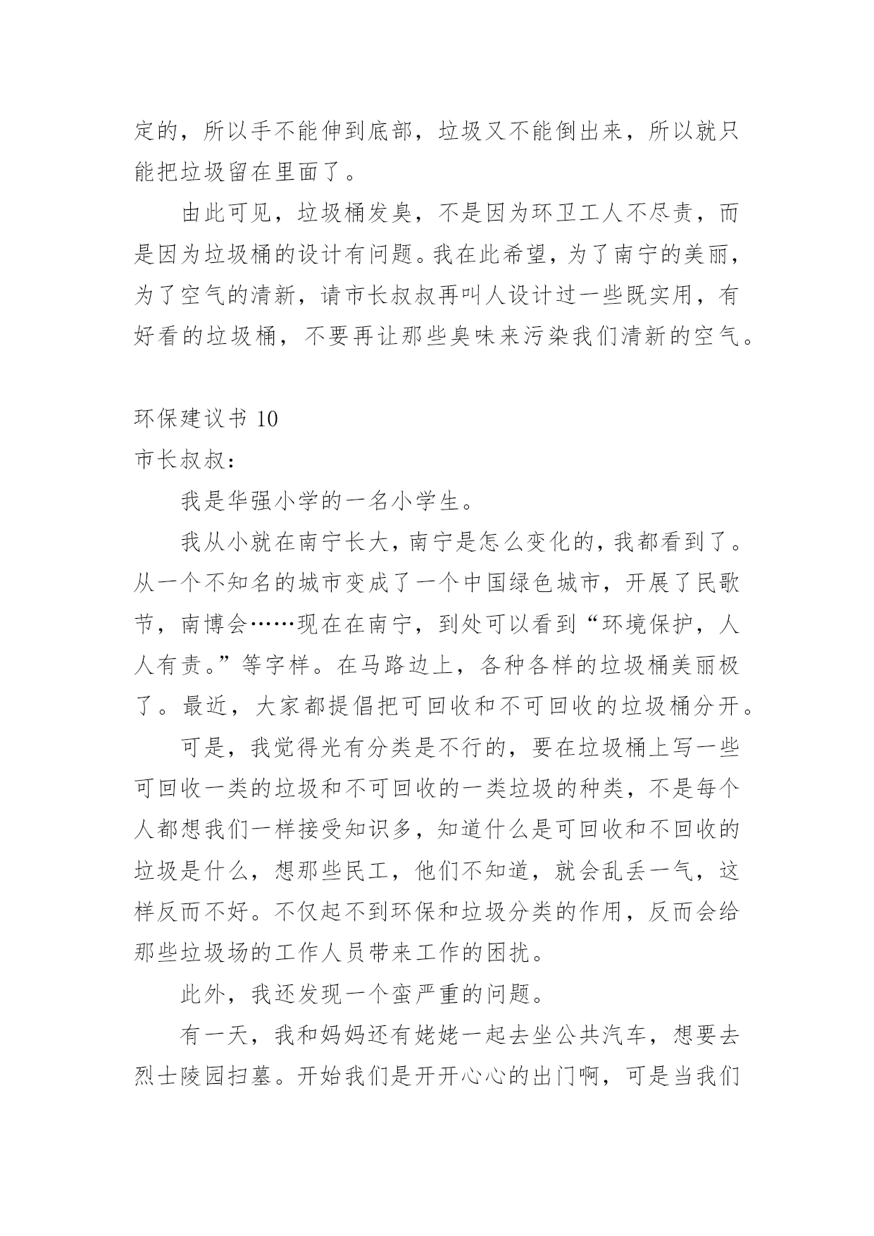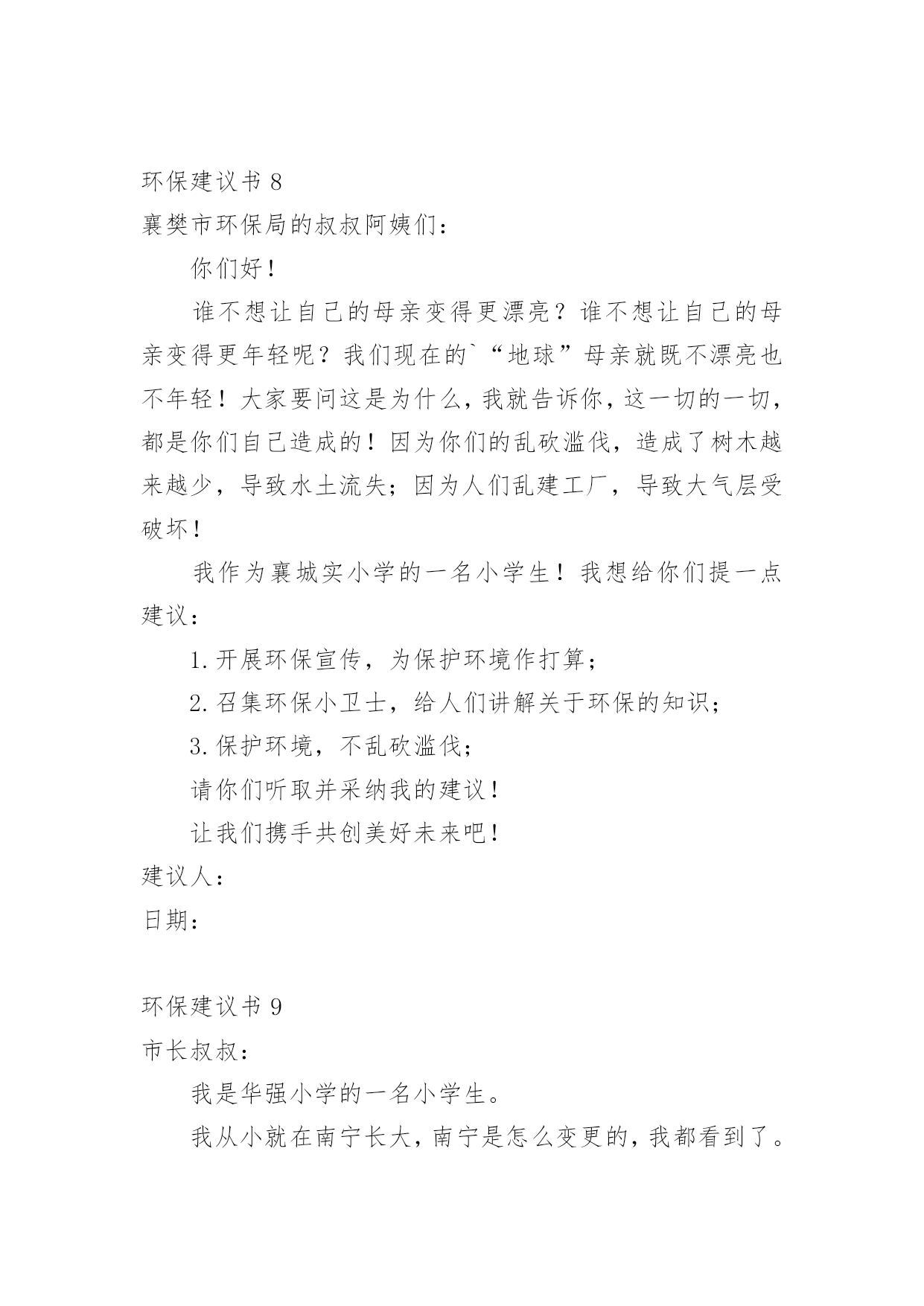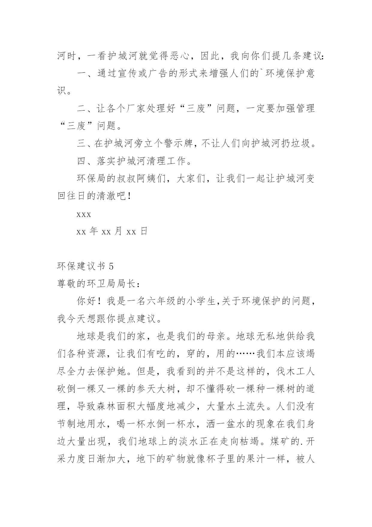 环保建议书[热]环保建议书在现在社会,用到建议书的地方越来越多,我们在写建议书时要分条列出建议的具体内容。大家知道建议书的格式吗?下面是小编收集整理的环保建议书,欢迎阅读,希望大家能够喜欢。环保建议书1亲爱的老师、同学:你们好?我是XX班XX,你们应该都知道青蛙是益虫,但是现在人类大量的'不杀它们,已经很少看到它们了,所以我建议:我们手拉手,一起保护这些可怜的小动物!xxx20xx年xx月xx日环保建议书2xx市环保局:地球是我们人类的母亲,也是生命的摇篮。没有了她,我们无法生存,我们应该保护地球。可是,据我所知全世界平均一年需要砍掉1100万公顷,许多地区的人都渴死了。大家在随手扔垃圾的.时候,有没有想过后果:原本清澈干净的小河上漂浮着发臭的垃圾;原本一眼望去,收进眼底的都是绿色的一片,而现在,肮脏、发臭的垃圾覆盖在绿色的草地上;原本蔚蓝的天空,变得垃圾满天,空气也变得浑浊,吸入体内的都是含有有害物质的。想一想,地球慷慨的为我们提供生活环境、为我们提供自然资源,我们不应该去伤害她,去毁灭她。从现在开始,我们应该为了地球而奋斗:1、清新空气,植树造林。2、节约自然资源,关爱动物。3、不乱砍伐树木,不乱扔垃圾,要讲究卫生。4、分类回收垃圾,反复使用。5、绿色消费,减少污染。为了我们后代生活在更好的环境,就让我们一同努力,保卫地球。让我们一起期待明天美好的地球!此致敬礼!建议人:XXXXXXX年XX月XX日环保建议书3敬爱的校长:您好!我是六(四)班学生。六年的学习生活让我对学校恋恋不舍,为了能让我们的学校更加完美,我想给您提两点建议:一、虽然学校现在禁止学生买零食,但是我仍然发现有一小部分的同学用零用钱买零食。小卖铺和零食售卖车上的零食大部分是三无食品,很容易上火,也很不卫生,某些同学吃了零食后就会有闹肚子、喉咙上火等烦人的症状。为了同学们的健康,我建议您能请有关部门经常检查、整顿一下这些小卖铺和零食售卖车,最好能让它们撤走,如果无法撤走的话,就不让它们卖这些三无食品。二、我们学校的社团虽然很丰富,但是仍然顾及不到所有人的爱好。我建议学校在刚开学的时候征求所有同学的`意见,让学校的每一个同学都有权利创建社团,想创建社团的同学需要提交社团的名称、项目和具体活动内容等,然后学校选出那些符合小学生爱好的项目,打印成单,之后报名人数达到5人以上、并且计划比较可行的社团,学校将给予批准开展活动。出于对我们学校、老师和学生的热爱之情,我提了这两条建议,希望校长能给予考虑。建议人:六(4)班20xx年5月25日环保建议书4潮阳区环保局:现在,我们周围的环境变好了。不过,当人们走过护城河时,一看护城河就觉得恶心,因此,我向你们提几条建议:一、通过宣传或广告的形式来增强人们的`环境保护意识。二、让各个厂家处理好“三废”问题,一定要加强管理“三废”问题。三、在护城河旁立个警示牌,不让人们向护城河扔垃圾。四、落实护城河清理工作。环保局的叔叔阿姨们,大家们,让我们一起让护城河变回往日的清澈吧!xxxxx年xx月xx日环保建议书5尊敬的环卫局局长:你好!我是一名六年级的小学生,关于环境保护的问题,我今天想跟你提点建议。地球是我们的家,也是我们的母亲。地球无私地供给我们各种资源,让我们有吃的,穿的,用的……我们本应该竭尽全力去保护她。但是,我看到的并不是这样的,伐木工人砍倒一棵又一棵的参天大树,却不懂得砍一棵种一棵树的道理,导致森林面积大幅度地减少,大量水土流失。人们没有节制地用水,喝一杯水倒一杯水,洒一盆水的现象在我们身边大量出现,我们地球上的淡水正在走向枯竭。煤矿的.开采力度日渐加大,地下的矿物就像杯子里的果汁一样,被人们一口一口地“喝”掉,矿物迟早会被开采光的。各种各样的工厂如雨后春笋般地拔地而起,一沟沟黑而发臭的废水不断流入清澈的河流,一股股饱含有害物质的浓烟直冲云霄…像这们的例子在我们身边随处可见,为此,我向你提出如下建议:一、多植树造林,禁止乱砍滥伐,这样就可以增加绿化面积,防止水土流失。二、各级各类工厂应安装废水净化器和废气处理器,这样就可以使江河不被废水污染,空气不被废气污染。三、尽量使用可快速溶解的塑料,这样就可以减少白色垃圾的污染。四、生活中逐步培养人们的节约用水的好习惯,如污水可以冲厕所,洗菜水可以浇花…五、通过各种途径向人们宣传讲究卫生的好习惯,如不随地吐痰,不乱扔垃圾……希望你在百忙之中抽出一点时间关注一下环境问题,它真的已经成为不能忽视的问题了!此致敬礼!建议人:xxx时间:20xx年xx月xx日环保建议书6亲爱的环保部门:你们好!大自然给予了我们美好的生活环境,我们也在大自然母亲的怀抱中自由自在的生活,如果没大自然母亲给予我们空气;如果没大自然母亲给予我们土地;如果没大自然母亲给予我们自然水,我们将无法生存。下面我给你们提