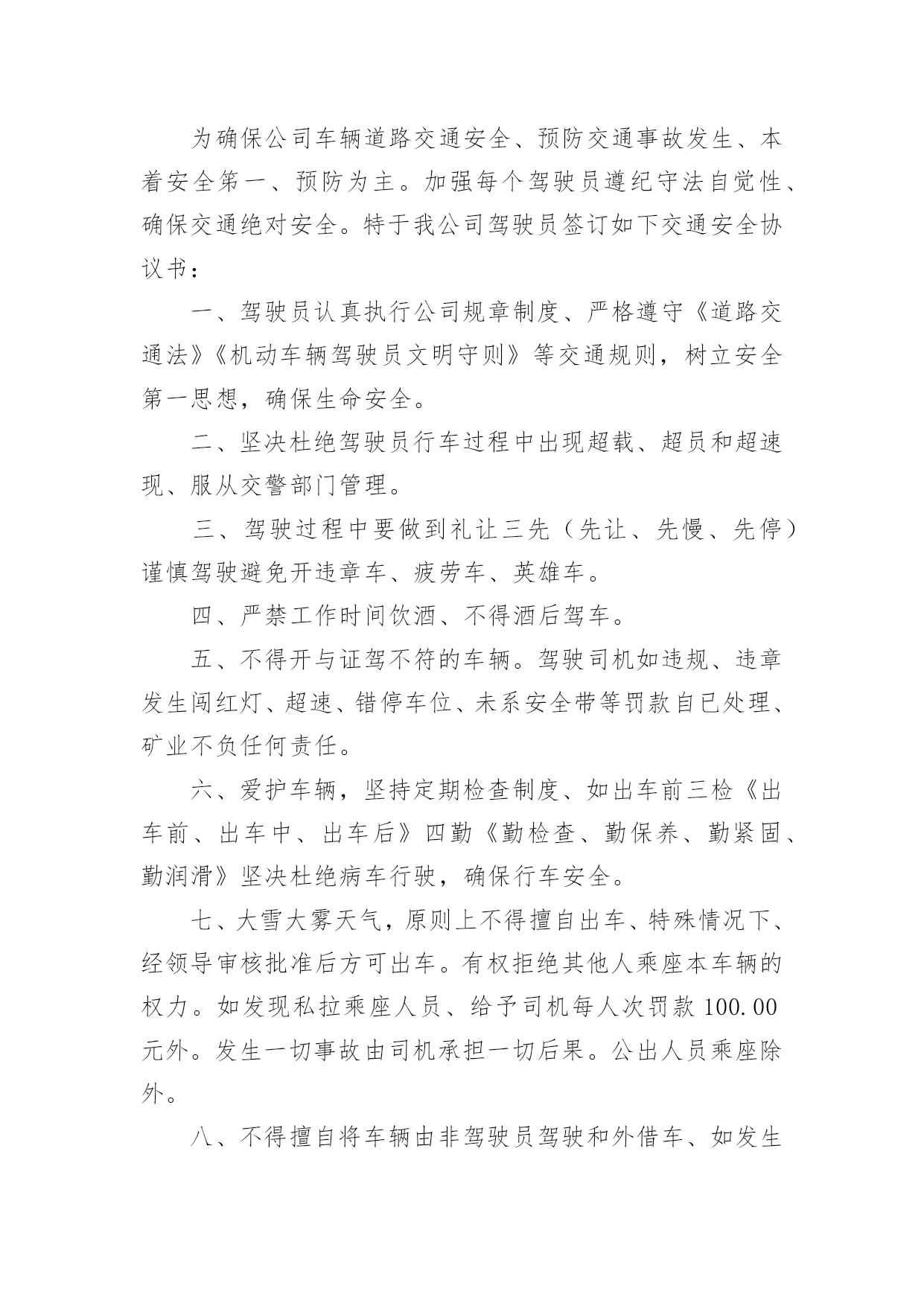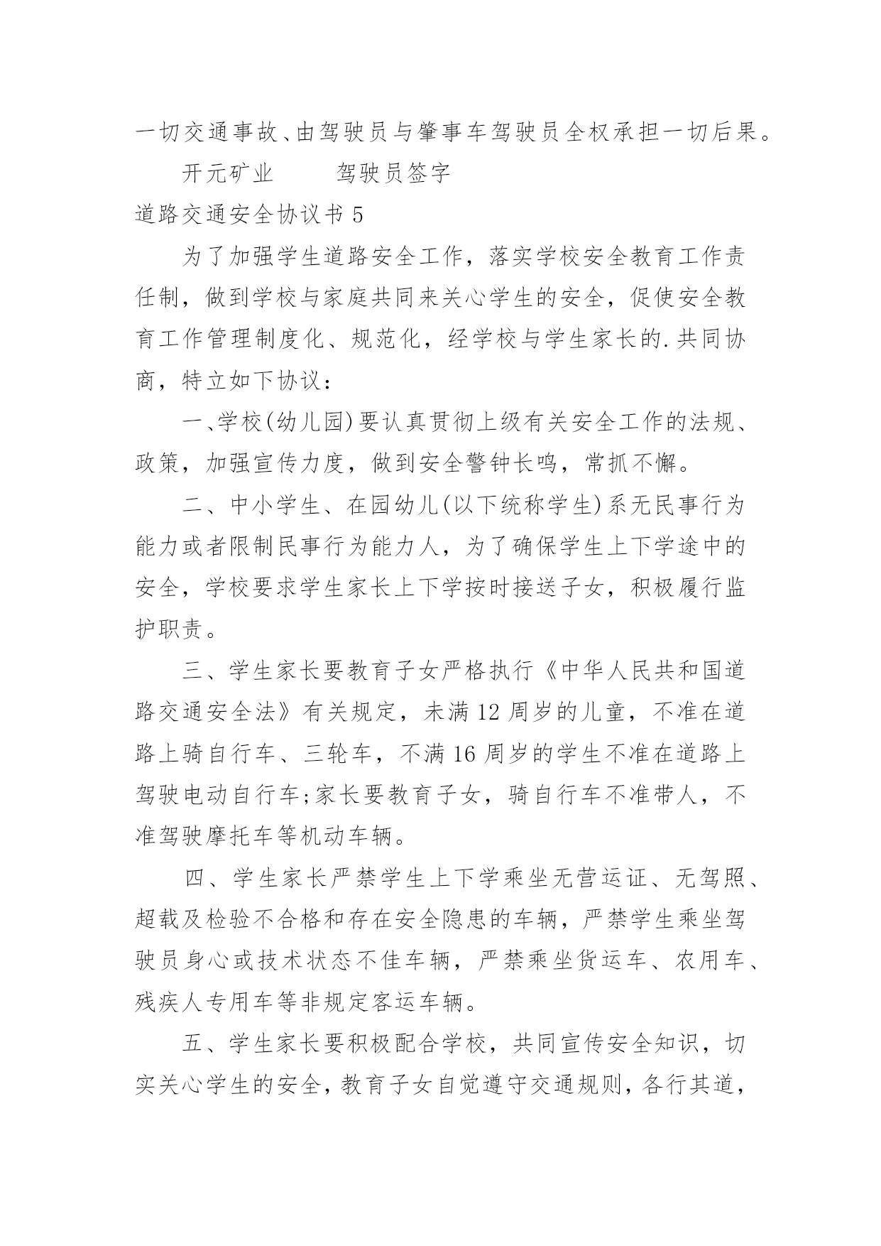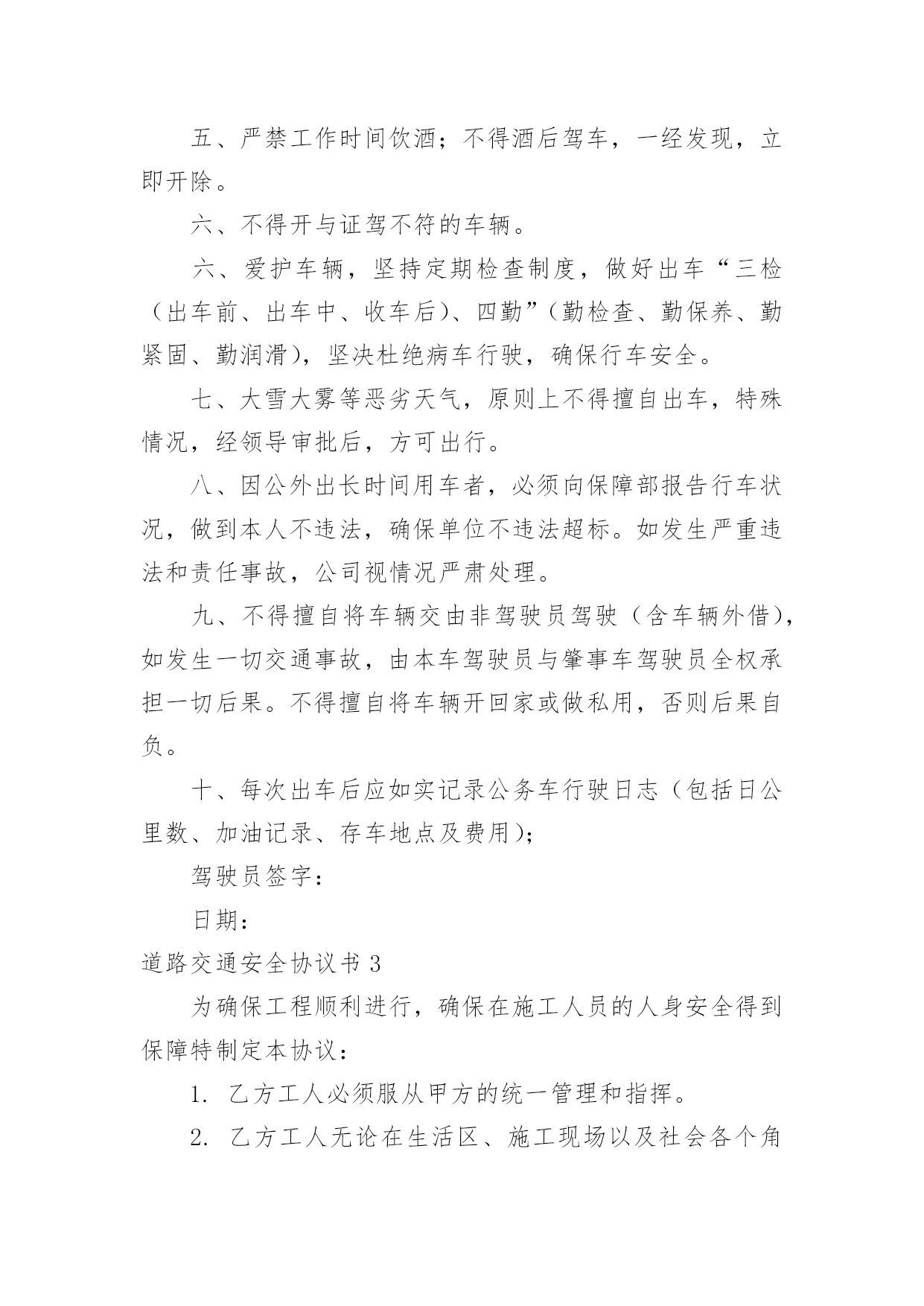道路交通安全协议书道路交通安全协议书在快速变化和不断变革的今天,协议的使用频率呈上升趋势,签订协议是解决纠纷的保障。一般协议是怎么起草的呢?以下是小编整理的道路交通安全协议书,欢迎大家借鉴与参考,希望对大家有所帮助。道路交通安全协议书1根据上级教育主管部门及交通主管部门的规定,学生在往返学校途中不得搭乘社会车辆,特别是“三无”(无牌照、无驾照、无行车证)车辆。为加强学校安全工作责任,强化安全工作监管力度,控制和减少各类伤亡事故,保障学生生命财产安全,学校决定与学生家长签订如下交通安全协议书。1、学校每周的升降国旗时,值周教师必须在校会上要求我校学生不得搭乘社会车辆,特别是“三无”车辆往返学校。学校对此项工作负有教育监管义务。2、学校规定班主任在班会课上必须进行道路交通安全知识教育,同时要求学生不得搭乘社会车辆,与家长进行沟通、劝导。3、如果学生往返学校的道路存在坍塌阻断或险情时,家长务必要亲自接送自己的'孩子,保证学生在途中的安全。4、学生或家长若执意不听劝导,仍要搭乘社会车辆特别是“三无”车辆以及超载车辆和不亲自接送自己孩子往返学校造成不良后果的,责任由家长自负,一切后果与学校无关。5、本协议一式两份,学校一份,学生家长一份,本协议从签字之日起生效。学校(盖章):学生家长(签字):校长(签字):20xx年9月20日道路交通安全协议书2为确保公司车辆道路交通安全,预防交通事故发生,本着安全第一,预防为主,加强驾驶员遵纪守法自觉性,确保交通绝对安全,特与我公司驾驶员(凡持驾照者)签订如下交通安全协议书:一、驾驶员认真执行公司规章制度,严格遵守《道路交通安全法》、《机动车驾驶员文明守则》等交通规则,树立安全第一思想,确保人员生命财产安全。因驾驶员违法违规等而发生交通事故或意外事故,因此所造成的包括但不仅限于被相关部门罚款、公务车车辆损坏、人员伤亡等一切责任后果。均由驾驶员自行承担。二、坚决杜绝驾驶员行车过程中出现超载、超员和超速现象,服从交警部门管理。三、负责证照并对车辆日常维护、保养、检验和清洁进行指导、监督;四、驾驶过程中要做到礼让三先(先让、先慢、先停),谨慎驾驶,避免开违章车、赌气车、疲劳车、英雄车。五、严禁工作时间饮酒;不得酒后驾车,一经发现,立即开除。六、不得开与证驾不符的车辆。六、爱护车辆,坚持定期检查制度,做好出车“三检(出车前、出车中、收车后)、四勤”(勤检查、勤保养、勤紧固、勤润滑),坚决杜绝病车行驶,确保行车安全。七、大雪大雾等恶劣天气,原则上不得擅自出车,特殊情况,经领导审批后,方可出行。八、因公外出长时间用车者,必须向保障部报告行车状况,做到本人不违法,确保单位不违法超标。如发生严重违法和责任事故,公司视情况严肃处理。九、不得擅自将车辆交由非驾驶员驾驶(含车辆外借),如发生一切交通事故,由本车驾驶员与肇事车驾驶员全权承担一切后果。不得擅自将车辆开回家或做私用,否则后果自负。十、每次出车后应如实记录公务车行驶日志(包括日公里数、加油记录、存车地点及费用);驾驶员签字:日期:道路交通安全协议书3为确保工程顺利进行,确保在施工人员的人身安全得到保障特制定本协议:1.乙方工人必须服从甲方的统一管理和指挥。2.乙方工人无论在生活区、施工现场以及社会各个角落都必须遵守国家的法律、法规,做一名守法公民。3.乙方工人必须遵守《北京市治安管理处罚条例》和交通安全法规的各项规定,对违反规定者甲方有权进行处罚。4.乙方工人不得以任何理由和周边居民发生纠纷,更不得内部出现打架斗殴现象,违者罚款5000元。5.施工人员上下班时必须集中管理,专人负责、并排好队伍上下班,必须由负责人带队。6.在上、下班途中必须注意交通安全,横穿马路时观看先左、后右,确定安全后再通过。7.行人通过路口或者横过道路,必须走人行横道,在确认安全后通过,不得强行通过。8.施工生产所用的工具,必须集中管理、运送到施工现场或生活区。9、遵守甲方制定的.保密安全协议。10、如果违反交通法规发生伤亡事故,其造成的一切损失由乙方负责。以上协议作为分包合同附件,一式两份,甲、乙双方各一份。11、协议签订地点::北京市中关村科技园区通州园金桥科技产业基地景盛南四街联东U谷。总包方(甲方):(章)项目负责人:(章)分包方(乙方):(章)项目负责人:签订日期:年月日道路交通安全协议书4为确保公司车辆道路交通安全、预防交通事故发生、本着安全笫一、预防为主。加强每个驾驶员遵纪守法自觉性、确保交通绝对安全。特于我公司驾驶员签订如下交通安全协议书:一、驾驶员认真执行公司规章制度、严格遵守《道路交通法》《机动车辆驾驶员文明守则》等交通规则,树立安全第一思想,确保生命安全。二、坚决杜绝驾驶员行车过程中出现超载、超员和超速现、服从交警部门管理。三、驾驶过程中要做到礼让三先(先让、先慢、