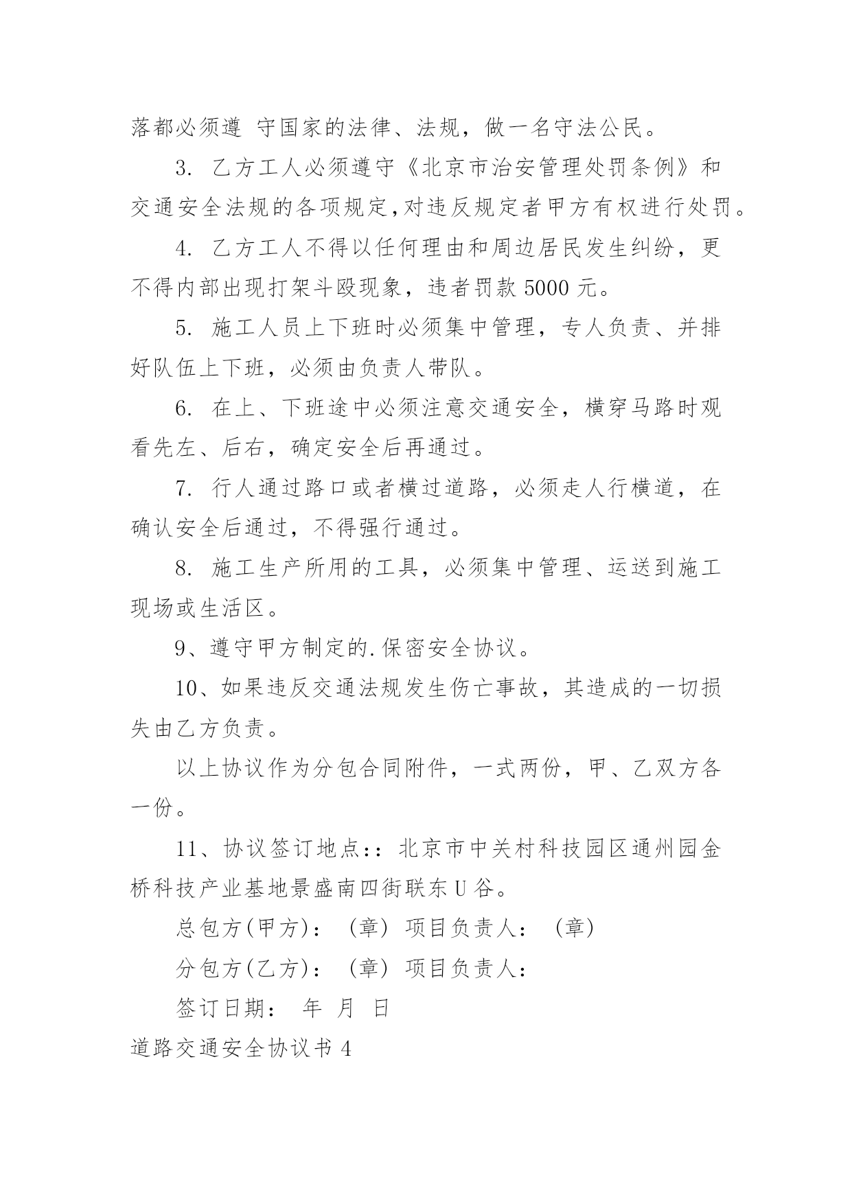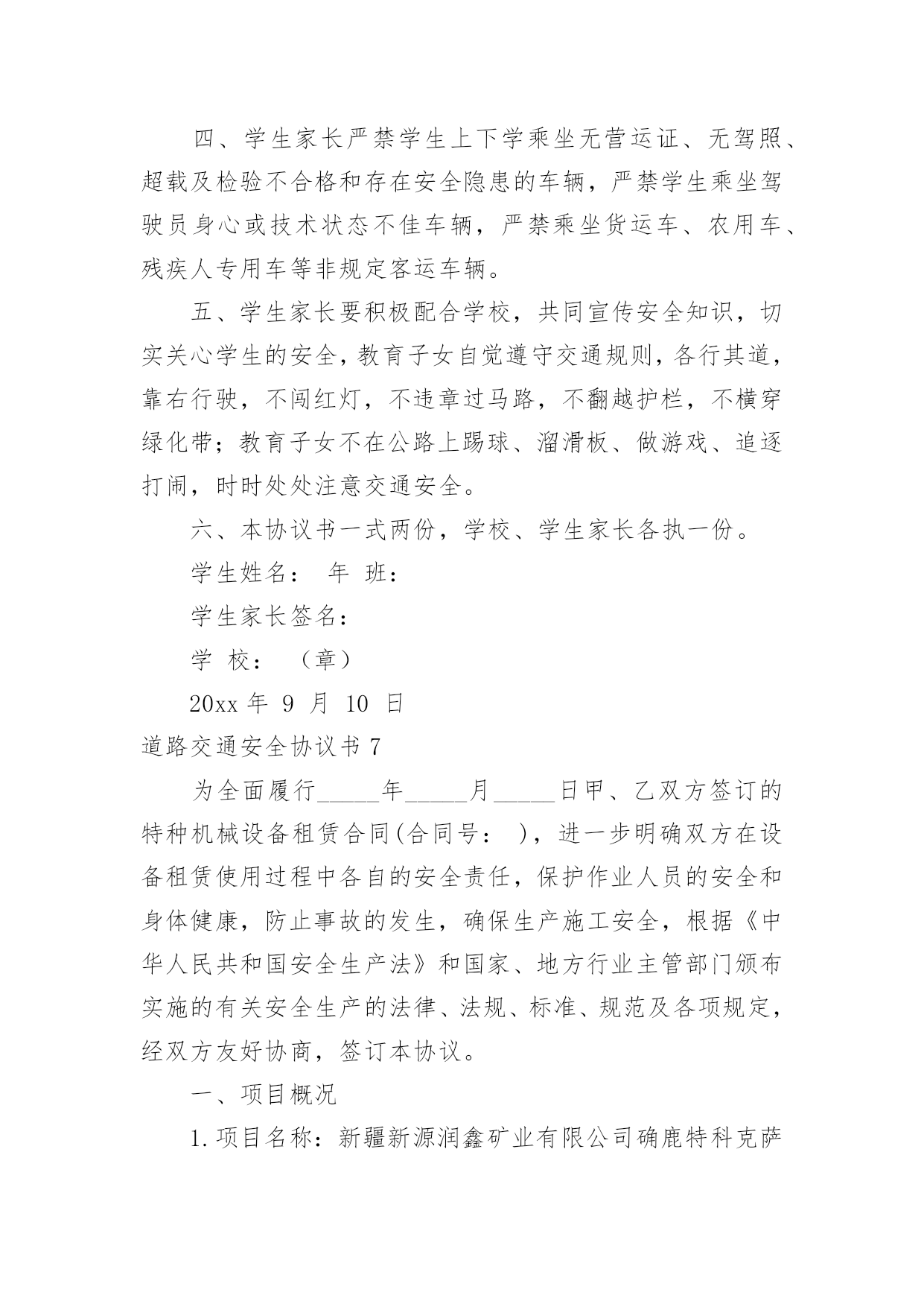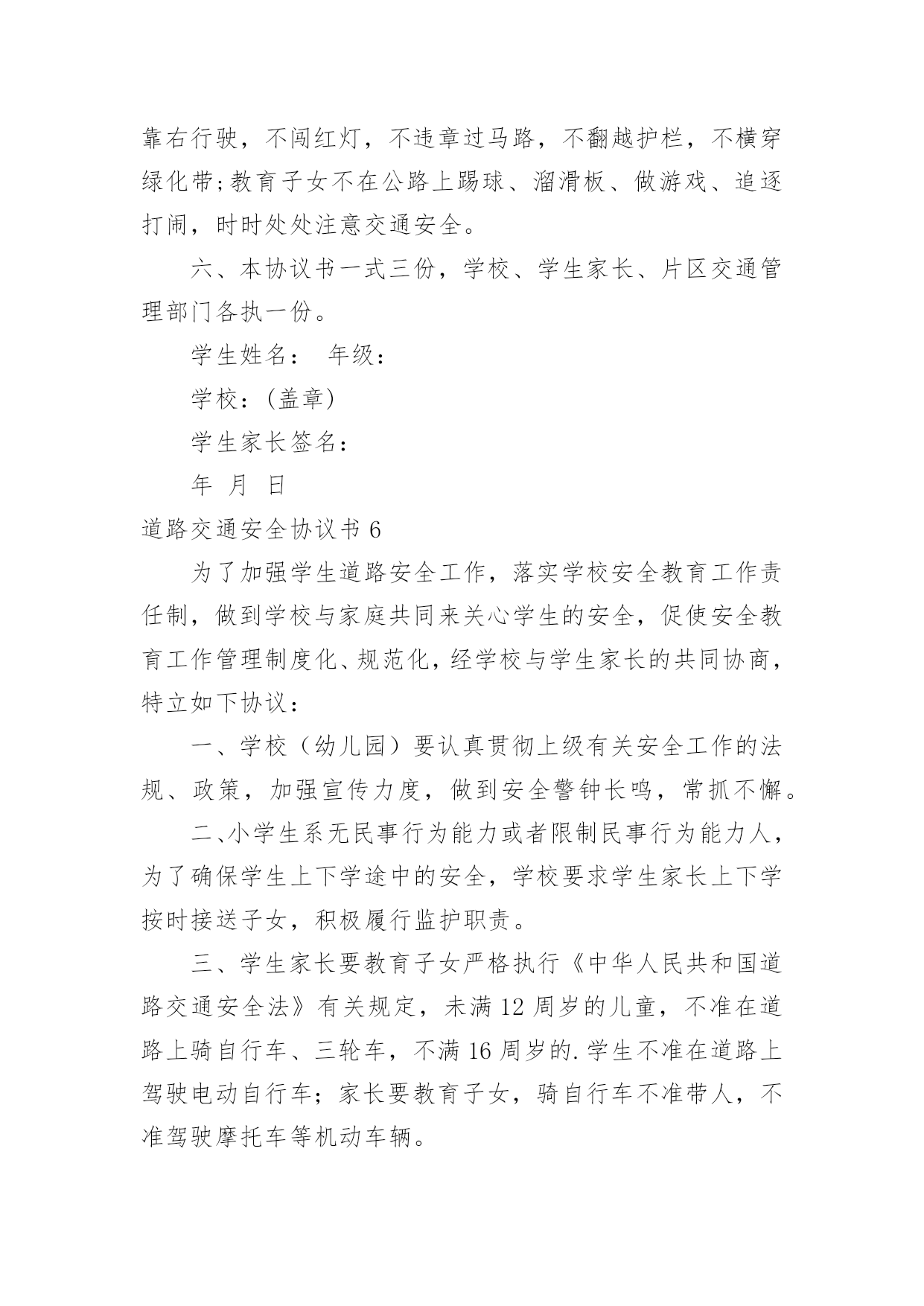 道路交通安全协议书道路交通安全协议书在快速变化和不断变革的今天,协议的使用频率呈上升趋势,签订协议是解决纠纷的保障。一般协议是怎么起草的呢?以下是小编整理的道路交通安全协议书,欢迎大家借鉴与参考,希望对大家有所帮助。道路交通安全协议书1根据上级教育主管部门及交通主管部门的规定,学生在往返学校途中不得搭乘社会车辆,特别是“三无”(无牌照、无驾照、无行车证)车辆。为加强学校安全工作责任,强化安全工作监管力度,控制和减少各类伤亡事故,保障学生生命财产安全,学校决定与学生家长签订如下交通安全协议书。1、学校每周的升降国旗时,值周教师必须在校会上要求我校学生不得搭乘社会车辆,特别是“三无”车辆往返学校。学校对此项工作负有教育监管义务。2、学校规定班主任在班会课上必须进行道路交通安全知识教育,同时要求学生不得搭乘社会车辆,与家长进行沟通、劝导。3、如果学生往返学校的道路存在坍塌阻断或险情时,家长务必要亲自接送自己的'孩子,保证学生在途中的安全。4、学生或家长若执意不听劝导,仍要搭乘社会车辆特别是“三无”车辆以及超载车辆和不亲自接送自己孩子往返学校造成不良后果的,责任由家长自负,一切后果与学校无关。5、本协议一式两份,学校一份,学生家长一份,本协议从签字之日起生效。学校(盖章):学生家长(签字):校长(签字):20xx年9月20日道路交通安全协议书2为确保公司车辆道路交通安全,预防交通事故发生,本着安全第一,预防为主,加强驾驶员遵纪守法自觉性,确保交通绝对安全,特与我公司驾驶员(凡持驾照者)签订如下交通安全协议书:一、驾驶员认真执行公司规章制度,严格遵守《道路交通安全法》、《机动车驾驶员文明守则》等交通规则,树立安全第一思想,确保人员生命财产安全。因驾驶员违法违规等而发生交通事故或意外事故,因此所造成的包括但不仅限于被相关部门罚款、公务车车辆损坏、人员伤亡等一切责任后果。均由驾驶员自行承担。二、坚决杜绝驾驶员行车过程中出现超载、超员和超速现象,服从交警部门管理。三、负责证照并对车辆日常维护、保养、检验和清洁进行指导、监督;四、驾驶过程中要做到礼让三先(先让、先慢、先停),谨慎驾驶,避免开违章车、赌气车、疲劳车、英雄车。五、严禁工作时间饮酒;不得酒后驾车,一经发现,立即开除。六、不得开与证驾不符的车辆。六、爱护车辆,坚持定期检查制度,做好出车“三检(出车前、出车中、收车后)、四勤”(勤检查、勤保养、勤紧固、勤润滑),坚决杜绝病车行驶,确保行车安全。七、大雪大雾等恶劣天气,原则上不得擅自出车,特殊情况,经领导审批后,方可出行。八、因公外出长时间用车者,必须向保障部报告行车状况,做到本人不违法,确保单位不违法超标。如发生严重违法和责任事故,公司视情况严肃处理。九、不得擅自将车辆交由非驾驶员驾驶(含车辆外借),如发生一切交通事故,由本车驾驶员与肇事车驾驶员全权承担一切后果。不得擅自将车辆开回家或做私用,否则后果自负。十、每次出车后应如实记录公务车行驶日志(包括日公里数、加油记录、存车地点及费用);驾驶员签字:日期:道路交通安全协议书3为确保工程顺利进行,确保在施工人员的人身安全得到保障特制定本协议:1.乙方工人必须服从甲方的统一管理和指挥。2.乙方工人无论在生活区、施工现场以及社会各个角落都必须遵守国家的法律、法规,做一名守法公民。3.乙方工人必须遵守《北京市治安管理处罚条例》和交通安全法规的各项规定,对违反规定者甲方有权进行处罚。4.乙方工人不得以任何理由和周边居民发生纠纷,更不得内部出现打架斗殴现象,违者罚款5000元。5.施工人员上下班时必须集中管理,专人负责、并排好队伍上下班,必须由负责人带队。6.在上、下班途中必须注意交通安全,横穿马路时观看先左、后右,确定安全后再通过。7.行人通过路口或者横过道路,必须走人行横道,在确认安全后通过,不得强行通过。8.施工生产所用的工具,必须集中管理、运送到施工现场或生活区。9、遵守甲方制定的.保密安全协议。10、如果违反交通法规发生伤亡事故,其造成的一切损失由乙方负责。以上协议作为分包合同附件,一式两份,甲、乙双方各一份。11、协议签订地点::北京市中关村科技园区通州园金桥科技产业基地景盛南四街联东U谷。总包方(甲方):(章)项目负责人:(章)分包方(乙方):(章)项目负责人:签订日期:年月日道路交通安全协议书4为确保公司车辆道路交通安全、预防交通事故发生、本着安全笫一、预防为主。加强每个驾驶员遵纪守法自觉性、确保交通绝对安全。特于我公司驾驶员签订如下交通安全协议书:一、驾驶员认真执行公司规章制度、严格遵守《道路交通法》《机动车辆驾驶员文明守则》等交通规则,树立安全第一思想,确保生命安全。二、坚决杜绝驾驶员行车过程中出现超载、超员和超速现、服从交警部门管理。三、驾驶过程中要做到礼让三先(先让、先慢、