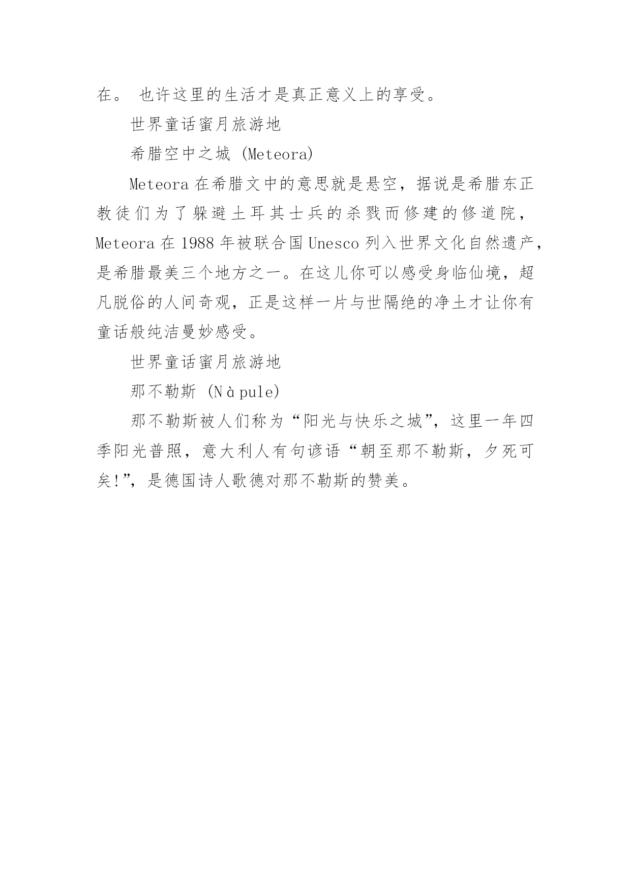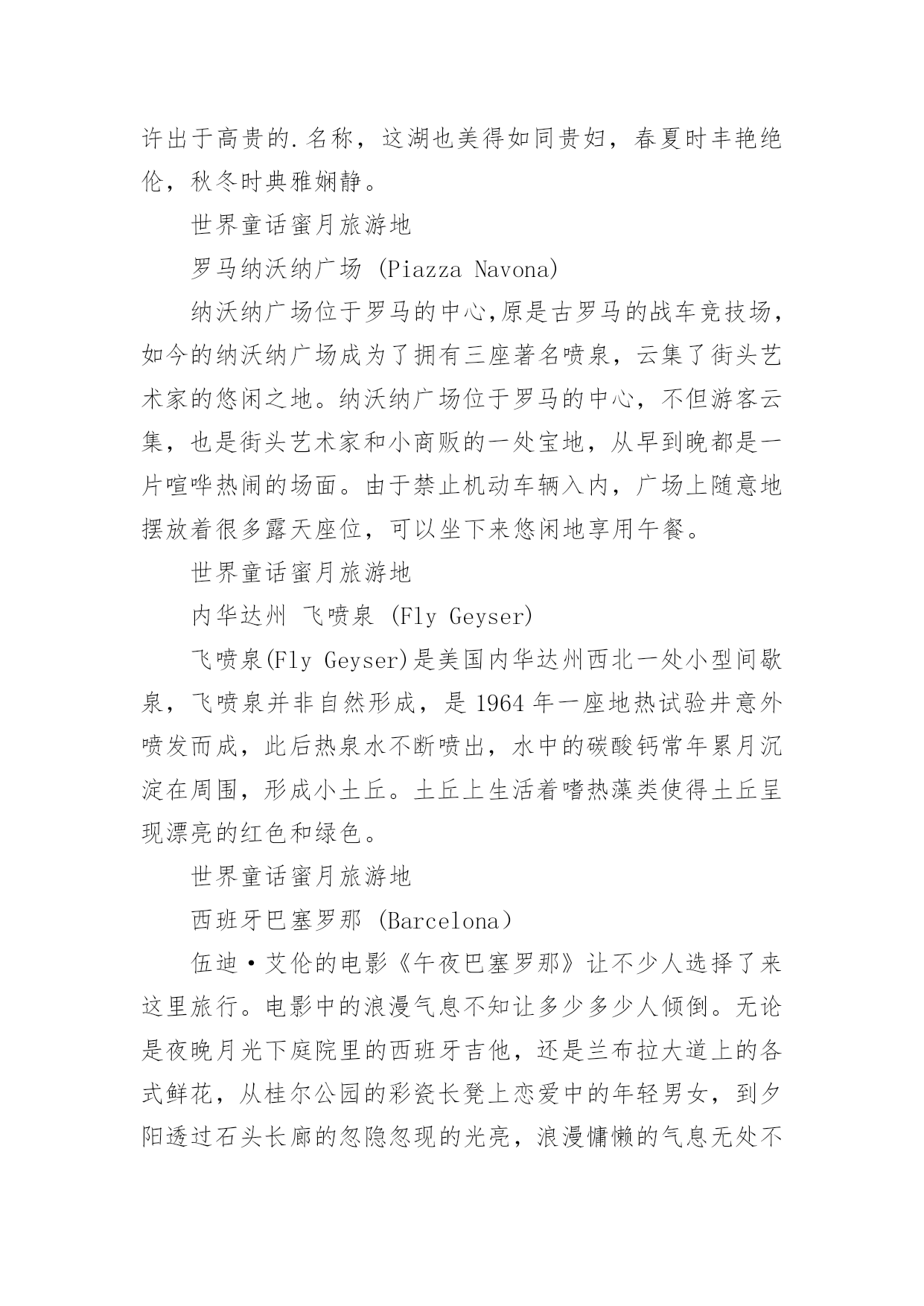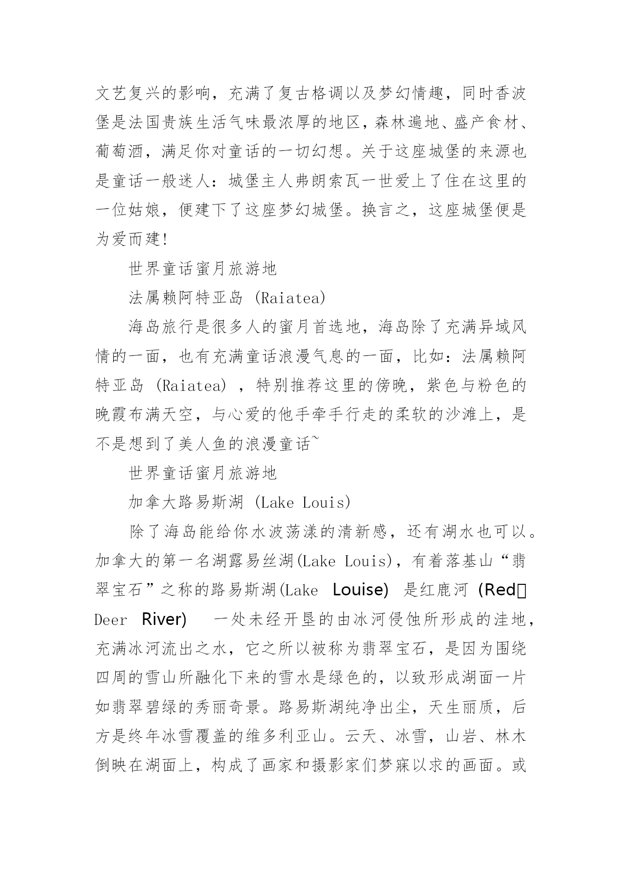 蜜月旅游好去处蜜月旅游好去处推荐结完婚你想去哪里蜜月旅游啊!还没计划好就跟着小编一起来看看这9个童话般蜜月旅游地。一定会有你喜欢的。世界童话蜜月旅游地蜜月旅行,是个甜蜜温馨的旅程。让你忘掉一切与心爱的ta一起度过此生最难忘的一段时光,如果能去童话里的世界,感受童话般的梦幻纯真,是不是也会觉得很幸福呢?下面小编挑选了九个世界上童话般的蜜月旅行,让你和他来一场童话之旅。是不是已经迫不及待了?世界童话蜜月旅游地哥伦比亚LasLajas大教堂LasLajas大教堂是一座位于哥伦比亚南部伊皮亚莱斯城的天主教教堂,是世界上唯一的山谷教堂,也是世界上十大最壮美的教堂之一。具有哥特风格的建筑掩映在绿水青山之间,瀑布环绕,好似童话仙境一般,可以和你心爱的人一起在圣母玛利亚的面前许下爱的宣言。世界童话蜜月旅游地法国卢瓦尔河谷香波堡(ChateaudeChambord,LoireValley,France)香堡的建筑风格结合了法国传统的建筑艺术和意大利文艺复兴的影响,充满了复古格调以及梦幻情趣,同时香波堡是法国贵族生活气味最浓厚的地区,森林遍地、盛产食材、葡萄酒,满足你对童话的一切幻想。关于这座城堡的来源也是童话一般迷人:城堡主人弗朗索瓦一世爱上了住在这里的一位姑娘,便建下了这座梦幻城堡。换言之,这座城堡便是为爱而建!世界童话蜜月旅游地法属赖阿特亚岛(Raiatea)海岛旅行是很多人的蜜月首选地,海岛除了充满异域风情的一面,也有充满童话浪漫气息的一面,比如:法属赖阿特亚岛(Raiatea),特别推荐这里的傍晚,紫色与粉色的晚霞布满天空,与心爱的他手牵手行走的柔软的沙滩上,是不是想到了美人鱼的浪漫童话~世界童话蜜月旅游地加拿大路易斯湖(LakeLouis)除了海岛能给你水波荡漾的清新感,还有湖水也可以。加拿大的第一名湖露易丝湖(LakeLouis),有着落基山“翡翠宝石”之称的路易斯湖(LakeLouise)是红鹿河(RedDeerRiver)一处未经开垦的由冰河侵蚀所形成的洼地,充满冰河流出之水,它之所以被称为翡翠宝石,是因为围绕四周的雪山所融化下来的雪水是绿色的,以致形成湖面一片如翡翠碧绿的秀丽奇景。路易斯湖纯净出尘,天生丽质,后方是终年冰雪覆盖的维多利亚山。云天、冰雪,山岩、林木倒映在湖面上,构成了画家和摄影家们梦寐以求的画面。或许出于高贵的.名称,这湖也美得如同贵妇,春夏时丰艳绝伦,秋冬时典雅娴静。世界童话蜜月旅游地罗马纳沃纳广场(PiazzaNavona)纳沃纳广场位于罗马的中心,原是古罗马的战车竞技场,如今的纳沃纳广场成为了拥有三座著名喷泉,云集了街头艺术家的悠闲之地。纳沃纳广场位于罗马的中心,不但游客云集,也是街头艺术家和小商贩的一处宝地,从早到晚都是一片喧哗热闹的场面。由于禁止机动车辆入内,广场上随意地摆放着很多露天座位,可以坐下来悠闲地享用午餐。世界童话蜜月旅游地内华达州飞喷泉(FlyGeyser)飞喷泉(FlyGeyser)是美国内华达州西北一处小型间歇泉,飞喷泉并非自然形成,是1964年一座地热试验井意外喷发而成,此后热泉水不断喷出,水中的碳酸钙常年累月沉淀在周围,形成小土丘。土丘上生活着嗜热藻类使得土丘呈现漂亮的红色和绿色。世界童话蜜月旅游地西班牙巴塞罗那(Barcelona)伍迪·艾伦的电影《午夜巴塞罗那》让不少人选择了来这里旅行。电影中的浪漫气息不知让多少多少人倾倒。无论是夜晚月光下庭院里的西班牙吉他,还是兰布拉大道上的各式鲜花,从桂尔公园的彩瓷长凳上恋爱中的年轻男女,到夕阳透过石头长廊的忽隐忽现的光亮,浪漫慵懒的气息无处不在。也许这里的生活才是真正意义上的享受。世界童话蜜月旅游地希腊空中之城(Meteora)Meteora在希腊文中的意思就是悬空,据说是希腊东正教徒们为了躲避土耳其士兵的杀戮而修建的修道院,Meteora在1988年被联合国Unesco列入世界文化自然遗产,是希腊最美三个地方之一。在这儿你可以感受身临仙境,超凡脱俗的人间奇观,正是这样一片与世隔绝的净土才让你有童话般纯洁曼妙感受。世界童话蜜月旅游地那不勒斯(Nàpule)那不勒斯被人们称为“阳光与快乐之城”,这里一年四季阳光普照,意大利人有句谚语“朝至那不勒斯,夕死可矣!”,是德国诗人歌德对那不勒斯的赞美。