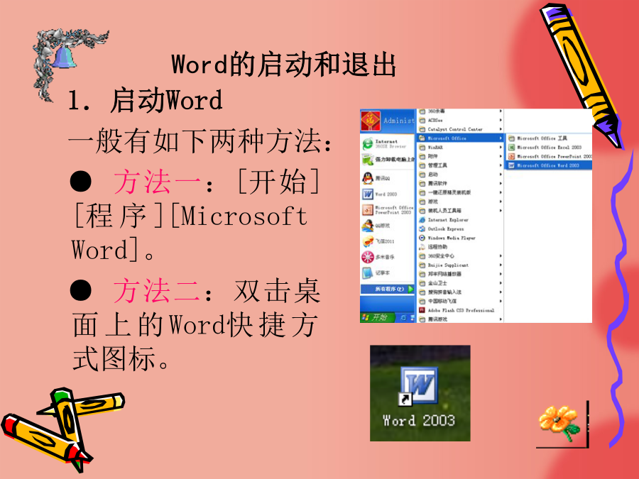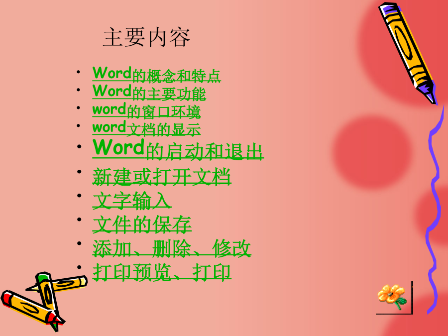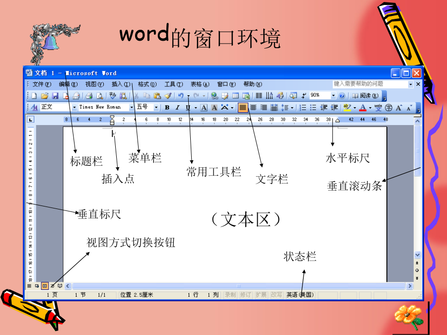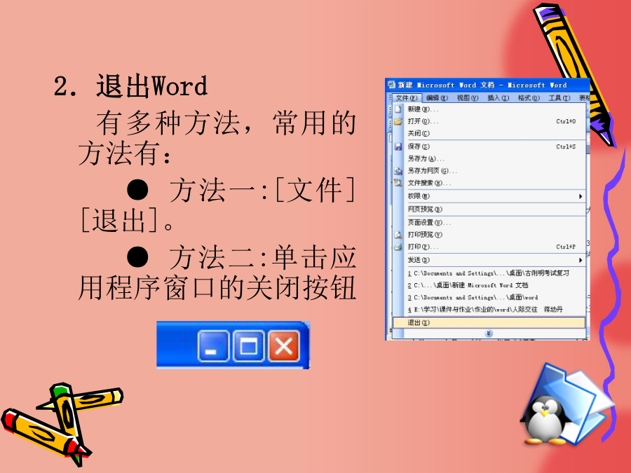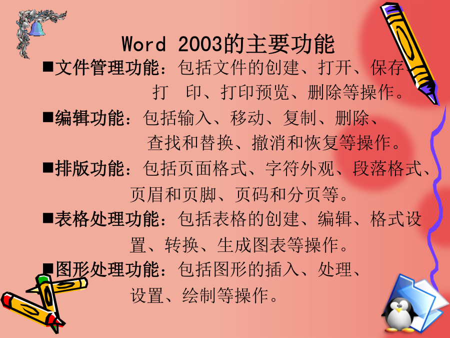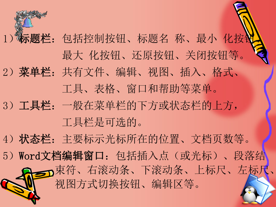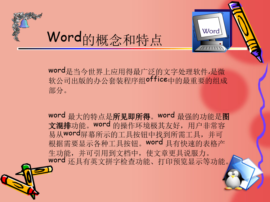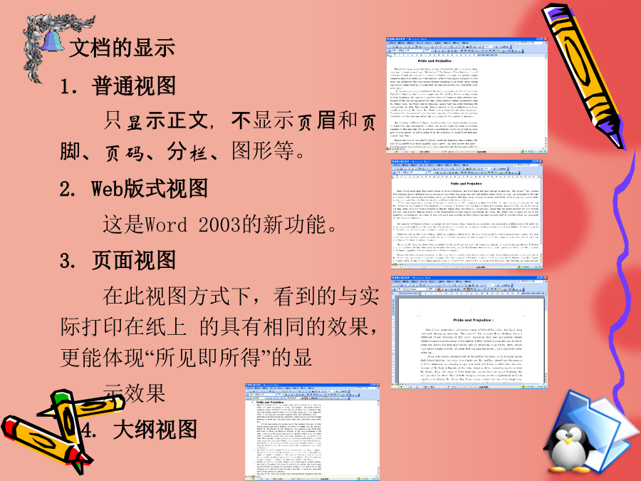 文字处理软件Word2003Word的概念和特点Word的主要功能word的窗口环境word文档的显示Word的启动和退出新建或打开文档文字输入文件的保存添加、删除、修改打印预览、打印Word2003的主要功能标题栏1)标题栏:包括控制按钮、标题名称、最小化按钮、最大化按钮、还原按钮、关闭按钮等。2)菜单栏:共有文件、编辑、视图、插入、格式、工具、表格、窗口和帮助等菜单。3)工具栏:一般在菜单栏的下方或状态栏的上方,工具栏是可选的。4)状态栏:主要标示光标所在的位置、文档页数等。5)Word文档编辑窗口:包括插入点(或光标)、段落结束符、右滚动条、下滚动条、上标尺、左标尺、视图方式切换按钮、编辑区等。文档的显示1.普通视图只显示正文,不显示页眉和页脚、页码、分栏、图形等。2.Web版式视图这是Word2003的新功能。3.页面视图在此视图方式下,看到的与实际打印在纸上的具有相同的效果,更能体现“所见即所得”的显示效果4.大纲视图1.启动Word一般有如下两种方法:●方法一:[开始][程序][MicrosoftWord]。●方法二:双击桌面上的Word快捷方式图标。2.退出Word有多种方法,常用的方法有:●方法一:[文件][退出]。●方法二:单击应用程序窗口的关闭按钮新建或打开文档打开:单击“打开”按钮,或单击“文件”菜单中的“打开”命令,——在弹出的对话框中选择文件存放的路径位置、文件名,单击“打开”按钮打开文件直接双击文件夹窗口中的word文件图标,打开word应用程序和文件输入:选择输入法:单击桌面底部任务栏上的语言指示器,选择指向相应输入法,单击(或使用快捷键“ctrl+shift”)中/英文输入法切换:同上(或使用快捷键“ctrl+空格”)中文输入:词组、特殊字、符号、标点的输入等英文输入:大写字母使用shift键或caslock键保存操作:单击保存按钮或单击“文件”菜单中的“保存”命令注意:第一次保存时会弹出对话框要求用户输入保存的位置和名称,以后保存就不会再有对话框出现如果要换名保存文件或对只读文件、复制文件进行保存,需要单击“文件”菜单中的“另存为”命令,之后会和第一次保存文件一样弹出对话框要求用户输入保存的位置和名称,另存为完成之后,以后的每次保存只需保存按钮或执行保存命令就可以了。自动保存的设置编辑操作:编辑的2种状态:插入和改写,切换通过双击状态栏上的文字“改写”进行注意插入点的位置:它决定了“笔”或“橡皮”的位置添加:确定好插入点后,在“插入”的编辑状态下输入要添加的内容删除:按一次backsace键,删除的是插入点前面的一个字符按一次delete键,删除的是插入点后面的一个字符注——大段文本的删除可以先选定再删除,或选定后使用“剪切”命令修改:在“插入”状态下删除、添加在“改写”状态下直接输入替换页面设置选择纸张大小、版式,设置页边距等。单击“文件”菜单中的“页面设置”命令或双击标尺的灰色区域弹出对话框Word的概念和特点Word的主要功能word的窗口环境文档的显示Word的启动和退出新建或打开文档文字输入文件的保存添加、删除、修改打印预览、打印课后作业谢谢!