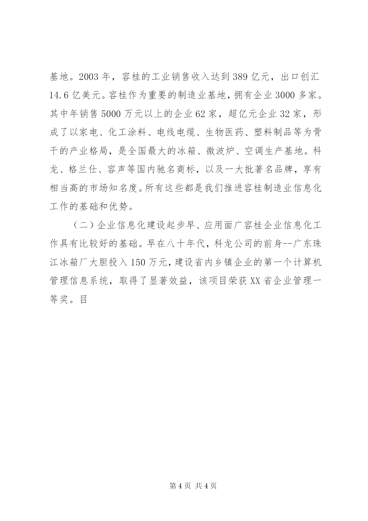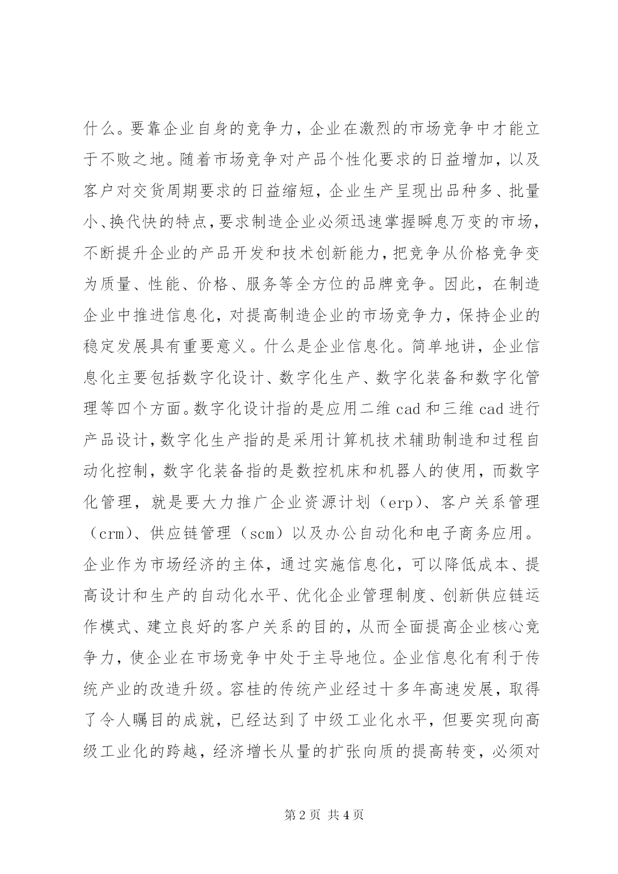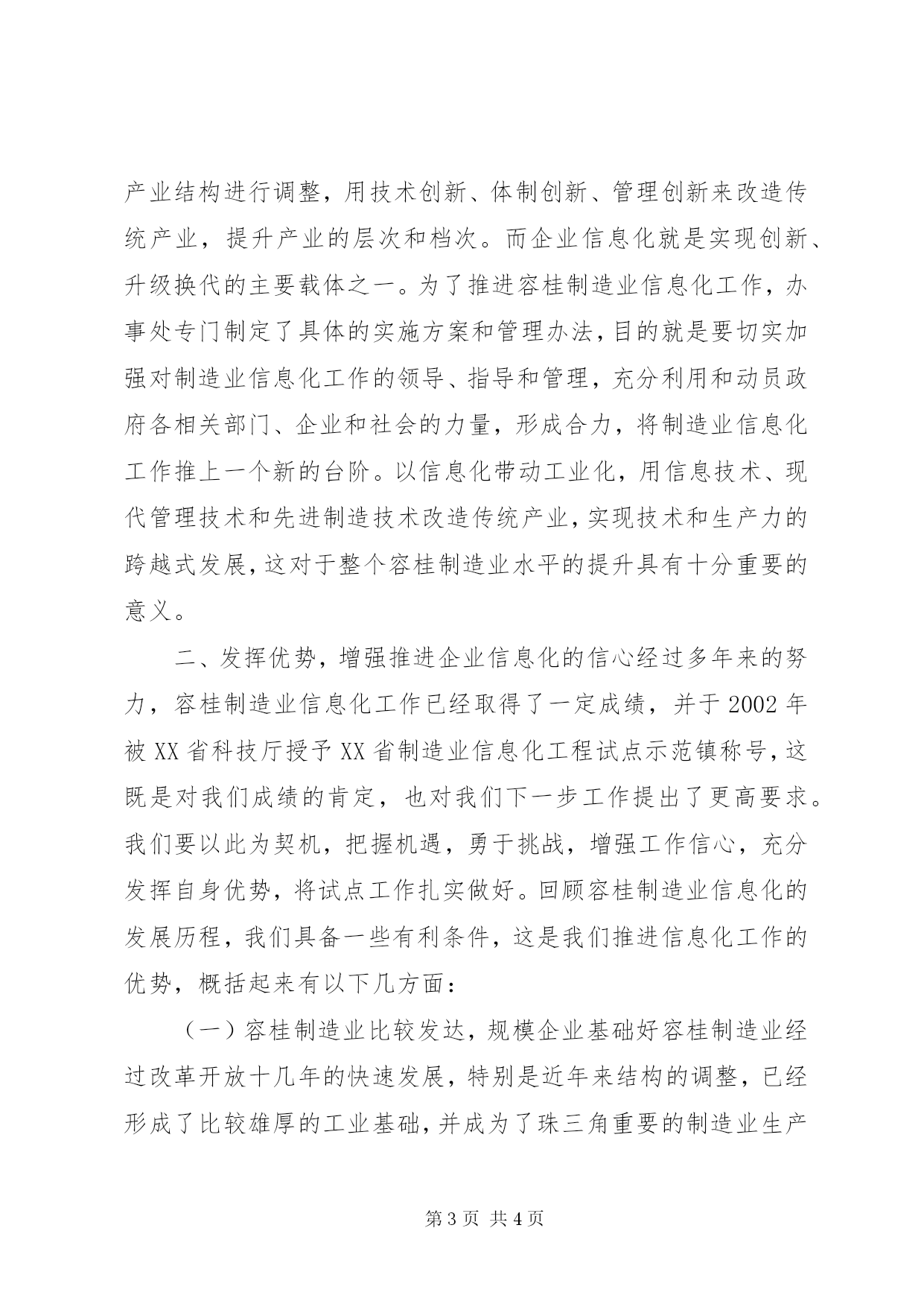 第PAGE\*Arabic\*MERGEFORMAT4页共NUMPAGES\*MERGEFORMAT4页在制造业信息化工作会议上的讲话各位领导、专家、企业代表。你们好。今天,党委、办事处在这里召开容桂制造业信息化工作会议,目的是进一步贯彻落实XX省制造业信息化工程试点示范镇工作,加快容桂制造业信息化发展进程。为了切实保证该项工作的开展,办事处专门制订了《容桂制造业信息化工作实施方案》。刚才,吴良艺同志还在会上重点宣读了办事处制订的容桂制造业信息化工程管理办法(试行)。这两份文件对容桂制造业信息化工作的具体实施步骤、方法和管理方面作了明确的规定,大家会后要认真加以学习和领会。根据会议安排,我代表街道办事处作一个发言,主要讲三方面:一、充分认识推进信息化的意义和作用人类社会已进入知识经济时代,信息技术在各个领域被广泛应用,并已成为促进社会经济持续发展的重要因素,信息化水平的高低也成为衡量一个国家综合国力的一个重要标志。温家宝总理在去年召开的国家信息化领导小组会议上指出:大力推进信息化,是我国实现工业化、现代化的必然选择,是促进生产力跨越式发展、增强综合国力和国际竞争力、维护国家安全的关键环节,是覆盖现代化建设全局的战略举措,温家宝总理的讲话充分阐明了推进信息化的重要性和必要性。中国加入wto之后,企业面临的一个根本变化就是国内市场国际化。容桂的企业要与众多的国内外企业竞争,关键靠什么。要靠企业自身的竞争力,企业在激烈的市场竞争中才能立于不败之地。随着市场竞争对产品个性化要求的日益增加,以及客户对交货周期要求的日益缩短,企业生产呈现出品种多、批量小、换代快的特点,要求制造企业必须迅速掌握瞬息万变的市场,不断提升企业的产品开发和技术创新能力,把竞争从价格竞争变为质量、性能、价格、服务等全方位的品牌竞争。因此,在制造企业中推进信息化,对提高制造企业的市场竞争力,保持企业的稳定发展具有重要意义。什么是企业信息化。简单地讲,企业信息化主要包括数字化设计、数字化生产、数字化装备和数字化管理等四个方面。数字化设计指的是应用二维cad和三维cad进行产品设计,数字化生产指的是采用计算机技术辅助制造和过程自动化控制,数字化装备指的是数控机床和机器人的使用,而数字化管理,就是要大力推广企业资源计划(erp)、客户关系管理(crm)、供应链管理(scm)以及办公自动化和电子商务应用。企业作为市场经济的主体,通过实施信息化,可以降低成本、提高设计和生产的自动化水平、优化企业管理制度、创新供应链运作模式、建立良好的客户关系的目的,从而全面提高企业核心竞争力,使企业在市场竞争中处于主导地位。企业信息化有利于传统产业的改造升级。容桂的传统产业经过十多年高速发展,取得了令人瞩目的成就,已经达到了中级工业化水平,但要实现向高级工业化的跨越,经济增长从量的扩张向质的提高转变,必须对产业结构进行调整,用技术创新、体制创新、管理创新来改造传统产业,提升产业的层次和档次。而企业信息化就是实现创新、升级换代的主要载体之一。为了推进容桂制造业信息化工作,办事处专门制定了具体的实施方案和管理办法,目的就是要切实加强对制造业信息化工作的领导、指导和管理,充分利用和动员政府各相关部门、企业和社会的力量,形成合力,将制造业信息化工作推上一个新的台阶。以信息化带动工业化,用信息技术、现代管理技术和先进制造技术改造传统产业,实现技术和生产力的跨越式发展,这对于整个容桂制造业水平的提升具有十分重要的意义。二、发挥优势,增强推进企业信息化的信心经过多年来的努力,容桂制造业信息化工作已经取得了一定成绩,并于2002年被XX省科技厅授予XX省制造业信息化工程试点示范镇称号,这既是对我们成绩的肯定,也对我们下一步工作提出了更高要求。我们要以此为契机,把握机遇,勇于挑战,增强工作信心,充分发挥自身优势,将试点工作扎实做好。回顾容桂制造业信息化的发展历程,我们具备一些有利条件,这是我们推进信息化工作的优势,概括起来有以下几方面:(一)容桂制造业比较发达,规模企业基础好容桂制造业经过改革开放十几年的快速发展,特别是近年来结构的调整,已经形成了比较雄厚的工业基础,并成为了珠三角重要的制造业生产基地。2003年,容桂的工业销售收入达到389亿元,出口创汇14.6亿美元。容桂作为重要的制造业基地,拥有企业3000多家。其中年销售5000万元以上的企业62家,超亿元企业32家,形成了以家电、化工涂料、电线电缆、生物医药、塑料制品等为骨干的产业格局,是全国最大的冰箱、微波炉、空调生产基地。科龙、格兰仕、容声等国内驰名商标,以及一大批著名品牌,享有相当高的市场知名度。所有这些都是我们推进容桂制造业信息化工作的基础和优势。(二)企业信息化建设起步早、应用面广容桂企业信息化工作具有比较好的基础