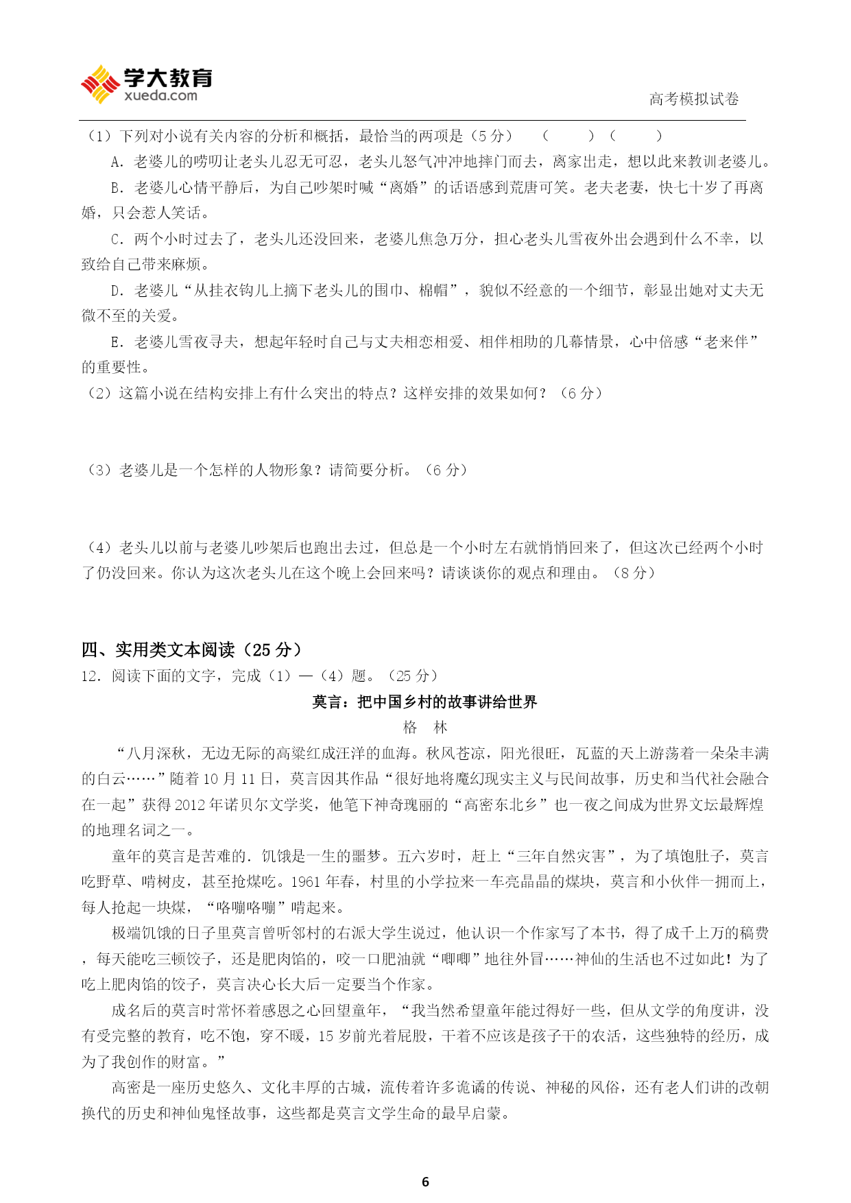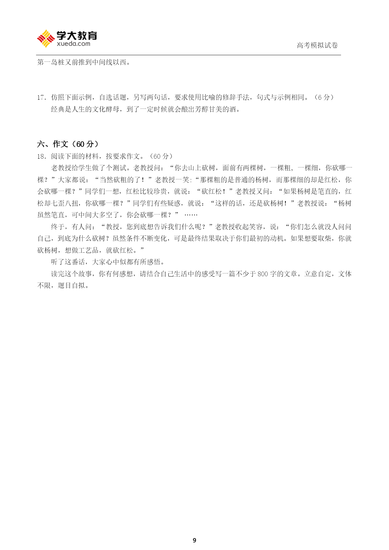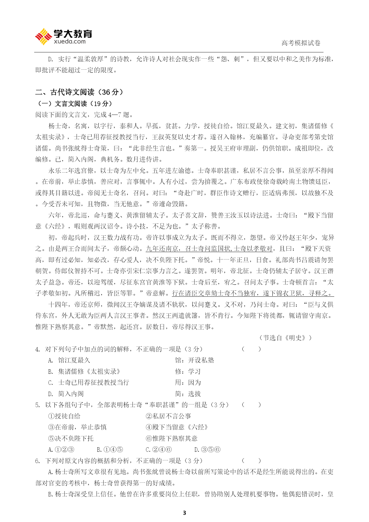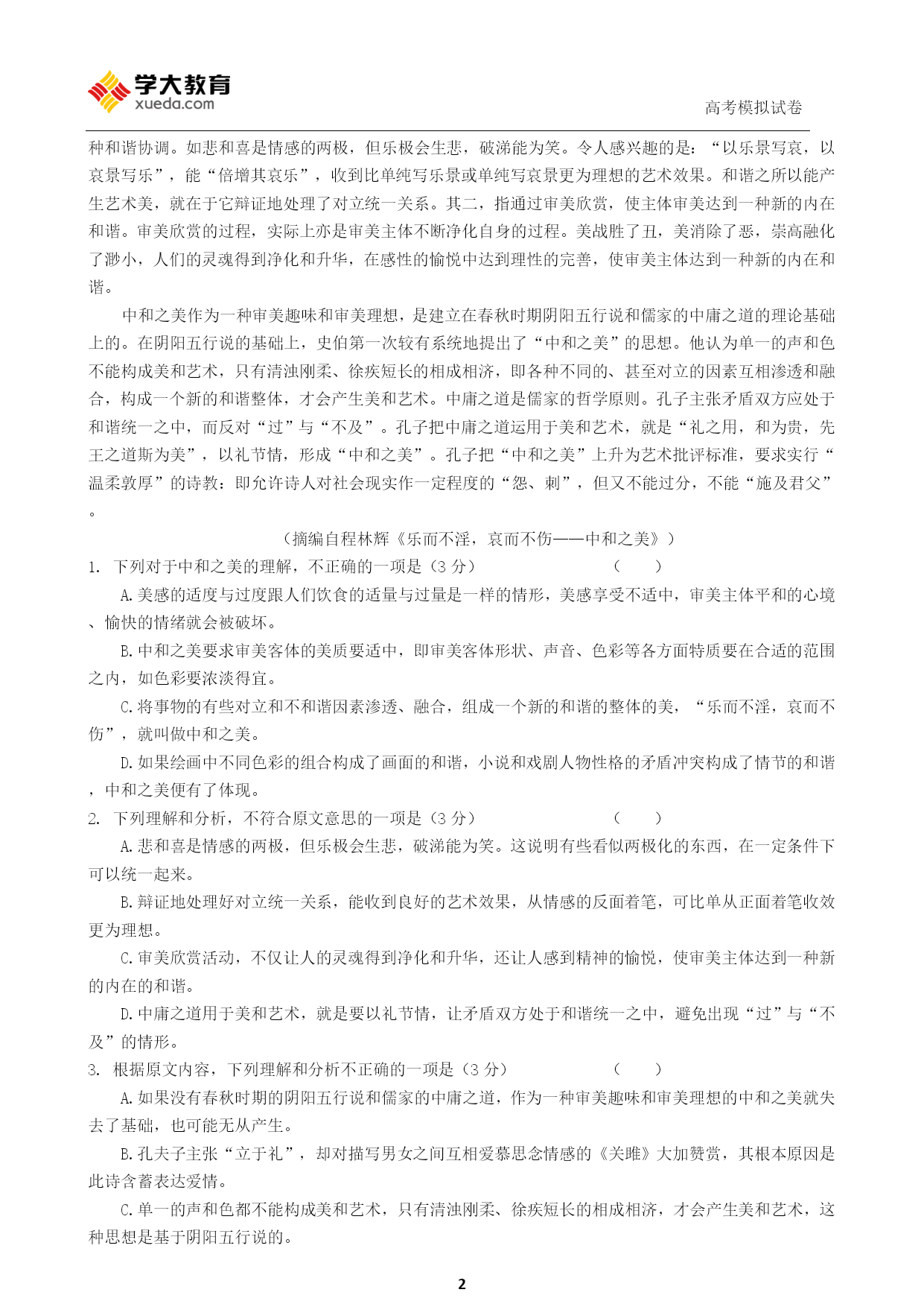 高考模拟试卷PAGE\*MERGEFORMAT92013年普通高等学校招生考试模拟试卷(新课标版一)语文命题人:银川分公司注意事项1.答题前,考生在答题卡上务必用直径0.5毫米黑色签字笔将自己的姓名、准考证号填写清楚,并帖好条形码。请认真核准条形码的准考证号、姓名和科目。2.选择题答案使用2B铅笔把答题卡上对应题目的答案标号涂黑,如需改动,用橡皮擦干净后,再选涂其他答案标号。在试题卷上作答无效。3.请按照题号在各题的答题区域(黑色线框)内作答,超出答题区域无效。4.保持卡面清洁,不折叠,不破损。5.做选考题时,考生按照题目要求作答,并用2B铅笔在答题卡上把题号涂黑。6.本试卷,150分,考试时长150分钟,考生务必将答案答在答题卡上,在试卷上作答无效,考试结束后,将本试卷和答题卡一并交回。第Ⅰ卷阅读题甲必考题一、现代文阅读(9分,每小题3分)阅读下面的文字,完成1—3题。乐而不淫,哀而不伤——中和之美程林辉《关雎》是爱情诗,描写男女之间互相爱慕思念之情,却得到主张“立于礼”的孔夫子的欣赏和赞叹,认为它“乐而不淫,哀而不伤”。为什么呢?因为《关雎》既不像《王风·采葛》中的女主人公,直率地吐露自己和情人“一日不见,如隔三秋”的深切思念和刻骨相思;又不像《郑风·风雨》中的情人,和盘托出在相会时的喜悦之情和绸缪之态。孔子所主张的“乐而不淫,哀而不伤”,实际上指的是“中和之美”。中和之美是指把事物的各种对立和不和谐的因素渗透、融合使之成为一个新的和谐的整体的那种美。中和之美的“中”包括两方面的内容:一方面就审美客体而言,美质要适中。也就是说,形状的大小、声音的高低、色彩的浓淡要适度。如色彩,过分浓艳,只会使人眼花缭乱;反之,过分简淡,则无法给人留下较深刻的印象。另一方面,就审美主体而言,美感要适度。俗话说食多无味。从饮食的适量与过量,我们可以体味到美感的适度与过度。美感享受的适中,给人带来快感:心境平和、情绪愉快过度则招致苦痛,心境由平和转入烦闷,情绪由愉快化为不快。中和之美的“和”大致也有两方面的内容:其一,指艺术美产生于艺术诸因素组成的整体结构的和谐关系之中,绘画中不同色彩的组合和浓淡的变化构成画面的和谐;小说和戏剧中人物性格的矛盾冲突构成情节的和谐。有些看似两极化,违背生活常理的东西,在一定条件下却可以统一起来,相映成趣,取得某种和谐协调。如悲和喜是情感的两极,但乐极会生悲,破涕能为笑。令人感兴趣的是:“以乐景写哀,以哀景写乐”,能“倍增其哀乐”,收到比单纯写乐景或单纯写哀景更为理想的艺术效果。和谐之所以能产生艺术美,就在于它辩证地处理了对立统一关系。其二,指通过审美欣赏,使主体审美达到一种新的内在和谐。审美欣赏的过程,实际上亦是审美主体不断净化自身的过程。美战胜了丑,美消除了恶,崇高融化了渺小,人们的灵魂得到净化和升华,在感性的愉悦中达到理性的完善,使审美主体达到一种新的内在和谐。中和之美作为一种审美趣味和审美理想,是建立在春秋时期阴阳五行说和儒家的中庸之道的理论基础上的。在阴阳五行说的基础上,史伯第一次较有系统地提出了“中和之美”的思想。他认为单一的声和色不能构成美和艺术,只有清浊刚柔、徐疾短长的相成相济,即各种不同的、甚至对立的因素互相渗透和融合,构成一个新的和谐整体,才会产生美和艺术。中庸之道是儒家的哲学原则。孔子主张矛盾双方应处于和谐统一之中,而反对“过”与“不及”。孔子把中庸之道运用于美和艺术,就是“礼之用,和为贵,先王之道斯为美”,以礼节情,形成“中和之美”。孔子把“中和之美”上升为艺术批评标准,要求实行“温柔敦厚”的诗教:即允许诗人对社会现实作一定程度的“怨、刺”,但又不能过分,不能“施及君父”。(摘编自程林辉《乐而不淫,哀而不伤——中和之美》)1.下列对于中和之美的理解,不正确的一项是(3分)()A.美感的适度与过度跟人们饮食的适量与过量是一样的情形,美感享受不适中,审美主体平和的心境、愉快的情绪就会被破坏。B.中和之美要求审美客体的美质要适中,即审美客体形状、声音、色彩等各方面特质要在合适的范围之内,如色彩要浓淡得宜。C.将事物的有些对立和不和谐因素渗透、融合,组成一个新的和谐的整体的美,“乐而不淫,哀而不伤”,就叫做中和之美。D.如果绘画中不同色彩的组合构成了画面的和谐,小说和戏剧人物性格的矛盾冲突构成了情节的和谐,中和之美便有了体现。2.下列理解和分析,不符合原文意思的一项是(3分)()A.悲和喜是情感的两极,但乐极会生悲,破涕能为笑。这说明有些看似两极化的东西,在一定条件下可以统一起来。B.辩证地处理好对立统一关系,能收到良好的艺术效果,从情感的反面着笔,可比单从正面着笔收效更为理想。C.审美欣赏活动,不仅让人的灵魂得到净化