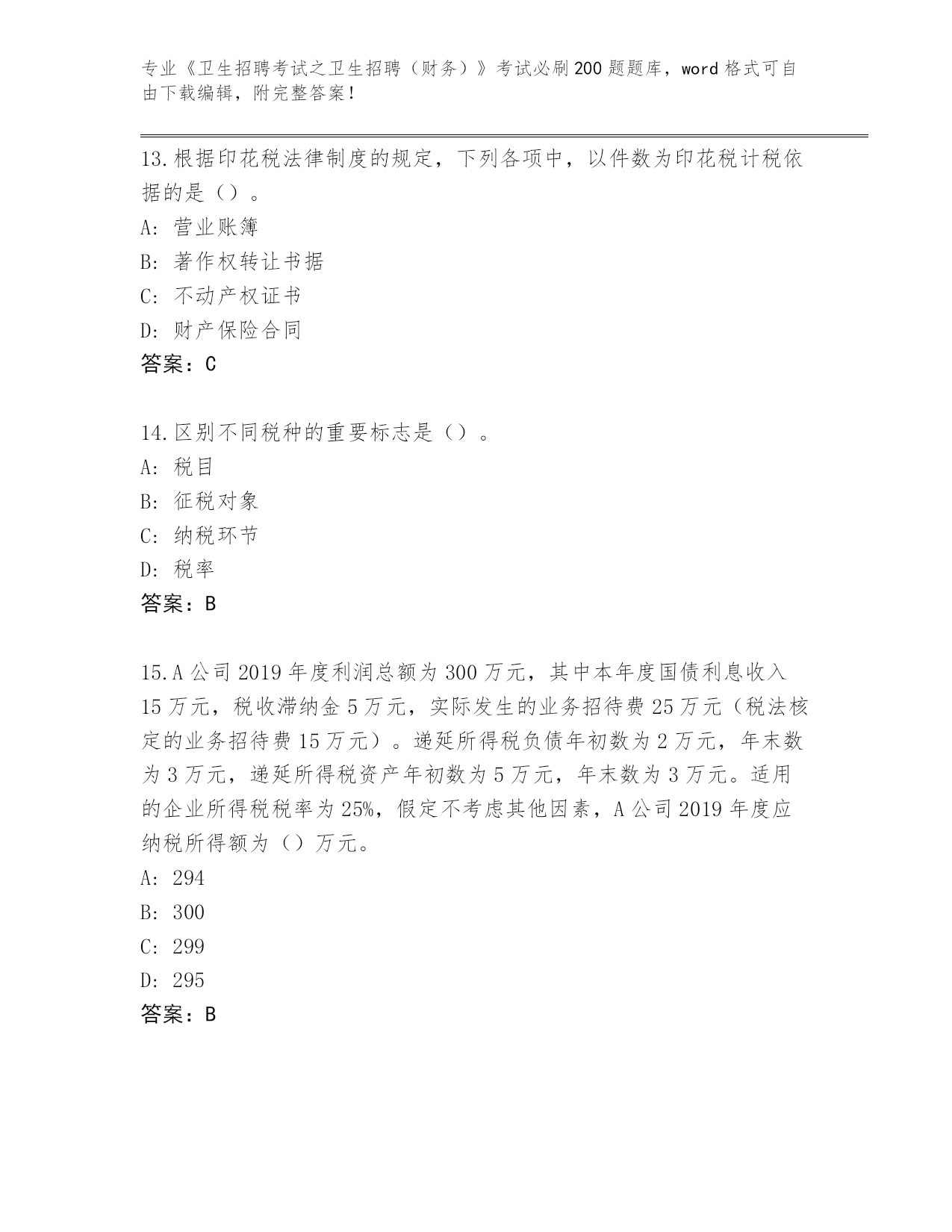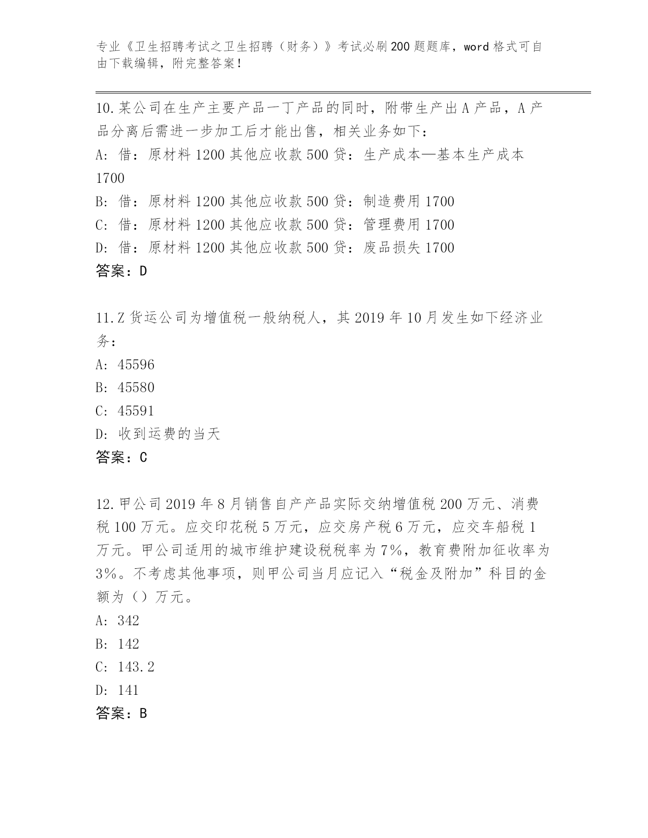 2024河北省涉县《卫生招聘考试之卫生招聘(财务)》考试必刷200题真题题库及答案【名师系列】