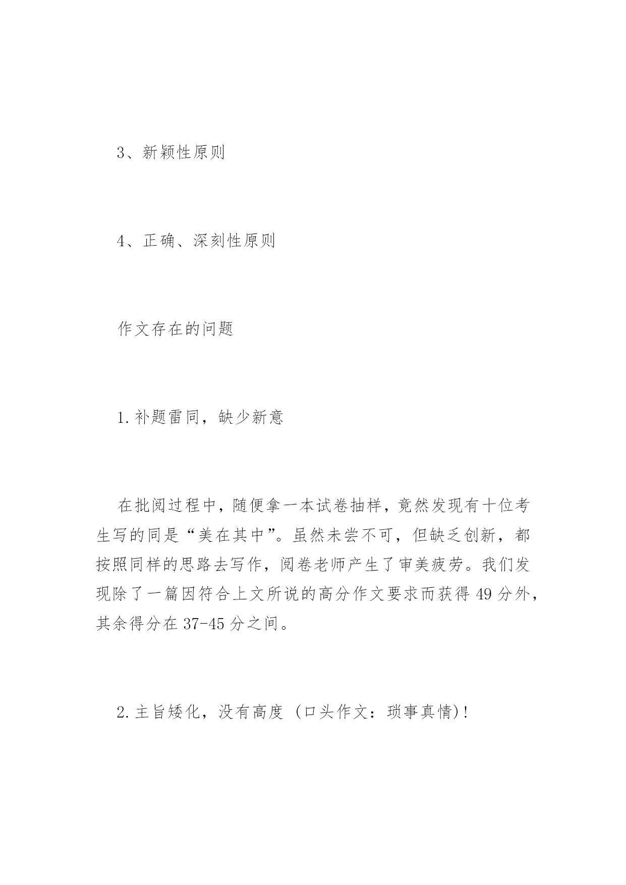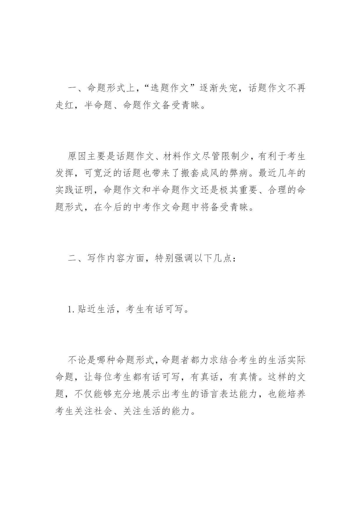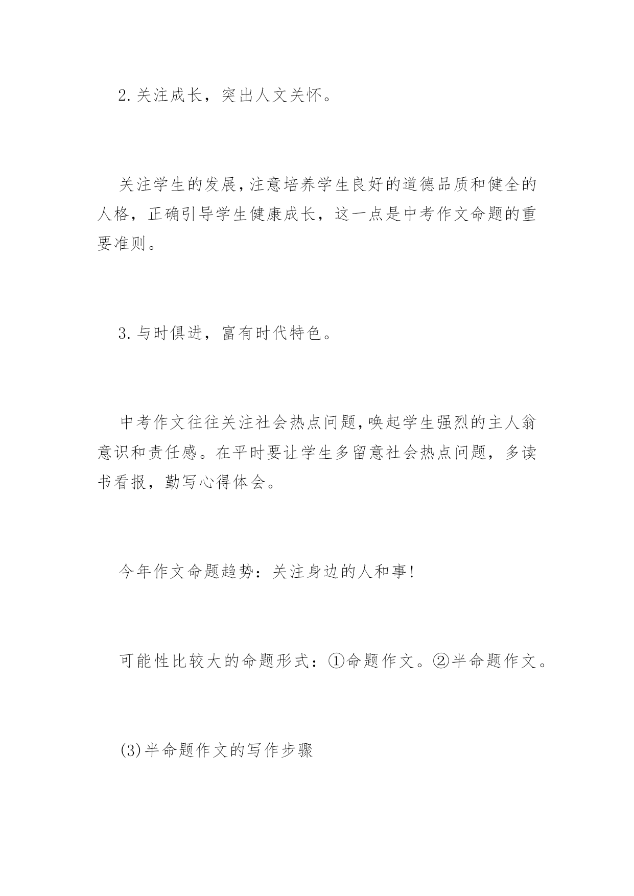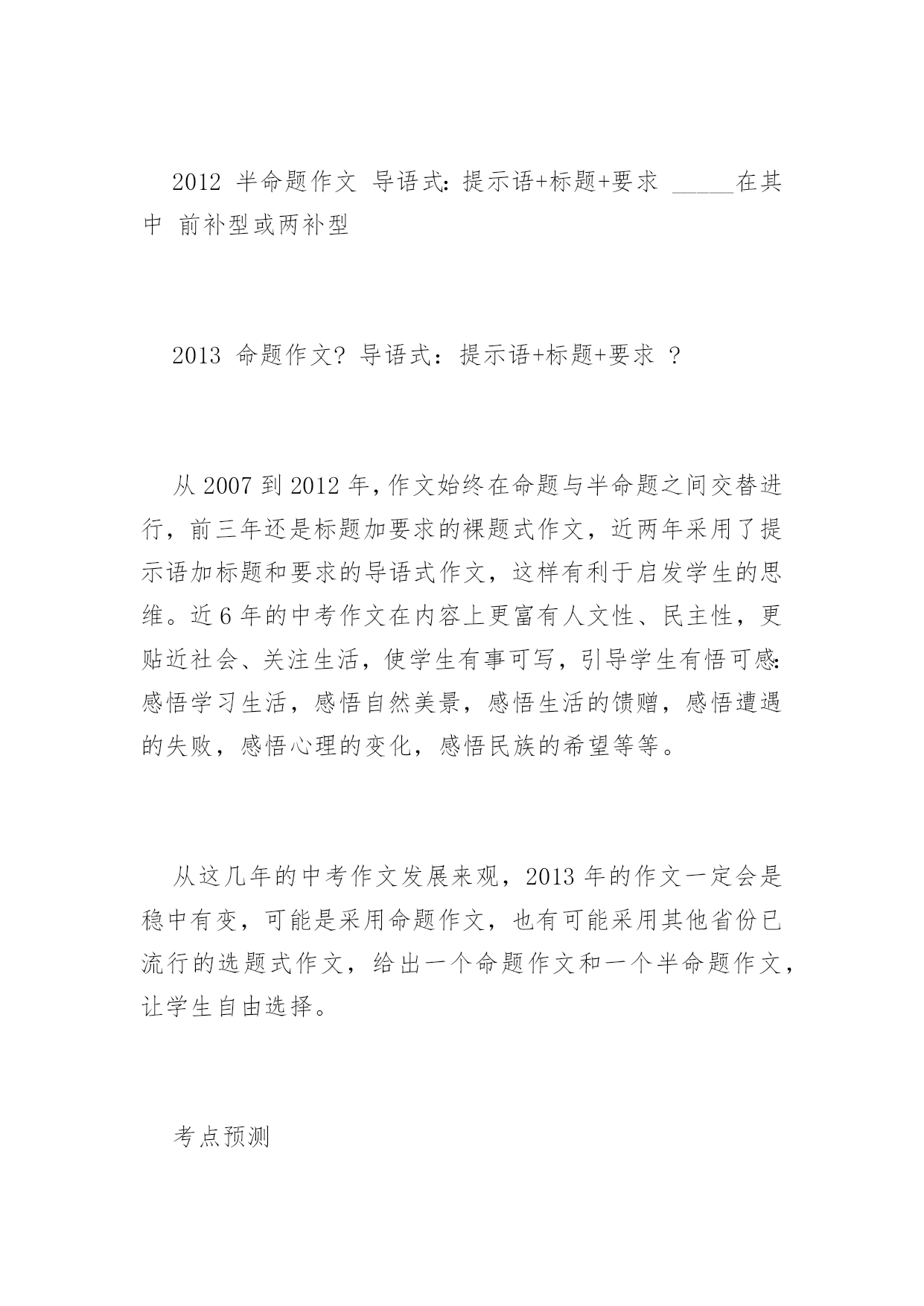 安徽中考语文作文题2013年安徽中考语文作文题年份作文类型作文形式作文题目补题形式2007命题作文裸题式:标题+要求我们的心近了2008半命题作文裸题式:标题+要求我在中得到快乐补中型2009命题作文裸题式:标题+要求师生之间2010半命题作文导语式:提示语+标题+要求不会变的是__.补后型2011命题作文导语式:提示语+标题+要求在我们这个年龄2012半命题作文导语式:提示语+标题+要求_____在其中前补型或两补型2013命题作文?导语式:提示语+标题+要求?从2007到2012年,作文始终在命题与半命题之间交替进行,前三年还是标题加要求的裸题式作文,近两年采用了提示语加标题和要求的导语式作文,这样有利于启发学生的思维。近6年的中考作文在内容上更富有人文性、民主性,更贴近社会、关注生活,使学生有事可写,引导学生有悟可感:感悟学习生活,感悟自然美景,感悟生活的馈赠,感悟遭遇的失败,感悟心理的变化,感悟民族的希望等等。从这几年的中考作文发展来观,2013年的作文一定会是稳中有变,可能是采用命题作文,也有可能采用其他省份已流行的选题式作文,给出一个命题作文和一个半命题作文,让学生自由选择。考点预测一、命题形式上,“选题作文”逐渐失宠,话题作文不再走红,半命题、命题作文备受青睐。原因主要是话题作文、材料作文尽管限制少,有利于考生发挥,可宽泛的话题也带来了搬套成风的弊病。最近几年的实践证明,命题作文和半命题作文还是极其重要、合理的命题形式,在今后的中考作文命题中将备受青睐。二、写作内容方面,特别强调以下几点:1.贴近生活,考生有话可写。不论是哪种命题形式,命题者都力求结合考生的生活实际命题,让每位考生都有话可写,有真话,有真情。这样的文题,不仅能够充分地展示出考生的语言表达能力,也能培养考生关注社会、关注生活的能力。2.关注成长,突出人文关怀。关注学生的发展,注意培养学生良好的道德品质和健全的人格,正确引导学生健康成长,这一点是中考作文命题的重要准则。3.与时俱进,富有时代特色。中考作文往往关注社会热点问题,唤起学生强烈的主人翁意识和责任感。在平时要让学生多留意社会热点问题,多读书看报,勤写心得体会。今年作文命题趋势:关注身边的人和事!可能性比较大的命题形式:①命题作文。②半命题作文。(3)半命题作文的写作步骤1、认真读题,补出恰当新颖的标题;(根据自己心中的材料,量身定制)2、对补出的全命题进行审题立意;3、围绕标题选择生动具体的材料;4、思考怎样布局谋篇;5、考虑如何遣词造句等等。(4)半命题作文补题四个原则1、熟悉性原则2、贴切性原则3、新颖性原则4、正确、深刻性原则作文存在的问题1.补题雷同,缺少新意在批阅过程中,随便拿一本试卷抽样,竟然发现有十位考生写的同是“美在其中”。虽然未尝不可,但缺乏创新,都按照同样的思路去写作,阅卷老师产生了审美疲劳。我们发现除了一篇因符合上文所说的高分作文要求而获得49分外,其余得分在37-45分之间。2.主旨矮化,没有高度(口头作文:琐事真情)!例如大多数考生很容易想到“美在其中”,什么外在的美不算美,心灵的美才是真美;“爱在其中”,突出父爱、母爱等主题这本无可厚非,只是,所述父母之事毫无新意,无非病了给治,饿了给吃,冷了给穿,雨中送伞,缺少精神的哺乳。整个阅卷下来,有高度的文章并不多。3.语言苍白,蜡味较浓有些考生写记叙文,平铺直叙,内容空洞,语言松散,苍白乏味;有些考生想写成散文,但没有散文味的语言,也抒不出真实情义。如此等等,源于语言基本功差,表达能力不强。4.卷面凌乱,书写潦草好的作文不一定就得字很漂亮,卷面整洁,但,反过来,字体俊秀,文面整洁,第一印象就不一样。不少作文书写潦草,龙飞凤舞;或者错别字满篇;或者字很小,不及四分之一作文格,我们称之为蚂蚁文,笔画看不清,挤成一个个小黑点,很难辨认,一行字得连蒙带猜的一分钟读不完,搞得满脑子的别扭。这样的庙里屈死的鬼最多——我允许你的能力不强,但我不接受你的态度不端正。5.标点符号不规范不少考生的作文里,一些句号逗号等竟然打在行首;或者双感叹号,问号感叹号连用,看了很难受,这也是硬伤,再想得高分就很难了。(6)中考作文冲刺要点提高作文分值的“六个一”一个含蓄、深刻的题目一个精彩的开头一个疏密有致的段落布局一个优美的片段描写一个完美的结尾一个清爽的文面文章本天成,妙手偶得之;——满分作文读书破万卷,下笔如有神。——高分作文
