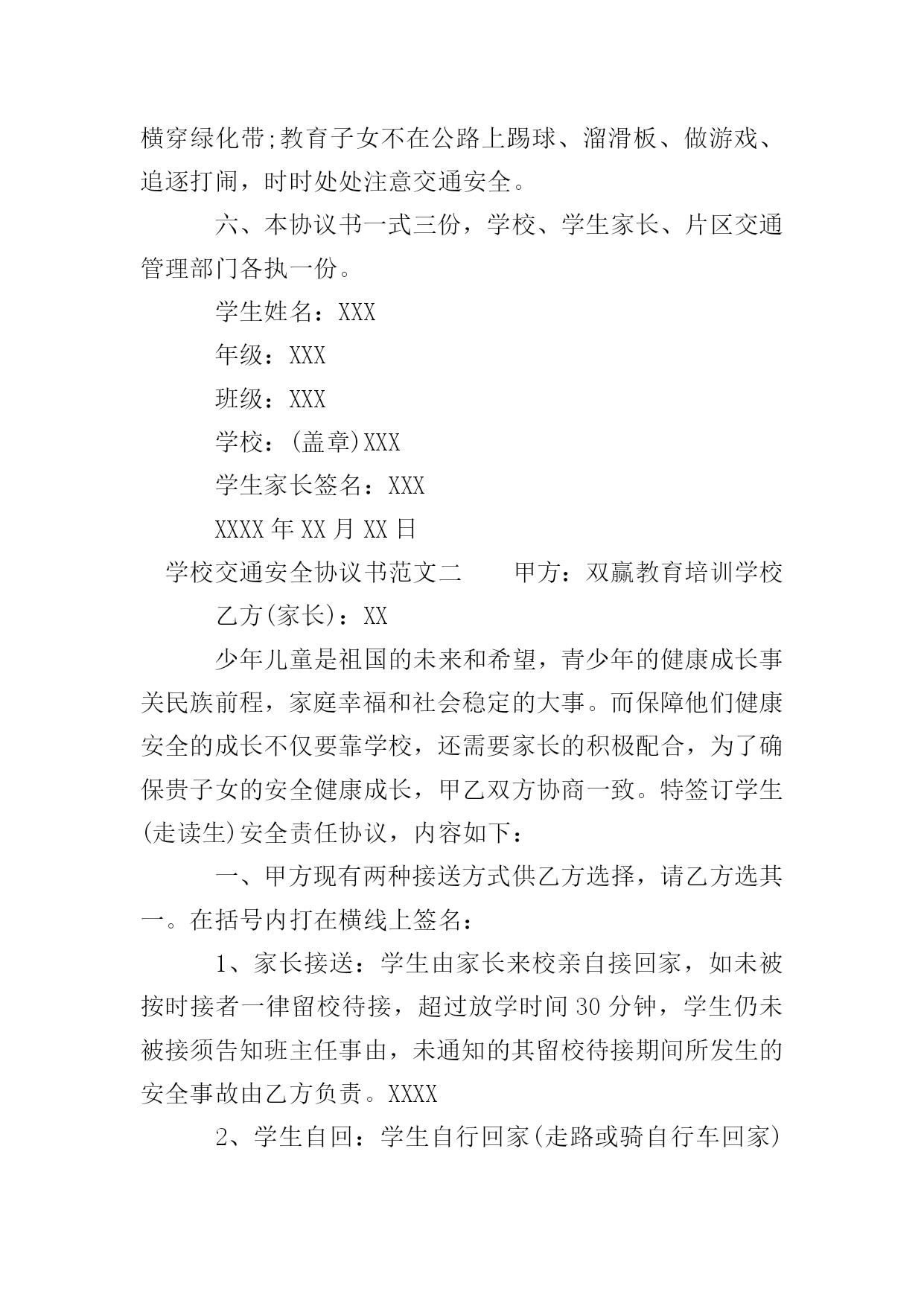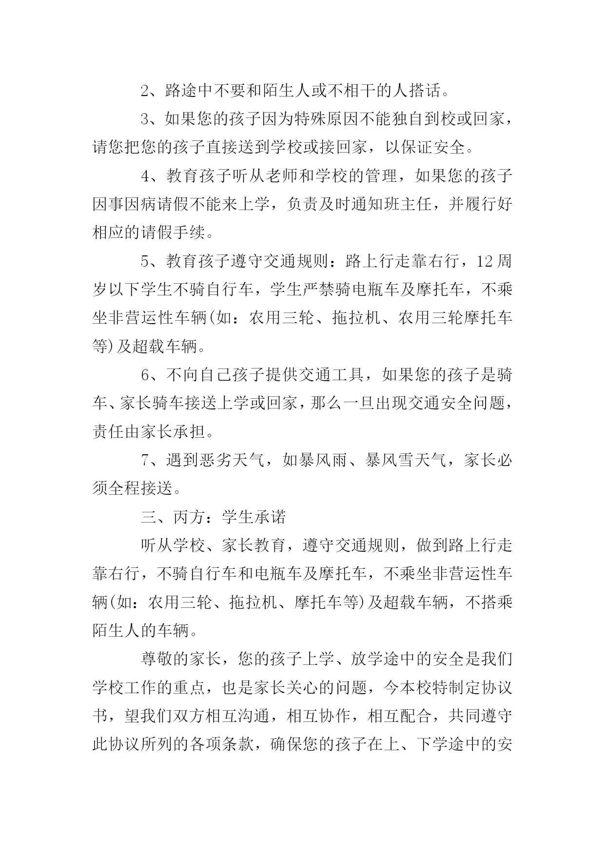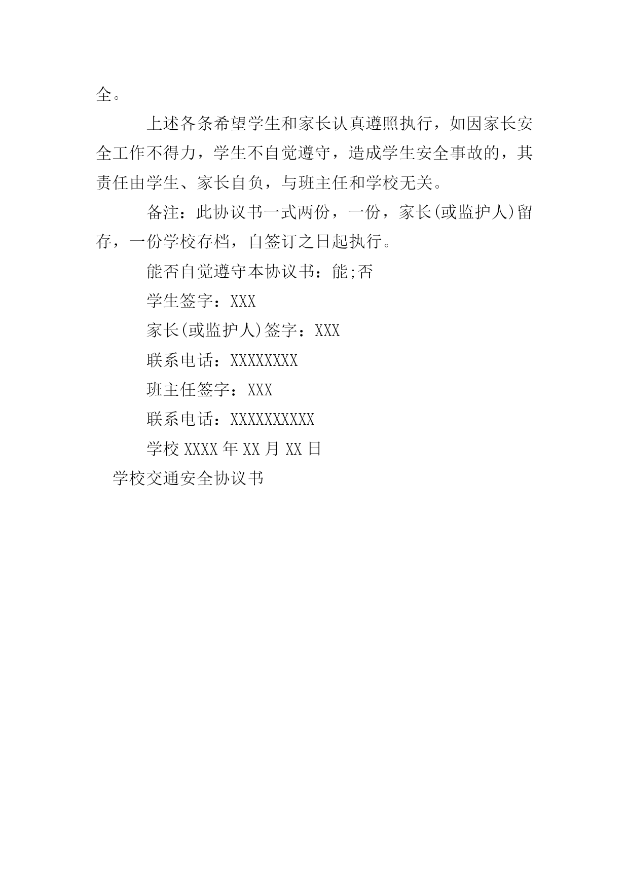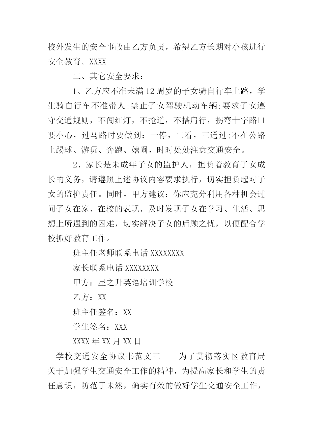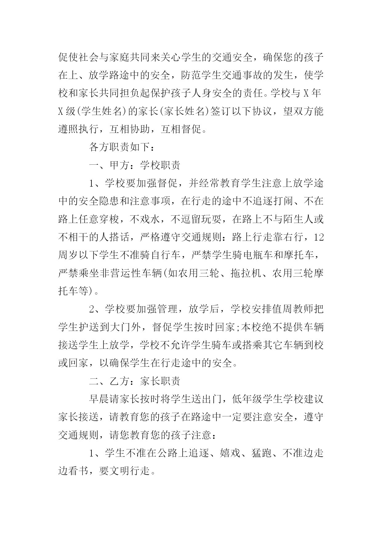 学校交通安全协议书学校交通安全协议书范文一为了加强学生道路安全工作,落实学校安全教育工作责任制,做到学校与家庭共同来关心学生的安全,促使安全教育工作管理制度化、规范化,经学校与学生家长的共同协商,特立如下协议:一、学校(幼儿园)要认真贯彻上级有关安全工作的法规、政策,加强宣传力度,做到安全警钟长鸣,常抓不懈。二、中小学生、在园幼儿(以下统称学生)系无民事行为能力或者限制民事行为能力人,为了确保学生上下学途中的安全,学校要求学生家长上下学按时接送子女,积极履行监护职责。三、学生家长要教育子女严格执行《中华人民共和国道路交通安全法》有关规定,未满12周岁的儿童,不准在道路上骑自行车、三轮车,不满16周岁的学生不准在道路上驾驶电动自行车;家长要教育子女,骑自行车不准带人,不准驾驶摩托车等机动车辆。四、学生家长严禁学生上下学乘坐无营运证、无驾照、超载及检验不合格和存在安全隐患的车辆,严禁学生乘坐驾驶员身心或技术状态不佳车辆,严禁乘坐货运车、农用车、残疾人专用车等非规定客运车辆。五、学生家长要积极配合学校,共同宣传安全知识,切实关心学生的安全,教育子女自觉遵守交通规则,各行其道,靠右行驶,不闯红灯,不违章过马路,不翻越护栏,不横穿绿化带;教育子女不在公路上踢球、溜滑板、做游戏、追逐打闹,时时处处注意交通安全。六、本协议书一式三份,学校、学生家长、片区交通管理部门各执一份。学生姓名:XXX年级:XXX班级:XXX学校:(盖章)XXX学生家长签名:XXXXXXX年XX月XX日学校交通安全协议书范文二甲方:双赢教育培训学校乙方(家长):XX少年儿童是祖国的未来和希望,青少年的健康成长事关民族前程,家庭幸福和社会稳定的大事。而保障他们健康安全的成长不仅要靠学校,还需要家长的积极配合,为了确保贵子女的安全健康成长,甲乙双方协商一致。特签订学生(走读生)安全责任协议,内容如下:一、甲方现有两种接送方式供乙方选择,请乙方选其一。在括号内打在横线上签名:1、家长接送:学生由家长来校亲自接回家,如未被按时接者一律留校待接,超过放学时间30分钟,学生仍未被接须告知班主任事由,未通知的其留校待接期间所发生的安全事故由乙方负责。XXXX2、学生自回:学生自行回家(走路或骑自行车回家)校外发生的安全事故由乙方负责,希望乙方长期对小孩进行安全教育。XXXX二、其它安全要求:1、乙方应不准未满12周岁的子女骑自行车上路,学生骑自行车不准带人;禁止子女驾驶机动车辆;要求子女遵守交通规则,不闯红灯,不抢道,不搭肩行,拐弯十字路口要小心,过马路时要做到:一停,二看,三通过;不在公路上踢球、游玩、奔跑、嬉闹,时时处处注意交通安全。2、家长是未成年子女的监护人,担负着教育子女成长的义务,请遵照上述协议内容要求执行,切实担负起对子女的监护责任。同时,甲方建议:你应充分利用各种机会过问子女在家、在校的表现,及时发现子女在学习、生活、思想上所遇到的困难,切实解决子女的后顾之忧,以便配合学校抓好教育工作。班主任老师联系电话XXXXXXXX家长联系电话XXXXXXXX甲方:星之升英语培训学校乙方:XX班主任签名:XX学生签名:XXXXXXX年XX月XX日学校交通安全协议书范文三为了贯彻落实区教育局关于加强学生交通安全工作的精神,为提高家长和学生的责任意识,防范于未然,确实有效的做好学生交通安全工作,促使社会与家庭共同来关心学生的交通安全,确保您的孩子在上、放学路途中的安全,防范学生交通事故的发生,使学校和家长共同担负起保护孩子人身安全的责任。学校与X年X级(学生姓名)的家长(家长姓名)签订以下协议,望双方能遵照执行,互相协助,互相督促。各方职责如下:一、甲方:学校职责1、学校要加强督促,并经常教育学生注意上放学途中的安全隐患和注意事项,在行走的途中不追逐打闹、不在路上任意穿梭,不戏水,不逗留玩耍,在路上不与陌生人或不相干的人搭话,严格遵守交通规则:路上行走靠右行,12周岁以下学生不准骑自行车,严禁学生骑电瓶车和摩托车,严禁乘坐非营运性车辆(如农用三轮、拖拉机、农用三轮摩托车等)。2、学校要加强管理,放学后,学校安排值周教师把学生护送到大门外,督促学生按时回家;本校绝不提供车辆接送学生上放学,学校不允许学生骑车或搭乘其它车辆到校或回家,以确保学生在行走途中的安全。二、乙方:家长职责早晨请家长按时将学生送出门,低年级学生学校建议家长接送,请教育您的孩子在路途中一定要注意安全,遵守交通规则,请您教育您的孩子注意:1、学生不准在公路上追逐、嬉戏、猛跑、不准边走边看书,要文明行走。2、路途中不要和陌生人或不相干的人搭话。3、如果您的孩子因为