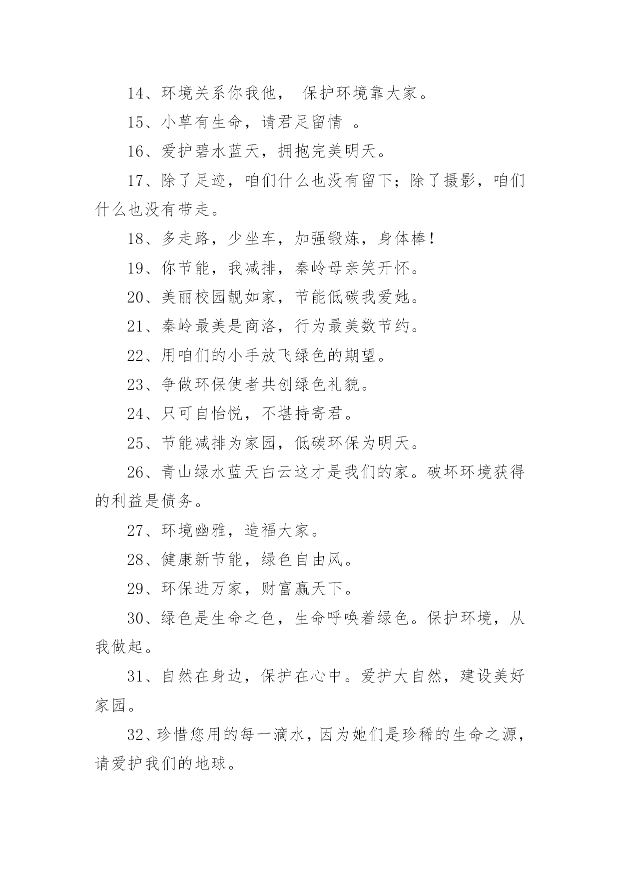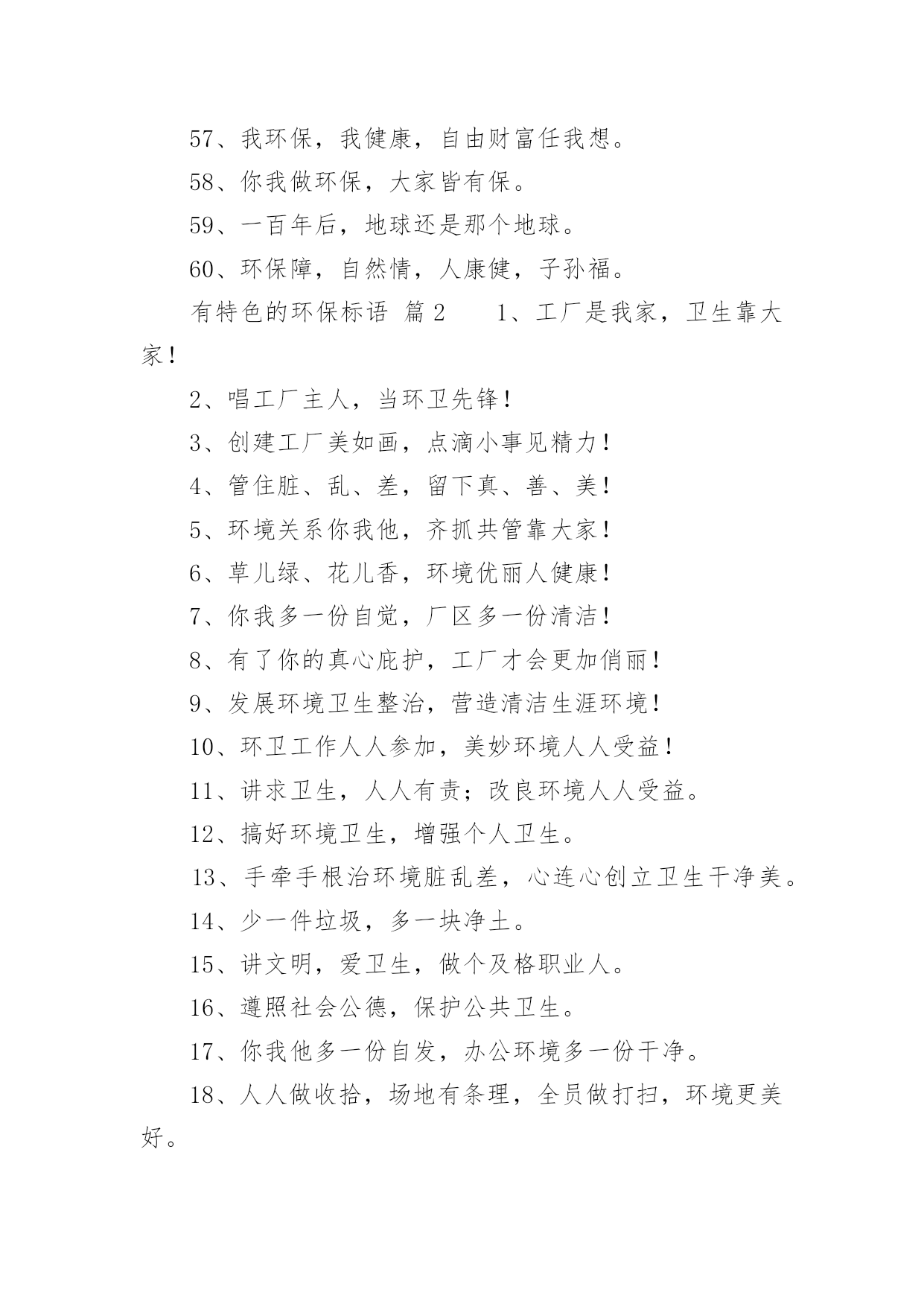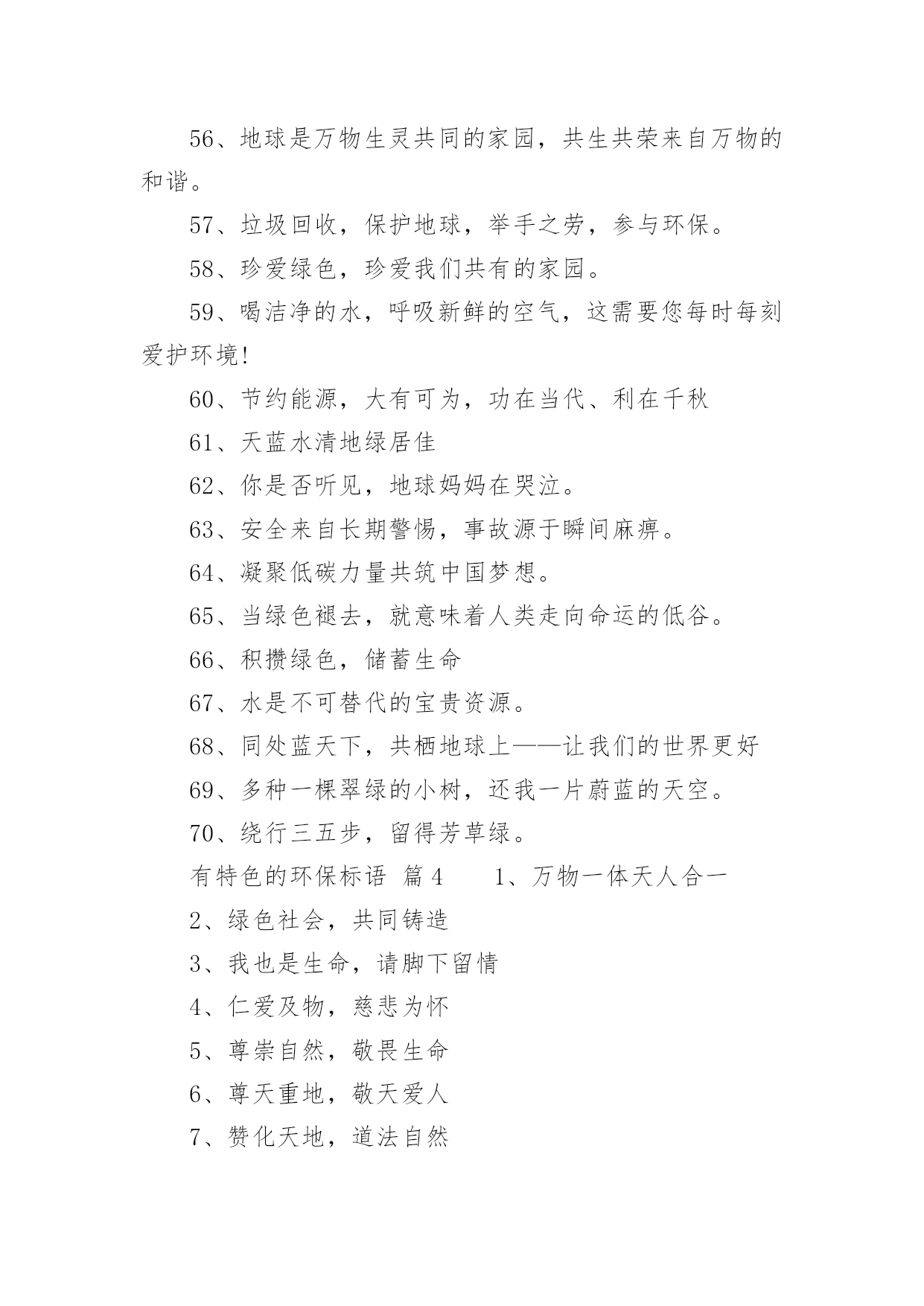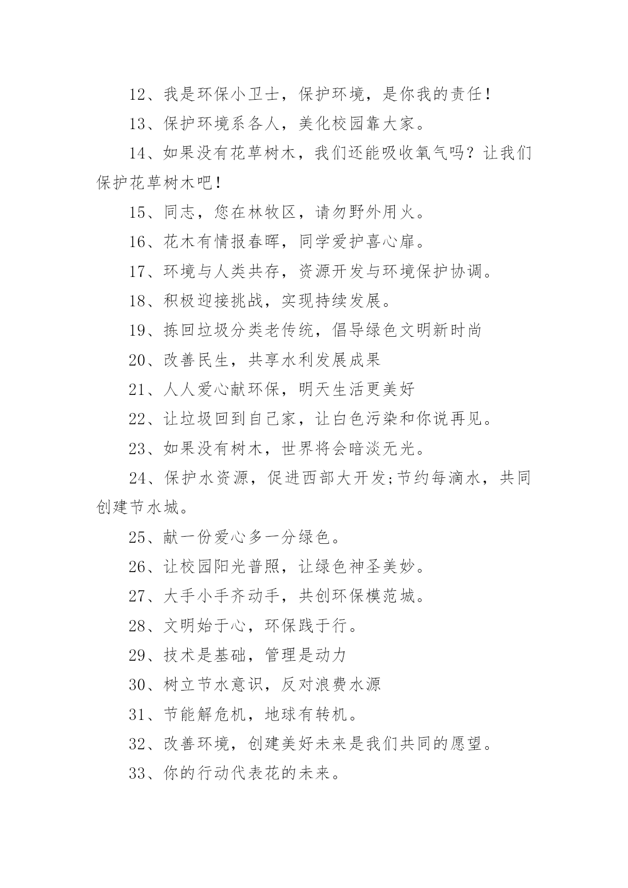 有特色的环保标语2022年有特色的环保标语汇编200句在平时的学习、工作或生活中,大家都对那些朗朗上口的标语很是熟悉吧,标语的作用是便于“造势”,形成一种氛围,也容易起到“安民告示”的作用。其实很多朋友都不太清楚什么样的标语才是好的标语,下面是小编整理的有特色的环保标语,仅供参考,欢迎大家阅读。有特色的环保标语篇11、从小树立环保意识,做绿色人生使者。2、发展绿色交通,共促节能减排。3、种一棵树,就像给校园一份礼物。4、垃圾有家我送它,保护环境你我他。5、保持环境卫生,共建美丽家园!6、塑造经典装饰,提高人居环境!7、蓝天白云,水清岸绿,保护环境,从我做起。多一份绿色,多一份健康。8、节约能源有诀窍,建筑节能很重要。9、百业要兴,环保先行。10、绿色的山,绿色的水和蓝天创造了一个更美好的`世界。11、树立企业形象,协调人与自然。12、诚信力皇,环保担当。13、地球,我的家园,环境保护取决于每一个人。14、环境关系你我他,保护环境靠大家。15、小草有生命,请君足留情。16、爱护碧水蓝天,拥抱完美明天。17、除了足迹,咱们什么也没有留下;除了摄影,咱们什么也没有带走。18、多走路,少坐车,加强锻炼,身体棒!19、你节能,我减排,秦岭母亲笑开怀。20、美丽校园靓如家,节能低碳我爱她。21、秦岭最美是商洛,行为最美数节约。22、用咱们的小手放飞绿色的期望。23、争做环保使者共创绿色礼貌。24、只可自怡悦,不堪持寄君。25、节能减排为家园,低碳环保为明天。26、青山绿水蓝天白云这才是我们的家。破坏环境获得的利益是债务。27、环境幽雅,造福大家。28、健康新节能,绿色自由风。29、环保进万家,财富赢天下。30、绿色是生命之色,生命呼唤着绿色。保护环境,从我做起。31、自然在身边,保护在心中。爱护大自然,建设美好家园。32、珍惜您用的每一滴水,因为她们是珍稀的生命之源,请爱护我们的地球。33、节能降耗,企业首要。34、节能减排全方位,宜业宜居零距离。35、节能减排齐出力,企业社会同得益。36、节约能源,从我做起。37、节能减排人人出力,绿色城市家家受益。38、能源得来不易,节约共享便利。39、节能减排践于行,绿色城市始于心。40、节能降耗,人人有责。41、节能我行动,低碳新生活。42、依法节能,全民行动。43、提高环境保护意识,爱护我们共同家园。44、节约资源,从我做起。45、节能一起来,共创好未来。46、守护一片绿,增添一份美。47、保护环境,保存期望。48、清洁生产是企业的性命。49、缔造环保节能新时代,成就业内最优品牌。50、携手共行环保之路,共享绿色节能财富。51、绿色环保,健康身心,财富自由,伟业天成!52、节约用水,否则最后一滴水将是你的眼泪!53、花草也有尊严,请高抬贵脚。54、好环境,你服还是不服?——爱护环境!55、爱护环境就是传递正能量。56、节能环保是企业的生命线。57、我环保,我健康,自由财富任我想。58、你我做环保,大家皆有保。59、一百年后,地球还是那个地球。60、环保障,自然情,人康健,子孙福。有特色的环保标语篇21、工厂是我家,卫生靠大家!2、唱工厂主人,当环卫先锋!3、创建工厂美如画,点滴小事见精力!4、管住脏、乱、差,留下真、善、美!5、环境关系你我他,齐抓共管靠大家!6、草儿绿、花儿香,环境优丽人健康!7、你我多一份自觉,厂区多一份清洁!8、有了你的真心庇护,工厂才会更加俏丽!9、发展环境卫生整治,营造清洁生涯环境!10、环卫工作人人参加,美妙环境人人受益!11、讲求卫生,人人有责;改良环境人人受益。12、搞好环境卫生,增强个人卫生。13、手牵手根治环境脏乱差,心连心创立卫生干净美。14、少一件垃圾,多一块净土。15、讲文明,爱卫生,做个及格职业人。16、遵照社会公德,保护公共卫生。17、你我他多一份自发,办公环境多一份干净。18、人人做收拾,场地有条理,全员做打扫,环境更美好。19、重视卫生,保持清洁。20、环境好一点,心境爽一点。21、工厂是我家,整齐靠大家。22、坚持环境整洁,请不要乱扔乱倒。23、给本人养成个好习惯,给别人留下个好环境。24、分工配合来扫除,信任来日会更好。25、酷爱健康、热情创卫!26、抛弃陋习,崇尚文明!27、文化卫生健康你我他,协调社会幸福千万家!28、创一份洁净环境,建一片漂亮景致!29、美好生活靠咱们发明,创卫目的靠大家实现!30、清洁环境,美化厂区!有特色的'环保标语篇31、树立人人珍惜、人人节约水的良好风尚。2、爱花、爱草、爱树、爱校园。3、无证用火违规章,酿成火灾要法办。4、绿色象征生命,珍惜生命,环保第一。5、全面规划,统筹兼顾,推进水利协调发展6、小花小草传芳香,请你把路绕一绕。7、让地球变得更年轻8、树环保之风,迎美好明天。9、多乘公交车,少用私家车10