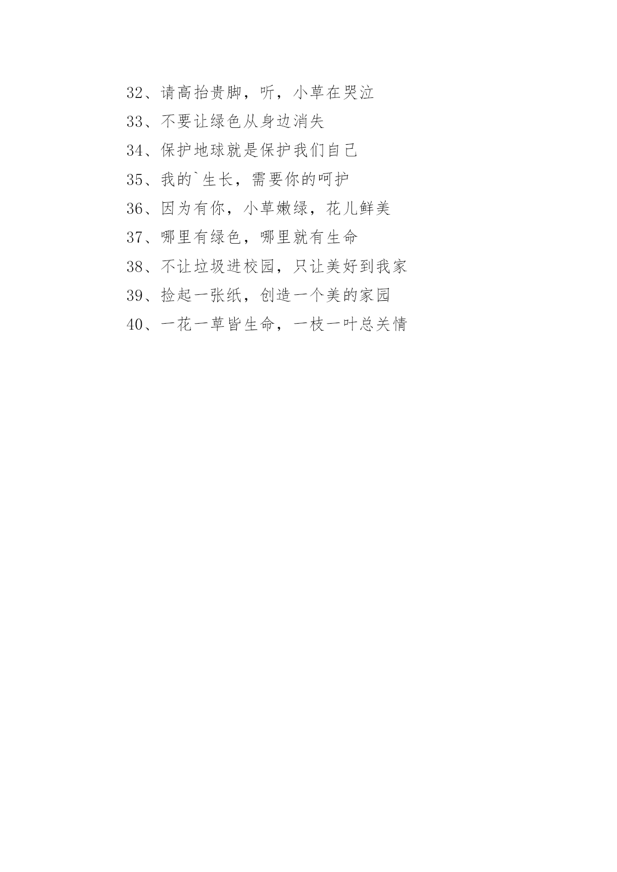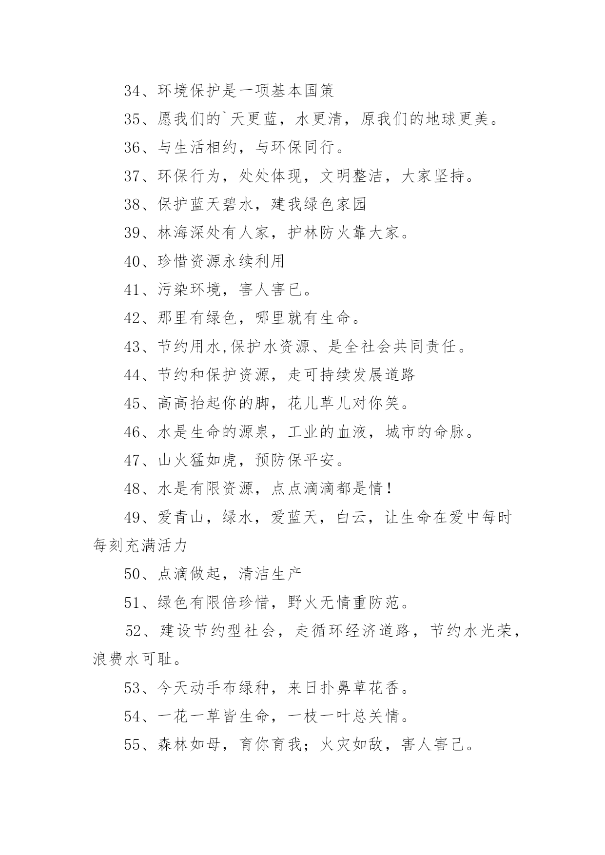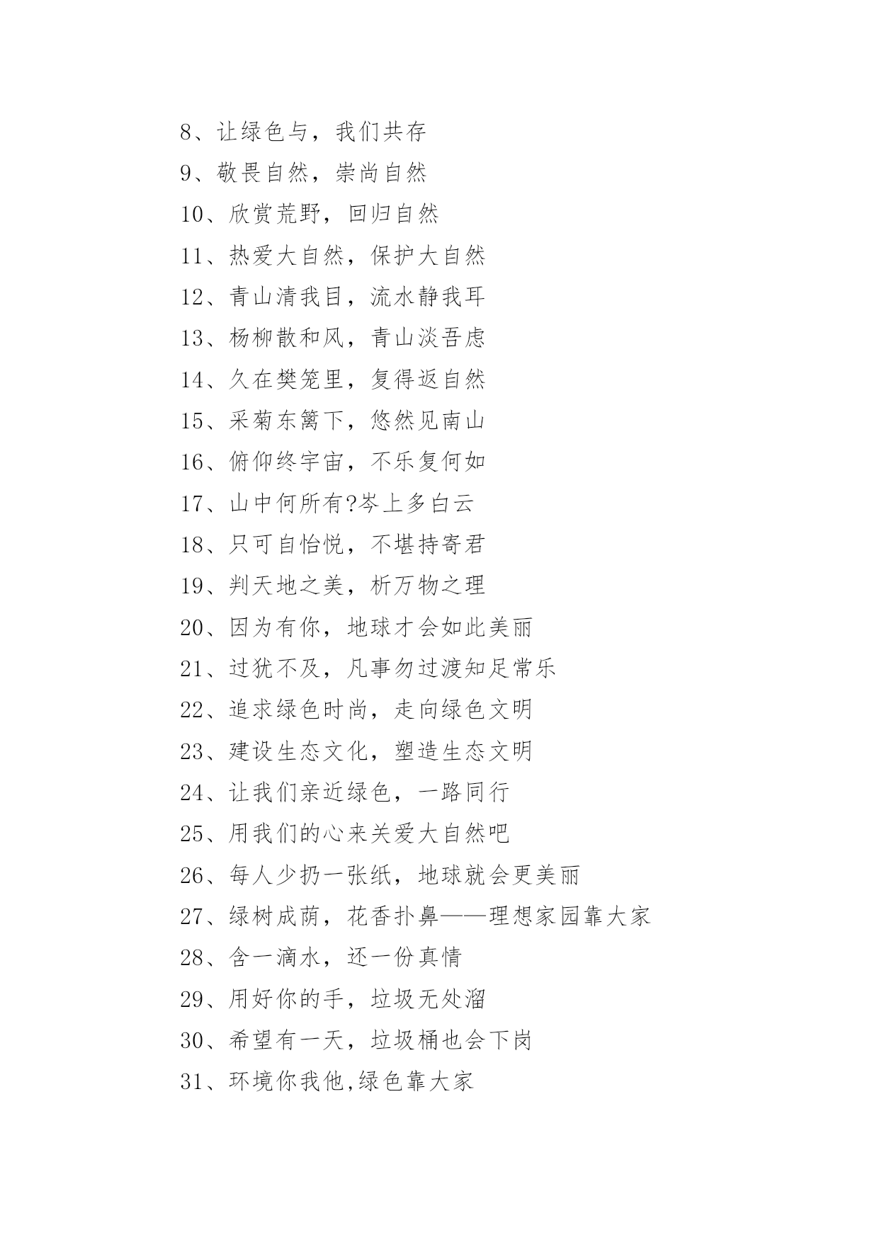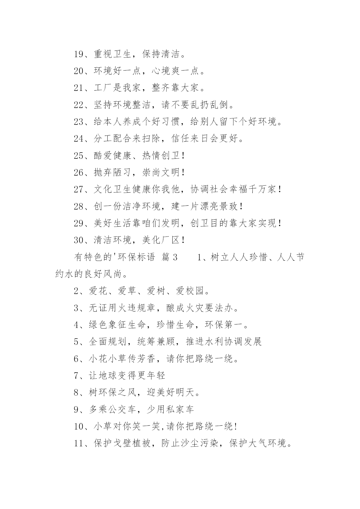 有特色的环保标语2022年有特色的环保标语汇编200句在平时的学习、工作或生活中,大家都对那些朗朗上口的标语很是熟悉吧,标语的作用是便于“造势”,形成一种氛围,也容易起到“安民告示”的作用。其实很多朋友都不太清楚什么样的标语才是好的标语,下面是小编整理的有特色的环保标语,仅供参考,欢迎大家阅读。有特色的环保标语篇11、从小树立环保意识,做绿色人生使者。2、发展绿色交通,共促节能减排。3、种一棵树,就像给校园一份礼物。4、垃圾有家我送它,保护环境你我他。5、保持环境卫生,共建美丽家园!6、塑造经典装饰,提高人居环境!7、蓝天白云,水清岸绿,保护环境,从我做起。多一份绿色,多一份健康。8、节约能源有诀窍,建筑节能很重要。9、百业要兴,环保先行。10、绿色的山,绿色的水和蓝天创造了一个更美好的`世界。11、树立企业形象,协调人与自然。12、诚信力皇,环保担当。13、地球,我的家园,环境保护取决于每一个人。14、环境关系你我他,保护环境靠大家。15、小草有生命,请君足留情。16、爱护碧水蓝天,拥抱完美明天。17、除了足迹,咱们什么也没有留下;除了摄影,咱们什么也没有带走。18、多走路,少坐车,加强锻炼,身体棒!19、你节能,我减排,秦岭母亲笑开怀。20、美丽校园靓如家,节能低碳我爱她。21、秦岭最美是商洛,行为最美数节约。22、用咱们的小手放飞绿色的期望。23、争做环保使者共创绿色礼貌。24、只可自怡悦,不堪持寄君。25、节能减排为家园,低碳环保为明天。26、青山绿水蓝天白云这才是我们的家。破坏环境获得的利益是债务。27、环境幽雅,造福大家。28、健康新节能,绿色自由风。29、环保进万家,财富赢天下。30、绿色是生命之色,生命呼唤着绿色。保护环境,从我做起。31、自然在身边,保护在心中。爱护大自然,建设美好家园。32、珍惜您用的每一滴水,因为她们是珍稀的生命之源,请爱护我们的地球。33、节能降耗,企业首要。34、节能减排全方位,宜业宜居零距离。35、节能减排齐出力,企业社会同得益。36、节约能源,从我做起。37、节能减排人人出力,绿色城市家家受益。38、能源得来不易,节约共享便利。39、节能减排践于行,绿色城市始于心。40、节能降耗,人人有责。41、节能我行动,低碳新生活。42、依法节能,全民行动。43、提高环境保护意识,爱护我们共同家园。44、节约资源,从我做起。45、节能一起来,共创好未来。46、守护一片绿,增添一份美。47、保护环境,保存期望。48、清洁生产是企业的性命。49、缔造环保节能新时代,成就业内最优品牌。50、携手共行环保之路,共享绿色节能财富。51、绿色环保,健康身心,财富自由,伟业天成!52、节约用水,否则最后一滴水将是你的眼泪!53、花草也有尊严,请高抬贵脚。54、好环境,你服还是不服?——爱护环境!55、爱护环境就是传递正能量。56、节能环保是企业的生命线。57、我环保,我健康,自由财富任我想。58、你我做环保,大家皆有保。59、一百年后,地球还是那个地球。60、环保障,自然情,人康健,子孙福。有特色的环保标语篇21、工厂是我家,卫生靠大家!2、唱工厂主人,当环卫先锋!3、创建工厂美如画,点滴小事见精力!4、管住脏、乱、差,留下真、善、美!5、环境关系你我他,齐抓共管靠大家!6、草儿绿、花儿香,环境优丽人健康!7、你我多一份自觉,厂区多一份清洁!8、有了你的真心庇护,工厂才会更加俏丽!9、发展环境卫生整治,营造清洁生涯环境!10、环卫工作人人参加,美妙环境人人受益!11、讲求卫生,人人有责;改良环境人人受益。12、搞好环境卫生,增强个人卫生。13、手牵手根治环境脏乱差,心连心创立卫生干净美。14、少一件垃圾,多一块净土。15、讲文明,爱卫生,做个及格职业人。16、遵照社会公德,保护公共卫生。17、你我他多一份自发,办公环境多一份干净。18、人人做收拾,场地有条理,全员做打扫,环境更美好。19、重视卫生,保持清洁。20、环境好一点,心境爽一点。21、工厂是我家,整齐靠大家。22、坚持环境整洁,请不要乱扔乱倒。23、给本人养成个好习惯,给别人留下个好环境。24、分工配合来扫除,信任来日会更好。25、酷爱健康、热情创卫!26、抛弃陋习,崇尚文明!27、文化卫生健康你我他,协调社会幸福千万家!28、创一份洁净环境,建一片漂亮景致!29、美好生活靠咱们发明,创卫目的靠大家实现!30、清洁环境,美化厂区!有特色的'环保标语篇31、树立人人珍惜、人人节约水的良好风尚。2、爱花、爱草、爱树、爱校园。3、无证用火违规章,酿成火灾要法办。4、绿色象征生命,珍惜生命,环保第一。5、全面规划,统筹兼顾,推进水利协调发展6、小花小草传芳香,请你把路绕一绕。7、让地球变得更年轻8、树环保之风,迎美好明天。9、多乘公交车,少用私家车10