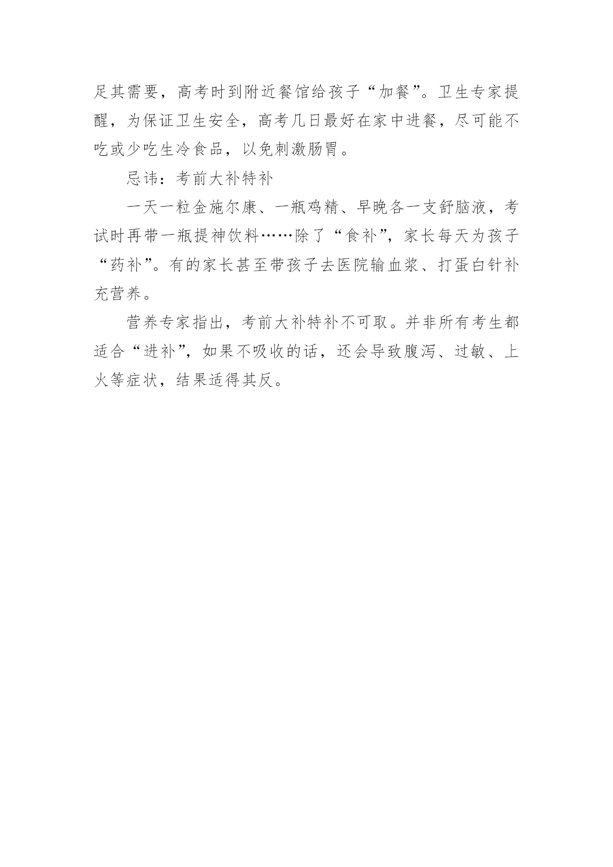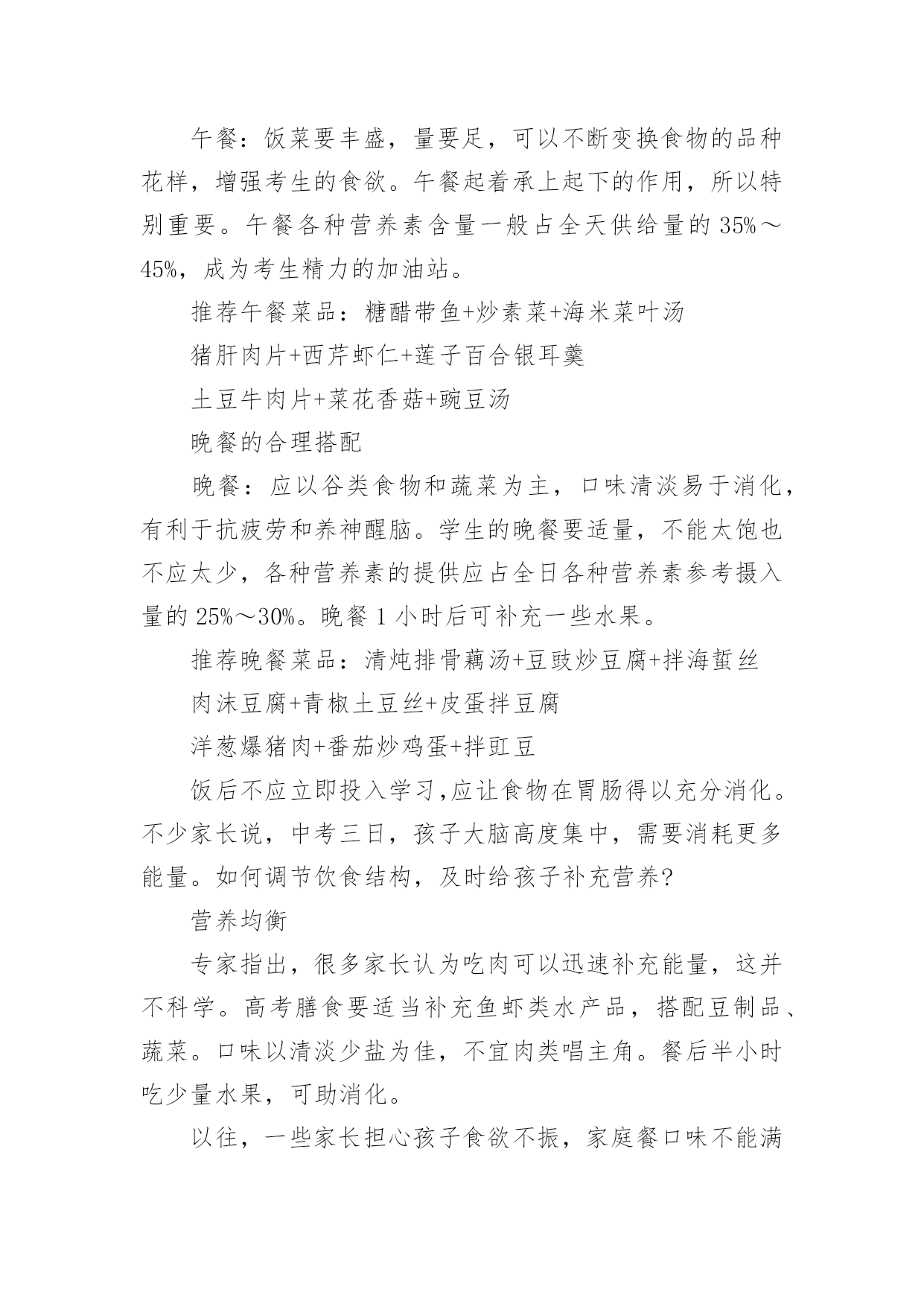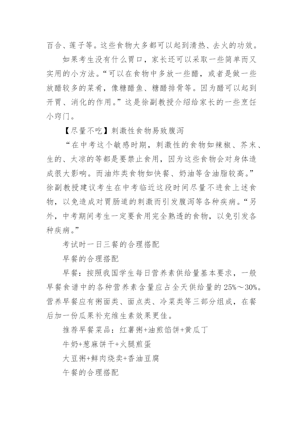 家长必读的中考饮食攻略指南家长必读的中考饮食攻略指南【误区一】考试期间,许多家长都希望能给考生多补充一些营养。针对此类问题,家长和考生都应该保持一颗平常心,已经形成的饮食习惯是考试期间最好的“饮食钟”。在中考前期,应以平衡膳食为基础,配以多种丰富的食物。如果轻易改变了固有的饮食习惯,考生则要花费大量的时间重新去适应,所以不应该因为“特殊时期”特殊对待,从而打破原有的习惯。【误区二】:多食用硬果类食物由于硬果类食物可以起到健脑的作用,所以一些家长极力让考生多食用。“有许多家长不清楚像核桃、榛子、花生、芝麻等都是属于含油脂较高的食物,吃多了不但不容易吸收,反而会引起上火。另外,对韭菜、芹菜等含纤维较多的食物,考生应该根据自身消化道的情况而适量食用。因为含纤维较高的食物会促进肠蠕动,如果食用不当则会引起腹泻。”徐副教授建议考生,在进食此类食物的时候,一定要适量。再者如果考生的体质较弱,也可以根据自身的情况选择一些保健品,但是一定要到正规的销售地点去购买。【多吃什么】加醋食物能开胃在这个关键时期,许多考生都存在烦躁、易怒、食欲不振等问题。徐副教授说,如果考生出现此类现象,家长应该多选择一些清淡的食物,如:西瓜、黄瓜、苦瓜、绿豆汤、百合、莲子等。这些食物大多都可以起到清热、去火的功效。如果考生没有什么胃口,家长还可以采取一些简单而又实用的小方法。“可以在食物中多放一些醋,或者是做一些放醋较多的菜肴,像糖醋鱼、糖醋排骨等。因为醋可以起到开胃、消化的作用。”这是徐副教授介绍给家长的一些烹饪小窍门。【尽量不吃】刺激性食物易致腹泻“在中考这个敏感时期,刺激性的食物如辣椒、芥末、生的、太凉的等都是要禁止食用,因为这些食物会对身体造成很大影响。而油炸类食物如快餐、奶油等含油脂较高。”徐副教授建议考生在中考临近这段时间尽量不进食上述食物,以免造成对胃肠道的刺激而引发腹泻等各种疾病。“另外,中考期间考生一定要食用完全熟透的食物,以免引发各种疾病。”考试时一日三餐的合理搭配早餐的合理搭配早餐:按照我国学生每日营养素供给量基本要求,一般早餐食谱中的各种营养素含量应占全天供给量的25%~30%。营养早餐应有粥面类、面点类、冷菜类等三部分组成,在餐后加一份瓜果补充维生素效果更佳。推荐早餐菜品:红薯粥+油煎馅饼+黄瓜丁牛奶+葱麻饼干+火腿煎蛋大豆粥+鲜肉烧卖+香油豆腐午餐的合理搭配午餐:饭菜要丰盛,量要足,可以不断变换食物的品种花样,增强考生的食欲。午餐起着承上起下的作用,所以特别重要。午餐各种营养素含量一般占全天供给量的35%~45%,成为考生精力的加油站。推荐午餐菜品:糖醋带鱼+炒素菜+海米菜叶汤猪肝肉片+西芹虾仁+莲子百合银耳羹土豆牛肉片+菜花香菇+豌豆汤晚餐的合理搭配晚餐:应以谷类食物和蔬菜为主,口味清淡易于消化,有利于抗疲劳和养神醒脑。学生的晚餐要适量,不能太饱也不应太少,各种营养素的提供应占全日各种营养素参考摄入量的25%~30%。晚餐1小时后可补充一些水果。推荐晚餐菜品:清炖排骨藕汤+豆豉炒豆腐+拌海蜇丝肉沫豆腐+青椒土豆丝+皮蛋拌豆腐洋葱爆猪肉+番茄炒鸡蛋+拌豇豆饭后不应立即投入学习,应让食物在胃肠得以充分消化。不少家长说,中考三日,孩子大脑高度集中,需要消耗更多能量。如何调节饮食结构,及时给孩子补充营养?营养均衡专家指出,很多家长认为吃肉可以迅速补充能量,这并不科学。高考膳食要适当补充鱼虾类水产品,搭配豆制品、蔬菜。口味以清淡少盐为佳,不宜肉类唱主角。餐后半小时吃少量水果,可助消化。以往,一些家长担心孩子食欲不振,家庭餐口味不能满足其需要,高考时到附近餐馆给孩子“加餐”。卫生专家提醒,为保证卫生安全,高考几日最好在家中进餐,尽可能不吃或少吃生冷食品,以免刺激肠胃。忌讳:考前大补特补一天一粒金施尔康、一瓶鸡精、早晚各一支舒脑液,考试时再带一瓶提神饮料……除了“食补”,家长每天为孩子“药补”。有的家长甚至带孩子去医院输血浆、打蛋白针补充营养。营养专家指出,考前大补特补不可取。并非所有考生都适合“进补”,如果不吸收的话,还会导致腹泻、过敏、上火等症状,结果适得其反。