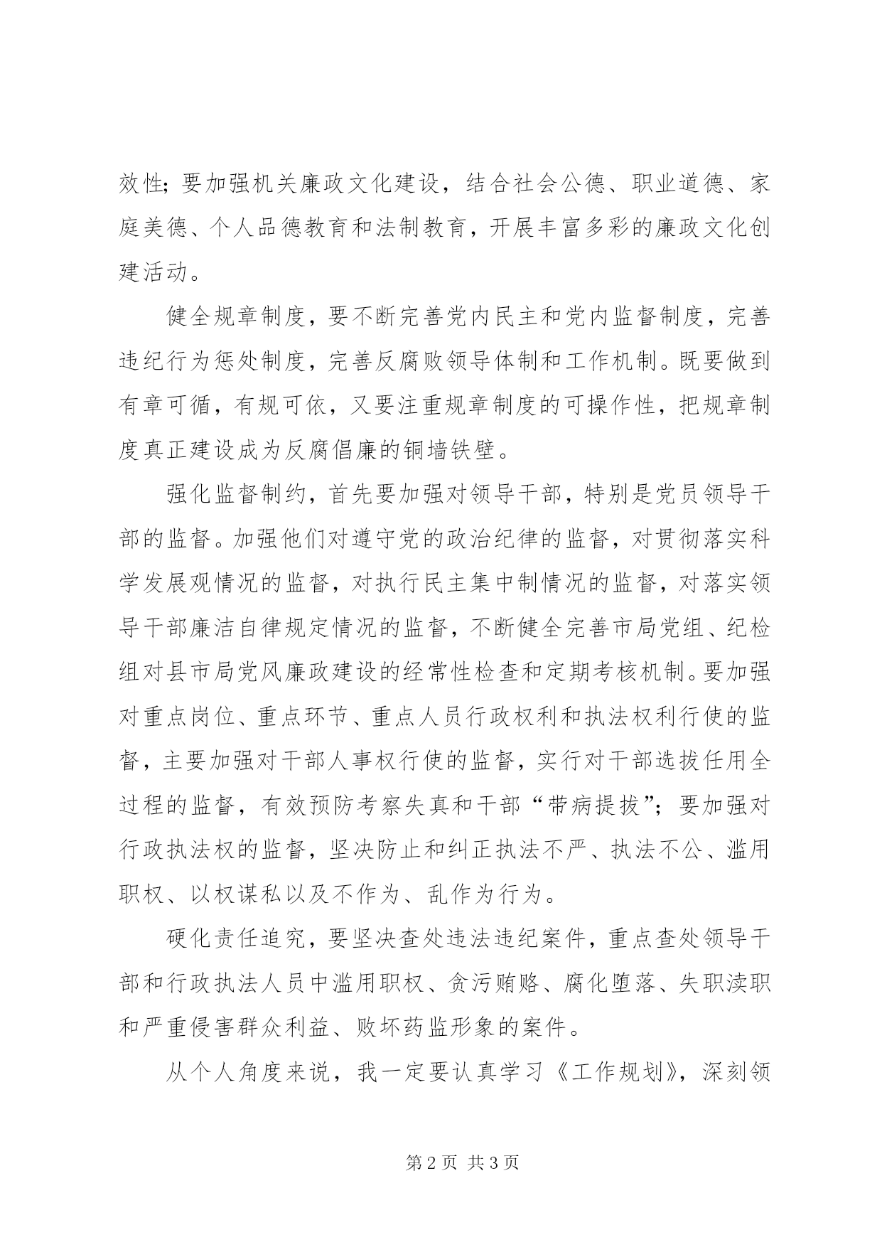 第PAGE\*Arabic\*MERGEFORMAT3页共NUMPAGES\*MERGEFORMAT3页公务员工作规划学习心得xx年4月28日,中共中央政治局审议并通过的《建立健全惩治和预防腐败体系2008-2012年工作规划》(以下简称“《工作规划》”)是今后五年推进惩治和预防腐败体系建设的指导性文件,是贯彻落实加强反腐倡廉建设重要精神的重大举措。通过学习,我认为《工作规划》充分体现了党的十七大精神,提出了坚决惩治和有效预防腐败的新思路、新举措,抓住了今后五年反腐倡廉建设的重点,具有以下五个特点:一是站位比较高,从当而后国家工作大局的高度规划反腐倡廉工作;二是思考比较深,《工作规划》的内容政治性、政策性和专业性都比较强;三是重点比较突出,涵盖了反腐倡廉建设的主要工作;四是内容比较实,注重了系统性与可行性的统一。五是统筹兼顾,紧紧围绕促进经济社会又好又快发展和推进反腐倡廉建设来摆布。作为一名纪检监察工作人员,我认为要真正把《工作规划》落到实处,必须立足学习教育,健全规章制度,强化监督制约,硬化责任追究。立足学习教育,首先要加强领导干部党风廉政建设,教育和引导党员领导干部自觉遵守党的政治纪律、组织纪律、经济工作纪律和群众工作纪律,讲党性、重品行、做表率;要加强反腐倡廉宣传教育,不断创新示范教育、警示教育、岗位廉政教育和主题教育形式,注重人为关怀和心理疏导,提高教育的针对性和有效性;要加强机关廉政文化建设,结合社会公德、职业道德、家庭美德、个人品德教育和法制教育,开展丰富多彩的廉政文化创建活动。健全规章制度,要不断完善党内民主和党内监督制度,完善违纪行为惩处制度,完善反腐败领导体制和工作机制。既要做到有章可循,有规可依,又要注重规章制度的可操作性,把规章制度真正建设成为反腐倡廉的铜墙铁壁。强化监督制约,首先要加强对领导干部,特别是党员领导干部的监督。加强他们对遵守党的政治纪律的监督,对贯彻落实科学发展观情况的监督,对执行民主集中制情况的监督,对落实领导干部廉洁自律规定情况的监督,不断健全完善市局党组、纪检组对县市局党风廉政建设的经常性检查和定期考核机制。要加强对重点岗位、重点环节、重点人员行政权利和执法权利行使的监督,主要加强对干部人事权行使的监督,实行对干部选拔任用全过程的监督,有效预防考察失真和干部“带病提拔”;要加强对行政执法权的监督,坚决防止和纠正执法不严、执法不公、滥用职权、以权谋私以及不作为、乱作为行为。硬化责任追究,要坚决查处违法违纪案件,重点查处领导干部和行政执法人员中滥用职权、贪污贿赂、腐化堕落、失职渎职和严重侵害群众利益、败坏药监形象的案件。从个人角度来说,我一定要认真学习《工作规划》,深刻领会《工作规划》的精神实质,紧密联系自身和工作实际,用《工作规划》武装自己的头脑,约束自己的言行,指导自己的工作。坚持做到学习不放松,深刻认识反腐倡廉形势的严峻性,始终保持清醒的头脑,认真学习财经、法律、现代科技等知识,做到学以立德、学以增能、学以致用;防患不麻痹,注重从小事抓起,预防在先、未雨绸缪、关口前移,把问题解决在初始阶段、矛盾化解在萌芽状态,避免倾向性因素变为现实性问题、小问题变为大问题、个别问题变为群体性问题,努力把腐败现象减少到最低程度;执纪不畏权,严格执行党和国家的政策法规,不为权力所蚀、不为物欲所惑,不为金钱所动,不为声色所迷,做到不枉不纵,刚正不阿。在切实抓好自身党风廉政建设和廉洁自律工作的同时,认真履行好纪检监察工作人员的工作职责,为我局党风廉政建设和行风评议工作作出自己应有的贡献。