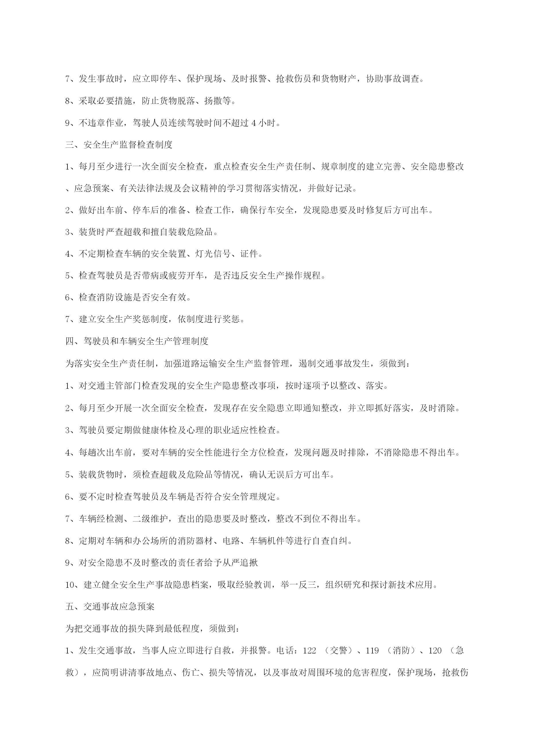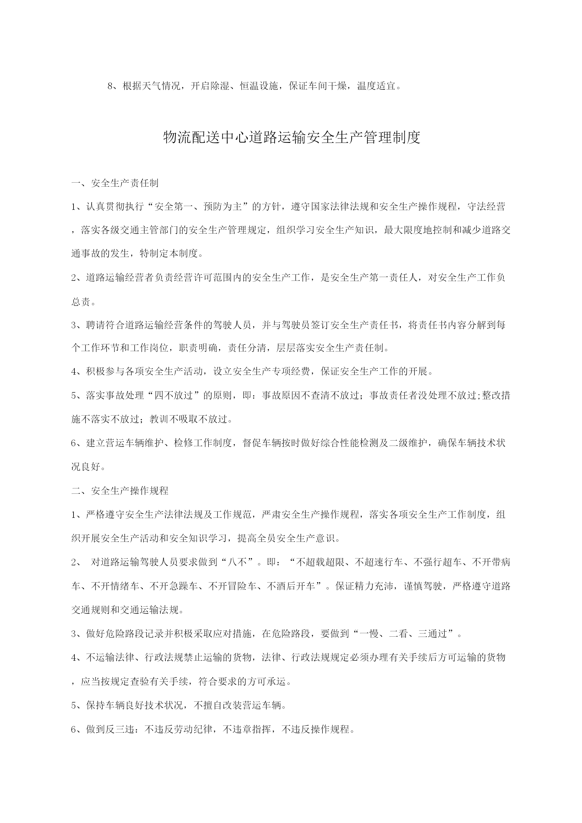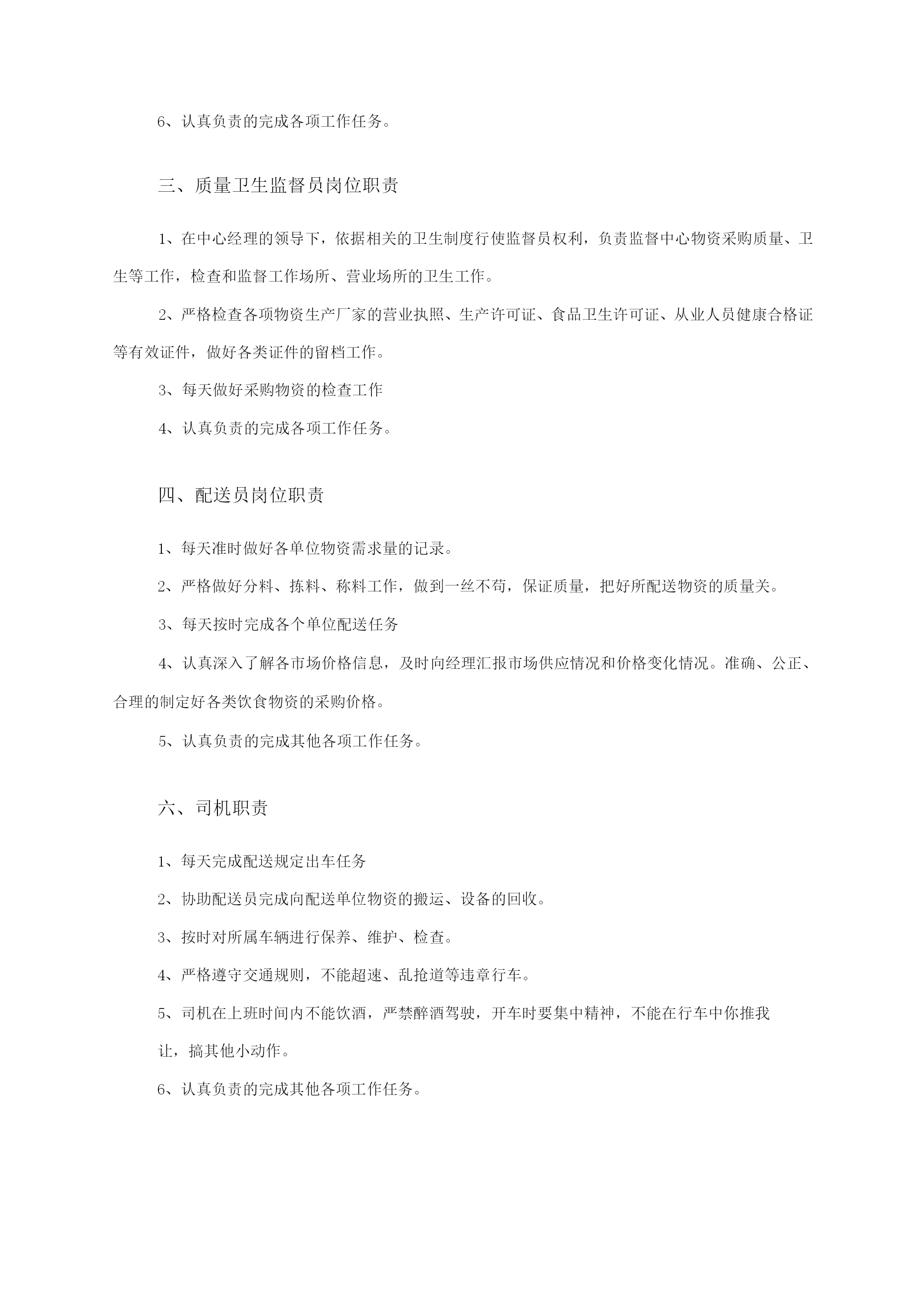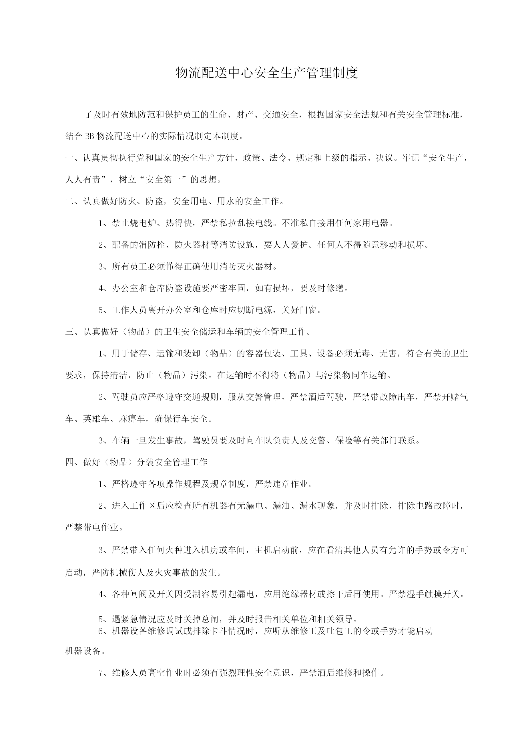 物流配送中心配送管理制度物流配送中心岗位职责一、经理岗位职责1、全面负责中心、的各项管理工作。2、主持本中心会议,制订工作计划,完成中心工作总结,规范本中心各岗位的工作。3、组织中心的政治、业务学习,经常进行思想教育和法纪、安全教育。4、认真抓好采购质量、食品卫生和安全生产工作。5、做好中心工作人员的招聘,调动和使用,关心员工生活,尽力解决员工的困难。6、开展批评与自我批评的民主生活会,加强员工的团结协作精神,协调好员工之间、部门与部门之间的关系。7、严格财务制度,管理好中心、的各项经费开支。8、加强对本中心采购成本核算工作,做到降低成本,减少不必要开支,加强管理争取最大效益。9、加强对本中心固定资产管理工作,使其保养维护好,使用好,让固定资产保值、增值。10、认真负责的完成集团安排的各项工作任务。二、经理助理岗位职责1、在经理的领导下,负责组织调度实施采购工作。2、负责抓好安全生产,行车安全,防止事故发生的工作。合理调度中心、车辆,降低采购运输成本和中心车辆维护经费的把关工作。3、加强民主管理,主动与各食堂联系,听取食堂对采购物资质量和价格意见,勤跑市场了解价格,货比三家,对各类食品的定价,做到准确、公平、合理。不断改进工作,提高服务质量。4、负责中心采购员的工作安排。检查工作任务完成情况,记录员工作数量与质量,回访和了解各食堂对采购员的评价和意见,作为考评依据。5、努力学习,加强自身廉政建设,做到廉洁自律。6、认真负责的完成各项工作任务。三、质量卫生监督员岗位职责1、在中心经理的领导下,依据相关的卫生制度行使监督员权利,负责监督中心物资采购质量、卫生等工作,检查和监督工作场所、营业场所的卫生工作。2、严格检查各项物资生产厂家的营业执照、生产许可证、食品卫生许可证、从业人员健康合格证等有效证件,做好各类证件的留档工作。3、每天做好采购物资的检查工作4、认真负责的完成各项工作任务。四、配送员岗位职责1、每天准时做好各单位物资需求量的记录。2、严格做好分料、拣料、称料工作,做到一丝不苟,保证质量,把好所配送物资的质量关。3、每天按时完成各个单位配送任务4、认真深入了解各市场价格信息,及时向经理汇报市场供应情况和价格变化情况。准确、公正、合理的制定好各类饮食物资的采购价格。5、认真负责的完成其他各项工作任务。六、司机职责1、每天完成配送规定出车任务2、协助配送员完成向配送单位物资的搬运、设备的回收。3、按时对所属车辆进行保养、维护、检查。4、严格遵守交通规则,不能超速、乱抢道等违章行车。5、司机在上班时间内不能饮酒,严禁醉酒驾驶,开车时要集中精神,不能在行车中你推我让,搞其他小动作。6、认真负责的完成其他各项工作任务。物流配送中心安全生产管理制度了及时有效地防范和保护员工的生命、财产、交通安全,根据国家安全法规和有关安全管理标准,结合BB物流配送中心的实际情况制定本制度。一、认真贯彻执行党和国家的安全生产方针、政策、法令、规定和上级的指示、决议。牢记“安全生产,人人有责”,树立“安全第一”的思想。二、认真做好防火、防盗,安全用电、用水的安全工作。1、禁止烧电炉、热得快,严禁私拉乱接电线。不准私自接用任何家用电器。2、配备的消防栓、防火器材等消防设施,要人人爱护。任何人不得随意移动和损坏。3、所有员工必须懂得正确使用消防灭火器材。4、办公室和仓库防盗设施要严密牢固,如有损坏,要及时修缮。5、工作人员离开办公室和仓库时应切断电源,关好门窗。三、认真做好(物品)的卫生安全储运和车辆的安全管理工作。1、用于储存、运输和装卸(物品)的容器包装、工具、设备必须无毒、无害,符合有关的卫生要求,保持清洁,防止(物品)污染。在运输时不得将(物品)与污染物同车运输。2、驾驶员应严格遵守交通规则,服从交警管理,严禁酒后驾驶,严禁带故障出车,严禁开赌气车、英雄车、麻痹车,确保行车安全。3、车辆一旦发生事故,驾驶员要及时向车队负责人及交警、保险等有关部门联系。四、做好(物品)分装安全管理工作1、严格遵守各项操作规程及规章制度,严禁违章作业。2、进入工作区后应检查所有机器有无漏电、漏油、漏水现象,并及时排除,排除电路故障时,严禁带电作业。3、严禁带入任何火种进入机房或车间,主机启动前,应在看清其他人员有允许的手势或令方可启动,严防机械伤人及火灾事故的发生。4、各种闸阀及开关因受潮容易引起漏电,应用绝缘器材或擦干后再使用。严禁湿手触摸开关。5、遇紧急情况应及时关掉总闸,并及时报告相关单位和相关领导。6、机器设备维修调试或排除卡斗情况时,应听从维修工及吐包工的令或手势才能启动机器设备。7、维修人员高空作业时必须有强烈理性安全意识,严禁酒后维修和