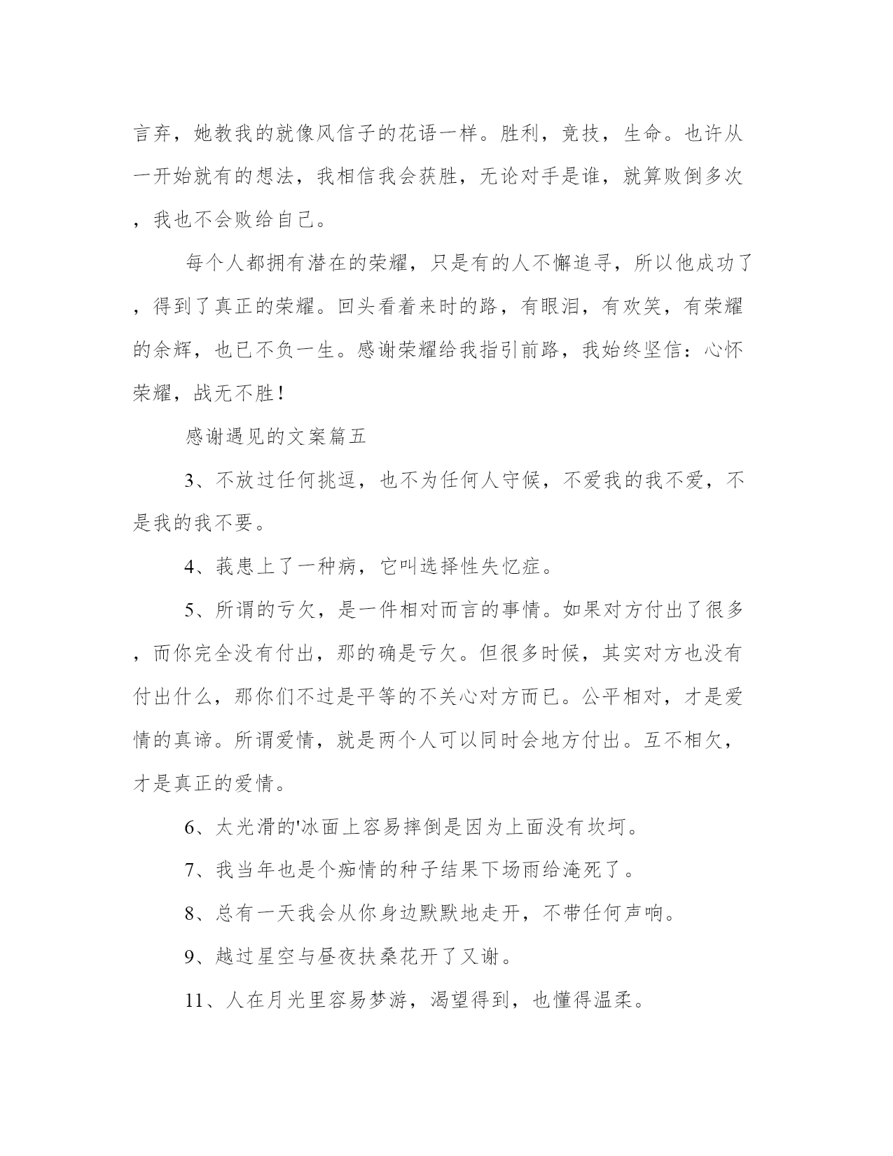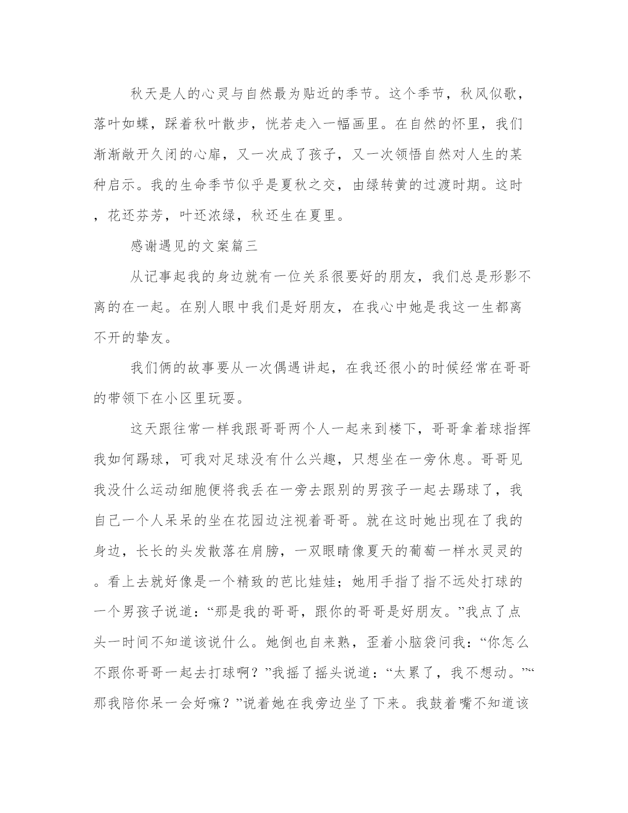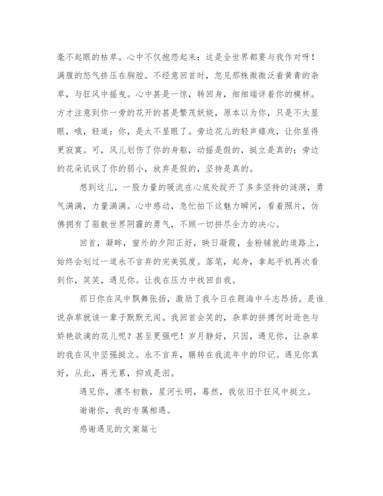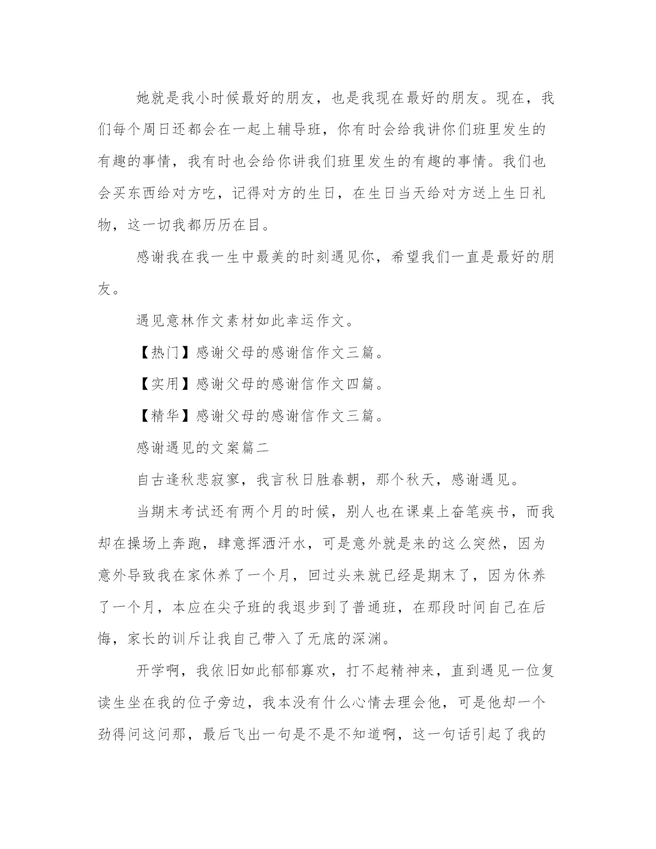 最新感谢遇见的文案(实用11篇)每个人都曾试图在平淡的学习、工作和生活中写一篇文章。写作是培养人的观察、联想、想象、思维和记忆的重要手段。写范文的时候需要注意什么呢?有哪些格式需要注意呢?下面我给大家整理了一些优秀范文,希望能够帮助到大家,我们一起来看一看吧。感谢遇见的文案篇一因为遇见你,才会有许许多多的事情发生;因为遇见你,才会有许许多多难忘的事情;因为遇见你,才会有许许多多的欢声笑语。感谢在我一生中最美好的时刻能够遇见你。那大概是三年级时,记不清事情发生的原因是什么了,反正当时我很生气,正好旁边一个同学的桌子上有一把小剪子,我就拿起来想吓唬你,可没想到你把胳膊伸过来,哧——衣服咧开了一个很大的口子,里面的羽绒都漏了出来,你因十分生气而哭了。到了下午放学的时候,妈妈知道了这件事,就让我去和你说对不起,我很小声地说了一句“对不起”就跑了。虽然你原谅了我,但这件事还是使我感到很愧疚。这件事的发生并没有使我们的关系变僵,反而越来越好了。因为我们两个人家离得比较近,所以有时我们就上对方家玩。学习上,我们有时也会互相帮助,共同促进。在我们的学习互相促进的过程中,我们的友谊也变得更好了。她就是我小时候最好的朋友,也是我现在最好的朋友。现在,我们每个周日还都会在一起上辅导班,你有时会给我讲你们班里发生的有趣的事情,我有时也会给你讲我们班里发生的有趣的事情。我们也会买东西给对方吃,记得对方的生日,在生日当天给对方送上生日礼物,这一切我都历历在目。感谢我在我一生中最美的时刻遇见你,希望我们一直是最好的朋友。遇见意林作文素材如此幸运作文。【热门】感谢父母的感谢信作文三篇。【实用】感谢父母的感谢信作文四篇。【精华】感谢父母的感谢信作文三篇。感谢遇见的文案篇二自古逢秋悲寂寥,我言秋日胜春朝,那个秋天,感谢遇见。当期末考试还有两个月的时候,别人也在课桌上奋笔疾书,而我却在操场上奔跑,肆意挥洒汗水,可是意外就是来的这么突然,因为意外导致我在家休养了一个月,回过头来就已经是期末了,因为休养了一个月,本应在尖子班的我退步到了普通班,在那段时间自己在后悔,家长的训斥让我自己带入了无底的深渊。开学啊,我依旧如此郁郁寡欢,打不起精神来,直到遇见一位复读生坐在我的位子旁边,我本没有什么心情去理会他,可是他却一个劲得问这问那,最后飞出一句是不是不知道啊,这一句话引起了我的好奇心,我便把他拿过来的题目一个劲的全部做完了之后他便有一系列的问题就来问我,我也变得渐渐走出了自己内心的意义,感觉到了这个班级的氛围蛮好的,于是我便恢复了之前那般乐观向上,那个秋天感谢你带我走出阴影。那个秋天一个阵阵秋风拂面的秋天,学校组织了秋季运动会,我报名了一个一千米长跑。在此之前我也已经与他成为了形影不离的伙伴,每天下午我去训练。他便陪我一起训练,跑累了便坐下来与他谈谈心,训练,完了我的脚也走动了,他便把我一步一步的从操场背回寝室,过了不知道多少天这样的经历,运动会终于来了,站在起跑线上,随着裁判的一声令下,所有人宛如离弦的箭一般冲了过去,在一圈一圈的紧张赛跑中我一直位列第一,我欣赏没有浪费我这些年的辛苦训练,就在我走神的时候,我自己都不明白发生了什么,自己绊了自己一下,重重地摔倒了,在地上,他见我摔倒了飞奔过来,将我扶起问我“哪里受伤了?疼不疼?”我自己看了一下右腿刮出了血,估计是不能再跑了,可我不甘心,他一眼就看出来了便说,我扶你走过终点,我不禁感慨万分,只说一句好,然后在他的帮助下,我们终于到达了终点,走过了最后的路程,虽然是最后一名,可是我却感觉到如此比夺到冠军还更开心之后,我们便在操场上坐着感受一阵阵秋风拂面,感到无比欢快,在那个秋天我收获了沉甸甸的友谊,我感受到了这样的滋味,比蜂蜜还要甜,这友谊的重量比山还要重。在那个秋天我感谢你,感谢这些遇见。秋天是人的心灵与自然最为贴近的季节。这个季节,秋风似歌,落叶如蝶,踩着秋叶散步,恍若走入一幅画里。在自然的怀里,我们渐渐敞开久闭的心扉,又一次成了孩子,又一次领悟自然对人生的某种启示。我的生命季节似乎是夏秋之交,由绿转黄的过渡时期。这时,花还芬芳,叶还浓绿,秋还生在夏里。感谢遇见的文案篇三从记事起我的身边就有一位关系很要好的朋友,我们总是形影不离的在一起。在别人眼中我们是好朋友,在我心中她是我这一生都离不开的挚友。我们俩的故事要从一次偶遇讲起,在我还很小的时候经常在哥哥的带领下在小区里玩耍。这天跟往常一样我跟哥哥两个人一起来到楼下,哥哥拿着球指挥我如何踢球,可我对足球没有什么兴趣,只想坐在一旁休息。哥哥见我没什么运动细胞便将我丢在一旁去跟别的男孩子一起去踢球了,我自己一个人呆呆的坐在花园边注视着哥哥。就在这时她出现在了我的身边,长长的头发散落在肩膀,一双眼睛像夏天的葡萄一样水灵灵的。看上去就好