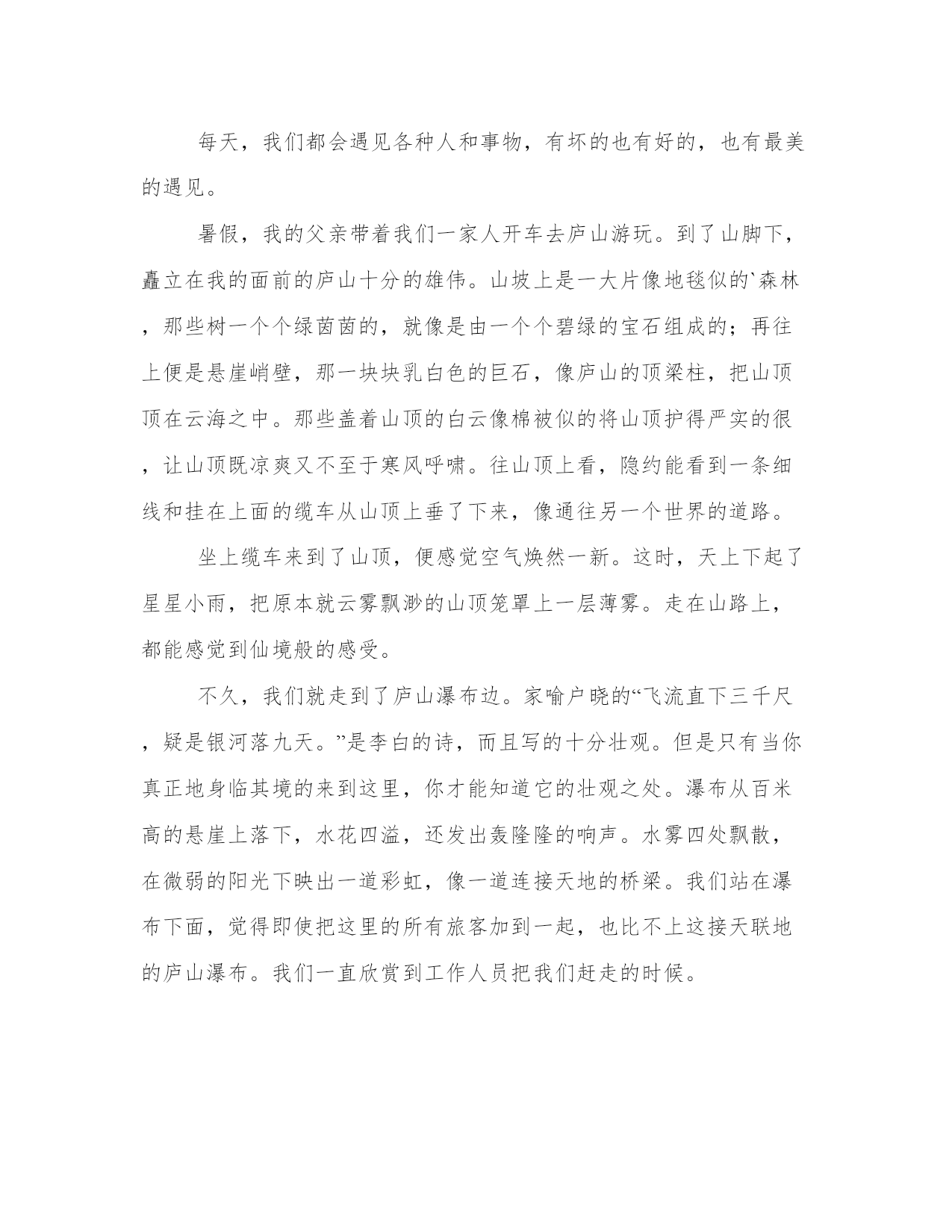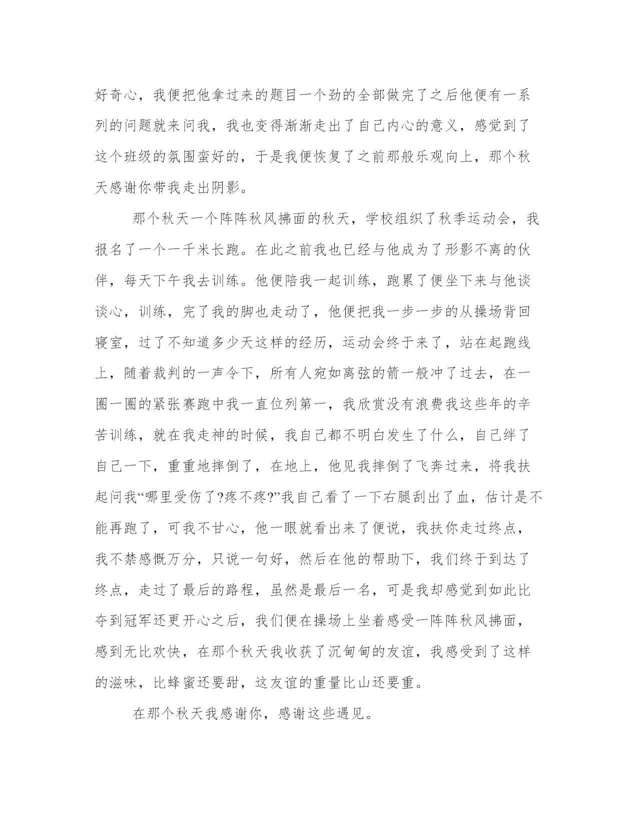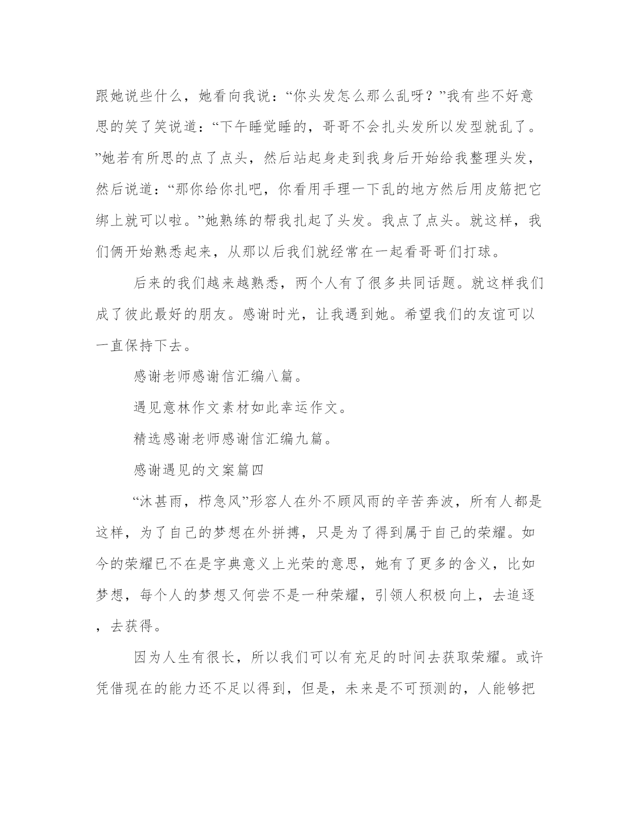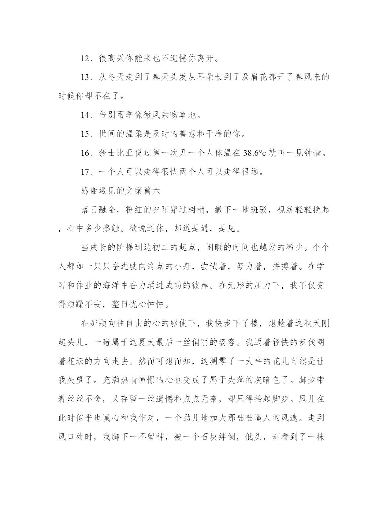 最新感谢遇见的文案(实用11篇)每个人都曾试图在平淡的学习、工作和生活中写一篇文章。写作是培养人的观察、联想、想象、思维和记忆的重要手段。写范文的时候需要注意什么呢?有哪些格式需要注意呢?下面我给大家整理了一些优秀范文,希望能够帮助到大家,我们一起来看一看吧。感谢遇见的文案篇一因为遇见你,才会有许许多多的事情发生;因为遇见你,才会有许许多多难忘的事情;因为遇见你,才会有许许多多的欢声笑语。感谢在我一生中最美好的时刻能够遇见你。那大概是三年级时,记不清事情发生的原因是什么了,反正当时我很生气,正好旁边一个同学的桌子上有一把小剪子,我就拿起来想吓唬你,可没想到你把胳膊伸过来,哧——衣服咧开了一个很大的口子,里面的羽绒都漏了出来,你因十分生气而哭了。到了下午放学的时候,妈妈知道了这件事,就让我去和你说对不起,我很小声地说了一句“对不起”就跑了。虽然你原谅了我,但这件事还是使我感到很愧疚。这件事的发生并没有使我们的关系变僵,反而越来越好了。因为我们两个人家离得比较近,所以有时我们就上对方家玩。学习上,我们有时也会互相帮助,共同促进。在我们的学习互相促进的过程中,我们的友谊也变得更好了。她就是我小时候最好的朋友,也是我现在最好的朋友。现在,我们每个周日还都会在一起上辅导班,你有时会给我讲你们班里发生的有趣的事情,我有时也会给你讲我们班里发生的有趣的事情。我们也会买东西给对方吃,记得对方的生日,在生日当天给对方送上生日礼物,这一切我都历历在目。感谢我在我一生中最美的时刻遇见你,希望我们一直是最好的朋友。遇见意林作文素材如此幸运作文。【热门】感谢父母的感谢信作文三篇。【实用】感谢父母的感谢信作文四篇。【精华】感谢父母的感谢信作文三篇。感谢遇见的文案篇二自古逢秋悲寂寥,我言秋日胜春朝,那个秋天,感谢遇见。当期末考试还有两个月的时候,别人也在课桌上奋笔疾书,而我却在操场上奔跑,肆意挥洒汗水,可是意外就是来的这么突然,因为意外导致我在家休养了一个月,回过头来就已经是期末了,因为休养了一个月,本应在尖子班的我退步到了普通班,在那段时间自己在后悔,家长的训斥让我自己带入了无底的深渊。开学啊,我依旧如此郁郁寡欢,打不起精神来,直到遇见一位复读生坐在我的位子旁边,我本没有什么心情去理会他,可是他却一个劲得问这问那,最后飞出一句是不是不知道啊,这一句话引起了我的好奇心,我便把他拿过来的题目一个劲的全部做完了之后他便有一系列的问题就来问我,我也变得渐渐走出了自己内心的意义,感觉到了这个班级的氛围蛮好的,于是我便恢复了之前那般乐观向上,那个秋天感谢你带我走出阴影。那个秋天一个阵阵秋风拂面的秋天,学校组织了秋季运动会,我报名了一个一千米长跑。在此之前我也已经与他成为了形影不离的伙伴,每天下午我去训练。他便陪我一起训练,跑累了便坐下来与他谈谈心,训练,完了我的脚也走动了,他便把我一步一步的从操场背回寝室,过了不知道多少天这样的经历,运动会终于来了,站在起跑线上,随着裁判的一声令下,所有人宛如离弦的箭一般冲了过去,在一圈一圈的紧张赛跑中我一直位列第一,我欣赏没有浪费我这些年的辛苦训练,就在我走神的时候,我自己都不明白发生了什么,自己绊了自己一下,重重地摔倒了,在地上,他见我摔倒了飞奔过来,将我扶起问我“哪里受伤了?疼不疼?”我自己看了一下右腿刮出了血,估计是不能再跑了,可我不甘心,他一眼就看出来了便说,我扶你走过终点,我不禁感慨万分,只说一句好,然后在他的帮助下,我们终于到达了终点,走过了最后的路程,虽然是最后一名,可是我却感觉到如此比夺到冠军还更开心之后,我们便在操场上坐着感受一阵阵秋风拂面,感到无比欢快,在那个秋天我收获了沉甸甸的友谊,我感受到了这样的滋味,比蜂蜜还要甜,这友谊的重量比山还要重。在那个秋天我感谢你,感谢这些遇见。秋天是人的心灵与自然最为贴近的季节。这个季节,秋风似歌,落叶如蝶,踩着秋叶散步,恍若走入一幅画里。在自然的怀里,我们渐渐敞开久闭的心扉,又一次成了孩子,又一次领悟自然对人生的某种启示。我的生命季节似乎是夏秋之交,由绿转黄的过渡时期。这时,花还芬芳,叶还浓绿,秋还生在夏里。感谢遇见的文案篇三从记事起我的身边就有一位关系很要好的朋友,我们总是形影不离的在一起。在别人眼中我们是好朋友,在我心中她是我这一生都离不开的挚友。我们俩的故事要从一次偶遇讲起,在我还很小的时候经常在哥哥的带领下在小区里玩耍。这天跟往常一样我跟哥哥两个人一起来到楼下,哥哥拿着球指挥我如何踢球,可我对足球没有什么兴趣,只想坐在一旁休息。哥哥见我没什么运动细胞便将我丢在一旁去跟别的男孩子一起去踢球了,我自己一个人呆呆的坐在花园边注视着哥哥。就在这时她出现在了我的身边,长长的头发散落在肩膀,一双眼睛像夏天的葡萄一样水灵灵的。看上去就好