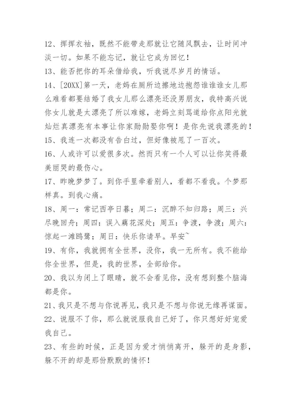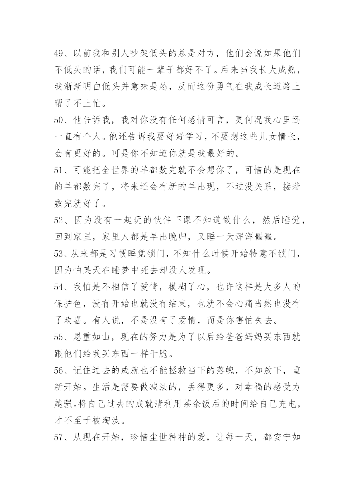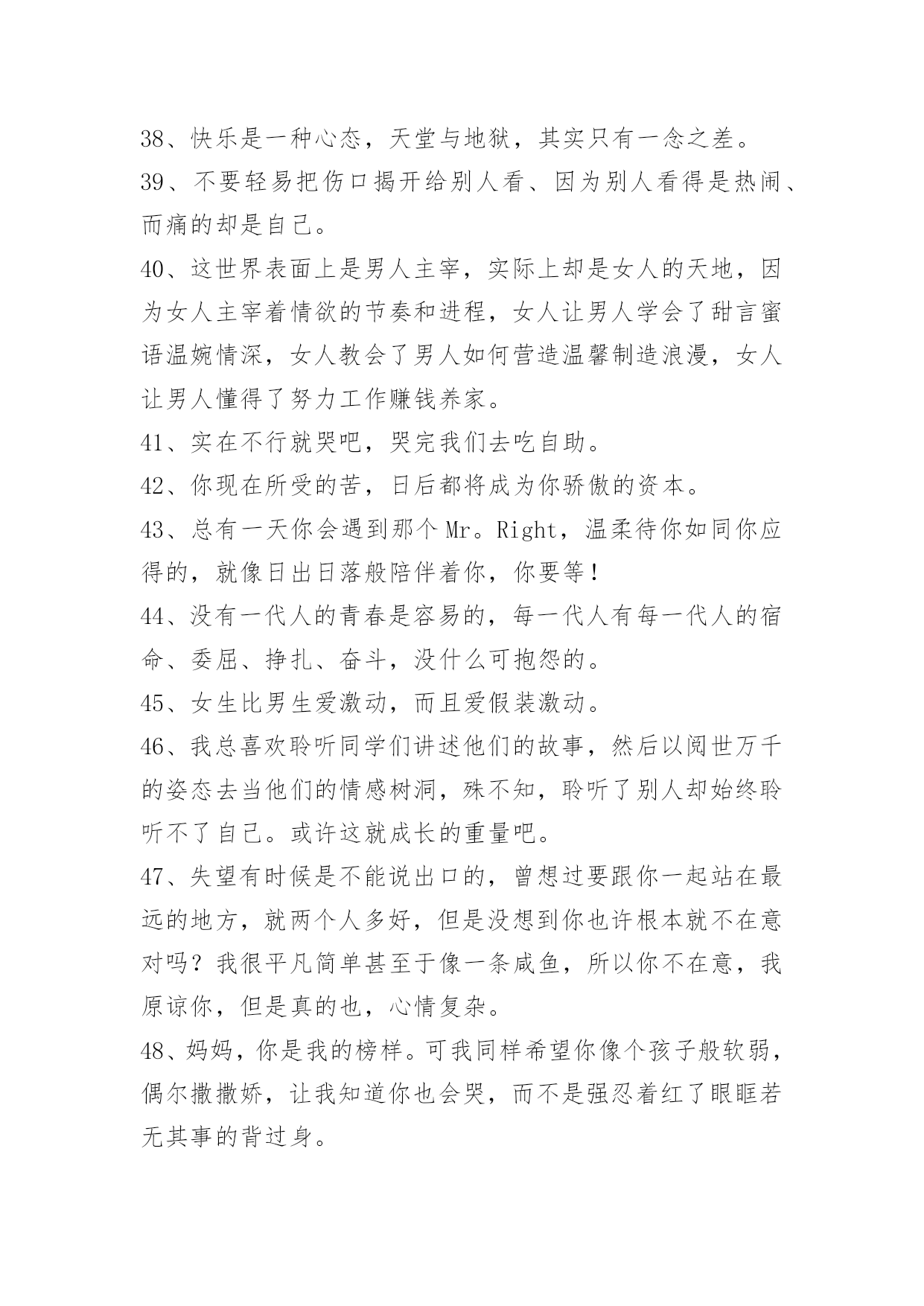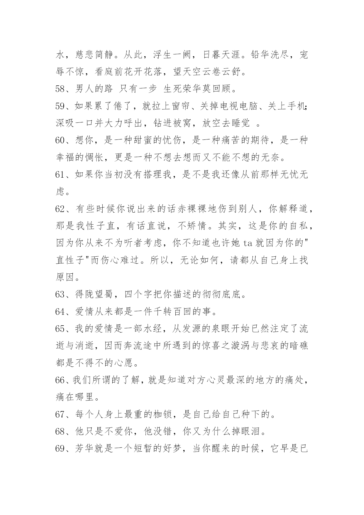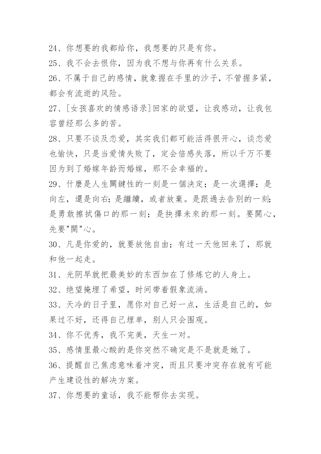 情感励志语录71条【必备】情感励志语录71条没关系,我可以把悲伤放在心里,任时间碾磨成水,从眼睛里流出来。下面是小编为大家推荐的情感励志语录71条,感兴趣的一起来看看吧。1、走在回家的小路上,悠然的小曲在荡漾,礼品齐全他们唱,还有莘莘学子盼见家乡。祝福没有边界,福寿永远绵长,工作顺利新年更强!2、所有人都在努力并不是只有你满腹委屈。3、淋过雨的空气,疲倦了的伤心,我记忆里的童话已经慢慢的融化,再也不会重现。4、回忆就像水草一样将你我牢牢羁绊,终动弹不得。5、长大了,就要做到,在你不懂时,别乱说。懂得时,别多说。心乱时,慢慢说。6、人懒惰久了,稍微努力一下,就以为在拼命。7、没有什么,比来自亲人的鼓励更让人具有勇气。8、过去已成回忆,我们的记忆,就像那诶菲尔壹样,成为古迹。9、每当这样的雨夜,忧伤而寂寞的雨夜,总是忍不住一个人来到窗边思念远方的人儿,你,还好吗?10、自尊心大过爱,没人愿意先妥协,都在等着对方先服软,于是等着等着就散了。11、我也爱你,在未来,你仍是我最信赖的那个人。12、挥挥衣袖,既然不能带走那就让它随风飘去,让时间冲淡一切。如果不能忘记,就让它成为回忆!13、能否把你的耳朵借给我,听我说尽岁月的情话。14、[20XX]第一天,老妈在厕所边擦地边抱怨谁谁谁女儿那么难看都要结婚了我女儿那么漂亮还没男朋友,我特高兴说你女儿就是太漂亮了所以难嫁,老妈立刻骂道给你点阳光就灿烂真漂亮有本事让你家勋勋娶你啊!是你先说我漂亮的!15、我连一次都没有告白过,但好像被甩了一百次。16、人或许可以爱很多次。然而只有一个人可以让你笑得最美丽哭的最伤心。17、昨晚梦梦了。到你手里牵着别人,看都不看我。个梦那样真。到我心痛。18、周一:常记西亭日暮;周二:沉醉不知归路;周三:兴尽晚回舟;周四:误入藕花深处;周五:争渡,争渡;周六:惊起一滩鸥鹭;周日:快乐你请早。早安~19、有你,我就拥有全世界,没你,我一无所有。我不能给你全世界,但是,我的世界,全部给你。20、我以为闭上了眼睛,就不会看见你,没有想到整个脑海都是你。21、我只是不想与你说再见,我只是不想与你说无缘再谋面。22、说服不了你,那么就说服我自己好了,你只想好好宠爱我自己。23、有些的时候,正是因为爱才悄悄离开,躲开的是身影,躲不开的却是那份默默的情怀!24、你想要的我都给你,我想要的只是有你。25、我不会去恨你,因为我不想与你再有什么关系。26、不属于自己的感情,就象握在手里的沙子,不管握多紧,都会有流逝的风险。27、[女孩喜欢的情感语录]回家的欲望,让我感动,让我包容曾经那么多的苦。28、只要不谈及恋爱,其实我们都可能活得很开心,谈恋爱也愉快,只是当爱情失败了,定会倍感失落,所以千万不要因为到了婚嫁年龄而婚嫁,那不会幸福的。29、什麼是人生關鍵性的一刻是一個決定;是一次選擇;是向左,還是向右;是繼續,或者放棄。是跟過去告別的一刻;是勇敢擦拭傷口的那一刻;是抉擇未來的那一刻。要開心,先要"開"心。30、凡是你爱的,就要放他自由;有过一天他回来了,那就和他一起走。31、光阴早就把最美妙的东西加在了修炼它的人身上。32、绝望掩埋了希望,时间带着假象流淌。33、天冷的日子里,愿你对自己好一点,生活是自己的,如果过不好,还得自己埋单,别人只会围观。34、你不优秀,我不完美,天生一对。35、感情里最心酸的是你突然不确定是不是就是她了。36、提醒自己焦虑意味着冲突,而且只要冲突存在就有可能产生建设性的解决方案。37、你想要的童话,我不能帮你去实现。38、快乐是一种心态,天堂与地狱,其实只有一念之差。39、不要轻易把伤口揭开给别人看、因为别人看得是热闹、而痛的却是自己。40、这世界表面上是男人主宰,实际上却是女人的天地,因为女人主宰着情欲的节奏和进程,女人让男人学会了甜言蜜语温婉情深,女人教会了男人如何营造温馨制造浪漫,女人让男人懂得了努力工作赚钱养家。41、实在不行就哭吧,哭完我们去吃自助。42、你现在所受的苦,日后都将成为你骄傲的资本。43、总有一天你会遇到那个Mr。Right,温柔待你如同你应得的,就像日出日落般陪伴着你,你要等!44、没有一代人的青春是容易的,每一代人有每一代人的宿命、委屈、挣扎、奋斗,没什么可抱怨的。45、女生比男生爱激动,而且爱假装激动。46、我总喜欢聆听同学们讲述他们的故事,然后以阅世万千的姿态去当他们的情感树洞,殊不知,聆听了别人却始终聆听不了自己。或许这就成长的重量吧。47、失望有时候是不能说出口的,曾想过要跟你一起站在最远的地方,就两个人多好,但是没想到你也许根本就不在意对吗?我很平凡简单甚至于像一条咸鱼,所以你不在意,我原谅你,但是真的也,心情复杂。48、妈妈,你是我的榜样。可我同样希望你像个孩子般软弱,偶尔撒撒娇,让我知道你也会哭,而不是强忍着红
