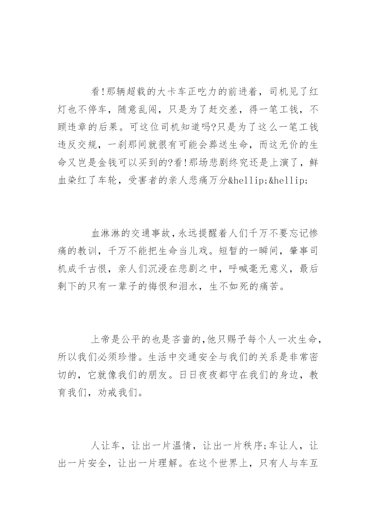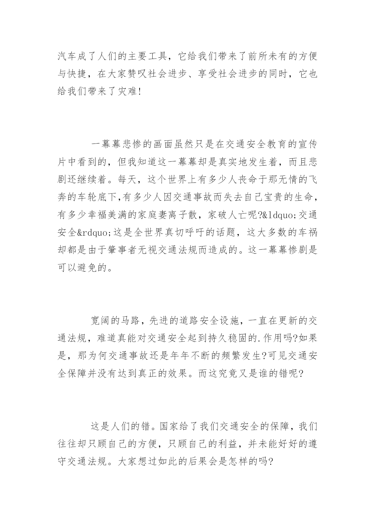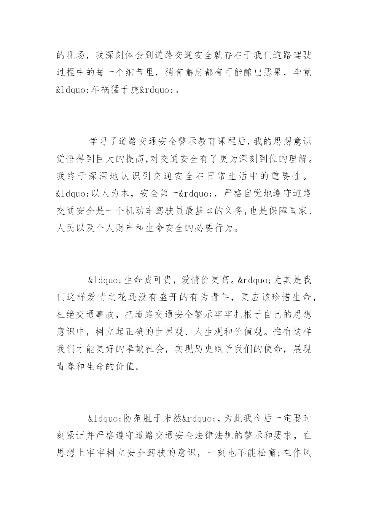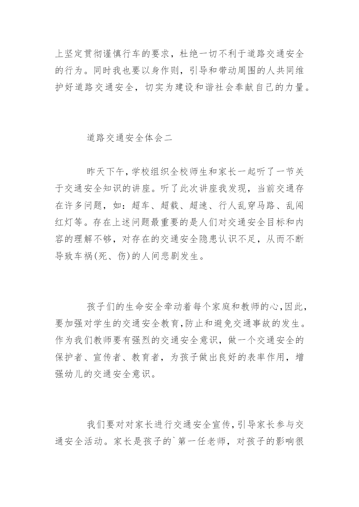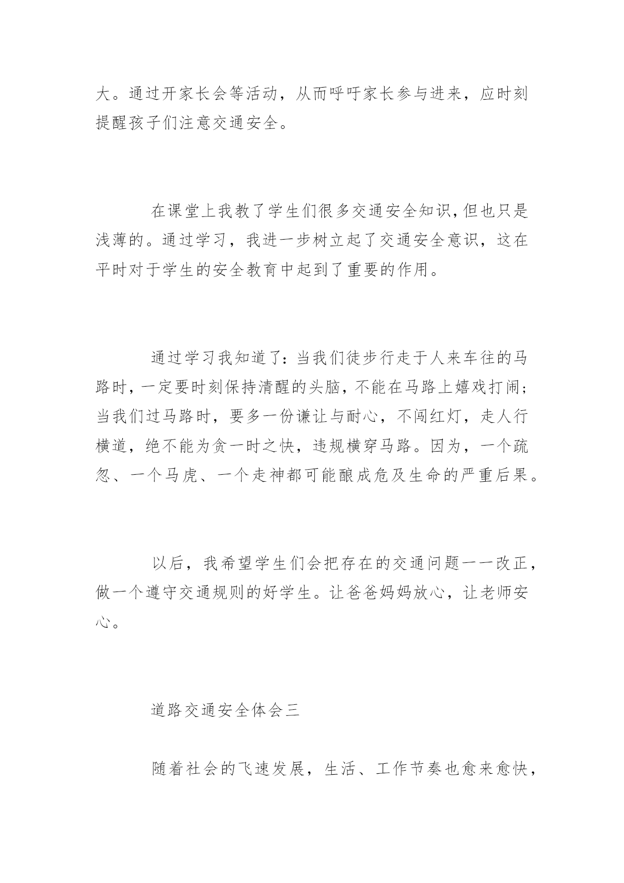 道路交通安全体会道路交通安全体会道路安全与人民生活息息相关,它影响着人们的出行安全。下面是百分网小编为大家整理的道路交通安全体会的相关资料,希望对大家有用。汽车的出现,不但方便了人们出行、运输,还成为社会结构中身份认同的一个不可或缺的元素。时至今日,不可否认汽车推动了人类文明的发展。随着汽车逐渐普及之后,汽车和我们的生活中越来越密不可分。一直以来,我都觉得自己不会那么倒霉,交通安全事故不会找上我,我稍微注意一点就行了。学习过程中繁文缛节般的道路交通安全法律法规不免让人心生倦意,但是学习了交通安全事故案例之后,一幕幕触目惊心的事件和惨不忍睹的苦果徘徊在我的脑海久久挥之不去。这些事故无一例外都是因为忽视思想作风建设、忽略道路交通安全而引发的,事故的后果给国家和人民的生命财产造成无法弥补的重大损失。在学习道路交通安全警示的现场,我深刻体会到道路交通安全就存在于我们道路驾驶过程中的每一个细节里,稍有懈怠都有可能酿出恶果,毕竟“车祸猛于虎”。学习了道路交通安全警示教育课程后,我的思想意识觉悟得到巨大的提高,对交通安全有了更为深刻到位的理解。我终于深深地认识到交通安全在日常生活中的重要性。“以人为本,安全第一”,严格自觉地遵守道路交通安全是一个机动车驾驶员最基本的义务,也是保障国家、人民以及个人财产和生命安全的必要行为。“生命诚可贵,爱情价更高。”尤其是我们这样爱情之花还没有盛开的有为青年,更应该珍惜生命,杜绝交通事故,把道路交通安全警示牢牢扎根于自己的思想意识中,树立起正确的世界观、人生观和价值观。惟有这样我们才能更好的奉献社会,实现历史赋予我们的使命,展现青春和生命的价值。“防范胜于未然”,为此我今后一定要时刻紧记并严格遵守道路交通安全法律法规的警示和要求,在思想上牢牢树立安全驾驶的意识,一刻也不能松懈;在作风上坚定贯彻谨慎行车的要求,杜绝一切不利于道路交通安全的行为。同时我也要以身作则,引导和带动周围的人共同维护好道路交通安全,切实为建设和谐社会奉献自己的力量。道路交通安全体会二昨天下午,学校组织全校师生和家长一起听了一节关于交通安全知识的讲座。听了此次讲座我发现,当前交通存在许多问题,如:超车、超载、超速、行人乱穿马路、乱闯红灯等。存在上述问题最重要的是人们对交通安全目标和内容的理解不够,对存在的交通安全隐患认识不足,从而不断导致车祸(死、伤)的人间悲剧发生。孩子们的生命安全牵动着每个家庭和教师的心,因此,要加强对学生的交通安全教育,防止和避免交通事故的发生。作为我们教师要有强烈的交通安全意识,做一个交通安全的保护者、宣传者、教育者,为孩子做出良好的表率作用,增强幼儿的交通安全意识。我们要对对家长进行交通安全宣传,引导家长参与交通安全活动。家长是孩子的`第一任老师,对孩子的影响很大。通过开家长会等活动,从而呼吁家长参与进来,应时刻提醒孩子们注意交通安全。在课堂上我教了学生们很多交通安全知识,但也只是浅薄的。通过学习,我进一步树立起了交通安全意识,这在平时对于学生的安全教育中起到了重要的作用。通过学习我知道了:当我们徒步行走于人来车往的马路时,一定要时刻保持清醒的头脑,不能在马路上嬉戏打闹;当我们过马路时,要多一份谦让与耐心,不闯红灯,走人行横道,绝不能为贪一时之快,违规横穿马路。因为,一个疏忽、一个马虎、一个走神都可能酿成危及生命的严重后果。以后,我希望学生们会把存在的交通问题一一改正,做一个遵守交通规则的好学生。让爸爸妈妈放心,让老师安心。道路交通安全体会三随着社会的飞速发展,生活、工作节奏也愈来愈快,汽车成了人们的主要工具,它给我们带来了前所未有的方便与快捷,在大家赞叹社会进步、享受社会进步的同时,它也给我们带来了灾难!一幕幕悲惨的画面虽然只是在交通安全教育的宣传片中看到的,但我知道这一幕幕却是真实地发生着,而且悲剧还继续着。每天,这个世界上有多少人丧命于那无情的飞奔的车轮底下,有多少人因交通事故而失去自己宝贵的生命,有多少幸福美满的家庭妻离子散,家破人亡呢?“交通安全”这是全世界真切呼吁的话题,这大多数的车祸却都是由于肇事者无视交通法规而造成的。这一幕幕惨剧是可以避免的。宽阔的马路,先进的道路安全设施,一直在更新的交通法规,难道真能对交通安全起到持久稳固的.作用吗?如果是,那为何交通事故还是年年不断的频繁发生?可见交通安全保障并没有达到真正的效果。而这究竟又是谁的错呢?这是人们的错。国家给了我们交通安全的保障,我们往往却只顾自己的方便,只顾自己的利益,并未能好好的遵守交通法规。大家想过如此的后果会是怎样的吗?看!那辆超载的大卡车正吃力的前进着,司机见了红灯也不停车,