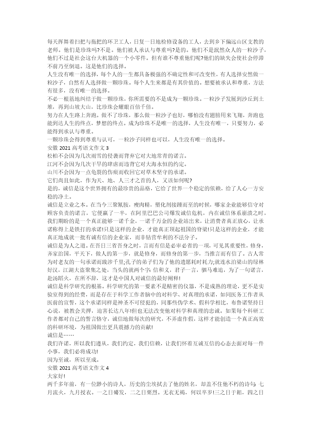安徽2021高考语文作文要写语文作文首先清除与写作无关的一切杂念,现在就是写作的时间,好像把自己放进一个盒子里,在没有任何打扰下进入写作状态。下面xx给大家分享安徽2021高考语文作文的内容,希望能够帮助大家,欢迎阅读!安徽2021高考语文作文1“锲而不舍,金石可镂”。镂刻金石,本是大自然的神力所致,却可人为之,这等奇迹,可遇可求,只因锲而不舍而已。奇迹的存在,也不过是勤勉的必然结果。富尔格姆说“要承认奇迹”。人的生命如苇草般脆弱,却能繁衍庞大至此,在自然的严格筛选中存活至今,堪称奇迹。这个奇迹是千百年来人类用智慧和微薄之力永不言弃地抗争的结果,说起来只是最基本的求生本能,但产生的影响却令人叹为观止。水可穿石,冰可冻三尺,蚓可上食埃土,下饮黄泉,这些超越本身的能力所致成的结果都是存在的奇迹。奇迹在达成之前只是一个虚无飘渺的目标,一个堪称好高骛远的梦想。在日积月累的过程中,艰辛难以想象,所以,中途放弃的人将他们看做“不可能的任务”,能力的巅峰。然而“梦想还是要有的,万一实现了呢?”“实现了,就成为了奇迹。”没有人觉得马云和俞敏洪会是奇迹,在他们广为人知之前是公认的屌丝。他们完成了出众的人也做不到的事后,就有了“神话”的光环,但他们不相信奇迹,只把奇迹当做梦想。万一实现,有机遇性,但还是可遇可求的,因为不相信,所以觉得脚踏实地,日积跬步是可以到达远方的。“没有比脚更长的路,没有比人更高的山”说的就是奇迹的可能性吧。但是没有行动,目标就不过是空想。空怀壮志而不付诸行动,以为相信奇迹的存在,只会为人耻笑。那个心怀天下不拘洒扫庭除的少年得到的只是“一屋不扫何以扫天下”的哂笑质疑,而泰山不拒细壤,故能成其高;合抱之木,生于毫末;任何令人惊叹的存在都不是一蹴而就的,学者陈书凯劝解“不要相信奇迹”,也是提醒人们脚踏实地,不可操之过急。揠苗助长的结果是一无所获,而终日而思不过是黄粱一梦,无益反殆。反观当下,埋头苦干者有之,无所事事观望他人幻想人生者亦有之。心灵鸡汤自从出现以来长久不衰,励志的故事总是让人振奋,热血沸腾。而我认为,自信的人不需要逆袭的故事,他们承认别人的优秀,也不会妄自菲薄,他们承认奇迹,也不相信自己的梦想是不可到达的高度。因为如此有追求,所以有不同于常人的勤勉,对他们而言,人生的低谷只是更好地位置,迈步就是进步,因为有梦想,所以不相信奇迹,因为自信,所以勤勉得充满希望,永不言弃。这对于那些敢于“平淡无为”,满足于励志故事和望向填充生活的人们形成强烈的对比。也就有了惊艳世界的哥斯达黎加球队和被惊艳的我们。金石可镂,我们要承认奇迹;镂刻金石,我们不要相信它是奇迹,二者不矛盾,只有不相信,才会被承认。安徽2021高考语文作文2人生没有所谓唯一的选择,即使只是一粒沙子,也有自己独一无二的地方,所谓的变成珍珠,绝不是作为沙子的我们的唯一选择。珍珠在沙滩上被重视,是因为它独一无二。所以一粒沙子想不被忽视,没有唯一的选择,只是需要我们变得不同。每一个人的出生,绝不是为了变成另一个人的样子,模仿前人不是唯一的选择。三星电子人事部的一次招聘中,一个人突然闯了进来,经过确认,是程序出了问题,给初试不合格的他发了通知。与全场西装革履,拥有高学历,外语水平的应聘者不同,他一副颓废的打扮,这是面试官加深了对他的印象,而在后来的程序中他拼接大量的独创的手机设计稿纸被破格录取。他是珍珠吗?不是,他只是凭借着与众不同在一些珍珠中脱颖而出。他的选择并不是成为珍珠,而是在沙砾中做到独一无二。每天挥舞着扫把与拖把的环卫工人,日复一日地检修设备的工人,去到乡下偏远山区支教的老师。他们是珍珠吗?不是。他们被人承认与尊重吗?是的。他们不是泯然众人的一粒沙子,他们不过是社会这台大机器的一个小零件。但有谁不尊重他们呢?他们的缺失会使社会停滞不前乃至倒退。这是他们的选择。人生没有唯一的选择,每个人的一生都具备极强的不确定性和可改变性,有人选择安然做一粒沙子,自然有人选择做一颗珍珠。每个人生来都是有其价值的。想要被承认和尊重,方法有很多,没有唯一的选择。不必一根筋地纠结于做一颗珍珠,你所需要的不是成为一颗珍珠。一粒沙子发展到沙丘到土堆,再到山坡大山,比珍珠会耀眼百倍千倍。努力在人生路上奔跑。做不了珍珠,那么做一粒沙子也好,哪怕没有翅膀用来飞翔,奔跑也能到达人生的终点,梦想的终点。成为珍珠不是唯一的选择,人生没有唯一,只要努力,必能得到承认与尊重。一颗珍珠会得到尊重与认可,一粒沙子同样也可以,人生没有唯一的选择。安徽2021高考语文作文3松柏不会因为几次雨雪的侵袭而背弃它对大地常青的诺言。江河不会因为几次干旱的肆虐而违背它对大海永恒的约定。山川不会因为一点龟裂的伤痕而收回它对草木坚守的承诺。它们尚且如此,作为天、地、人三才之首的人,又该