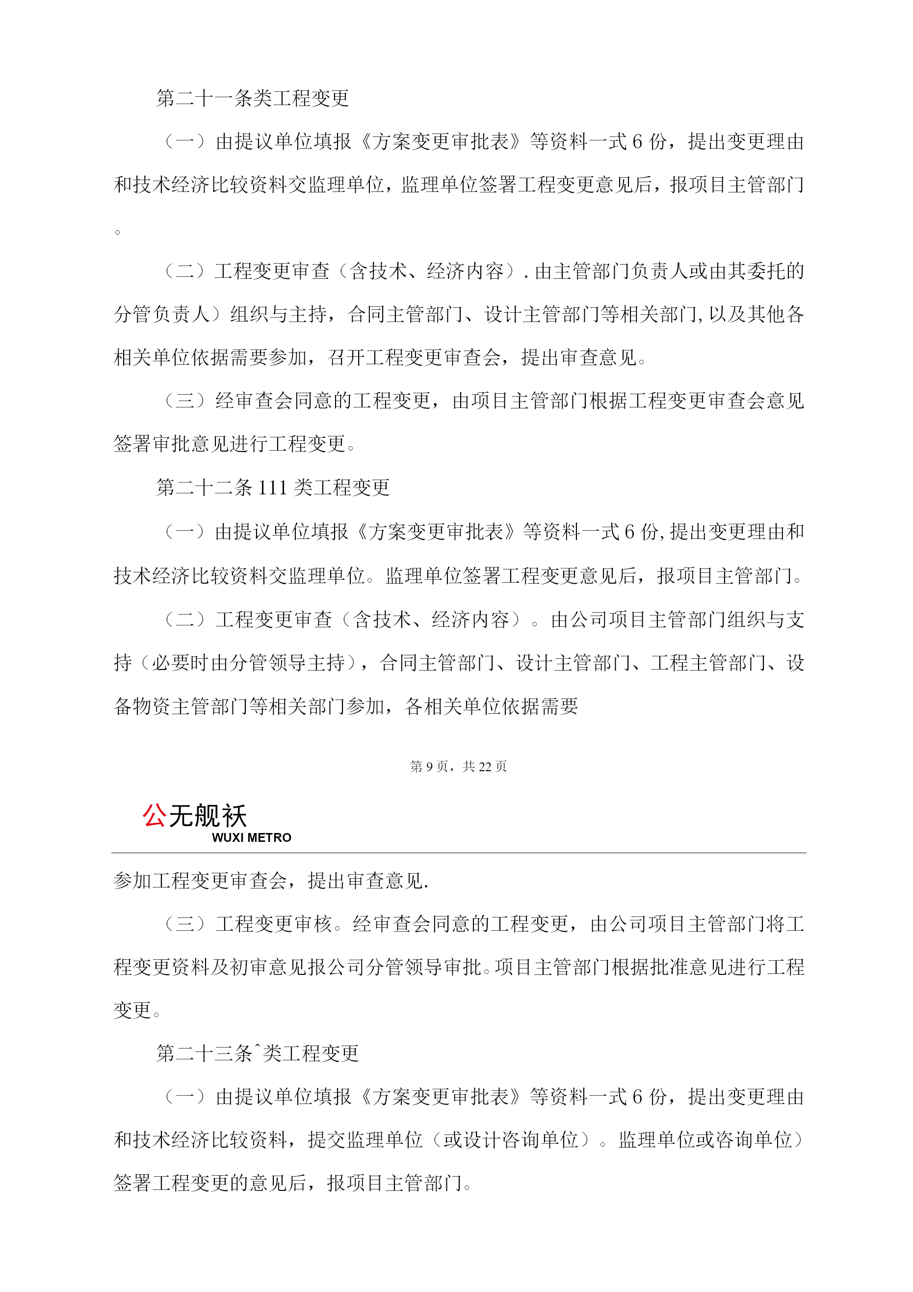 公无舰袄WUXIMETRO制度信息表所属:无锡地铁集团有限公司编号:JT-SW—09版本号:2。0密级:通用类级别:三级会签部门:设备物资部、工程部、合同部、安全质量部、财务部、信息管理部、规划设计部、企业管理部规章制度名称:机电安装及装饰装修工程变更管理办法编制人:田华审核人:陶杰部门负责人:黄少熔分管领导:刘书斌董事长:徐政主办部门:设备物资部发布日期:废止日期:发布范围:设备物资部、工程部、合同部、安全质量部、规划设计部、财务部、信息管理部、企业管理部等及各参建单位更新记录版本编制/修订日期修订内容发布日期备注1。02012。02.01新建2012.3202。02013。02。28格式修订,公无舰袄WUXIMETRO航电安装及装饰装修工程变更管理办法第一章总则第一条为规范无锡地铁集团有限公司(以下简称公司、业主)所承担的建设工程的设备安装及装饰装修工程变更管理工作,促进无锡地铁工程建设的规范、有效开展,依据无锡市建设工程的管理规定,结合公司建设管理实际情况,制定本办法。第二条本办法所称工程变更,系指施工图经公司核准提交承包商后至工程正式验收前变更施工图,或改变原合同性质、增加或减少合同内容的活动.对于招标图与施工图之间的工程量差异,以及图纸会审引起的施工图工程量变化,可直接进行计量,不按本工程变更处理。经审核批准的施工图,任何单位和个人不得擅自变更,确需变更的,依据公司相关办法进行。第三条工程变更必须严格执行国家工程建设强制性标准,确保工程安全、质量和使用功能。第四条工程变更原则上应坚持“先批准,后变更;先设计,后施工”的方针政策.未经批准自行变更和施工的要承担全部责任,并不予以验收和计量。对施工过程中发现现场情况与设计不符时,承包商应及时主动提出工程变更建议.第五条工程变更必须深入调查、充分论证,一次变更到位,避免“反复变更”即同一工点或地段或部位因一个初始诱因发生2次或2次以上且可预见属于同一变更内容的变更,因变更引起的其他专业的变更需要单独申请的不属此列).第六条本办法中的工程变更特指风水电、车站附属设备、供电、,公无舰袄WUXIMETRO弱电、车辆段工艺设备及装饰装修等工程的变更。因轨道工程类似于土建工程,因此轨道工程按土建工程变更管理办法执行。第二章工程变更分类第七条根据地铁工程实际,工程变更分为I类、II类、III类、IV类。第八条工程变更一次增减投资在5万元(不含)以下的为【类工程变更。此类变更由项目主管部门科室负责人组织与主持(必要时由部门分管负责人主持),各相关单位和部门依据需要参加施工现场洽商会,形成洽商纪要.对于工程变更一次增减投资在5千元(不含)以下的,该洽商纪要(洽商单)即可作为工程变更的依据,项目主管部门依据洽商纪要(洽商单)组织实施并进行计量。对于工程变更一次增减投资在5万元(不含)以下、5千元含)以上的,该洽商纪要(洽商单)作为方案变更的依据,进入变更审批流程,此类变更需经主管部门分管负责人(或其委托的室负责人)审批.第九条工程变更一次增减投资在50万元(不含)以下、5万(含)以上的变更为【【类工程变更。此类变更由主管部门负责人(或其委托的分管负责人)组织与主持,合同主管部门、设计主管部门、工程主管部门、设备物资主管部门等相关部门参加,各相关单位依据需要参加,形成会议纪要。该会议纪要作为方案变更的依据,变更申请单位填写方案变更审批表后,进入变更审批流程,此类变更需经主管部门负责人(或其委托的分管负责人)审批。第十条III类工程变更(一)符合下列条件之一者为III类工程变更:,公无舰袄WUXIMETRO1、出现与其它23个专业的功能性连带变更。2、工程变更一次增减投资在50万元(含)以上到1万元(不含)以下的.第十一条此类变更由工程主管部门负责人组织与主持(必要时由分管领导主持),合同主管部门、设计主管部门、工程主管部门、设备物资主管部门等相关部门参加,各相关单位、设计、监理、咨询依据需要参加,形成会议纪要。会议纪要将作为方案变更的依据,变更申请单位填写方案变更审批表后,进入变更审批流程,此类变更需经公司分管领导审批。第十二条^类工程变更:(一)符合下列条件之一者为IV类工程变更:1、【类工程变更条件出现超过与其它3个专业以上的功能性连带变更。2、工程变更一次增减投资在1万元(含)以上的.(二)此类变更由设计主管部门组织与主持(必要时由公司技术委员会主持),合同主管部门、工程主管部门、设备物资主管部门等相关部门参加,各相关单位、设计、监理、咨询依据需要参加,形成会议纪要。该会议纪要作为方案变更的依据,变更申请单位填写方案变更审批表后,进入变更审批流程,此类变更需经主管领导(或其委托的分管领导)审批。第三章职责与分工