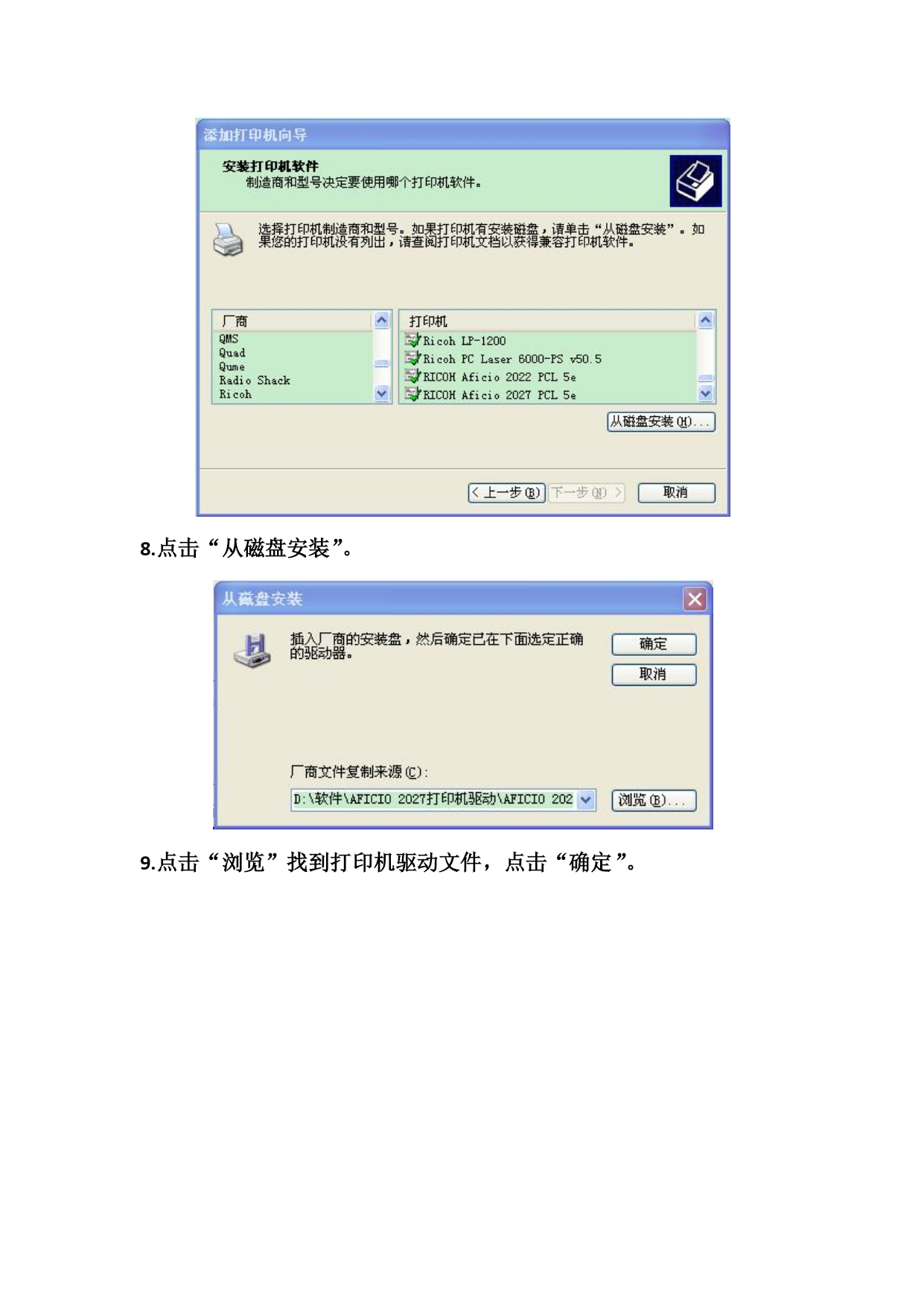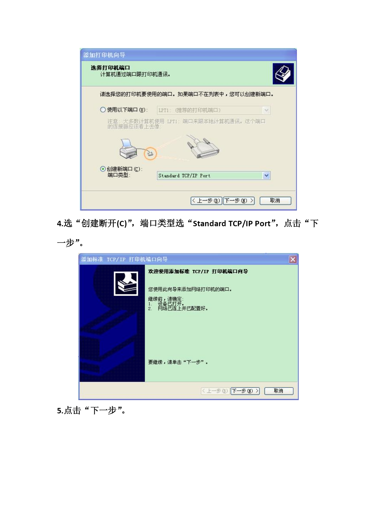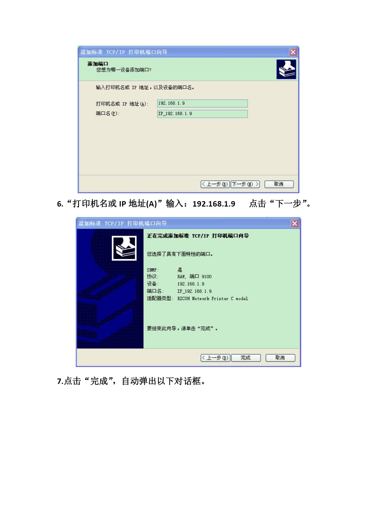 添加打印机教程1.开始–设置–打印机和传真–添加打印机。2.点击“下一步”。3.“选择连接到此计算机的本地打印机(L)”,去掉“自动检测并按照即插即用打印机(A)”前面的“√”,点击“下一步”。4.选“创建断开(C)”,端口类型选“StandardTCP/IPPort”,点击“下一步”。5.点击“下一步”。6.“打印机名或IP地址(A)”输入:192.168.1.9点击“下一步”。7.点击“完成”,自动弹出以下对话框。8.点击“从磁盘安装”。9.点击“浏览”找到打印机驱动文件,点击“确定”。10.默认选择,点击“下一步”。11.选“替换现有的驱动程序”,点击“下一步”。12.输入打印机名,“是否希望将这台打印机设置为默认打印机?”选“是”,点击“下一步”。13.选“不共享这台打印机”,点击“下一步”。14.“要打印测试页吗?”选“是”,点击“下一步”。15.点击“完成”。到此步打印机的添加完成。