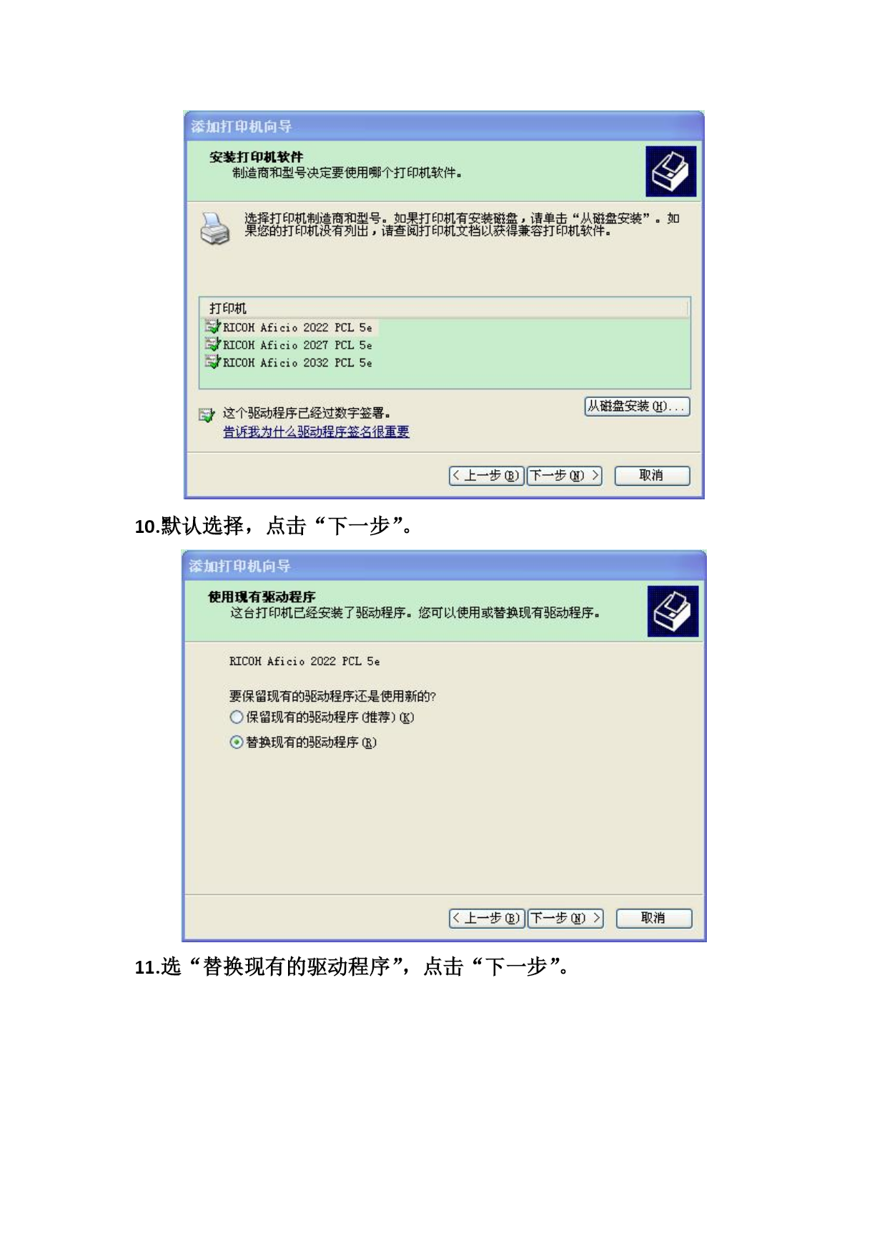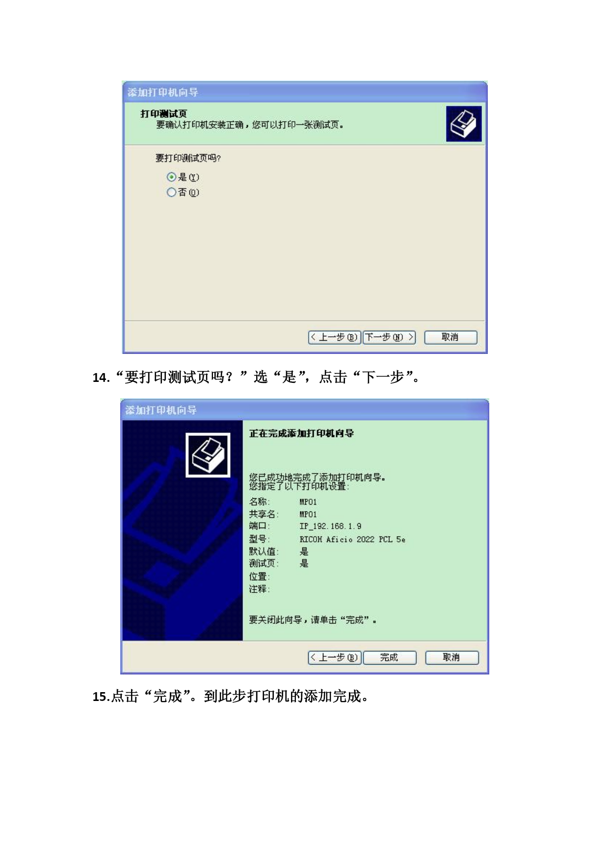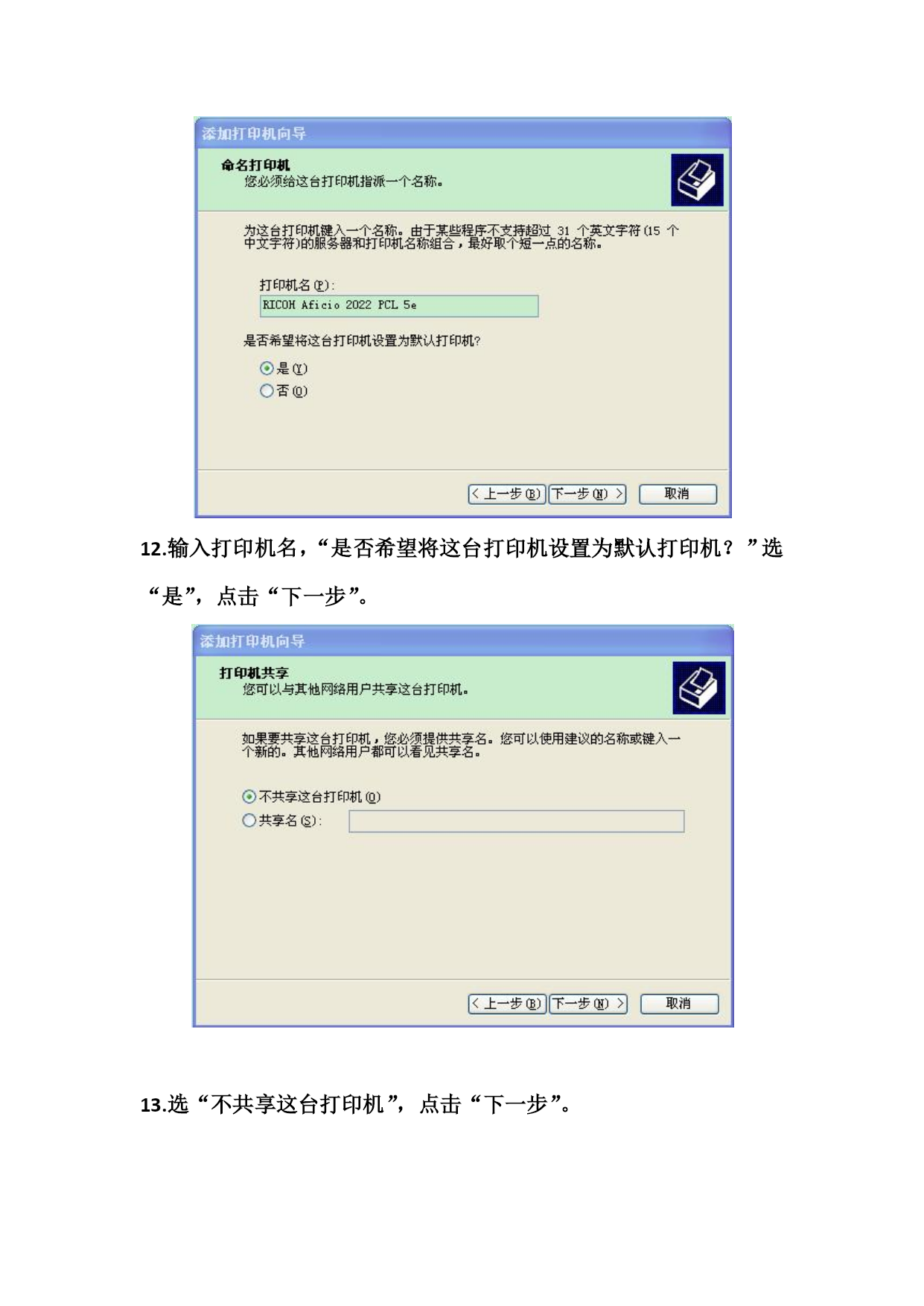添加打印机教程1.开始–设置–打印机和传真–添加打印机。2.点击“下一步”。3.“选择连接到此计算机的本地打印机(L)”,去掉“自动检测并按照即插即用打印机(A)”前面的“√”,点击“下一步”。4.选“创建断开(C)”,端口类型选“StandardTCP/IPPort”,点击“下一步”。5.点击“下一步”。6.“打印机名或IP地址(A)”输入:192.168.1.9点击“下一步”。7.点击“完成”,自动弹出以下对话框。8.点击“从磁盘安装”。9.点击“浏览”找到打印机驱动文件,点击“确定”。10.默认选择,点击“下一步”。11.选“替换现有的驱动程序”,点击“下一步”。12.输入打印机名,“是否希望将这台打印机设置为默认打印机?”选“是”,点击“下一步”。13.选“不共享这台打印机”,点击“下一步”。14.“要打印测试页吗?”选“是”,点击“下一步”。15.点击“完成”。到此步打印机的添加完成。