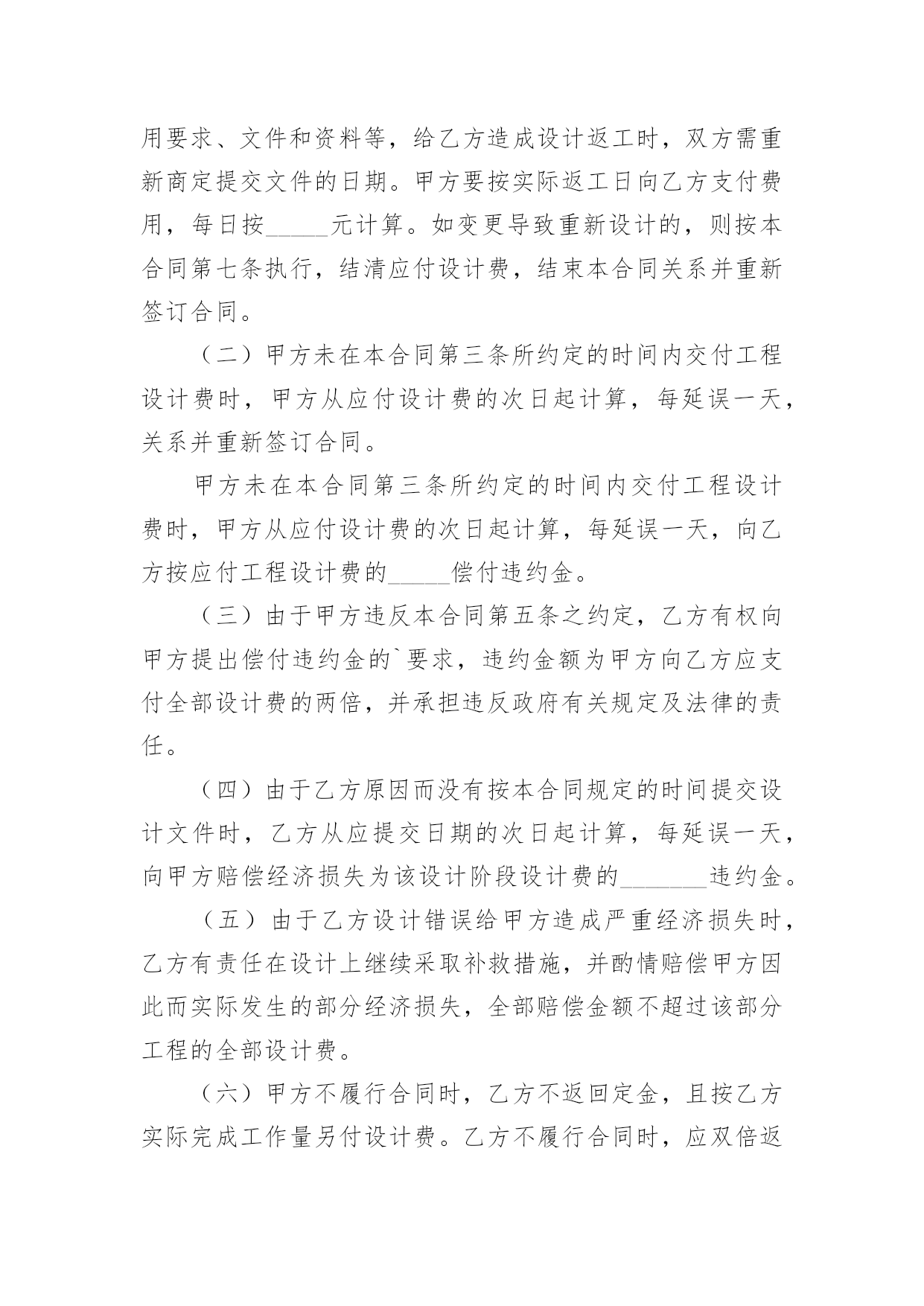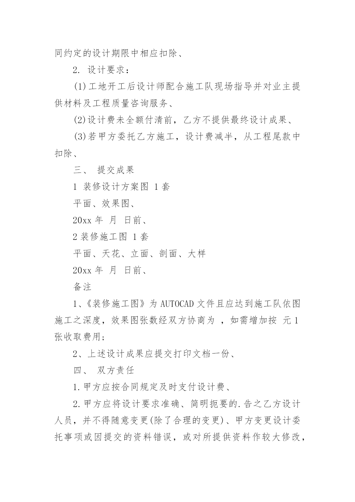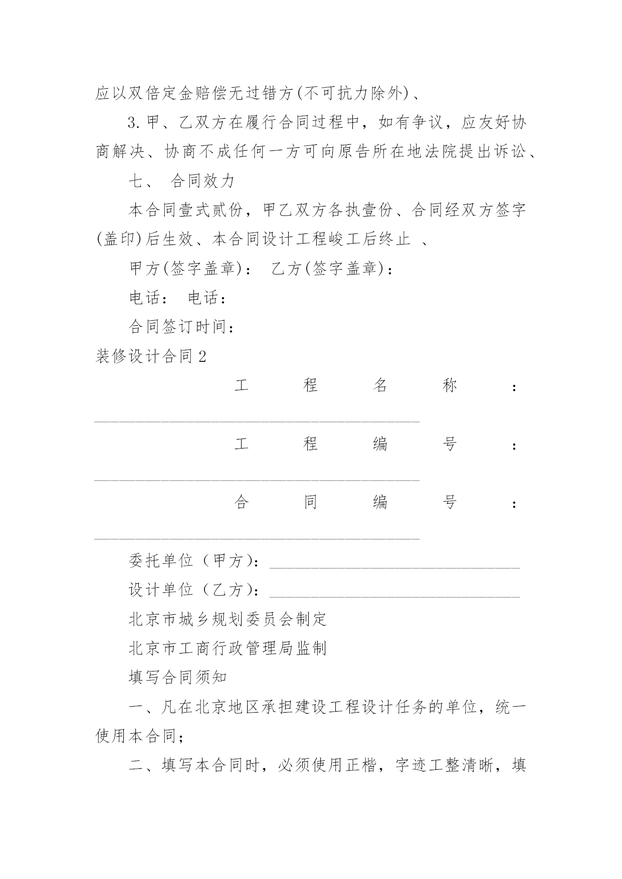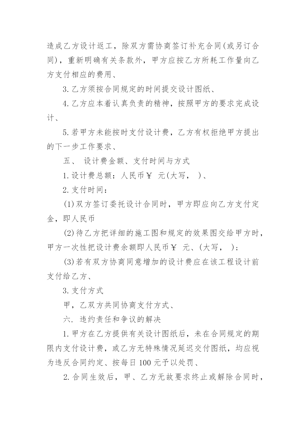装修设计合同装修设计合同集锦15篇在当今社会,人们对合同愈发重视,合同的法律效力与日俱增,正常情况下,签订合同必须经过规定的方式。拟定合同的注意事项有许多,你确定会写吗?下面是小编帮大家整理的装修设计合同,仅供参考,欢迎大家阅读。装修设计合同1委托方:(以下简称甲方)受托方:(以下简称乙方)甲方因装修工程的需要,委托乙方进行室内装修设计工作,经双方协商一致,签订本合同、一、设计工程概况1.设计工程名称:、2.设计工程地点:、3.设计工程面积约:平方米、4.设计工程范围:、二、设计时间1.设计期限:设计期限为个工作日,从乙方收到甲方支付的定金后开始计算,到向甲方交付全套设计图纸之日为止、因甲方变更设计要求或对乙方意见未及时答复,其耽误的时间应从合同约定的设计期限中相应扣除、2.设计要求:(1)工地开工后设计师配合施工队现场指导并对业主提供材料及工程质量咨询服务、(2)设计费未全额付清前,乙方不提供最终设计成果、(3)若甲方委托乙方施工,设计费减半,从工程尾款中扣除、三、提交成果1装修设计方案图1套平面、效果图、20xx年月日前、2装修施工图1套平面、天花、立面、剖面、大样20xx年月日前、备注1、《装修施工图》为AUTOCAD文件且应达到施工队依图施工之深度,效果图张数经双方协商为,如需增加按元1张收取费用;2、上述设计成果应提交打印文档一份、四、双方责任1.甲方应按合同规定及时支付设计费、2.甲方应将设计要求准确、简明扼要的.告之乙方设计人员,并不得随意变更(除了合理的变更)、甲方变更设计委托事项或因提交的资料错误,或对所提供资料作较大修改,造成乙方设计返工,除双方需协商签订补充合同(或另订合同),重新明确有关条款外,甲方应按乙方所耗工作量向乙方支付相应的费用、3.乙方须按合同规定的时间提交设计图纸、4.乙方应本着认真负责的精神,按照甲方的要求完成设计、5.若甲方未能按时支付设计费,乙方有权拒绝甲方提出的下一步工作要求、五、设计费金额、支付时间与方式1.设计费总额:人民币¥元(大写,)、2.支付时间:(1)双方签订委托设计合同时,甲方即应向乙方支付定金,即人民币(2)待乙方把详细的施工图和规定的效果图交给甲方时,甲方一次性把设计费余额即人民币¥元、(大写,);(3)若有双方协商同意增加的设计费应在该工程设计前支付给乙方、3.支付方式甲,乙双方共同协商支付方式、六.违约责任和争议的解决1.甲方在乙方提供有关设计图纸后,未在合同规定的期限内支付设计费,或乙方无特殊情况延迟交付图纸,均应视为违反合同约定、按每日100元予以处罚、2.合同生效后,甲、乙方无故要求终止或解除合同时,应以双倍定金赔偿无过错方(不可抗力除外)、3.甲、乙双方在履行合同过程中,如有争议,应友好协商解决、协商不成任何一方可向原告所在地法院提出诉讼、七、合同效力本合同壹式贰份,甲乙双方各执壹份、合同经双方签字(盖印)后生效、本合同设计工程峻工后终止、甲方(签字盖章):乙方(签字盖章):电话:电话:合同签订时间:装修设计合同2工程名称:_______________________________________工程编号:_______________________________________合同编号:_______________________________________委托单位(甲方):______________________________设计单位(乙方):______________________________北京市城乡规划委员会制定北京市工商行政管理局监制填写合同须知一、凡在北京地区承担建设工程设计任务的单位,统一使用本合同;二、填写本合同时,必须使用正楷,字迹工整清晰,填写内容准确齐全;三、本合同中的附件3"委托设计项目表",由设计单位根据工程特点列表填写,附于合同后,双方加盖合同章和骑缝章;四、本合同不适用外资、中外合资、中外合作设计项目;五、本合同由北京市勘察设计管理处统一单位编号;六、本合同由北京市城乡规划委员会制定,北京市工商行政管理局监制,任何单位不得自行翻印。委托单位:______________________________(以下简称甲方)设计单位:______________________________(以下简称乙方)根据《中华人民共和国经济合同法》、《建筑工程勘察设计合同条例》,以及北京市的有关规定,经双方协商,签订本合同,并共同履行。第一条工程项目甲方委托乙方承担以下工程设计任务:工程名称:_____________________________工程地址:_____________________________工程任务批准文件:__________________________(见附件1);北京市城