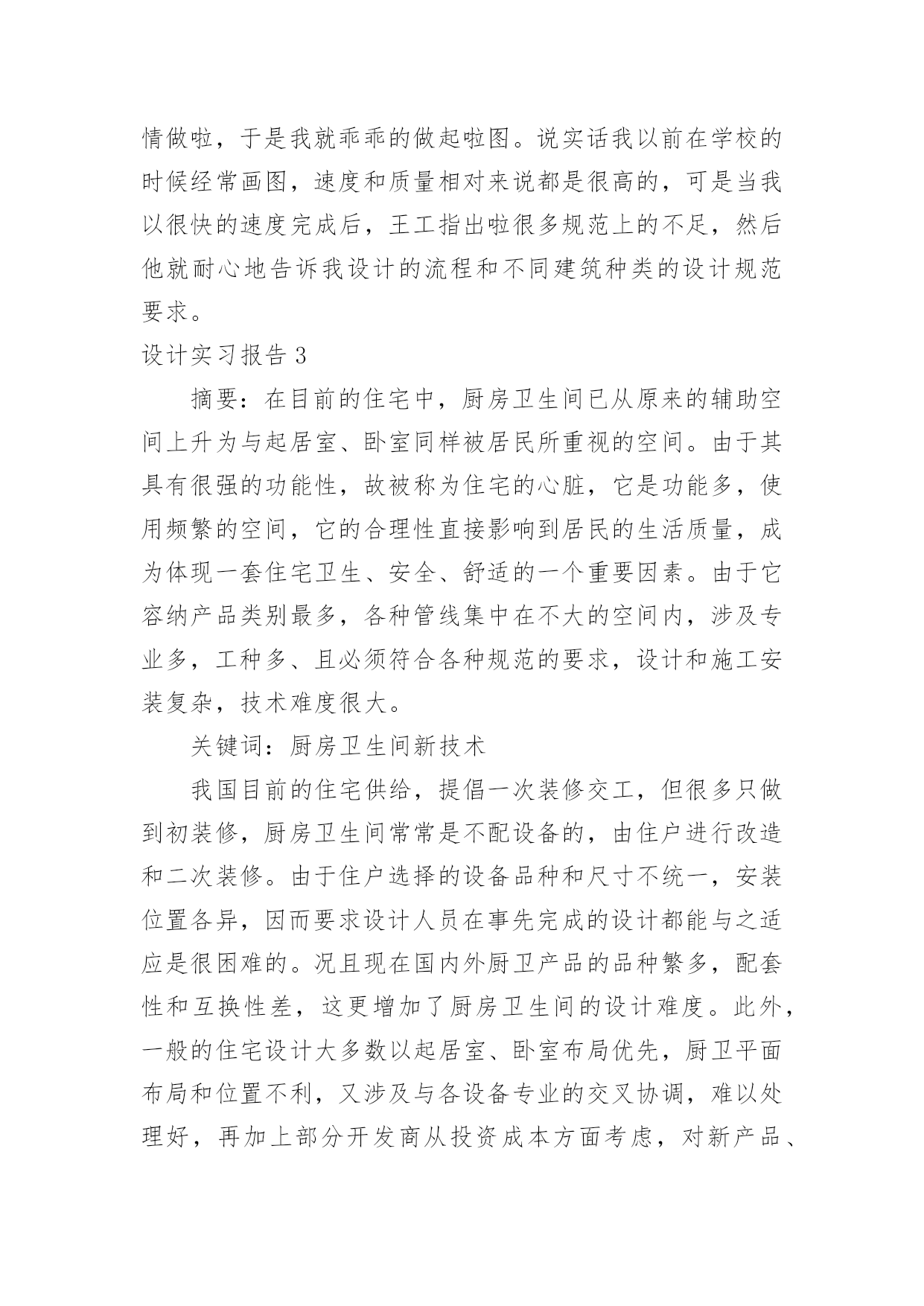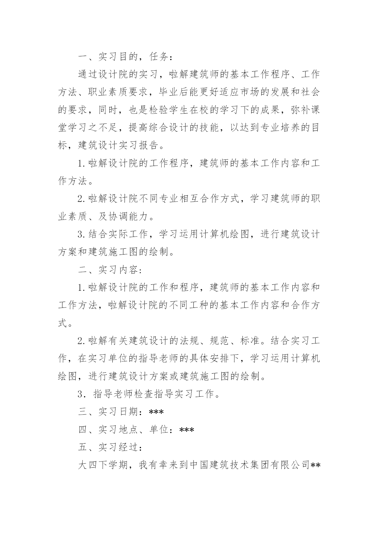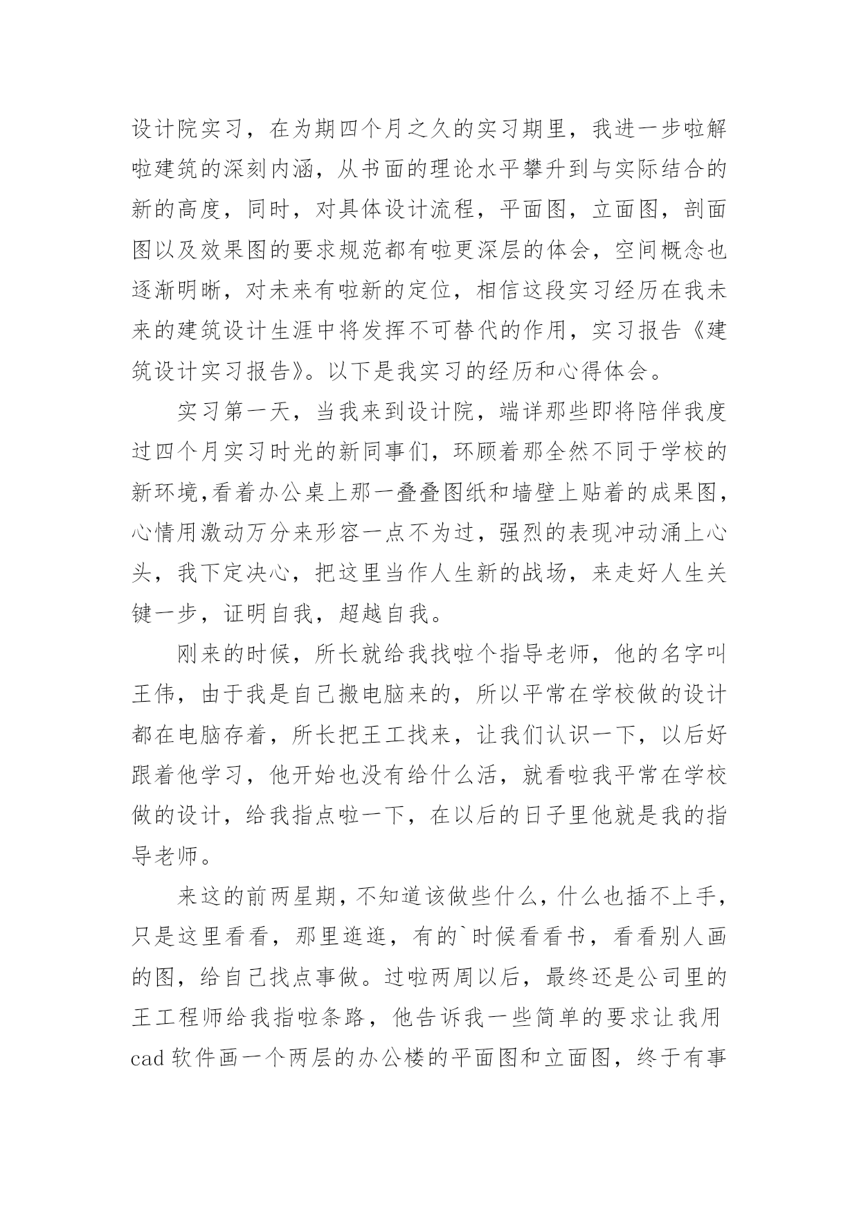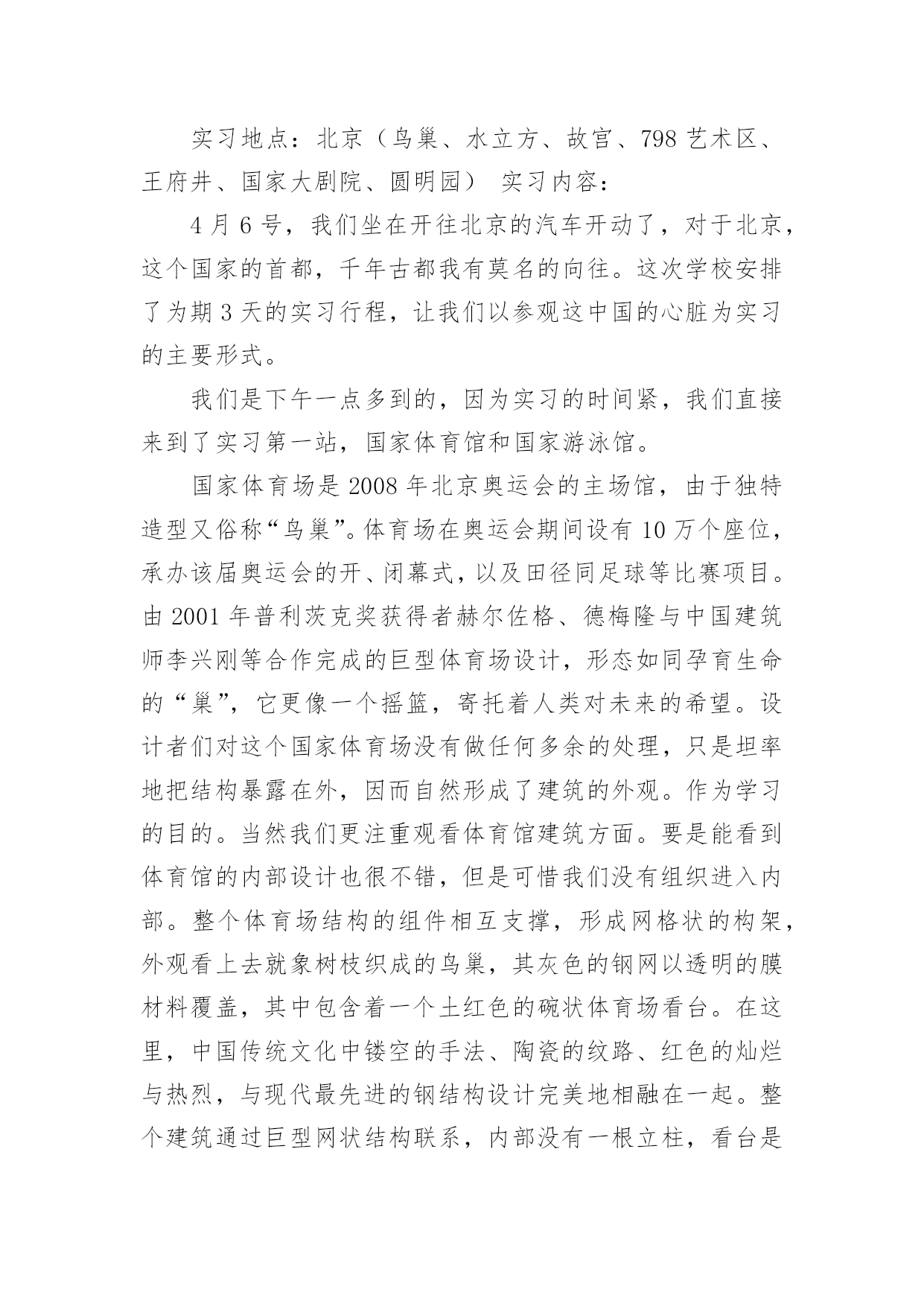 设计实习报告【推荐】设计实习报告在生活中,报告十分的重要,报告包含标题、正文、结尾等。相信很多朋友都对写报告感到非常苦恼吧,以下是小编为大家收集的设计实习报告,仅供参考,大家一起来看看吧。设计实习报告1山东轻工业学院旅游空间实习报告院系名称艺术设计学院学生姓名王飞专业班级环艺学号指导教师二〇xx年四月六日实习情况一览表实习目的:1.通过对鸟巢、水立方、故宫、798艺术区、圆明园、王府井等地的实习参观,实习考察北京建筑、旅游商业空间、艺术创作空间和皇家园林等,开阔眼界,了解北京的地域文化和地方特色。实习时间:20xx年4月6号————4月8号实习地点:北京(鸟巢、水立方、故宫、798艺术区、王府井、国家大剧院、圆明园)实习内容:4月6号,我们坐在开往北京的汽车开动了,对于北京,这个国家的首都,千年古都我有莫名的向往。这次学校安排了为期3天的实习行程,让我们以参观这中国的心脏为实习的主要形式。我们是下午一点多到的,因为实习的时间紧,我们直接来到了实习第一站,国家体育馆和国家游泳馆。国家体育场是2008年北京奥运会的主场馆,由于独特造型又俗称“鸟巢”。体育场在奥运会期间设有10万个座位,承办该届奥运会的开、闭幕式,以及田径同足球等比赛项目。由2001年普利茨克奖获得者赫尔佐格、德梅隆与中国建筑师李兴刚等合作完成的巨型体育场设计,形态如同孕育生命的“巢”,它更像一个摇篮,寄托着人类对未来的希望。设计者们对这个国家体育场没有做任何多余的处理,只是坦率地把结构暴露在外,因而自然形成了建筑的外观。作为学习的目的。当然我们更注重观看体育馆建筑方面。要是能看到体育馆的内部设计也很不错,但是可惜我们没有组织进入内部。整个体育场结构的组件相互支撑,形成网格状的构架,外观看上去就象树枝织成的鸟巢,其灰色的钢网以透明的膜材料覆盖,其中包含着一个土红色的碗状体育场看台。在这里,中国传统文化中镂空的手法、陶瓷的纹路、红色的灿烂与热烈,与现代最先进的钢结构设计完美地相融在一起。整个建筑通过巨型网状结构联系,内部没有一根立柱,看台是一个完整的没有任何遮挡的碗状造型,如同一个巨大的容器,赋予体育场以不可思议的戏剧性和无与伦比的震撼力。这种均匀而连续的环形也将使观众获得最佳的视野,带动他们的兴奋情绪,并激励运动员向更快、更高、更强冲刺。在这里,人,真正被赋予中心的地位。“鸟巢”外形结构主要由巨大的'门式钢架组成,国家体育场建筑顶面呈鞍形,在保持“鸟巢”建筑风格不变的前提下,新设计方案对结构布局、构建截面形式、材料利用率等问题进行了较大幅度的调整与优化。钢结构大量采用由钢板焊接而成的箱形构件,交叉布置的主桁架与屋面及立面的次结构一起形成了“鸟巢”的特殊建筑造型。主看台部分采用钢筋混凝土框架,与大跨度钢结构完全脱开。国家游泳中心又被称为“水立方”,位于北京奥林匹克公园内,是北京为2008年夏季奥运会修建的主游泳馆,也是2008年北京奥运会标志性建筑物之一。其与国家体育馆分列北京城市中轴线北端的两侧,共同形成相对完整的北京历史文化名城形象。在奥林匹克公园内我们能看到的出名建筑除了这俩标志建筑当然还有盘古大观和玲珑塔。不过我们看到的均是外观建筑。参观完了奥林匹克公园。我们就坐车回到宾馆休息。为我们第二天去故宫保存精力。第二天我们早上来到了天安门广场,稍作休息进入了故宫。设计实习报告2一、实习目的,任务:通过设计院的实习,啦解建筑师的基本工作程序、工作方法、职业素质要求,毕业后能更好适应市场的发展和社会的要求,同时,也是检验学生在校的学习下的成果,弥补课堂学习之不足,提高综合设计的技能,以达到专业培养的目标,建筑设计实习报告。1.啦解设计院的工作程序,建筑师的基本工作内容和工作方法。2.啦解设计院不同专业相互合作方式,学习建筑师的职业素质、及协调能力。3.结合实际工作,学习运用计算机绘图,进行建筑设计方案和建筑施工图的绘制。二、实习内容:1.啦解设计院的工作和程序,建筑师的基本工作内容和工作方法,啦解设计院的不同工种的基本工作内容和合作方式。2.啦解有关建筑设计的法规、规范、标准。结合实习工作,在实习单位的指导老师的具体安排下,学习运用计算机绘图,进行建筑设计方案或建筑施工图的绘制。3.指导老师检查指导实习工作。三、实习日期:***四、实习地点、单位:***五、实习经过:大四下学期,我有幸来到中国建筑技术集团有限公司**设计院实习,在为期四个月之久的实习期里,我进一步啦解啦建筑的深刻内涵,从书面的理论水平攀升到与实际结合的新的高度,同时,对具体设计流程,平面图,立面图,剖面图以及效果图的要求规范都有啦更深层的体会,空间概念也逐渐明晰,对未来有啦新的定位,相信这段实习经历在我未来的建筑设计生涯中将发挥不可替代的作用,实习报告《建筑设计实习报告》。以下是我实习的经历和心得体