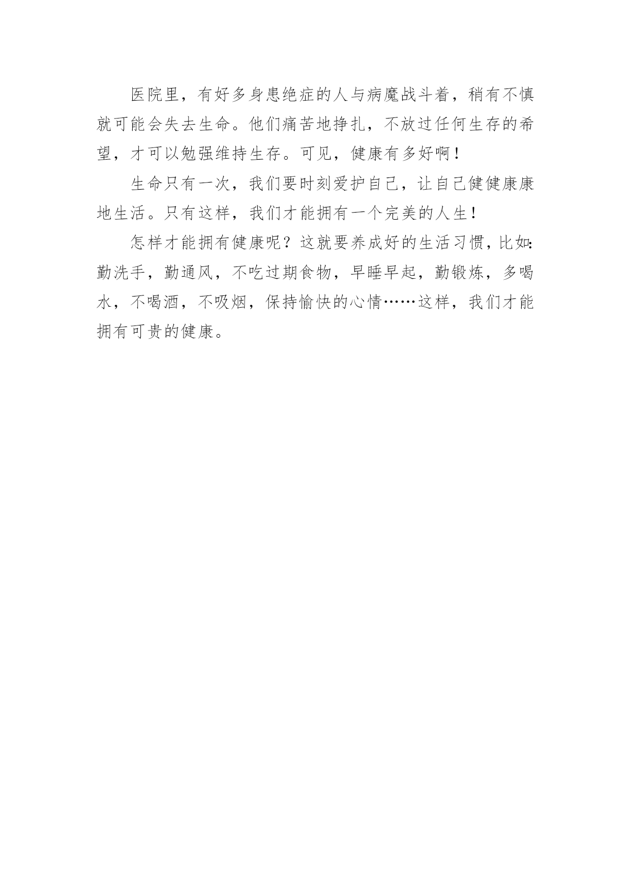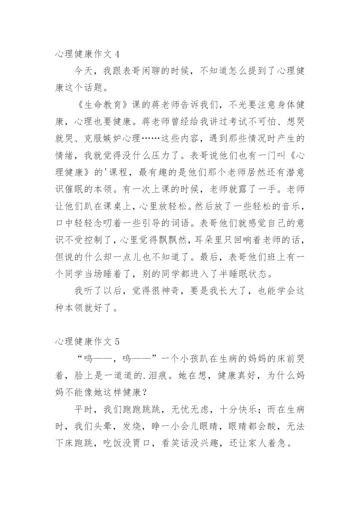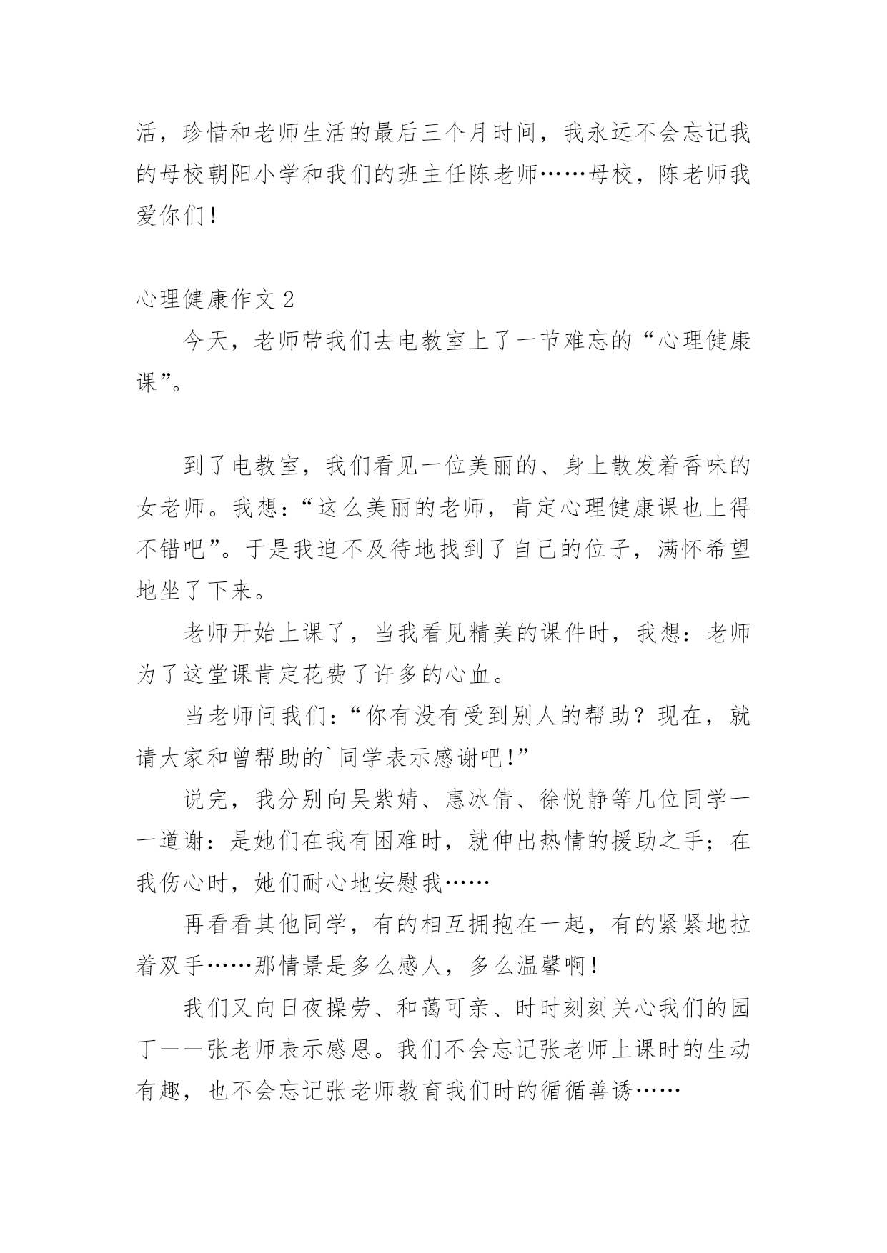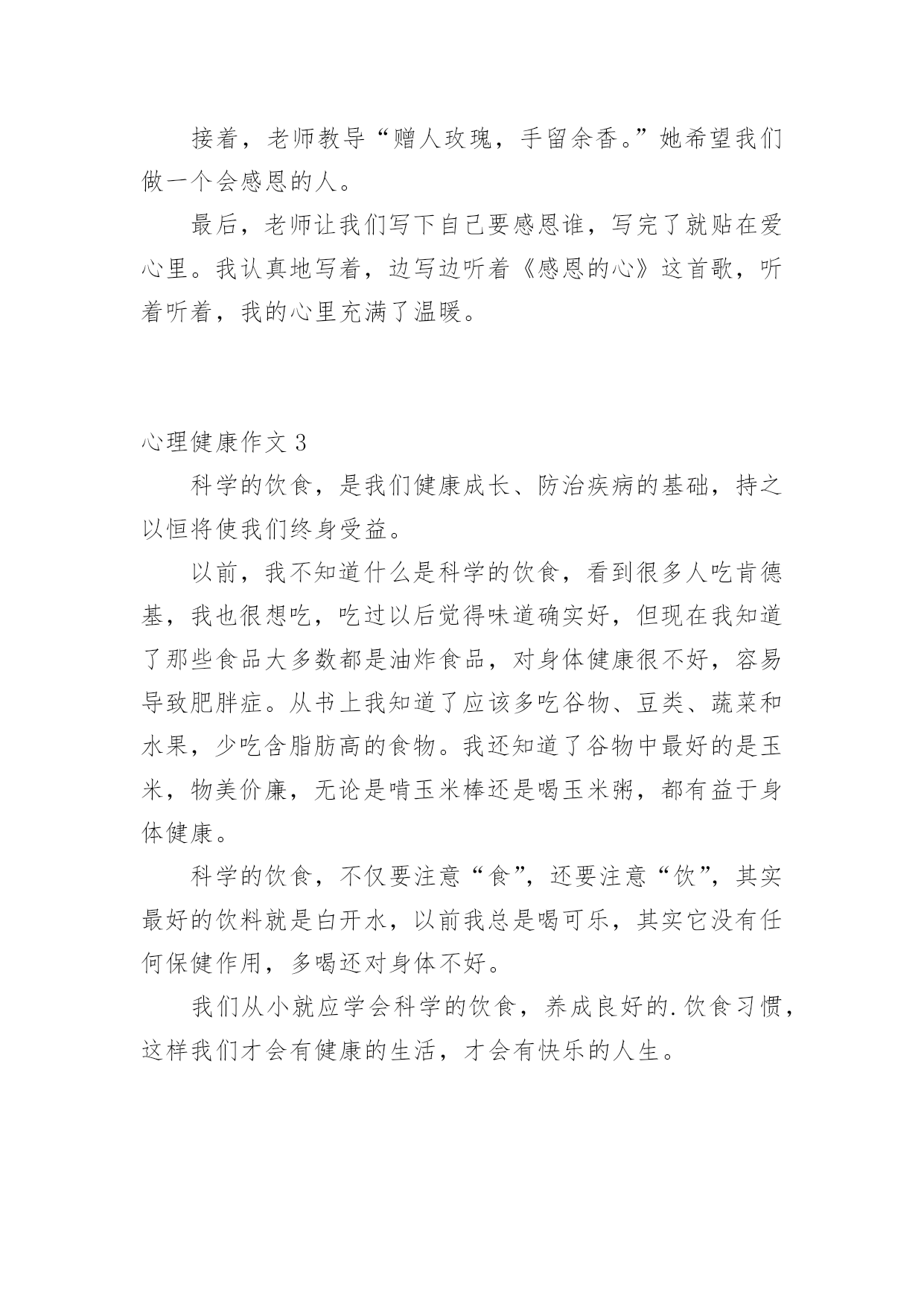 心理健康作文心理健康作文5篇【合集】在平凡的学习、工作、生活中,大家都不可避免地要接触到作文吧,作文是人们把记忆中所存储的有关知识、经验和思想用书面形式表达出来的记叙方式。那么,怎么去写作文呢?下面是小编收集整理的心理健康作文,欢迎阅读,希望大家能够喜欢。心理健康作文1今天下午的第二节课是心理健康课,刚开始上课的时候老师领我们玩了一个顶球游戏,游戏规则是:男女双方各出一人,把球顶在头上,想办法不让球掉下来,可以使用任何道具,只要球不掉下来,最后看谁坚实的时间长,谁就获胜。最后我们女生派出陈新巧出去比赛,男生派出申东旭出来比赛,最后我们女生赢了!游戏玩完以后,老师说:“你们在学校的时间仅仅有3个月了,好好珍惜吧!你们陈老师教了你们六年,你们老师说你们是为了你们好,你们不要记仇。那天你们在给全校学生演示进教室,完事以后我们所有课任老师在办公室里说:”这一届的`六年级学生真不错,他们要是毕业我们会很舍不得的。“听了以后我哭了,我要好好珍惜这三个月的小学美好生活,珍惜和老师生活的最后三个月时间,我永远不会忘记我的母校朝阳小学和我们的班主任陈老师……母校,陈老师我爱你们!心理健康作文2今天,老师带我们去电教室上了一节难忘的“心理健康课”。到了电教室,我们看见一位美丽的、身上散发着香味的女老师。我想:“这么美丽的老师,肯定心理健康课也上得不错吧”。于是我迫不及待地找到了自己的位子,满怀希望地坐了下来。老师开始上课了,当我看见精美的课件时,我想:老师为了这堂课肯定花费了许多的心血。当老师问我们:“你有没有受到别人的帮助?现在,就请大家和曾帮助的`同学表示感谢吧!”说完,我分别向吴紫婧、惠冰倩、徐悦静等几位同学一一道谢:是她们在我有困难时,就伸出热情的援助之手;在我伤心时,她们耐心地安慰我……再看看其他同学,有的相互拥抱在一起,有的紧紧地拉着双手……那情景是多么感人,多么温馨啊!我们又向日夜操劳、和蔼可亲、时时刻刻关心我们的园丁――张老师表示感恩。我们不会忘记张老师上课时的生动有趣,也不会忘记张老师教育我们时的循循善诱……接着,老师教导“赠人玫瑰,手留余香。”她希望我们做一个会感恩的人。最后,老师让我们写下自己要感恩谁,写完了就贴在爱心里。我认真地写着,边写边听着《感恩的心》这首歌,听着听着,我的心里充满了温暖。心理健康作文3科学的饮食,是我们健康成长、防治疾病的基础,持之以恒将使我们终身受益。以前,我不知道什么是科学的饮食,看到很多人吃肯德基,我也很想吃,吃过以后觉得味道确实好,但现在我知道了那些食品大多数都是油炸食品,对身体健康很不好,容易导致肥胖症。从书上我知道了应该多吃谷物、豆类、蔬菜和水果,少吃含脂肪高的食物。我还知道了谷物中最好的是玉米,物美价廉,无论是啃玉米棒还是喝玉米粥,都有益于身体健康。科学的饮食,不仅要注意“食”,还要注意“饮”,其实最好的饮料就是白开水,以前我总是喝可乐,其实它没有任何保健作用,多喝还对身体不好。我们从小就应学会科学的饮食,养成良好的.饮食习惯,这样我们才会有健康的生活,才会有快乐的人生。心理健康作文4今天,我跟表哥闲聊的时候,不知道怎么提到了心理健康这个话题。《生命教育》课的蒋老师告诉我们,不光要注意身体健康,心理也要健康。蒋老师曾经给我讲过考试不可怕、想哭就哭、克服嫉妒心理……这些内容,遇到那些情况时产生的情绪,我就觉得没什么压力了。表哥说他们也有一门叫《心理健康》的'课程,最有趣的是他们那个老师居然还有潜意识催眠的本领。有一次上课的时候,老师就露了一手。老师让他们趴在课桌上,心里放轻松。然后放了一些轻松的音乐,口中轻轻念叨着一些引导的词语。表哥他们就感觉自己的意识不受控制了,心里觉得飘飘然,耳朵里只回响着老师的话,但说的什么却一点儿也不知道了。最后,表哥他们班上有一个同学当场睡着了,别的同学都进入了半睡眠状态。我听了以后,觉得很神奇,要是我长大了,也能学会这种本领就好了。心理健康作文5“呜——,呜——”一个小孩趴在生病的妈妈的床前哭着,脸上是一道道的.泪痕。她在想,健康真好,为什么妈妈不能像她这样健康?平时,我们跑跑跳跳,无忧无虑,十分快乐;而在生病时,我们头晕,发烧,睁一小会儿眼睛,眼睛都会酸,无法下床跑跳,吃饭没胃口,看笑话没兴趣,还让家人着急。医院里,有好多身患绝症的人与病魔战斗着,稍有不慎就可能会失去生命。他们痛苦地挣扎,不放过任何生存的希望,才可以勉强维持生存。可见,健康有多好啊!生命只有一次,我们要时刻爱护自己,让自己健健康康地生活。只有这样,我们才能拥有一个完美的人生!怎样才能拥有健康呢?这就要养成好的生活习惯,比如:勤洗手,勤通风,不吃过期食物,早睡早起,勤锻炼,多喝水,不喝酒,不吸烟,保持愉快的心情……这样,我们才能拥有可贵的健康。