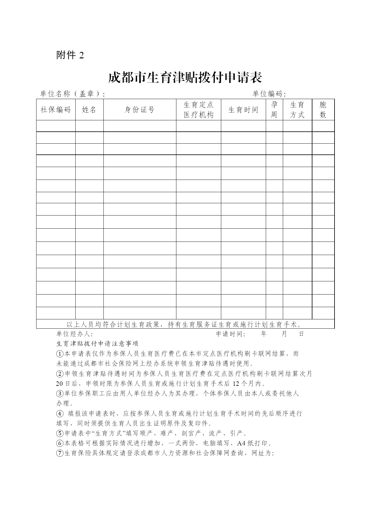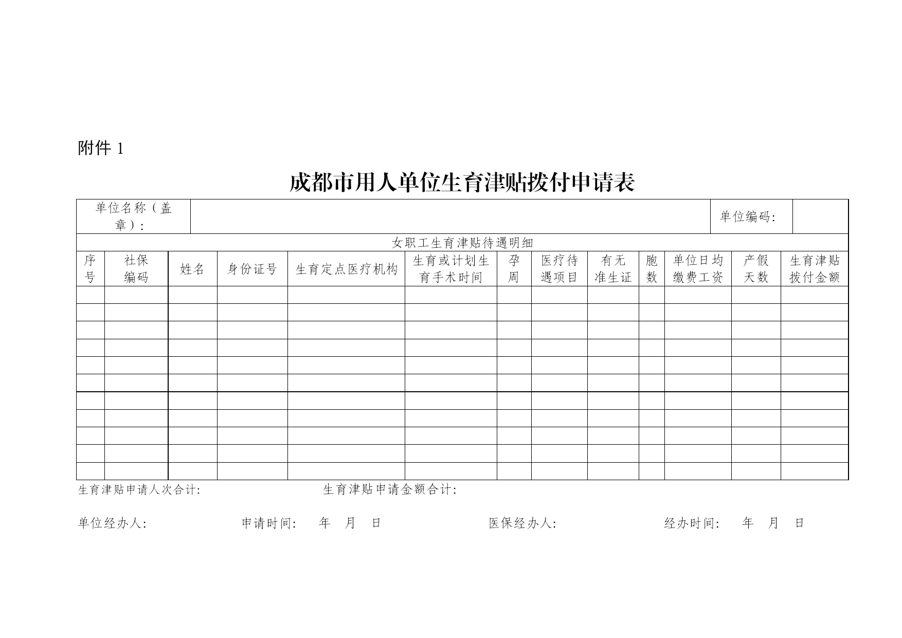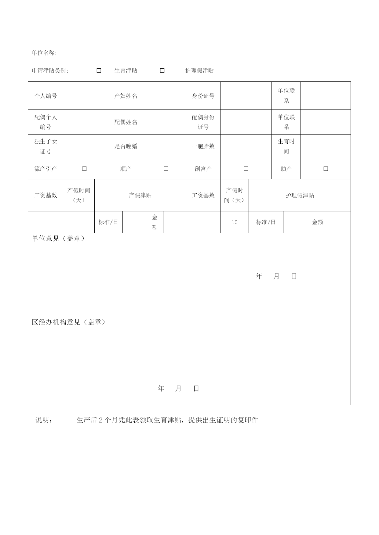 生育保险生育津贴表格最新文档(可以直接使用,可编辑最新文档,欢迎下载)生育保险生育津贴、护理假津贴结算单单位名称:申请津贴类别:□生育津贴□护理假津贴个人编号产妇姓名身份证号单位联系配偶个人编号配偶姓名配偶身份证号单位联系独生子女证号是否晚婚一胞胎数生育时间流产引产□顺产□剖宫产□助产□工资基数产假时间(天)产假津贴工资基数产假时间(天)护理假津贴标准/日金额10标准/日金额单位意见(盖章)年月日区经办机构意见(盖章)年月日说明:生产后2个月凭此表领取生育津贴,提供出生证明的复印件生育津贴如何申报?答:区内的定点医院:产假结束并医院与社保经办机构结账后,参保人员所在单位应填写《武汉市生育津贴、护理假津贴申报审核表》,申报相关的津贴。并持以下资料:1、生育津贴:医学出生证明,出院小结,本人身份证,结婚证的原件及复印件。2、流产(引产)津贴:人流病历、结婚证,本人身份证,三项资料的原件及复印件。3、护理假津贴:医学出生证明、本人身份证及结婚证的原件及复印件。4、以上业务申报时单位必须提供盖有财务章的收款收据,收款收据的背面应注明单位名称﹙全称﹚、账号及开户银行,经办人的联系方式。收据的排头写:武汉市东西湖区劳动保障规划财务管理中心。产假休完后申报资料,1-16日申报的资料,若资料齐全,当月30日前支付到位;17-22日申报的资料,若资料齐全,次月15日前支付。区外的定点医院:参保人员所在单位应填写《武汉市生育津贴、护理假津贴申报审核表》,开好盖有财务章的收款收据随同医疗费用资料申报生育津贴、护理假津贴申报时间?答:用人单位应在职工产假、护理假结束后三个月内凭相关证明材料到社会保险经办机构办理津贴申领手续。十、生育津贴、护理假津贴的核算标准是如何确定的?生育津贴女职工生育或者流(引)产,在下列产假时间内享受生育津贴:1、正常生育的即顺产,产假为128天,难产的,增加15天;多胞胎生育的,每多生育1个婴儿增加15天;2、妊娠不满12周流产的,产假为30天;妊娠满12周不满28周流(引)产的,产假为45天;妊娠满28周以上引产的,产假为98天。3、生育津贴日支付标准,按照女职工生育或者流(引)产上月用人单位为其缴纳生育保险费的基数除以30日计算。生育津贴=生育津贴日支付标准×产假天数护理假津贴男职工配偶生育,符合法律、法规规定的,其可享受15天的护理假津贴。男职工护理假津贴日支付标准,按照其配偶生育的上一个月用人单位为其缴纳生育保险费的基数除以30日计算。护理假津贴=护理假津贴日支付标准×护理假天数附件1成都市用人单位生育津贴拨付申请表单位名称(盖章):单位编码:女职工生育津贴待遇明细序号社保编码姓名身份证号生育定点医疗机构生育或计划生育手术时间孕周医疗待遇项目有无准生证胞数单位日均缴费工资产假天数生育津贴拨付金额生育津贴申请人次合计:生育津贴申请金额合计:单位经办人:申请时间:年月日医保经办人:经办时间:年月日备注:本表一式两份(用人单位、医保经办机构各留存一份),生育津贴最终拨付明细和金额由医保经办机构盖章确认,如有变动,以医保经办机构打印的《成都市生育津贴拨付表》为准。附件2成都市生育津贴拨付申请表单位名称(盖章):单位编码:社保编码姓名身份证号生育定点医疗机构生育时间孕周生育方式胞数以上人员均符合计划生育政策,持有生育服务证生育或施行计划生育手术。单位经办人:申请时间:年月日生育津贴拨付申请注意事项①本申请表仅作为参保人员生育医疗费已在本市定点医疗机构刷卡联网结算,而未能通过成都市社会保险网上经办系统申领生育津贴待遇时使用。②申领生育津贴待遇时间为参保人员生育医疗费在定点医疗机构刷卡联网结算次月20日后,申领时限为参保人员生育或施行计划生育手术后12个月内。③单位参保职工应由用人单位经办人为其办理,个体参保人员由本人或委托他人办理。④填报该申请表时,应按参保人员生育或施行计划生育手术时间的先后顺序进行填写,同时须提供生育人员出生证明原件及复印件。⑤申请表中“生育方式”填写顺产、难产、剖宫产、流产、引产。⑥本表格可根据实际情况进行增加,一式两份,电脑填写,A4纸打印。⑦生育保险具体规定请登录成都市人力资源和社会保障网查询,网址为:附件3成都市生育、计划生育手术医疗费审批表单位名称:单位编码:用人单位填写申报人姓名性别身份证号社保编码配偶姓名性别身份证号社保编码生育证签发机关生育证编号医院名称出生医学证编号入院日期年月日出院日期年月日婴儿出生日期年月日住院费用总额生育方式医院等级胞数(个)医保经办机构填写女职工生育津贴元×天=元女职工生育医疗费元男职工配偶生育医疗费补贴元计划生育手术项目计划生育手术日期年月日计划生育手