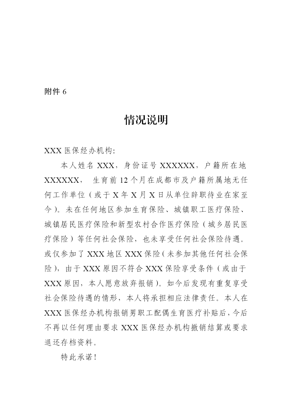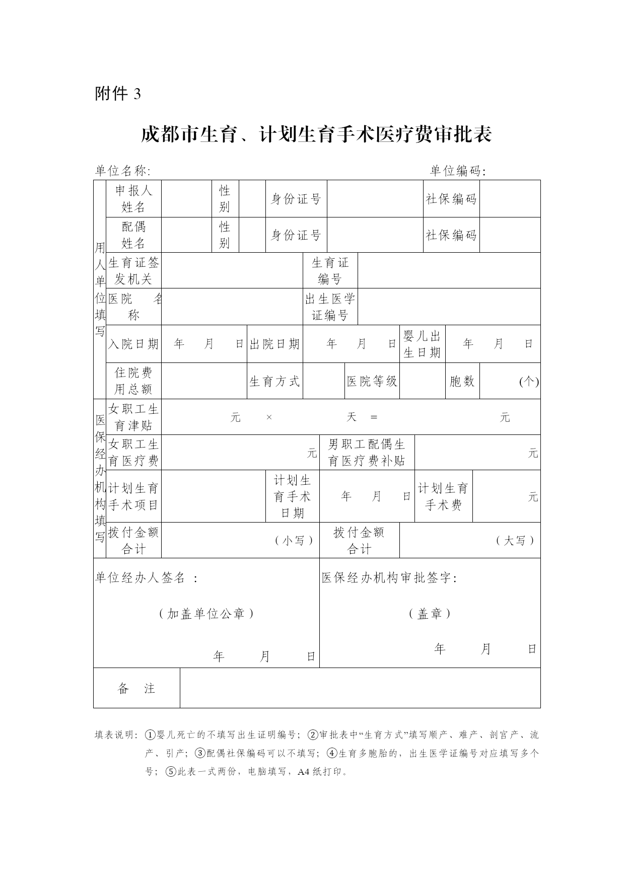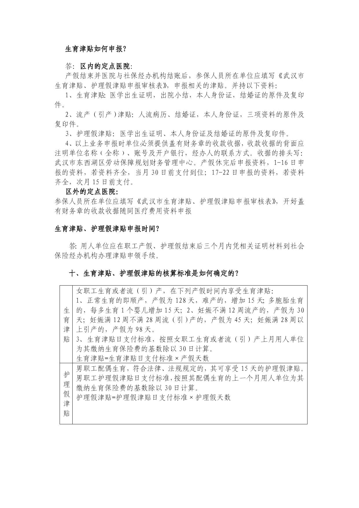 生育保险生育津贴表格最新文档(可以直接使用,可编辑最新文档,欢迎下载)生育保险生育津贴、护理假津贴结算单单位名称:申请津贴类别:□生育津贴□护理假津贴个人编号产妇姓名身份证号单位联系配偶个人编号配偶姓名配偶身份证号单位联系独生子女证号是否晚婚一胞胎数生育时间流产引产□顺产□剖宫产□助产□工资基数产假时间(天)产假津贴工资基数产假时间(天)护理假津贴标准/日金额10标准/日金额单位意见(盖章)年月日区经办机构意见(盖章)年月日说明:生产后2个月凭此表领取生育津贴,提供出生证明的复印件生育津贴如何申报?答:区内的定点医院:产假结束并医院与社保经办机构结账后,参保人员所在单位应填写《武汉市生育津贴、护理假津贴申报审核表》,申报相关的津贴。并持以下资料:1、生育津贴:医学出生证明,出院小结,本人身份证,结婚证的原件及复印件。2、流产(引产)津贴:人流病历、结婚证,本人身份证,三项资料的原件及复印件。3、护理假津贴:医学出生证明、本人身份证及结婚证的原件及复印件。4、以上业务申报时单位必须提供盖有财务章的收款收据,收款收据的背面应注明单位名称﹙全称﹚、账号及开户银行,经办人的联系方式。收据的排头写:武汉市东西湖区劳动保障规划财务管理中心。产假休完后申报资料,1-16日申报的资料,若资料齐全,当月30日前支付到位;17-22日申报的资料,若资料齐全,次月15日前支付。区外的定点医院:参保人员所在单位应填写《武汉市生育津贴、护理假津贴申报审核表》,开好盖有财务章的收款收据随同医疗费用资料申报生育津贴、护理假津贴申报时间?答:用人单位应在职工产假、护理假结束后三个月内凭相关证明材料到社会保险经办机构办理津贴申领手续。十、生育津贴、护理假津贴的核算标准是如何确定的?生育津贴女职工生育或者流(引)产,在下列产假时间内享受生育津贴:1、正常生育的即顺产,产假为128天,难产的,增加15天;多胞胎生育的,每多生育1个婴儿增加15天;2、妊娠不满12周流产的,产假为30天;妊娠满12周不满28周流(引)产的,产假为45天;妊娠满28周以上引产的,产假为98天。3、生育津贴日支付标准,按照女职工生育或者流(引)产上月用人单位为其缴纳生育保险费的基数除以30日计算。生育津贴=生育津贴日支付标准×产假天数护理假津贴男职工配偶生育,符合法律、法规规定的,其可享受15天的护理假津贴。男职工护理假津贴日支付标准,按照其配偶生育的上一个月用人单位为其缴纳生育保险费的基数除以30日计算。护理假津贴=护理假津贴日支付标准×护理假天数附件1成都市用人单位生育津贴拨付申请表单位名称(盖章):单位编码:女职工生育津贴待遇明细序号社保编码姓名身份证号生育定点医疗机构生育或计划生育手术时间孕周医疗待遇项目有无准生证胞数单位日均缴费工资产假天数生育津贴拨付金额生育津贴申请人次合计:生育津贴申请金额合计:单位经办人:申请时间:年月日医保经办人:经办时间:年月日备注:本表一式两份(用人单位、医保经办机构各留存一份),生育津贴最终拨付明细和金额由医保经办机构盖章确认,如有变动,以医保经办机构打印的《成都市生育津贴拨付表》为准。附件2成都市生育津贴拨付申请表单位名称(盖章):单位编码:社保编码姓名身份证号生育定点医疗机构生育时间孕周生育方式胞数以上人员均符合计划生育政策,持有生育服务证生育或施行计划生育手术。单位经办人:申请时间:年月日生育津贴拨付申请注意事项①本申请表仅作为参保人员生育医疗费已在本市定点医疗机构刷卡联网结算,而未能通过成都市社会保险网上经办系统申领生育津贴待遇时使用。②申领生育津贴待遇时间为参保人员生育医疗费在定点医疗机构刷卡联网结算次月20日后,申领时限为参保人员生育或施行计划生育手术后12个月内。③单位参保职工应由用人单位经办人为其办理,个体参保人员由本人或委托他人办理。④填报该申请表时,应按参保人员生育或施行计划生育手术时间的先后顺序进行填写,同时须提供生育人员出生证明原件及复印件。⑤申请表中“生育方式”填写顺产、难产、剖宫产、流产、引产。⑥本表格可根据实际情况进行增加,一式两份,电脑填写,A4纸打印。⑦生育保险具体规定请登录成都市人力资源和社会保障网查询,网址为:附件3成都市生育、计划生育手术医疗费审批表单位名称:单位编码:用人单位填写申报人姓名性别身份证号社保编码配偶姓名性别身份证号社保编码生育证签发机关生育证编号医院名称出生医学证编号入院日期年月日出院日期年月日婴儿出生日期年月日住院费用总额生育方式医院等级胞数(个)医保经办机构填写女职工生育津贴元×天=元女职工生育医疗费元男职工配偶生育医疗费补贴元计划生育手术项目计划生育手术日期年月日计划生育手