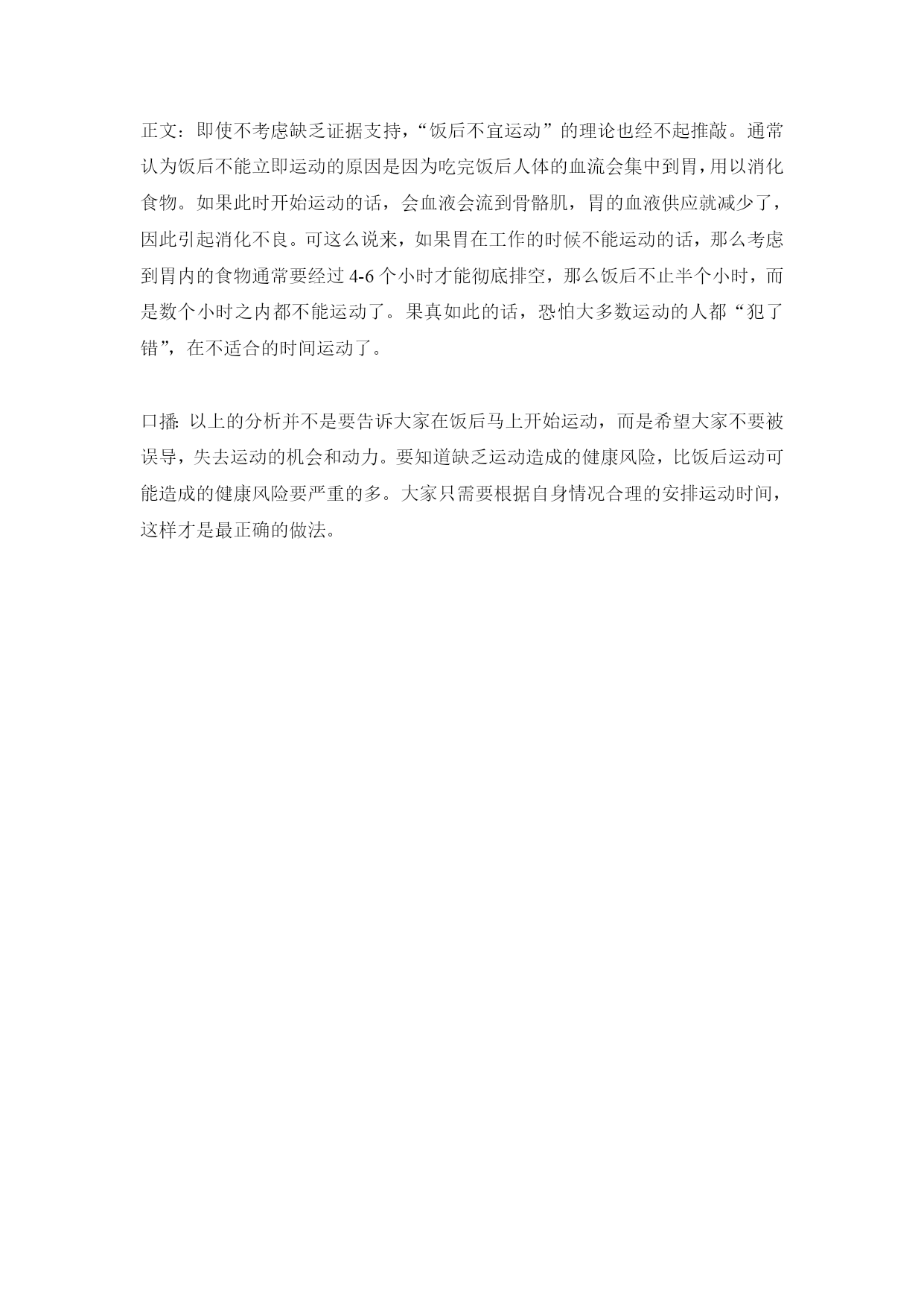 饭后运动,是健康大忌吗?口播:打小时候起,父辈们就一直教育咱们,吃完饭以后啊,不能马上运动,至少要等半小时以上。等我们长大之后,对这一说法深信不疑。不仅自己严格遵守饭后不能马上运动的守则,在我们当上父母之后,也会以此来要求咱们的孩子。但是饭后半小时不能运动的定律真的科学吗?这是关于健康的真相,还是一个市井的传说呢?正文:咱们在不清楚真相的情况下,选择宁可信其有不可信其无。其实啊,遵守“饭后不能运动”的生活准则也有潜在的风险的。比如对于忙碌的现代都市人来说,如果遵守饭后不能运动的“准则”,那可能就很难抽出时间来运动了。而且饭后不能运动的说法可能还会造成一些人干脆不吃饭直接去运动,造成“空腹运动”的情况,而空腹运动很容易造成低血糖发作,反而增加了运动时发生危险的可能。因此在饭后什么时候运动的问题上,保守的“宁可信其有”未必是最好的策略。接下来我们言归正传,要探讨饭后运动会不会引起消化不良,首先要对消化不良有所了解才行。医生对消化不良的情况进行了非常详细的分类,包括晨起饱腹感、餐后饱胀不适感、胃部疼痛和胃部烧灼感。而且现在消化不良的发病率非常高,一般估计人群中有25%的都患有消化不良。当这类病人饭后运动,症状可能会加深,因此印象深刻,而将其归咎于饭后运动,殊不知进餐本来就会诱发消化不良的症状,很有可能和运动没有任何关系。口播:值得说明的是,上面谈论的功能性消化不良,患者通常至少要有6个月以上的腹部不适的病史,是一种慢性的消化不良症状。对于那些急性的消化不良多是因为:食物过敏、食物中毒、急性胃肠炎等。并没有证据表明这一类消化不良可以被运动或饭后短时间内开始运动所诱发。正文:即使不考虑缺乏证据支持,“饭后不宜运动”的理论也经不起推敲。通常认为饭后不能立即运动的原因是因为吃完饭后人体的血流会集中到胃,用以消化食物。如果此时开始运动的话,会血液会流到骨骼肌,胃的血液供应就减少了,因此引起消化不良。可这么说来,如果胃在工作的时候不能运动的话,那么考虑到胃内的食物通常要经过4-6个小时才能彻底排空,那么饭后不止半个小时,而是数个小时之内都不能运动了。果真如此的话,恐怕大多数运动的人都“犯了错”,在不适合的时间运动了。口播:以上的分析并不是要告诉大家在饭后马上开始运动,而是希望大家不要被误导,失去运动的机会和动力。要知道缺乏运动造成的健康风险,比饭后运动可能造成的健康风险要严重的多。大家只需要根据自身情况合理的安排运动时间,这样才是最正确的做法。