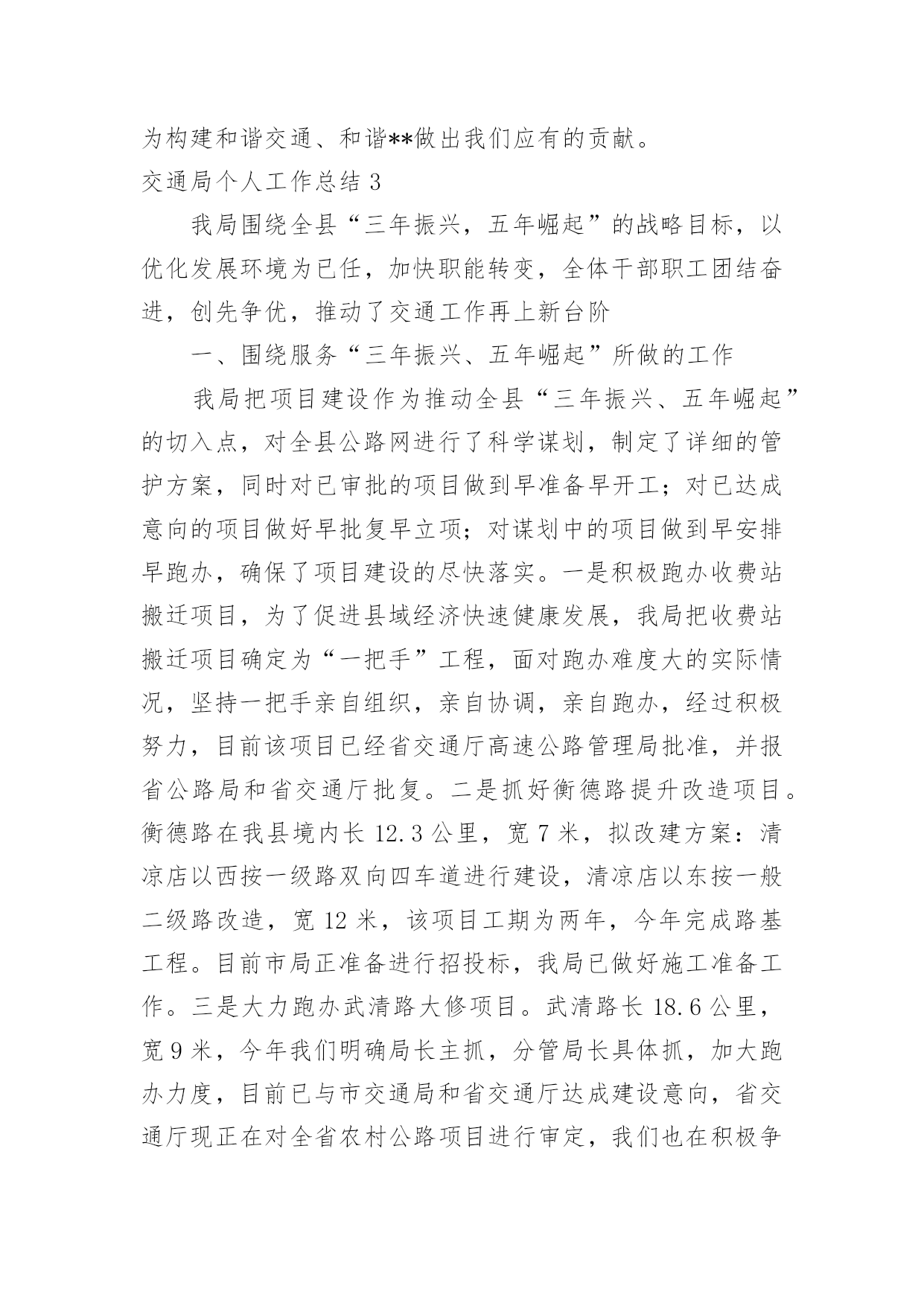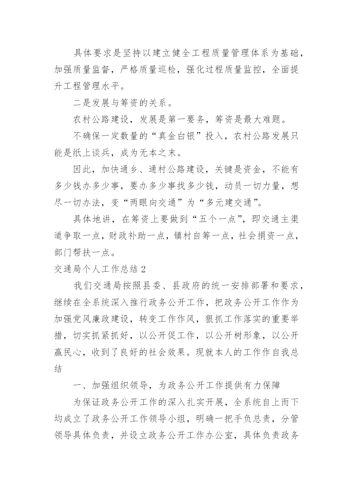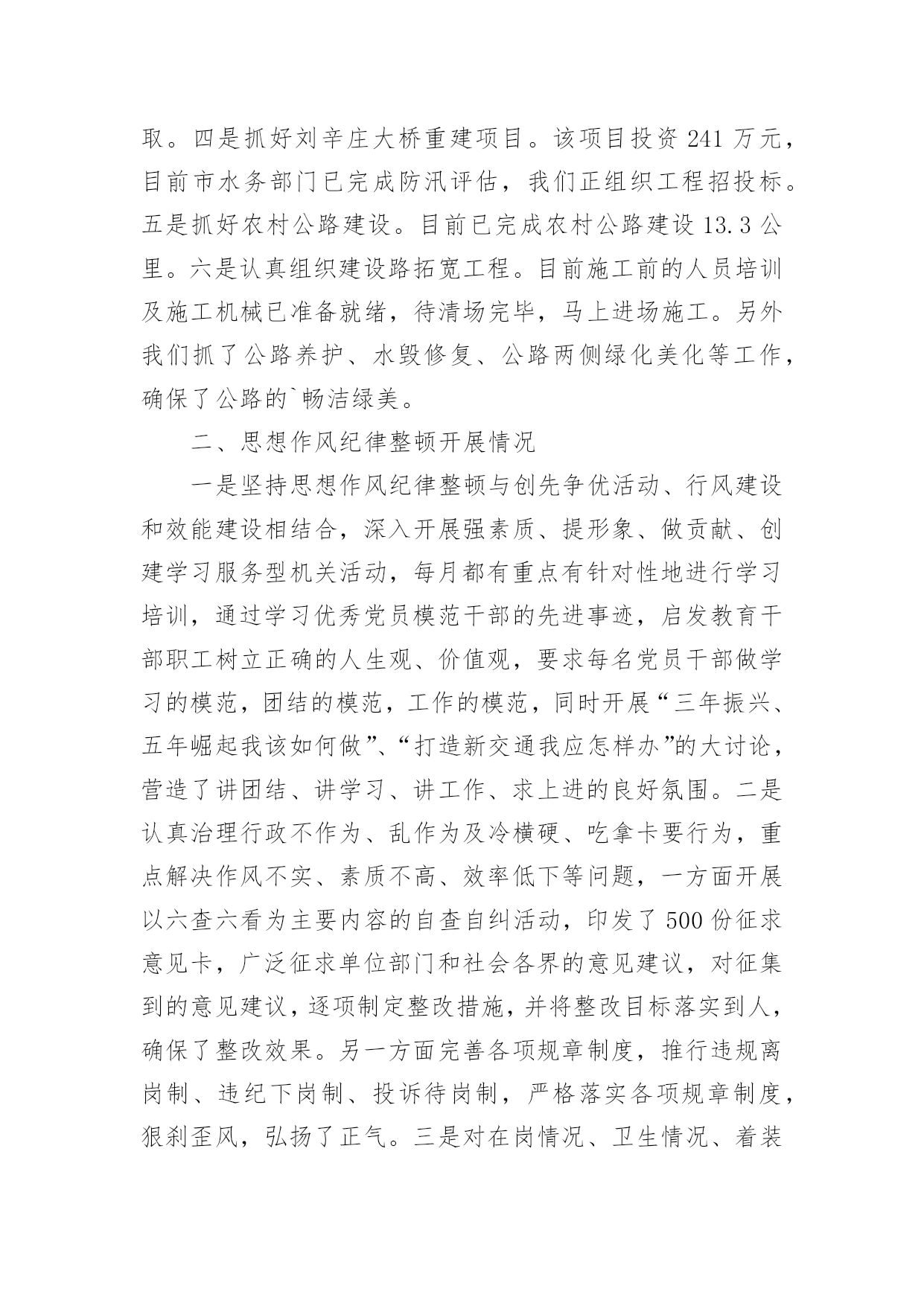 交通局个人工作总结交通局个人工作总结总结是把一定阶段内的有关情况分析研究,做出有指导性结论的书面材料,它可以帮助我们总结以往思想,发扬成绩,让我们来为自己写一份总结吧。总结一般是怎么写的呢?以下是小编整理的交通局个人工作总结,仅供参考,大家一起来看看吧。交通局个人工作总结1工作安排6月20日上午,新到任的市委书记谢世芳同志率领“四大家”领导到我局调研,对我市交通“十五”期间取得的成就给予充分肯定的同时,提出了四点要求:一是高标准、高起点编制“十一五”规划;二是加快通村公路建设步伐;三是加快交通企业民营化改革进程;四是全面推进交通“廉政阳光工程”。,我们要围绕市委、市政府对交通工作的总体要求,按照年初制定的目标规划,再鼓干劲,再加措施,确保全年工作目标任务的`全面完成,以我市交通事业全面协调可持续发展的优异成绩为全面建设小康应城作出新的更大贡献。〈一〉主要目标全面完成水陆基础设施建设年度规划,全面完成孝感市交通局下达的水陆规费征收任务;公路客货运量增长2%,周转量增长3%,交通运输安全保持平衡态势;工程合格率达100%,重点工程优良率达90%,单位工程优良率85%,公路养护干线年均好路率达到85%;规范运输市场管理,完成出租小汽车新一轮经营权转让;孝感市级文明单位达到50%以上,应城市级文明单位保持100%。〈二〉工作举措1、精心组织,加快农村公路建设步伐。XX年,全市公路建设的重点将由干线转向农村路网。因此,加大农村路网建设力度,打造小康致富路,既是我们的职责,也是我们交通人以自己的实际行动反哺农业、扶持农村、回报农民的最佳途径。为完成今年路网建设目标,必须认真处理好三个关系:一是速度与质量的关系。从去年开始,“让农民兄弟走了油路、水泥路”的口号第一次在神州大地响彻,不论是东部还是西部,红红火火的通乡、通村公路建设已经拉开巨网,现在全国、全省其它县市都在抓住新一轮的机遇加快发展,同时,周边兄弟县市竞争激烈,形势逼人。因此,我们必须确保、力争超额完成建设目标任务,在通乡公路建设上做到“甩掉追兵,赶超标兵”,在通村公路建设上做到“大干快上,迎头赶上”。抓好农村公路建设质量,不仅仅是公路建设自身规律的要求,更是一个十分严肃的政治问题,质量是工程的生命,更是行业的生命,因此,确保通乡、通村公路工程质量作为农村路网建设的根本要求什么时候都不能动摇。具体要求是坚持以建立健全工程质量管理体系为基础,加强质量监督,严格质量巡检,强化过程质量监控,全面提升工程管理水平。二是发展与筹资的关系。农村公路建设,发展是第一要务,筹资是最大难题。不确保一定数量的“真金白银”投入,农村公路发展只能是纸上谈兵,成为无本之末。因此,加快通乡、通村公路建设,关键是资金,不能有多少钱办多少事,要办多少事找多少钱,动员一切力量,想尽一切办法,变“两眼向交通”为“多元建交通”。具体地讲,在筹资上要做到“五个一点”,即交通主渠道争取一点,财政补助一点,镇村自筹一点,社会捐资一点,部门帮扶一点。交通局个人工作总结2我们交通局按照县委、县政府的统一安排部署和要求,继续在全系统深入推行政务公开工作,把政务公开工作作为加强党风廉政建设,转变工作作风,狠抓工作落实的重要举措,切实抓紧抓好,以公开促工作,以公开树形象,以公开赢民心,收到了良好的社会效果。现就本人的工作作自我总结一、加强组织领导,为政务公开工作提供有力保障为保证政务公开工作的深入扎实开展,全系统自上而下均成立了政务公开工作领导小组,明确一把手负总责,分管领导具体负责,并设立政务公开工作办公室,具体负责政务公开工作的组织实施、检查落实等工作。同时,我们将政务公开工作纳入目标管理体系,实行目标管理责任制,形成了一级抓一级、层层抓落实的良好局面。今年年初,我们结合实际,成立了政务公开工作领导小组并制订下发了《xx年度政务公开工作实施方案》,做到领导力度、目标责任、监督检查“三到位”,把履行政务公开职责情况与承办人员业务考核结合起来,进一步健全和完善了有效的监督机制和奖惩制度,为政务公开工作的扎实有效开展提供了强有力的保障。二、加大公开和宣传力度,扩大政务公开知晓面我们结合系统工作实际,通过制作政务公开专栏、版报、宣传标语,设立监督台等多种形式,将各项行政办理事项的办事依据、办事职责、办事程序、办事标准、办事时限、办事结果“六要素”向社会广泛公开,不断加大政务公开宣传力度,在方便服务对象的同时,接受社会各界的监督。同时,我们还把与服务对象关系密切的养路费、运管费、通行费等各种交通规费的征收依据、标准等内容作为政务公开工作的重点,不仅在各办事场所和服务大厅上墙公开,还在报纸和**交通网站上予以公示。截止11月底,我们交通行政审批窗口共办结行政审批1197起,审验车辆3200台,便捷高效的办事效率和优质的服务态度受到广大服务