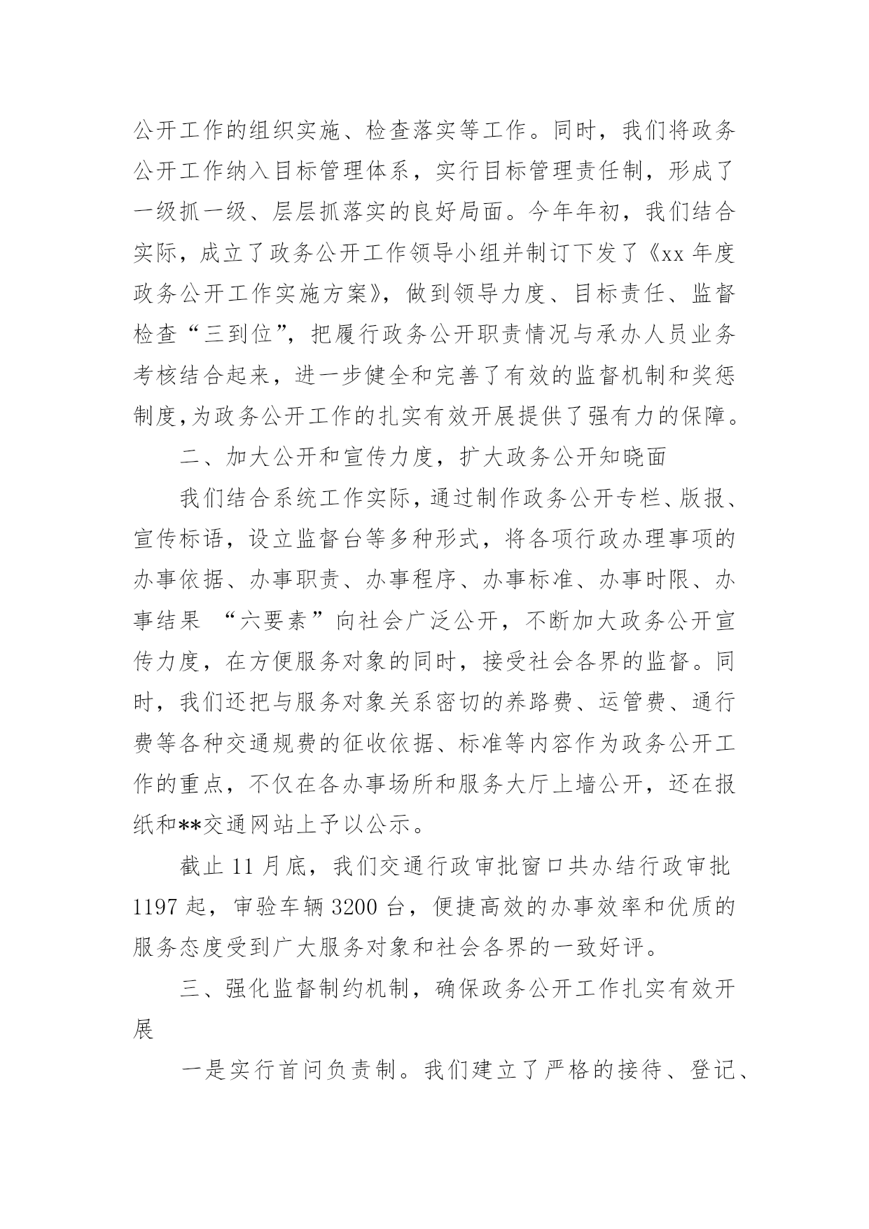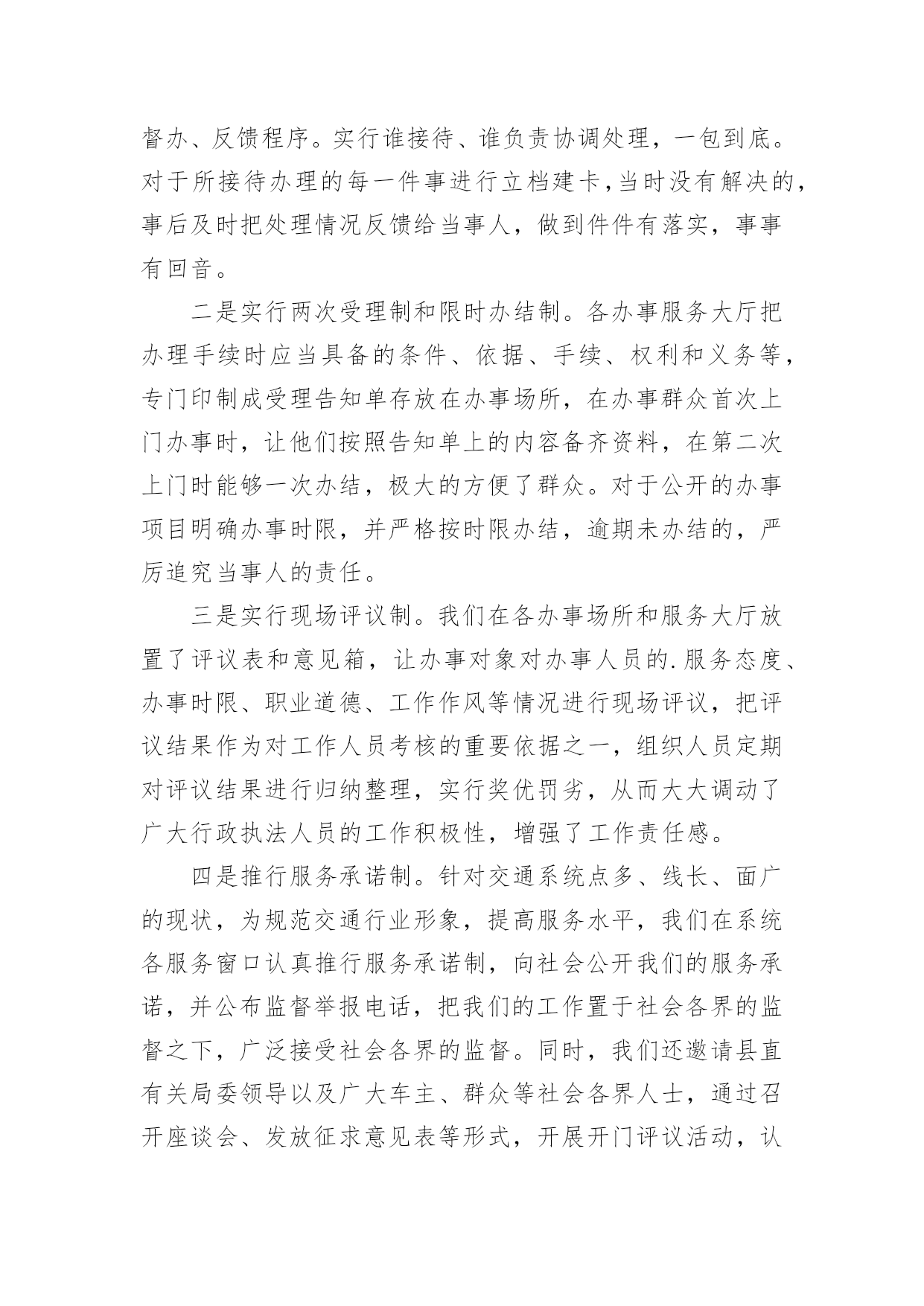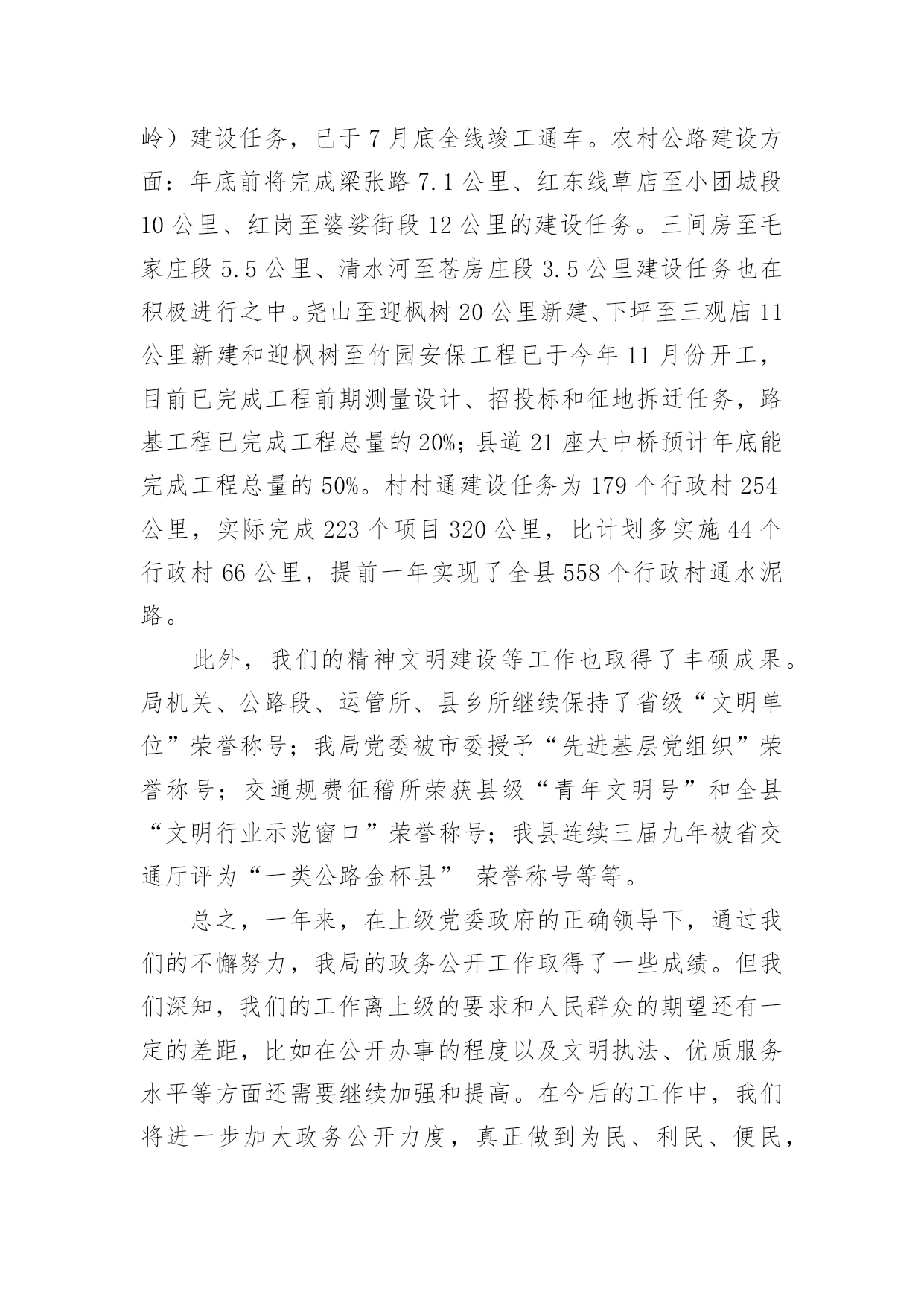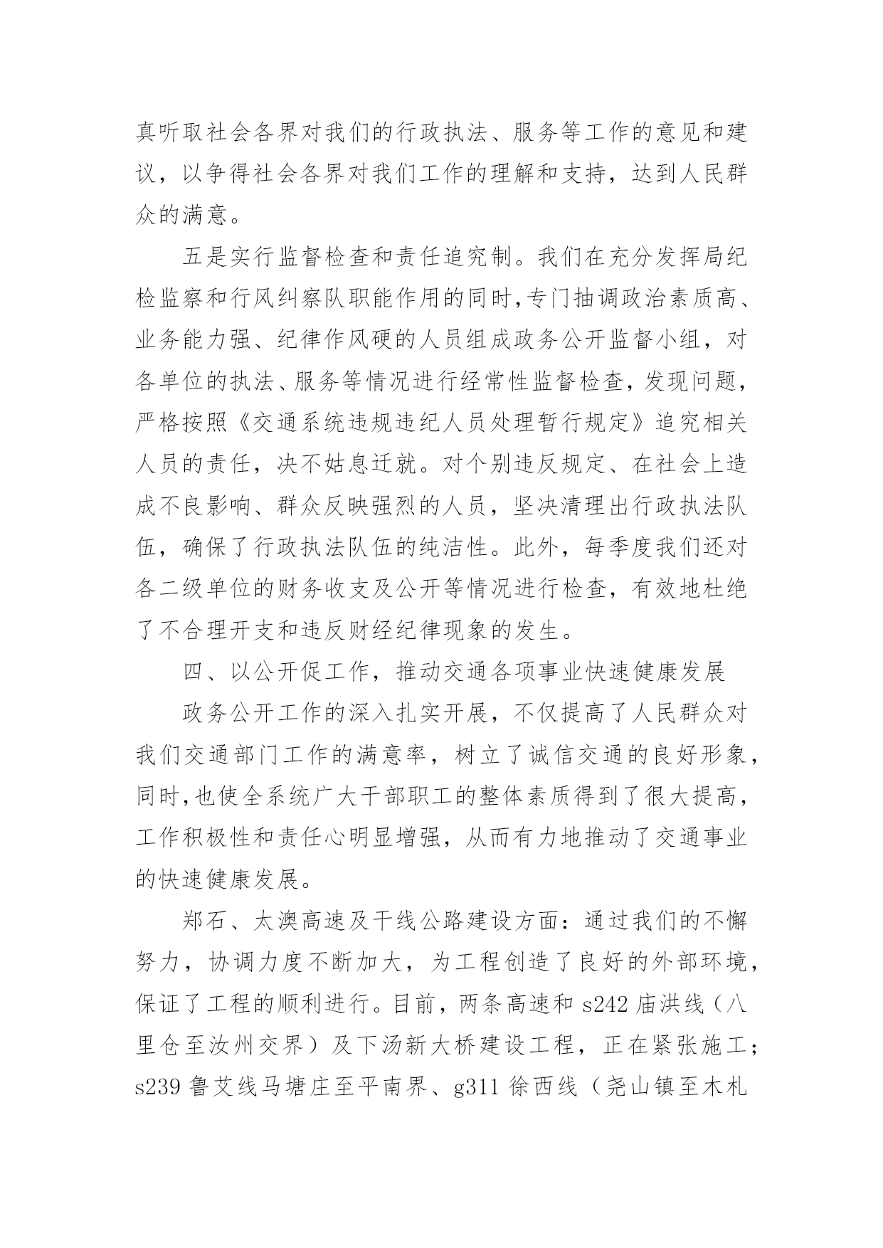 交通局个人工作总结交通局个人工作总结总结是把一定阶段内的有关情况分析研究,做出有指导性结论的书面材料,它可以帮助我们总结以往思想,发扬成绩,让我们来为自己写一份总结吧。总结一般是怎么写的呢?以下是小编整理的交通局个人工作总结,仅供参考,大家一起来看看吧。交通局个人工作总结1工作安排6月20日上午,新到任的市委书记谢世芳同志率领“四大家”领导到我局调研,对我市交通“十五”期间取得的成就给予充分肯定的同时,提出了四点要求:一是高标准、高起点编制“十一五”规划;二是加快通村公路建设步伐;三是加快交通企业民营化改革进程;四是全面推进交通“廉政阳光工程”。,我们要围绕市委、市政府对交通工作的总体要求,按照年初制定的目标规划,再鼓干劲,再加措施,确保全年工作目标任务的`全面完成,以我市交通事业全面协调可持续发展的优异成绩为全面建设小康应城作出新的更大贡献。〈一〉主要目标全面完成水陆基础设施建设年度规划,全面完成孝感市交通局下达的水陆规费征收任务;公路客货运量增长2%,周转量增长3%,交通运输安全保持平衡态势;工程合格率达100%,重点工程优良率达90%,单位工程优良率85%,公路养护干线年均好路率达到85%;规范运输市场管理,完成出租小汽车新一轮经营权转让;孝感市级文明单位达到50%以上,应城市级文明单位保持100%。〈二〉工作举措1、精心组织,加快农村公路建设步伐。XX年,全市公路建设的重点将由干线转向农村路网。因此,加大农村路网建设力度,打造小康致富路,既是我们的职责,也是我们交通人以自己的实际行动反哺农业、扶持农村、回报农民的最佳途径。为完成今年路网建设目标,必须认真处理好三个关系:一是速度与质量的关系。从去年开始,“让农民兄弟走了油路、水泥路”的口号第一次在神州大地响彻,不论是东部还是西部,红红火火的通乡、通村公路建设已经拉开巨网,现在全国、全省其它县市都在抓住新一轮的机遇加快发展,同时,周边兄弟县市竞争激烈,形势逼人。因此,我们必须确保、力争超额完成建设目标任务,在通乡公路建设上做到“甩掉追兵,赶超标兵”,在通村公路建设上做到“大干快上,迎头赶上”。抓好农村公路建设质量,不仅仅是公路建设自身规律的要求,更是一个十分严肃的政治问题,质量是工程的生命,更是行业的生命,因此,确保通乡、通村公路工程质量作为农村路网建设的根本要求什么时候都不能动摇。具体要求是坚持以建立健全工程质量管理体系为基础,加强质量监督,严格质量巡检,强化过程质量监控,全面提升工程管理水平。二是发展与筹资的关系。农村公路建设,发展是第一要务,筹资是最大难题。不确保一定数量的“真金白银”投入,农村公路发展只能是纸上谈兵,成为无本之末。因此,加快通乡、通村公路建设,关键是资金,不能有多少钱办多少事,要办多少事找多少钱,动员一切力量,想尽一切办法,变“两眼向交通”为“多元建交通”。具体地讲,在筹资上要做到“五个一点”,即交通主渠道争取一点,财政补助一点,镇村自筹一点,社会捐资一点,部门帮扶一点。交通局个人工作总结2我们交通局按照县委、县政府的统一安排部署和要求,继续在全系统深入推行政务公开工作,把政务公开工作作为加强党风廉政建设,转变工作作风,狠抓工作落实的重要举措,切实抓紧抓好,以公开促工作,以公开树形象,以公开赢民心,收到了良好的社会效果。现就本人的工作作自我总结一、加强组织领导,为政务公开工作提供有力保障为保证政务公开工作的深入扎实开展,全系统自上而下均成立了政务公开工作领导小组,明确一把手负总责,分管领导具体负责,并设立政务公开工作办公室,具体负责政务公开工作的组织实施、检查落实等工作。同时,我们将政务公开工作纳入目标管理体系,实行目标管理责任制,形成了一级抓一级、层层抓落实的良好局面。今年年初,我们结合实际,成立了政务公开工作领导小组并制订下发了《xx年度政务公开工作实施方案》,做到领导力度、目标责任、监督检查“三到位”,把履行政务公开职责情况与承办人员业务考核结合起来,进一步健全和完善了有效的监督机制和奖惩制度,为政务公开工作的扎实有效开展提供了强有力的保障。二、加大公开和宣传力度,扩大政务公开知晓面我们结合系统工作实际,通过制作政务公开专栏、版报、宣传标语,设立监督台等多种形式,将各项行政办理事项的办事依据、办事职责、办事程序、办事标准、办事时限、办事结果“六要素”向社会广泛公开,不断加大政务公开宣传力度,在方便服务对象的同时,接受社会各界的监督。同时,我们还把与服务对象关系密切的养路费、运管费、通行费等各种交通规费的征收依据、标准等内容作为政务公开工作的重点,不仅在各办事场所和服务大厅上墙公开,还在报纸和**交通网站上予以公示。截止11月底,我们交通行政审批窗口共办结行政审批1197起,审验车辆3200台,便捷高效的办事效率和优质的服务态度受到广大服务