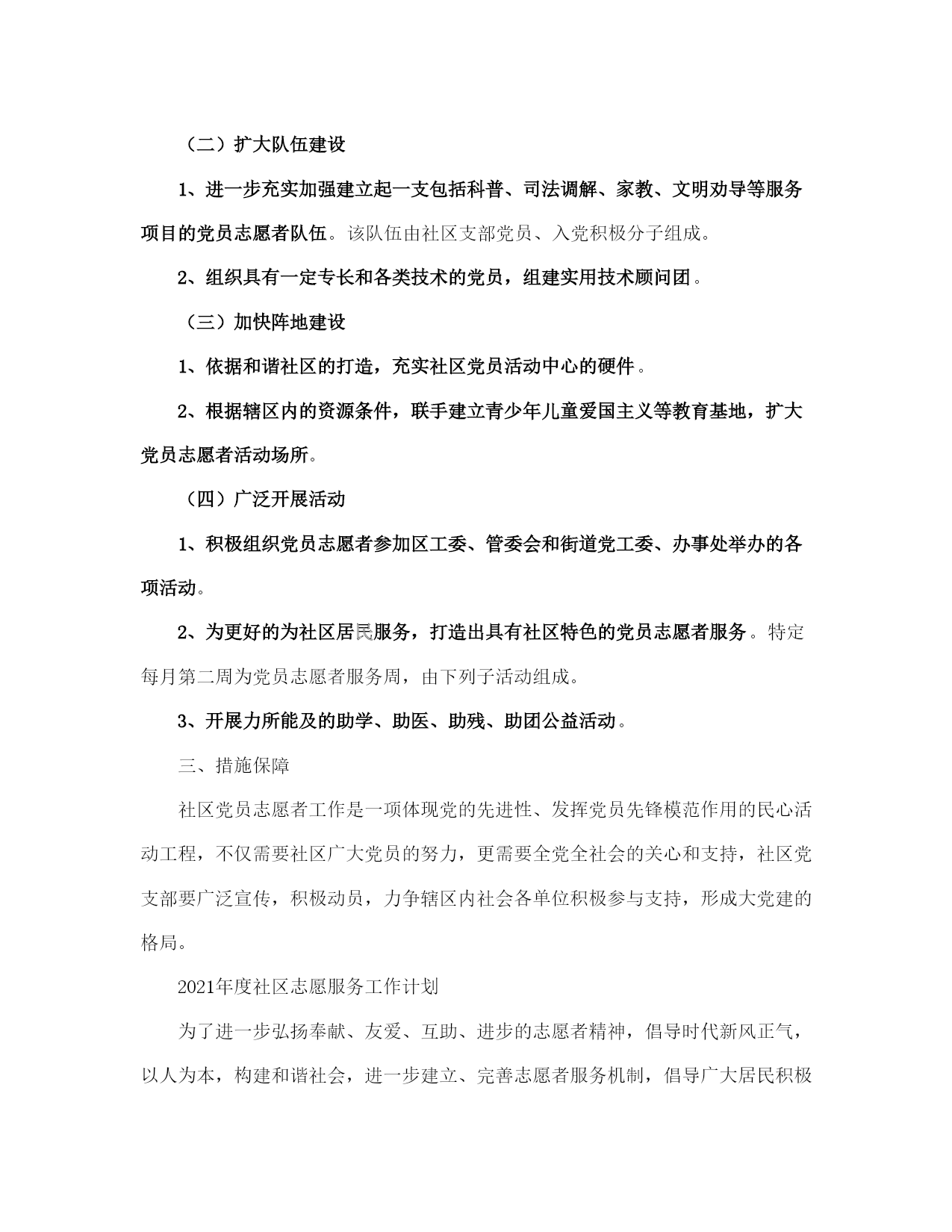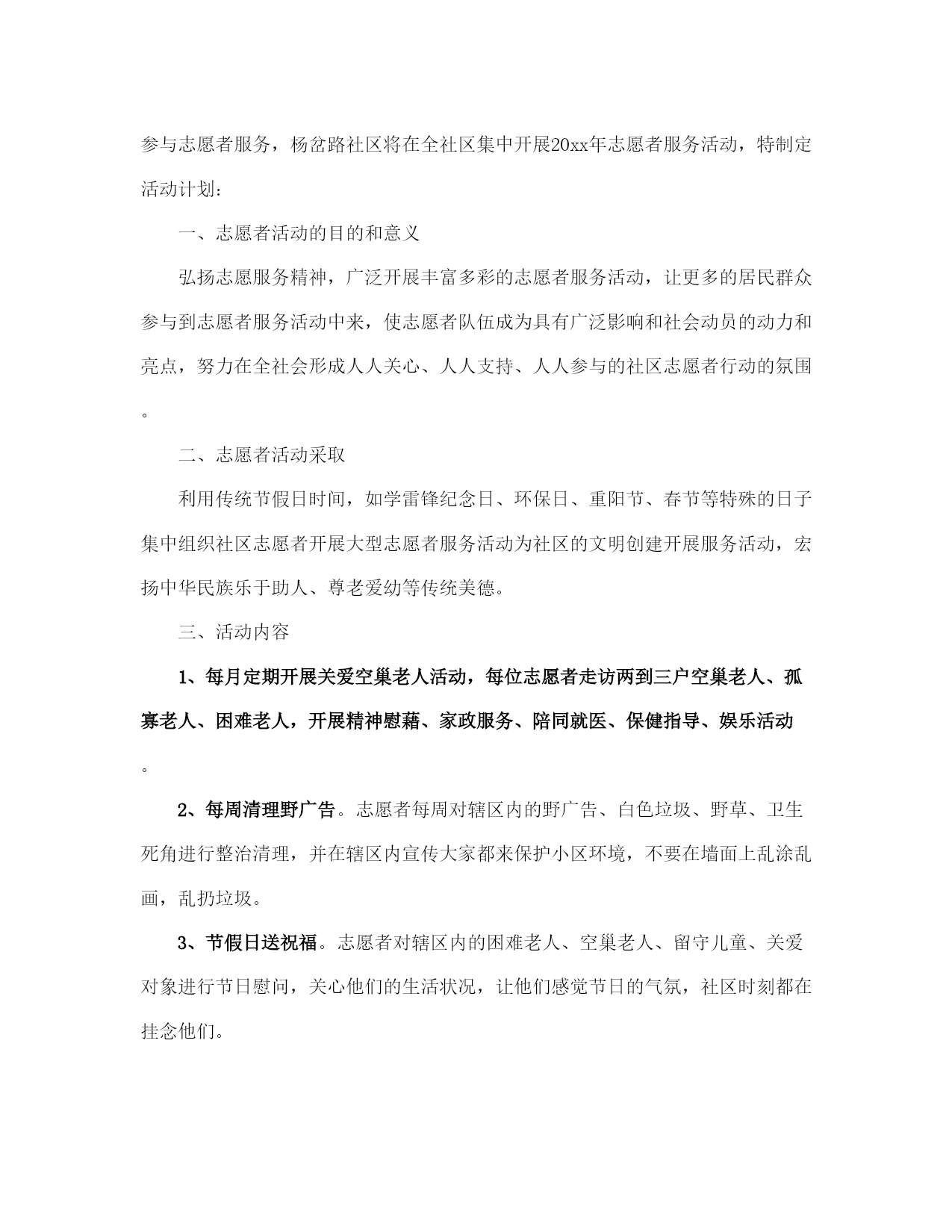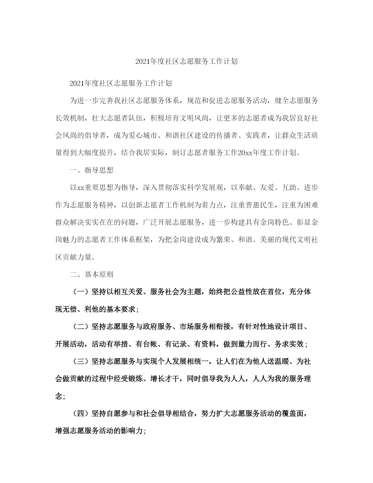 度社区志愿服务工作计划范本(完整版)文档资料可直接使用,可编辑,欢迎下载2021年度社区志愿服务工作计划2021年度社区志愿服务工作计划为进一步完善我社区志愿服务体系,规范和促进志愿服务活动,健全志愿服务长效机制,壮大志愿者队伍,积极培育文明风尚,让更多的志愿者成为我居良好社会风尚的倡导者,成为爱心城市、和谐社区建设的传播者、实践者,让群众生活质量得到大幅度提升,结合我居实际,制订志愿者服务工作20xx年度工作计划。一、指导思想以xx重要思想为指导,深入贯彻落实科学发展观,以奉献、友爱、互助、进步作为志愿服务精神,以创新志愿者工作机制为着力点,注重普惠民生,注重为困难群众解决实实在在的问题,广泛开展志愿服务,进一步构建具有金岗特色、彰显金岗魅力的志愿者工作体系框架,为把金岗建设成为繁荣、和谐、美丽的现代文明社区贡献力量。二、基本原则(一)坚持以相互关爱、服务社会为主题,始终把公益性放在首位,充分体现无偿、利他的基本要求;(二)坚持志愿服务与政府服务、市场服务相衔接,有针对性地设计项目、开展活动,活动有举措、有台帐、有记录、有资料,做到量力而行、务求实效;(三)坚持志愿服务与实现个人发展相统一,让人们在为他人送温暖、为社会做贡献的过程中经受锻炼、增长才干,同时倡导我为人人,人人为我的服务理念;(四)坚持自愿参与和社会倡导相结合,努力扩大志愿服务活动的覆盖面,增强志愿服务活动的影响力;(五)坚持社会化运行模式,把社区、社会各方面组织动员起来,形成强大工作合力。三、工作内容(一)、邻里守望。以构建和谐邻里关系为目标,不断提升公民文明素质和社会文明程度,倡导邻里之间互知、互敬、互帮、互助,大力营造人人为我,我为人人的社会风尚。(二)、青年志愿者活动。以青年为主力,结合各类重大活动开展各种主题和形式的志愿服务。(三)社区服务。针对社区孤寡老人、残疾人士、弱能人士、重症人士等特殊群体,开展探望、饮食起居照料等力所能及的服务。(四)妇女、儿童帮扶。针对妇女、儿童,开展春蕾计划、关爱特殊群体未成年人、家庭教育进社区等活动。(五)法律咨询。为居民提供交通、工伤事故,经济、赡养、婚姻等民事纠纷等法律咨询、法律援助、司法*等服务。(六)科普服务。开展科普进社区活动,以及结合民生关注热点开展各类专题性宣传教育活动,加深居民对科普知识的感性认识。(七)党员志愿者服务。发挥党员先锋模范作用,开展以便民利民为主题的法制宣传、文明劝导行动和社区公益活动,以帮困助弱为主题的帮困结对、定期走访、慈善捐增活动。(八)心理咨询。对居民发生家庭矛盾、邻里矛盾进行劝解,为高龄、孤寡老人提供上门聊天或问询、临终关怀等心理咨询服务。(九)文明交通志愿服务。提供交通指引与咨询,宣传交通安全知识,维护候车秩序,开展文明劝导,倡导文明出行。(十)五老志愿服务。组织热心的老干部、老党员、老战士、老教师、老劳模对广大青少年开展爱国主义主题教育、社会主义荣辱观教育和法制教育。(十一)老年人志愿服务。根据老年人特点,建立具有老年特色的文体团队,发挥他们的余热和才能,以此丰富居民的精神文化生活。四、保障措施(一)队伍保障。进一步充实加强建立起一支包括扶贫济困、扶弱助残、帮老扶幼、支教助学、抢险救灾、环境保护、科技普及、医疗卫生、治安防范、法律援助、心理咨询、社区服务、大型社会公益活动等志愿服务队伍。(二)资金保障。加大资金投入力度,对志愿服务组织的日常工作提供必要的经费保障,志愿服务工作协调机构日常工作的经费纳入财政预算。2021年度社区志愿服务工作计划为进一步加强社区党建工作,全面贯彻xx重要思想,较好地发挥党组织在社区各项工作中的主导地位,真正把党的工作渗透到社区政治、经济、文化、生活等各个领域,达到凝聚群从、宣传群众、团结群众的目的,根据街道党工委、办事处的总体部署,结合我社区的实际,制订志愿者活动计划。一、总体思路和基本原则(一)总体思路以党的xx大会议精神和xx重要思想为指导,创新内容和机制,开展共产党员先进性教育,举先进旗帜、树先锋形象,努力实现党的xx大提出的完善城市居民自治,建设管理有序、文明祥和的新型社区的目标要求,推进城市社区建设和经济社区的全面发展。(二)基本原则在开展党员社区志愿者活动中,坚持如下基本原则:1、坚持与社区文明创建相结合的原则。通过文明创建,提高居民的道德水平。2、坚持与发展社区经济相结合原则。通过提供社区发展经济各种服务,把党的温暖送到居民家中。3、坚持与社区文体活动相结合的原则。通过广泛开展社区广场文体活动,陶冶居民群众情操。4、坚持与社区法律教育相结合的原则。通过化解社区内部各种矛盾,确保一方平安。5、坚持与社区科普教育相结合的原则。通过开展科普宣传,提高居民的科学生活