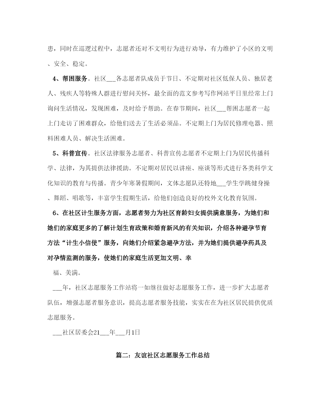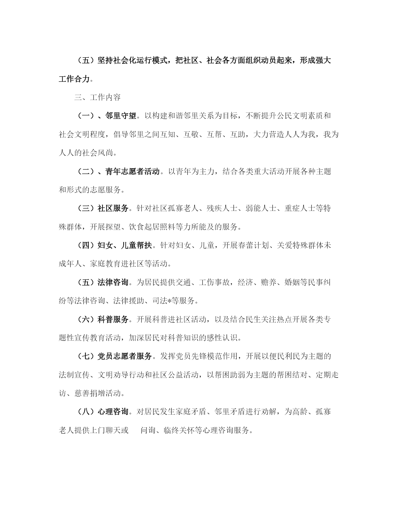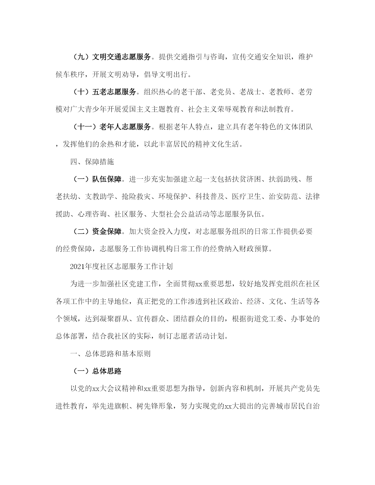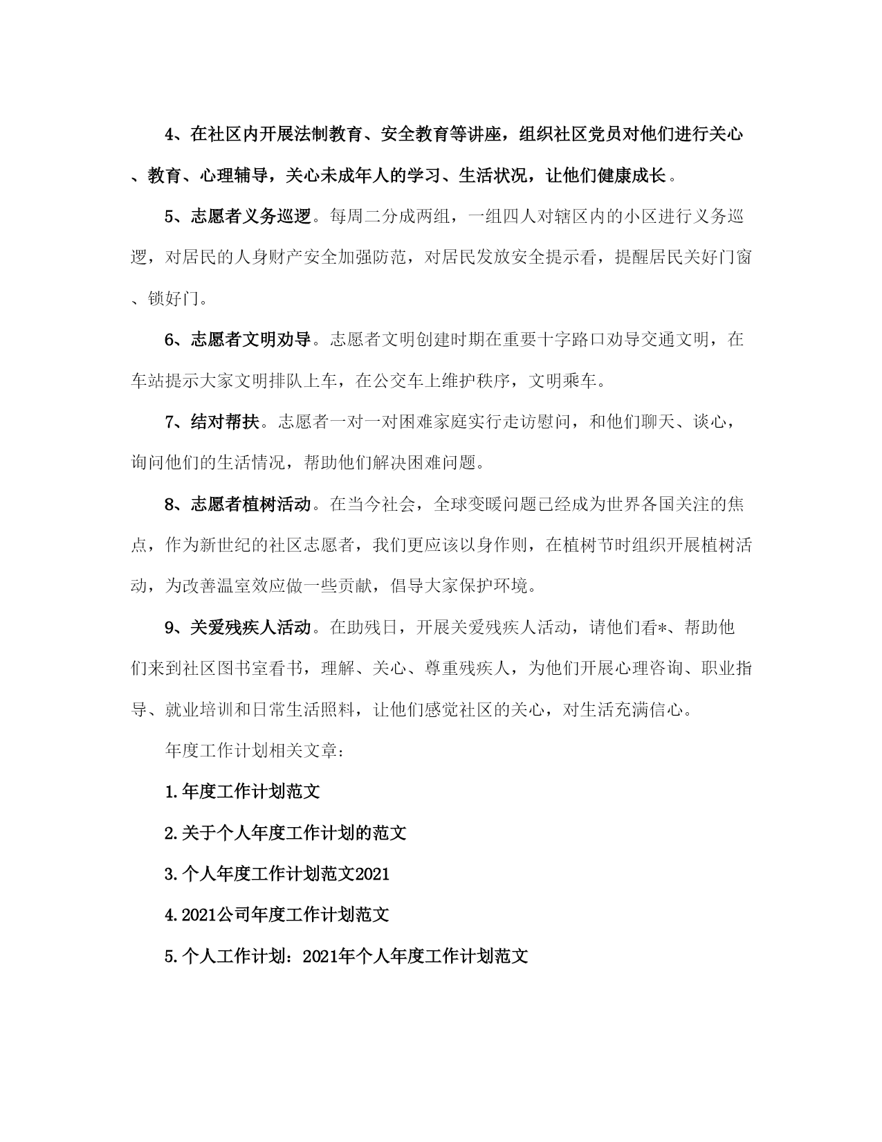 度社区志愿服务工作计划范本(完整版)文档资料可直接使用,可编辑,欢迎下载2021年度社区志愿服务工作计划2021年度社区志愿服务工作计划为进一步完善我社区志愿服务体系,规范和促进志愿服务活动,健全志愿服务长效机制,壮大志愿者队伍,积极培育文明风尚,让更多的志愿者成为我居良好社会风尚的倡导者,成为爱心城市、和谐社区建设的传播者、实践者,让群众生活质量得到大幅度提升,结合我居实际,制订志愿者服务工作20xx年度工作计划。一、指导思想以xx重要思想为指导,深入贯彻落实科学发展观,以奉献、友爱、互助、进步作为志愿服务精神,以创新志愿者工作机制为着力点,注重普惠民生,注重为困难群众解决实实在在的问题,广泛开展志愿服务,进一步构建具有金岗特色、彰显金岗魅力的志愿者工作体系框架,为把金岗建设成为繁荣、和谐、美丽的现代文明社区贡献力量。二、基本原则(一)坚持以相互关爱、服务社会为主题,始终把公益性放在首位,充分体现无偿、利他的基本要求;(二)坚持志愿服务与政府服务、市场服务相衔接,有针对性地设计项目、开展活动,活动有举措、有台帐、有记录、有资料,做到量力而行、务求实效;(三)坚持志愿服务与实现个人发展相统一,让人们在为他人送温暖、为社会做贡献的过程中经受锻炼、增长才干,同时倡导我为人人,人人为我的服务理念;(四)坚持自愿参与和社会倡导相结合,努力扩大志愿服务活动的覆盖面,增强志愿服务活动的影响力;(五)坚持社会化运行模式,把社区、社会各方面组织动员起来,形成强大工作合力。三、工作内容(一)、邻里守望。以构建和谐邻里关系为目标,不断提升公民文明素质和社会文明程度,倡导邻里之间互知、互敬、互帮、互助,大力营造人人为我,我为人人的社会风尚。(二)、青年志愿者活动。以青年为主力,结合各类重大活动开展各种主题和形式的志愿服务。(三)社区服务。针对社区孤寡老人、残疾人士、弱能人士、重症人士等特殊群体,开展探望、饮食起居照料等力所能及的服务。(四)妇女、儿童帮扶。针对妇女、儿童,开展春蕾计划、关爱特殊群体未成年人、家庭教育进社区等活动。(五)法律咨询。为居民提供交通、工伤事故,经济、赡养、婚姻等民事纠纷等法律咨询、法律援助、司法*等服务。(六)科普服务。开展科普进社区活动,以及结合民生关注热点开展各类专题性宣传教育活动,加深居民对科普知识的感性认识。(七)党员志愿者服务。发挥党员先锋模范作用,开展以便民利民为主题的法制宣传、文明劝导行动和社区公益活动,以帮困助弱为主题的帮困结对、定期走访、慈善捐增活动。(八)心理咨询。对居民发生家庭矛盾、邻里矛盾进行劝解,为高龄、孤寡老人提供上门聊天或问询、临终关怀等心理咨询服务。(九)文明交通志愿服务。提供交通指引与咨询,宣传交通安全知识,维护候车秩序,开展文明劝导,倡导文明出行。(十)五老志愿服务。组织热心的老干部、老党员、老战士、老教师、老劳模对广大青少年开展爱国主义主题教育、社会主义荣辱观教育和法制教育。(十一)老年人志愿服务。根据老年人特点,建立具有老年特色的文体团队,发挥他们的余热和才能,以此丰富居民的精神文化生活。四、保障措施(一)队伍保障。进一步充实加强建立起一支包括扶贫济困、扶弱助残、帮老扶幼、支教助学、抢险救灾、环境保护、科技普及、医疗卫生、治安防范、法律援助、心理咨询、社区服务、大型社会公益活动等志愿服务队伍。(二)资金保障。加大资金投入力度,对志愿服务组织的日常工作提供必要的经费保障,志愿服务工作协调机构日常工作的经费纳入财政预算。2021年度社区志愿服务工作计划为进一步加强社区党建工作,全面贯彻xx重要思想,较好地发挥党组织在社区各项工作中的主导地位,真正把党的工作渗透到社区政治、经济、文化、生活等各个领域,达到凝聚群从、宣传群众、团结群众的目的,根据街道党工委、办事处的总体部署,结合我社区的实际,制订志愿者活动计划。一、总体思路和基本原则(一)总体思路以党的xx大会议精神和xx重要思想为指导,创新内容和机制,开展共产党员先进性教育,举先进旗帜、树先锋形象,努力实现党的xx大提出的完善城市居民自治,建设管理有序、文明祥和的新型社区的目标要求,推进城市社区建设和经济社区的全面发展。(二)基本原则在开展党员社区志愿者活动中,坚持如下基本原则:1、坚持与社区文明创建相结合的原则。通过文明创建,提高居民的道德水平。2、坚持与发展社区经济相结合原则。通过提供社区发展经济各种服务,把党的温暖送到居民家中。3、坚持与社区文体活动相结合的原则。通过广泛开展社区广场文体活动,陶冶居民群众情操。4、坚持与社区法律教育相结合的原则。通过化解社区内部各种矛盾,确保一方平安。5、坚持与社区科普教育相结合的原则。通过开展科普宣传,提高居民的科学生活