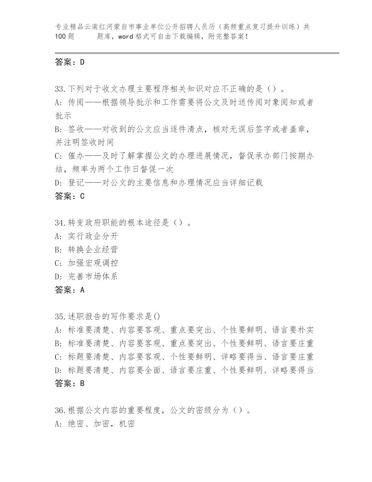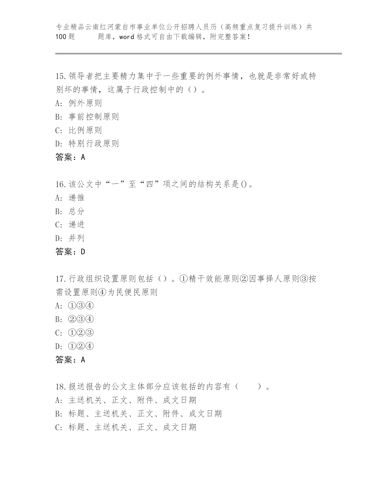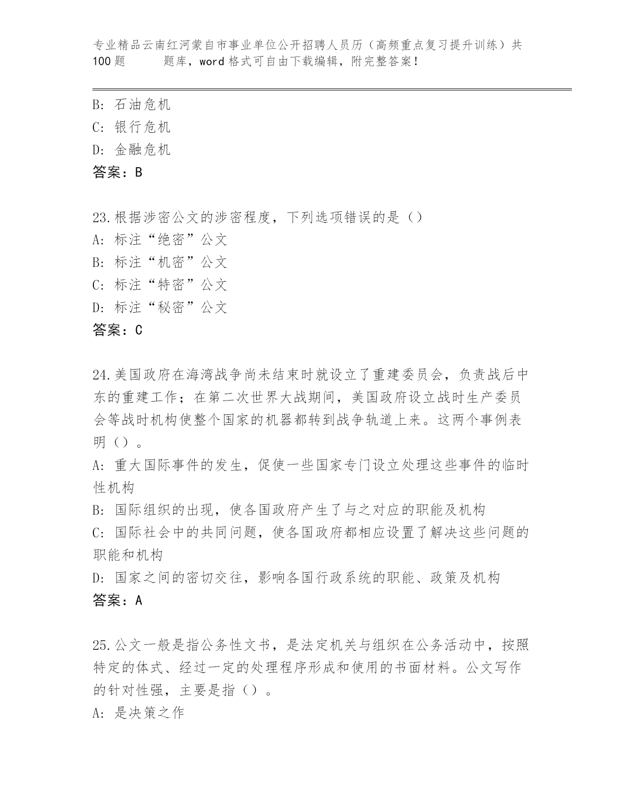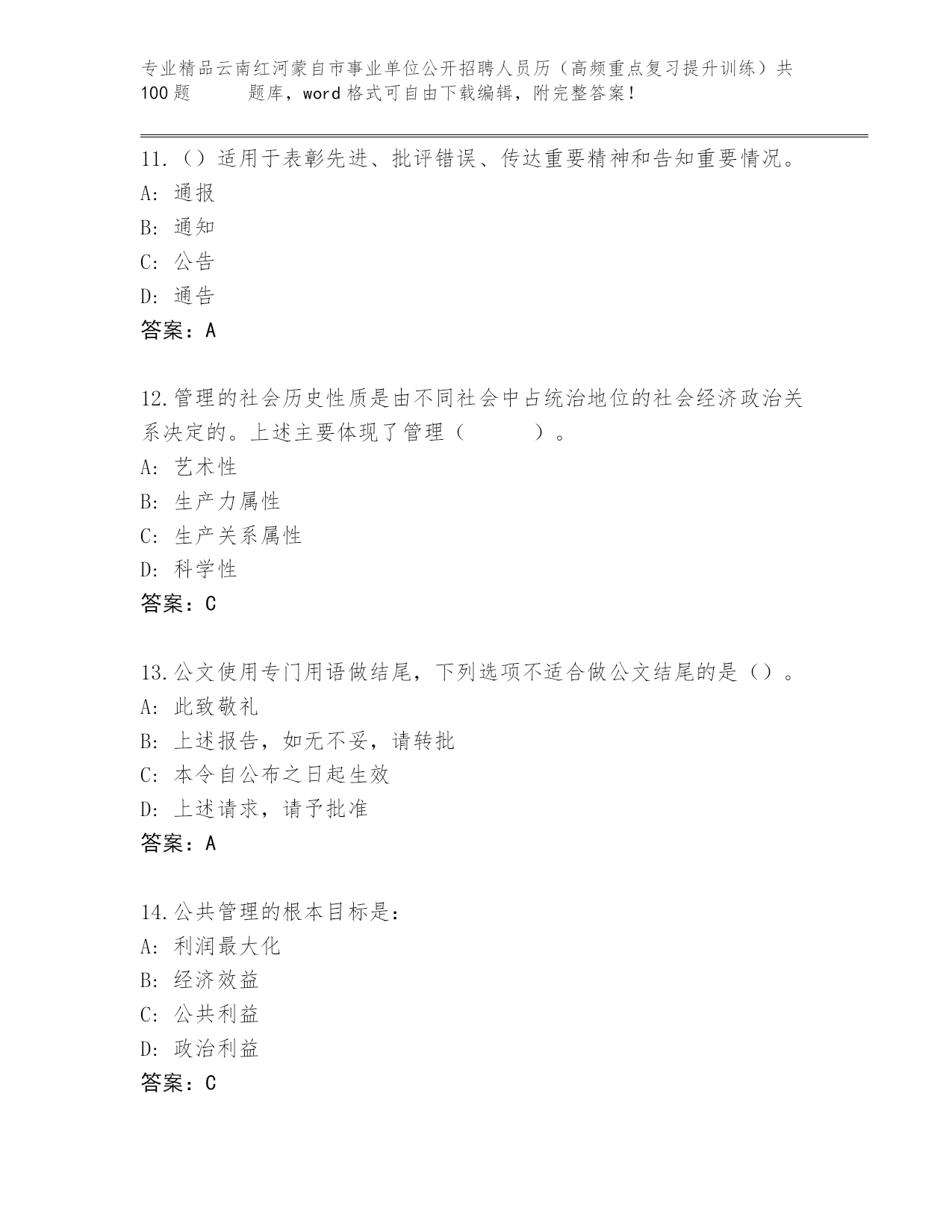 精心整理云南红河蒙自市事业单位公开招聘人员历(高频重点复习提升训练)共100题 王牌题库精品带答案